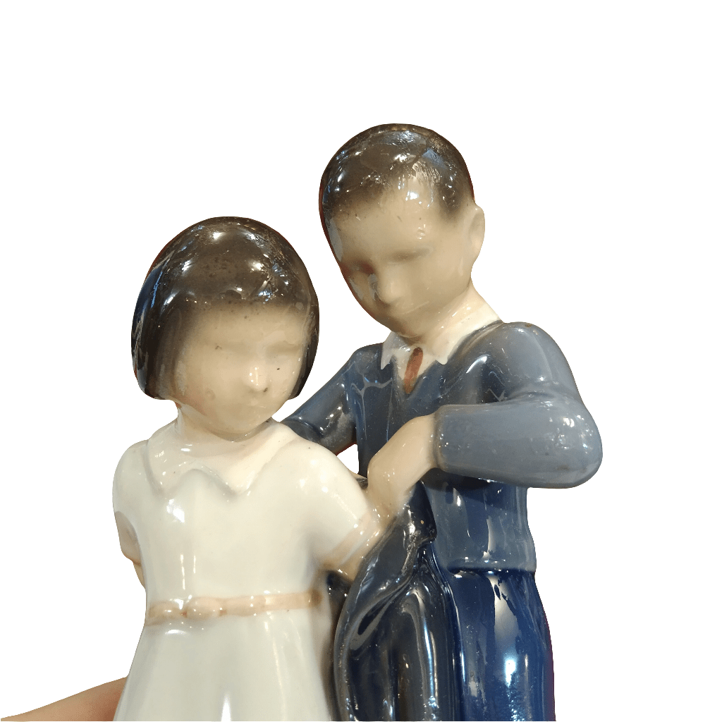 Tierna figura de porcelana de la marca danesa Bing & Grondhal, creada en 1853. La figura representa a un niño ayudando a su hermana pequeña a ponerse una chaqueta. Se trata de una pieza que refleja una ternura y simpleza particular, difuminando los rostros de los personajes y centrándose en el gesto entre ellos.