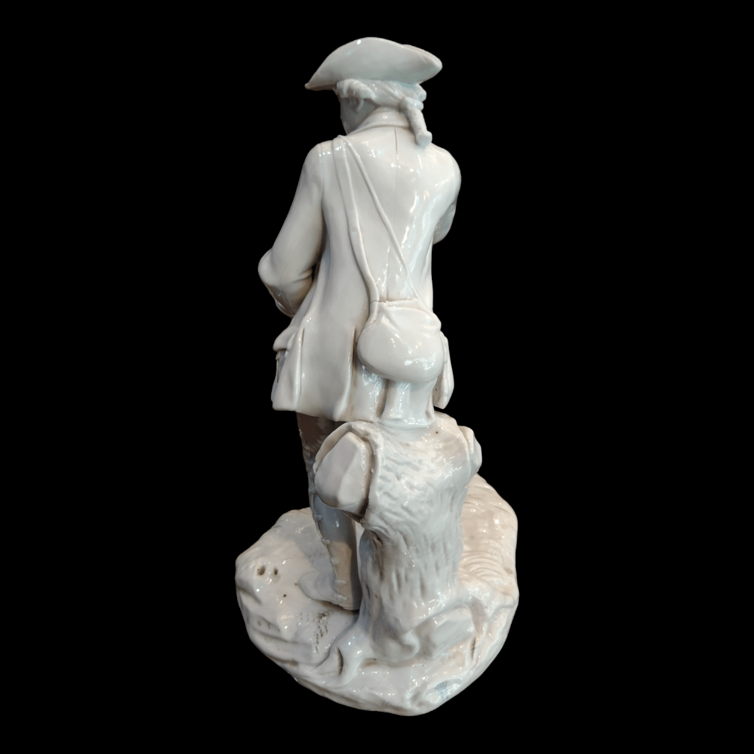 Bella figura de porcelana Capodimonte representando a un hombre caminando con unos documentos en su mano.