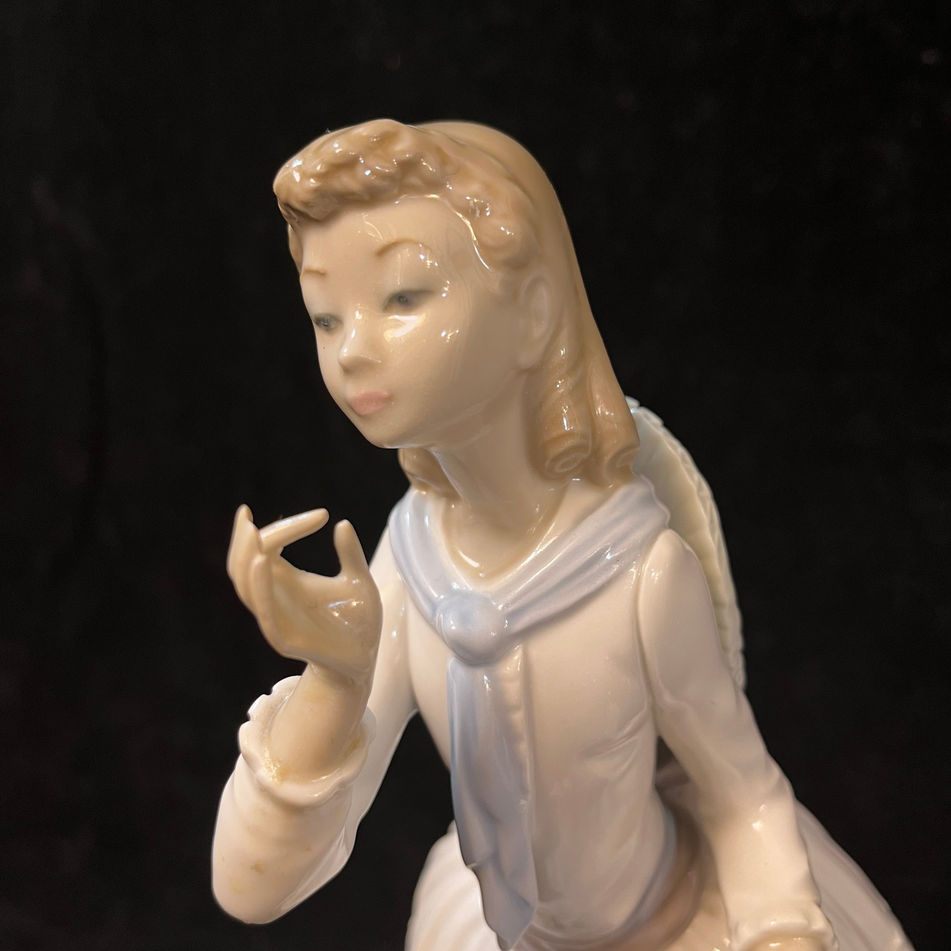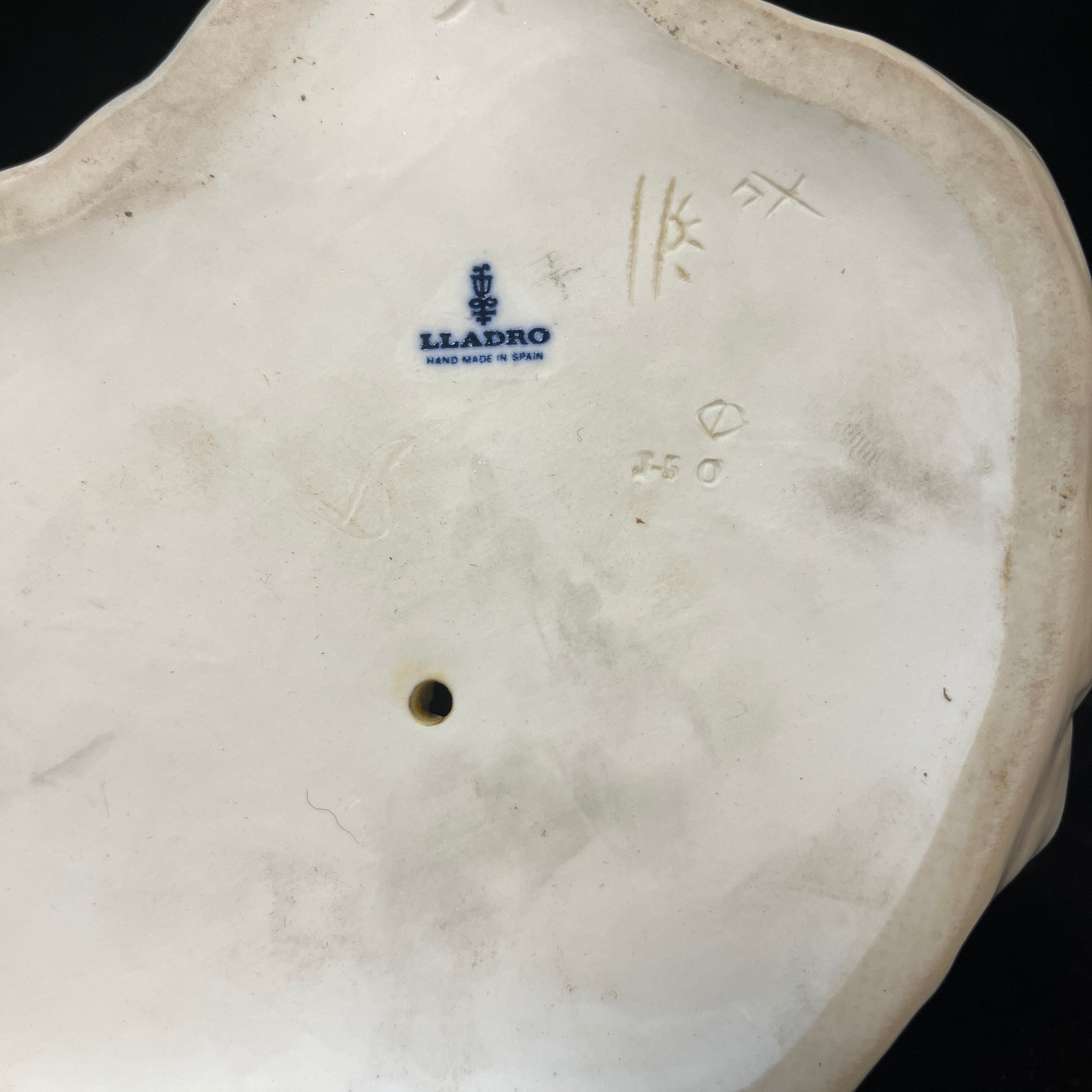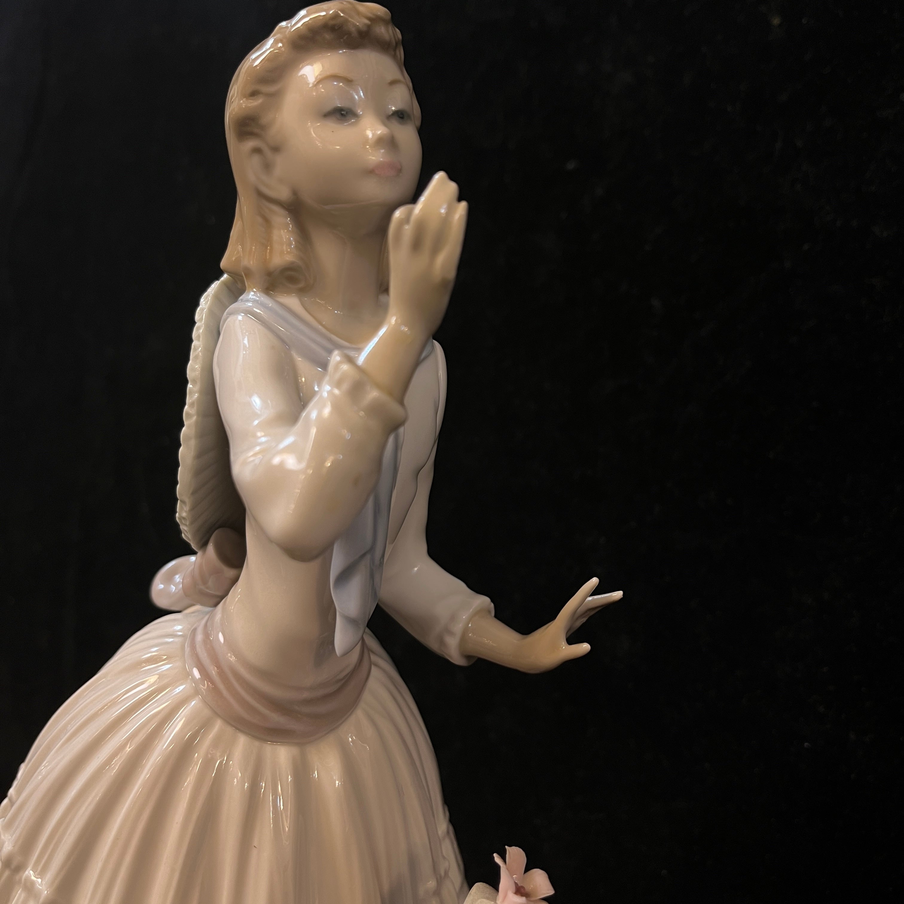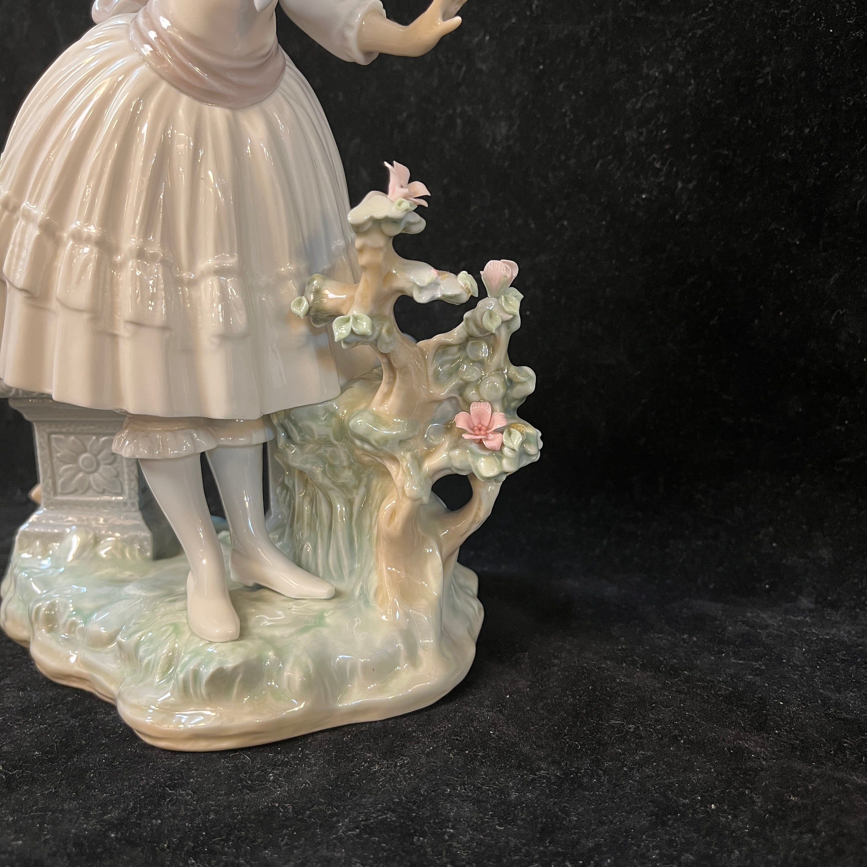Preciosa figura de la reconocida marca de origen español, Lladró. La figura representa a una joven de pie con una banca a su espalda. Se la ve con un vestido blanco donde destacan los detalles de sus pliegues y un pequeño arbusto a sus pies.
