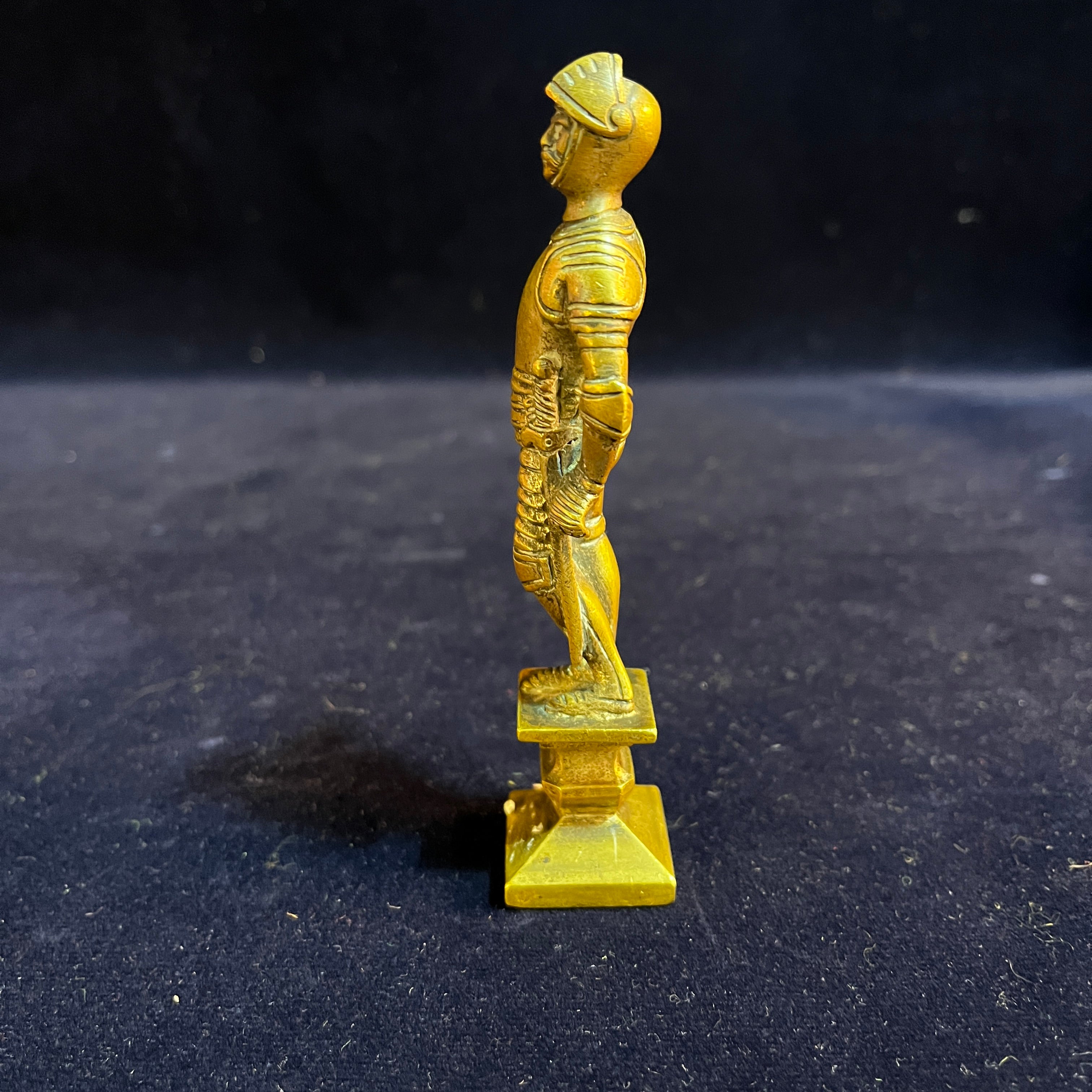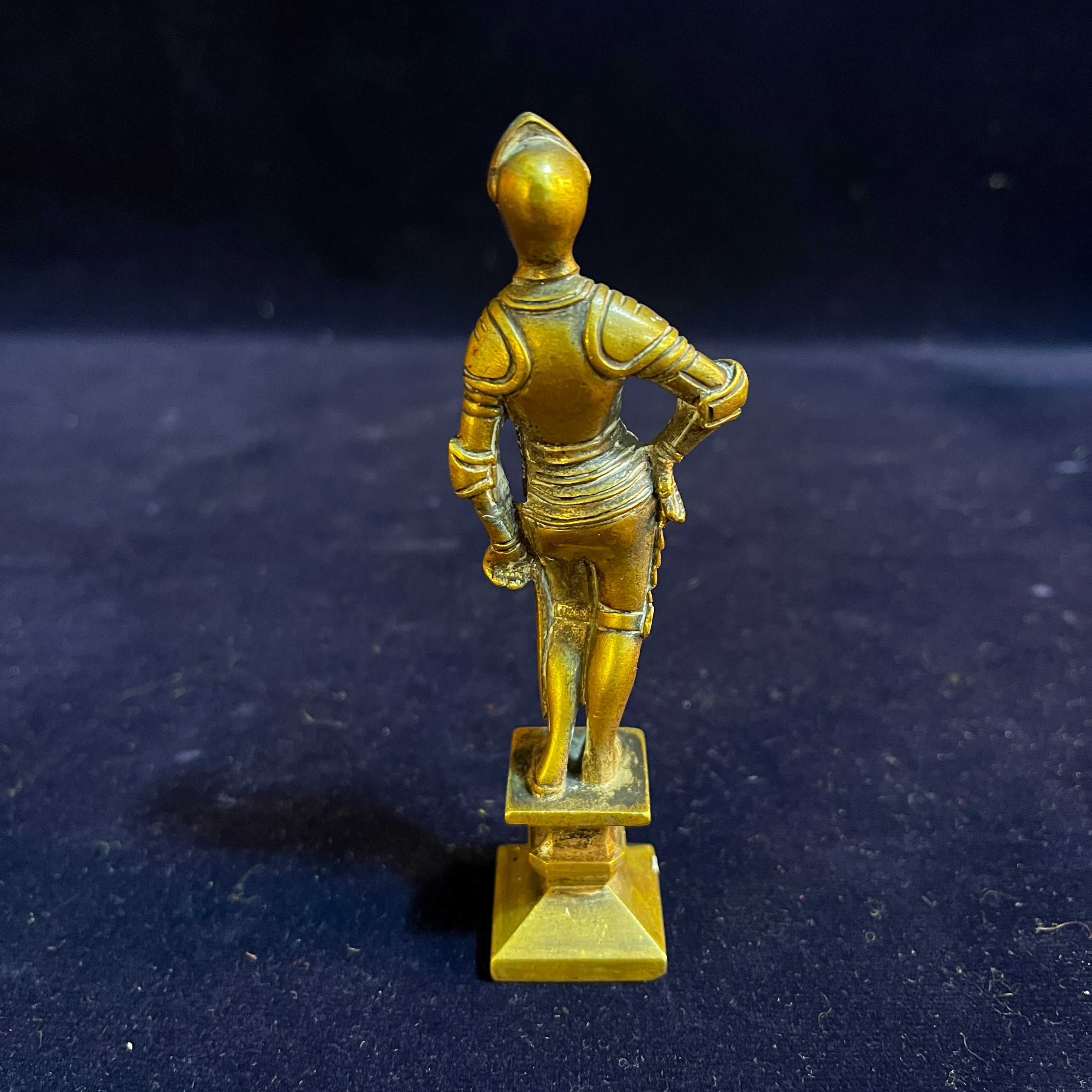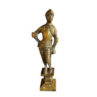 Figura de bronce, de origen francés, representando a un caballero medieval con su armadura y espada, sobre una base del mismo material. La figura está representada en detalle, capturando el relajado gesto y texturas de la armadura del personaje.