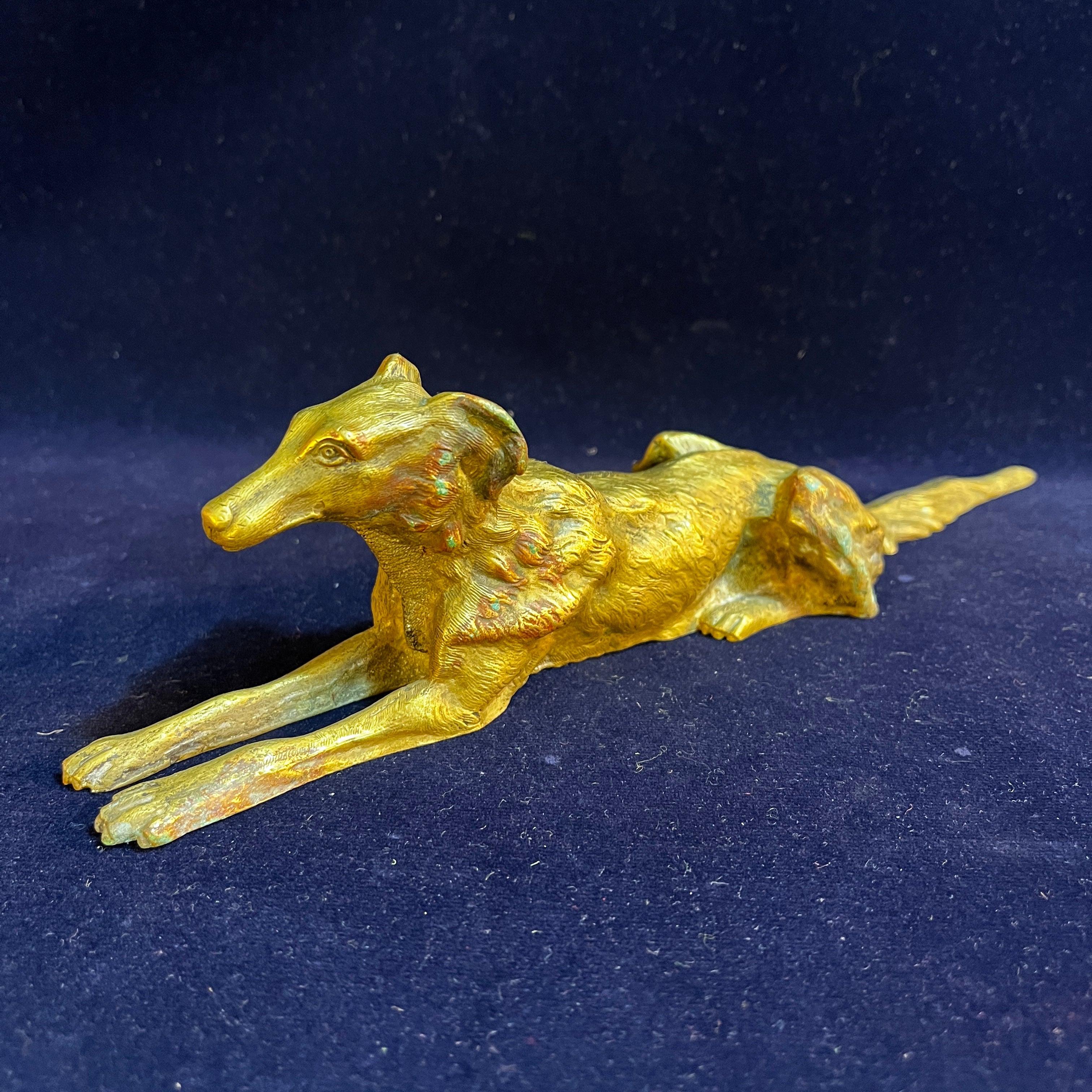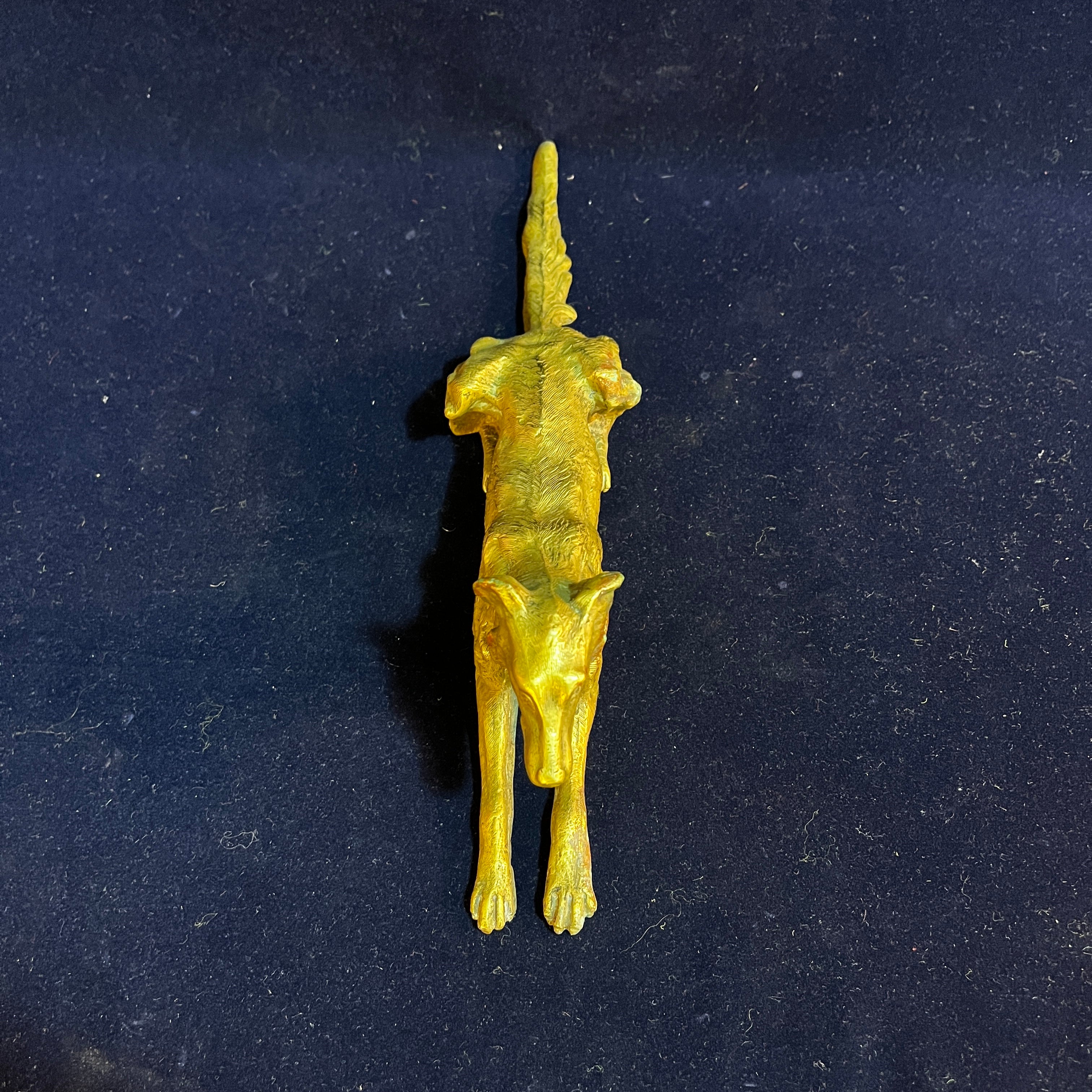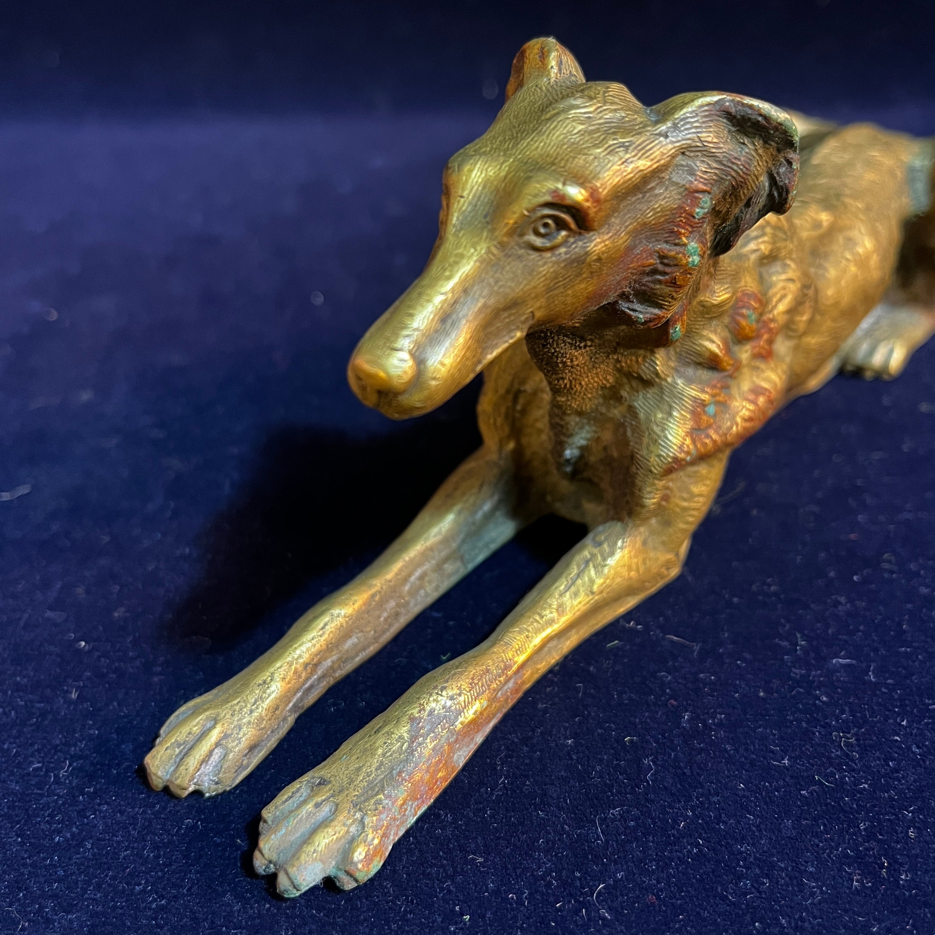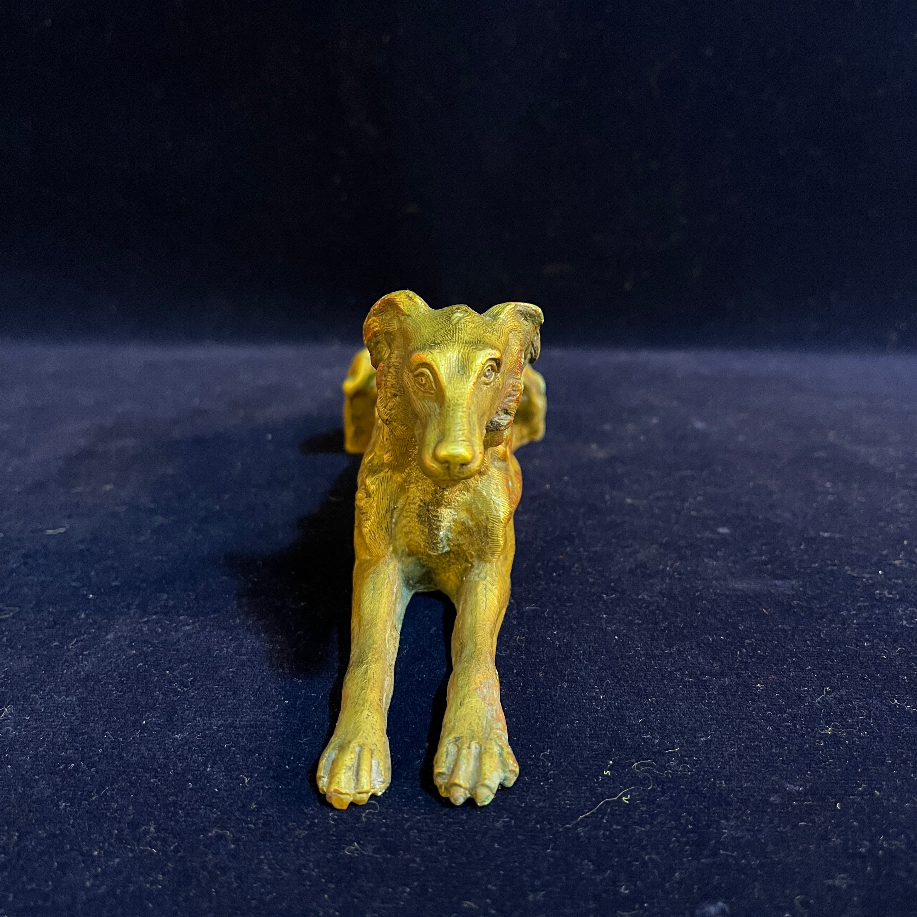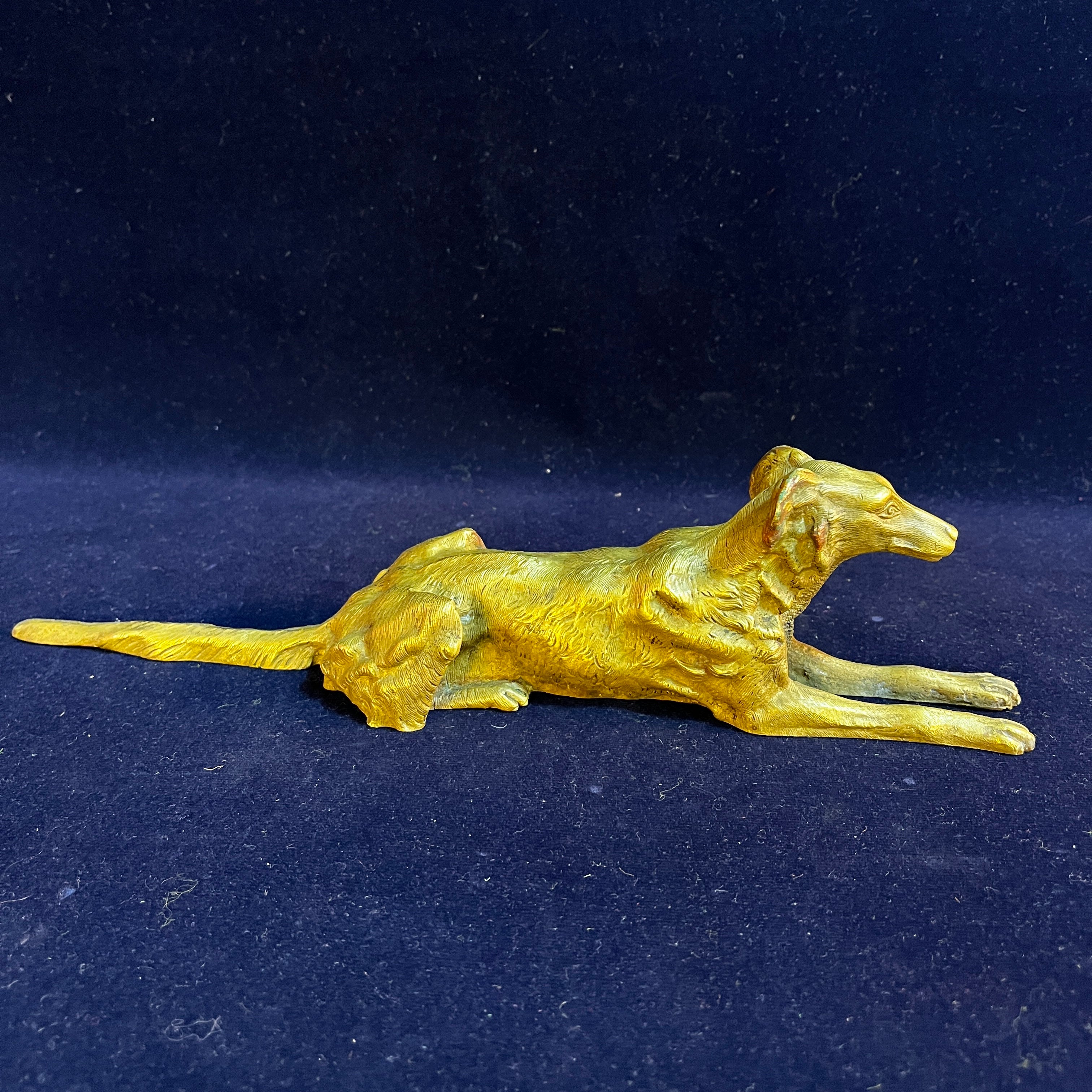 Elegante figura de bronce, de origen francés, representando un precioso galgo recostado en su vientre. La figura captura de manera detallada la anatomía y el pelaje del animal, dándole mucha textura a la figura.