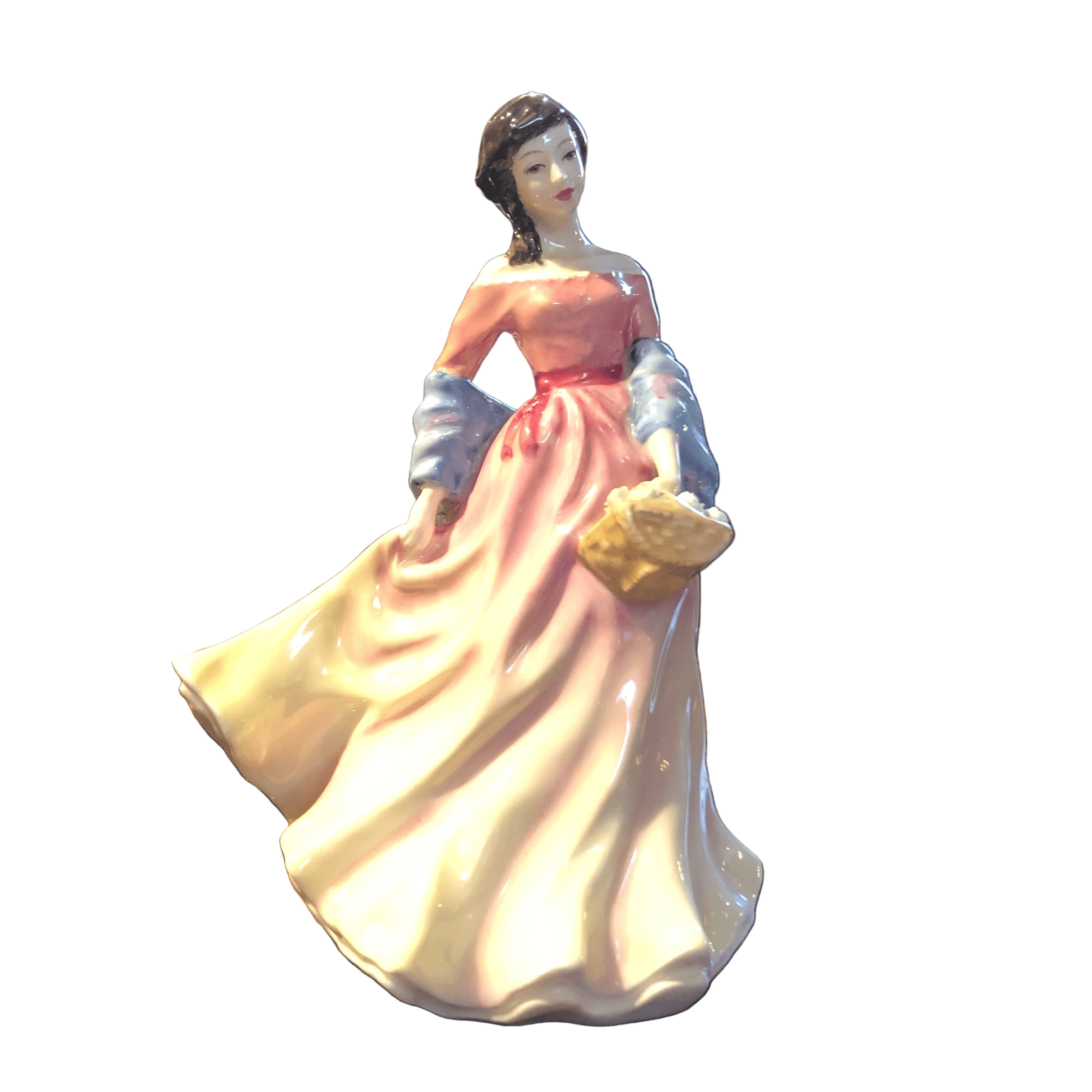 Figurita de porcelana de origen inglés de la reconocida marca Royal Doulton, fabricada en 1997. La pieza representa a una mujer con un vestido de color rosado y amarillo, con un pañuelo celeste alrededor de sus hombros. El nombre de la figura es Summer Scent o “Esencia veraniega”, aludiendo a la canasta con flores que lleva la mujer.