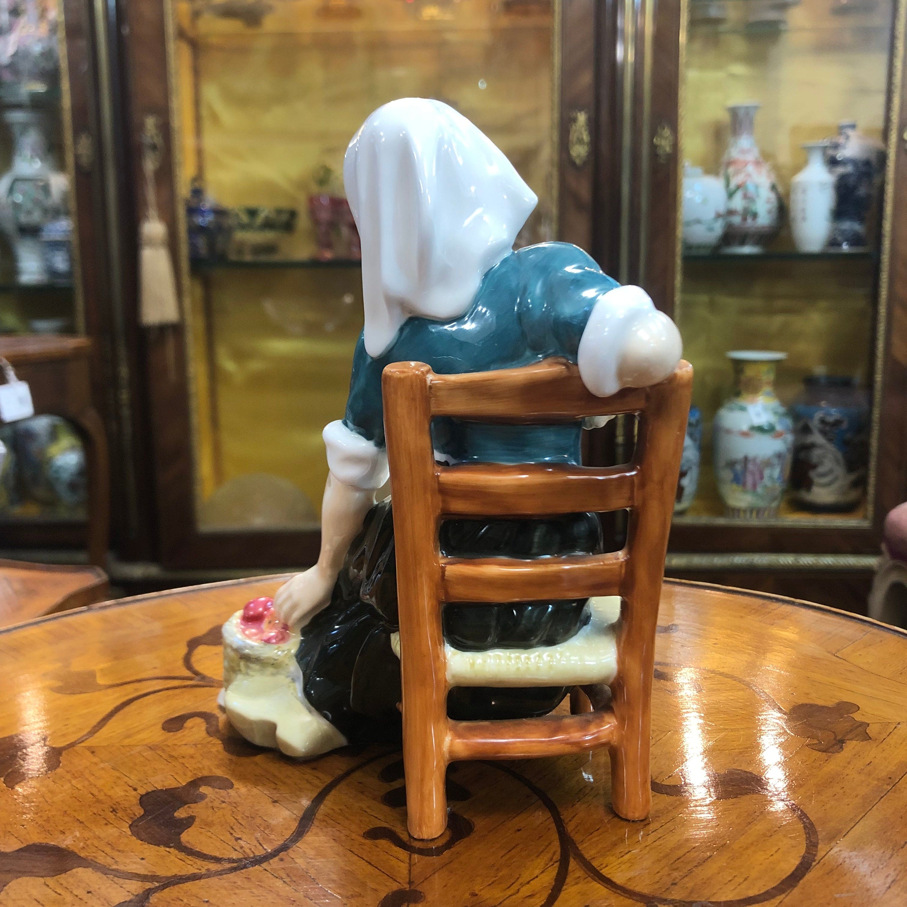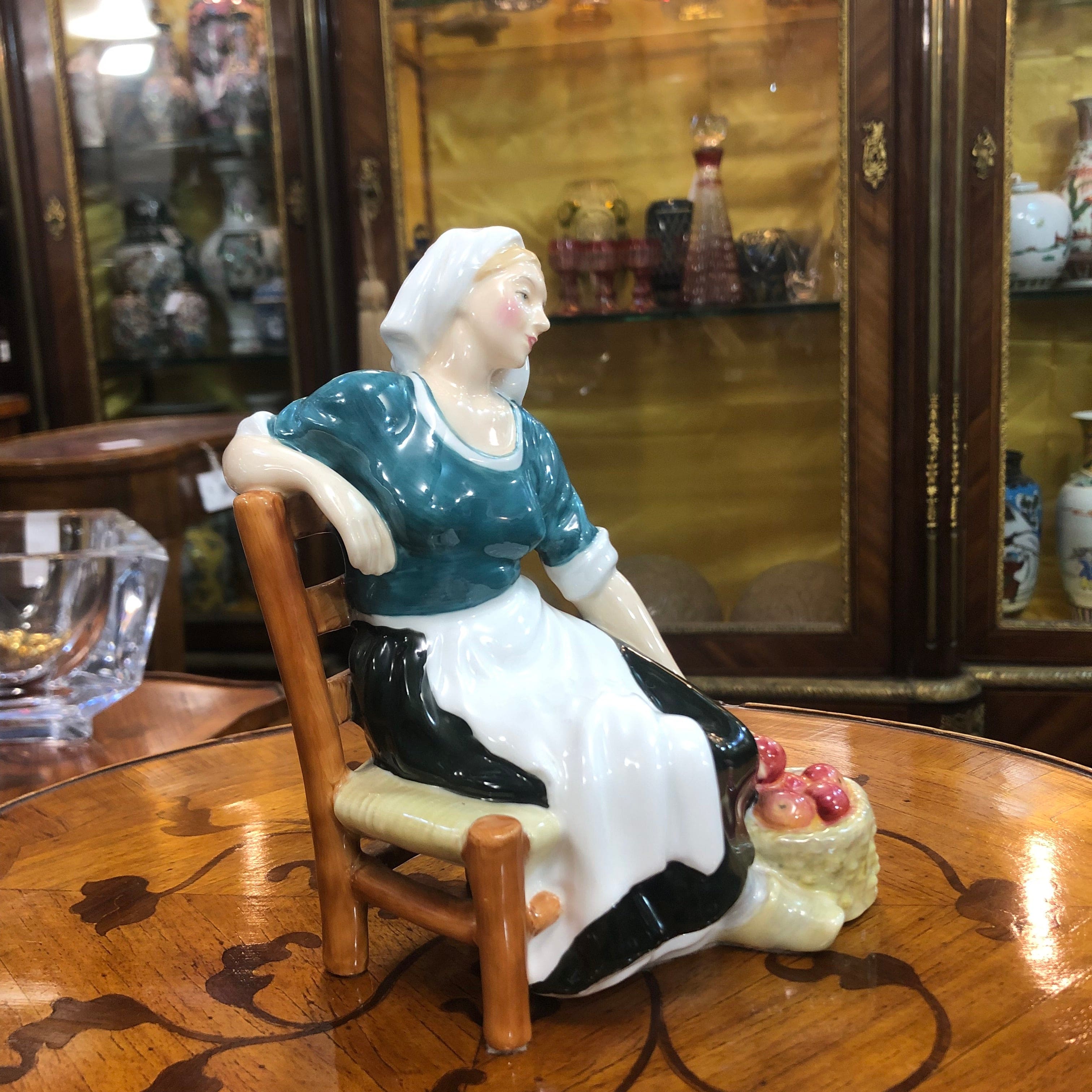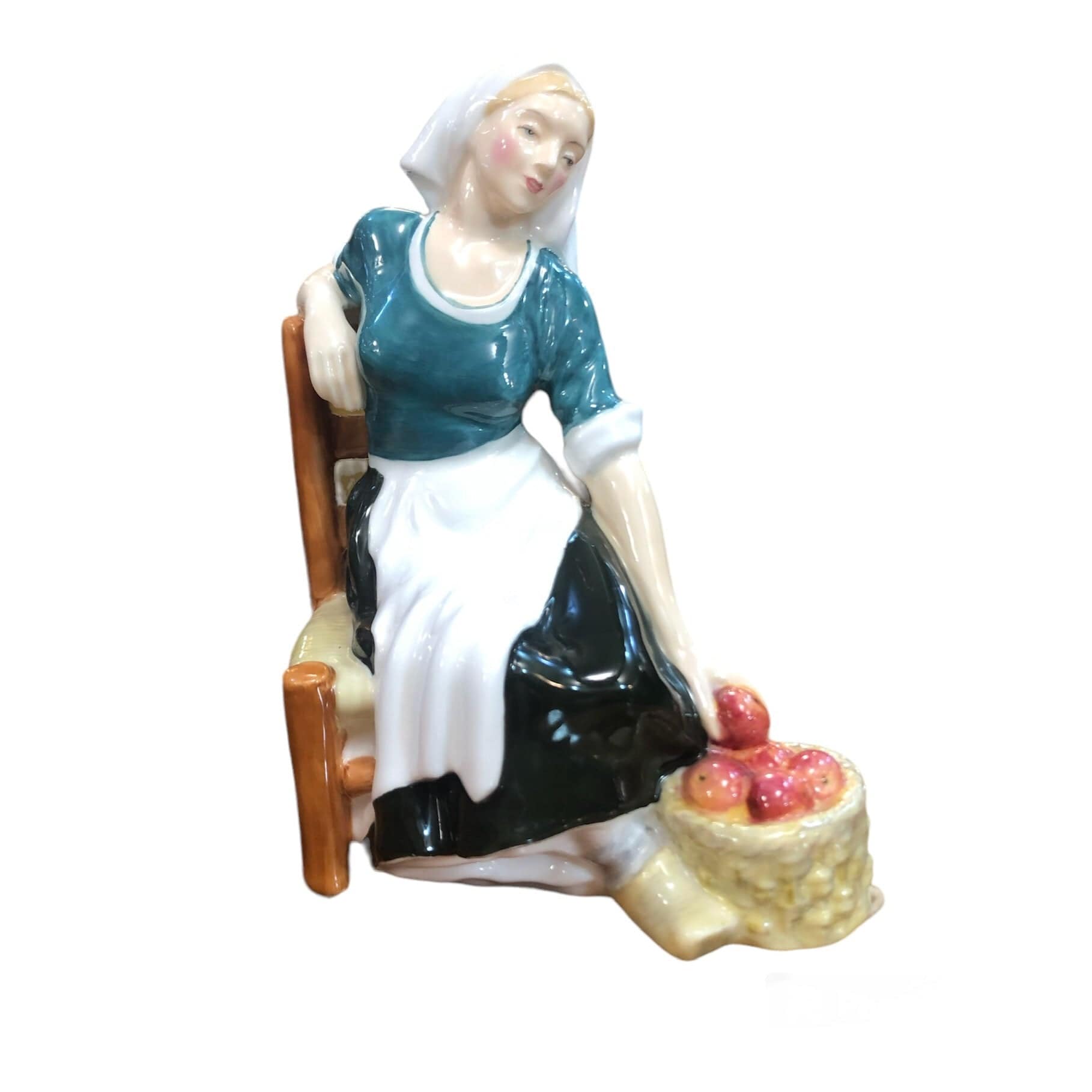 Figura de porcelana de la marca Royal Doulton, seriada y pintada a mano, representando a una mujer sentada en una silla, junto a un canasto de manzanas.