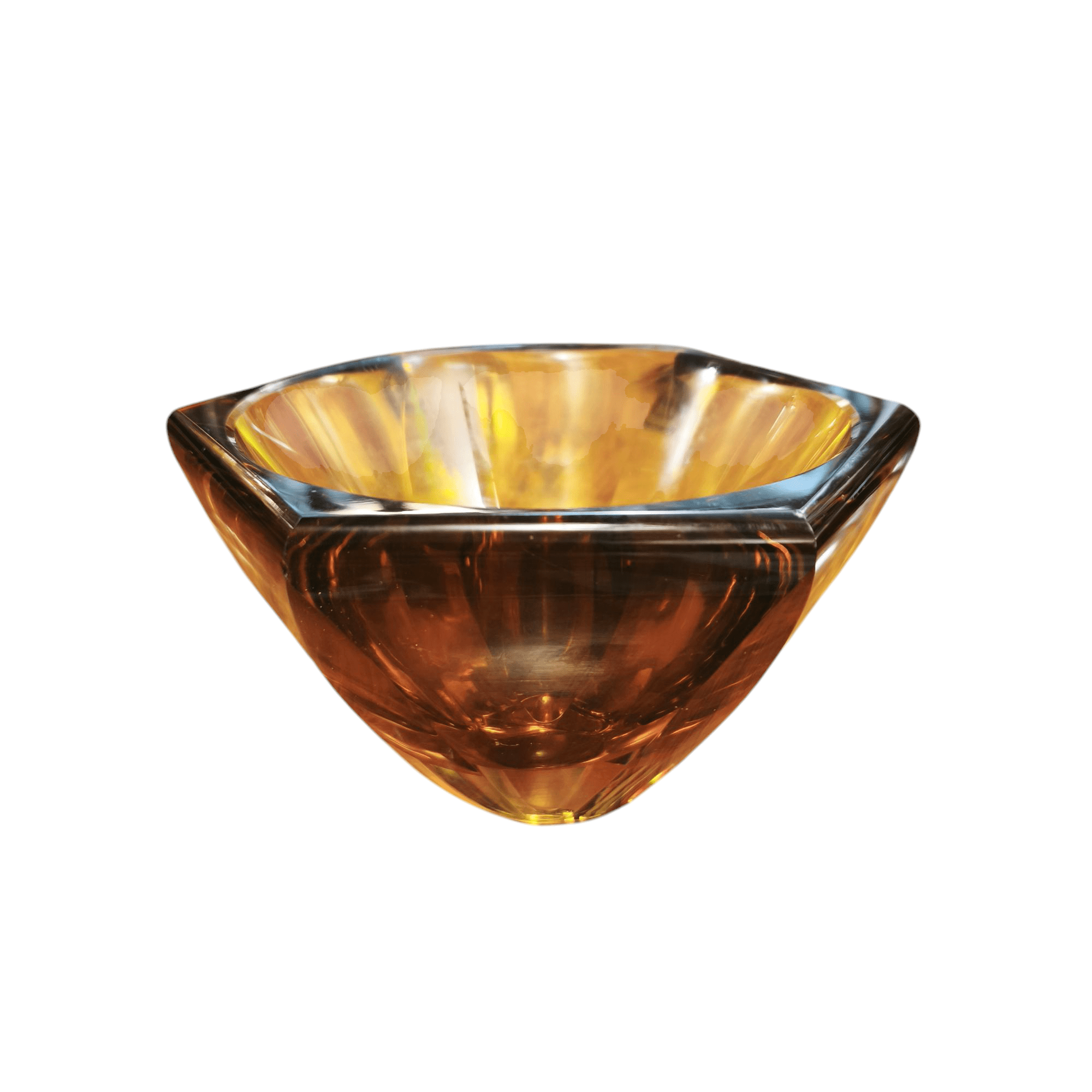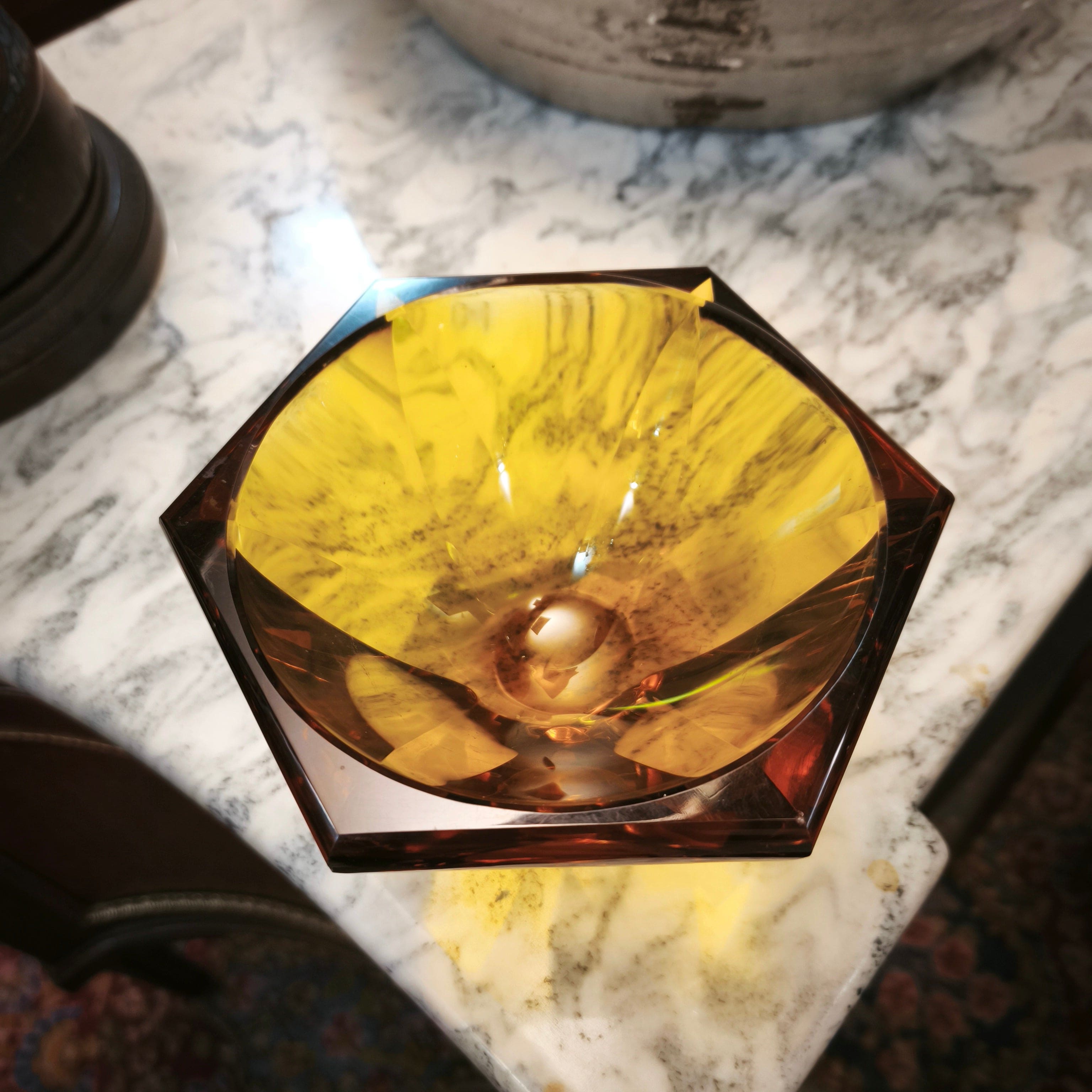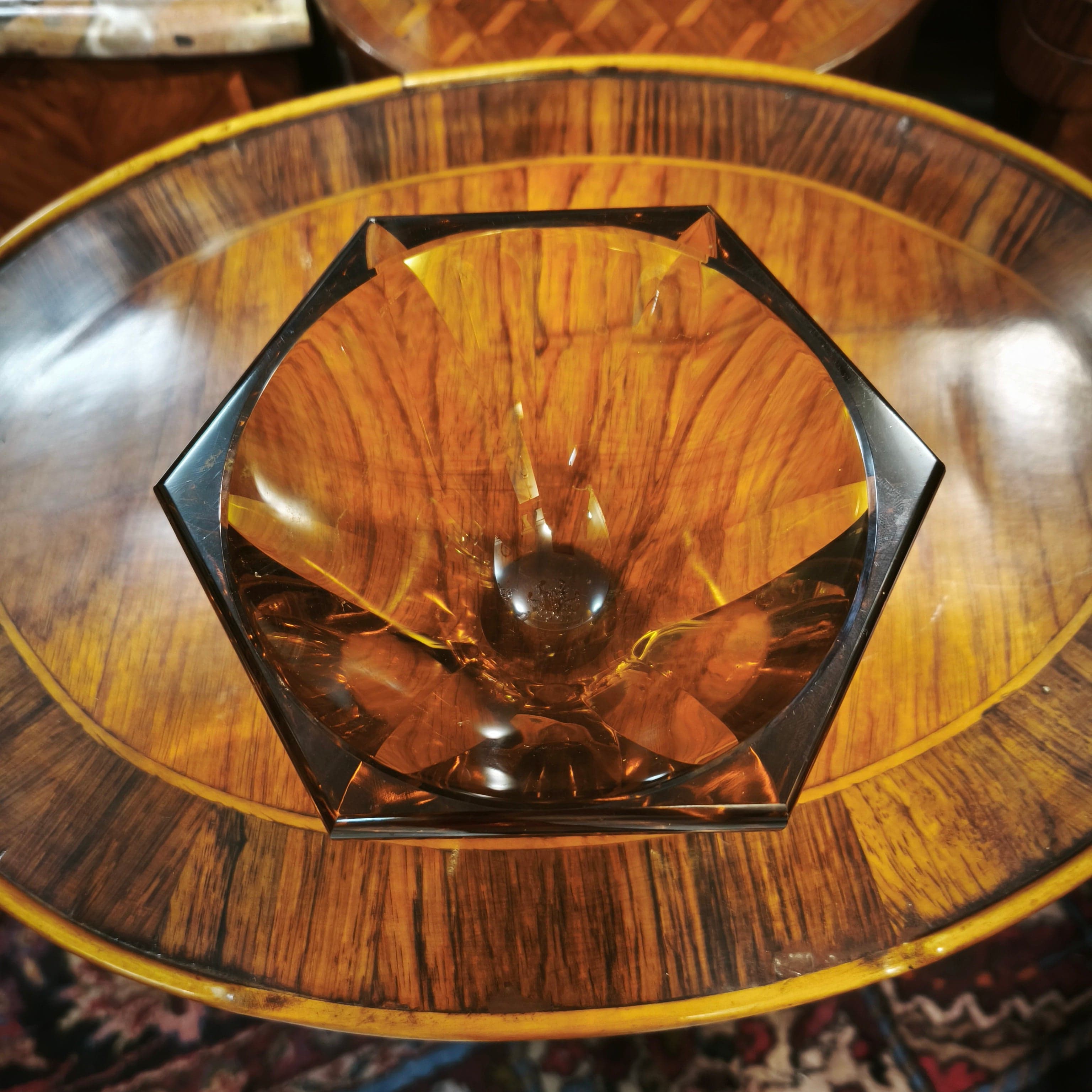 Bello centro de mesa color ámbar de la prestigiosa marca Checa Moser. Forma hexagonal color ámbar.