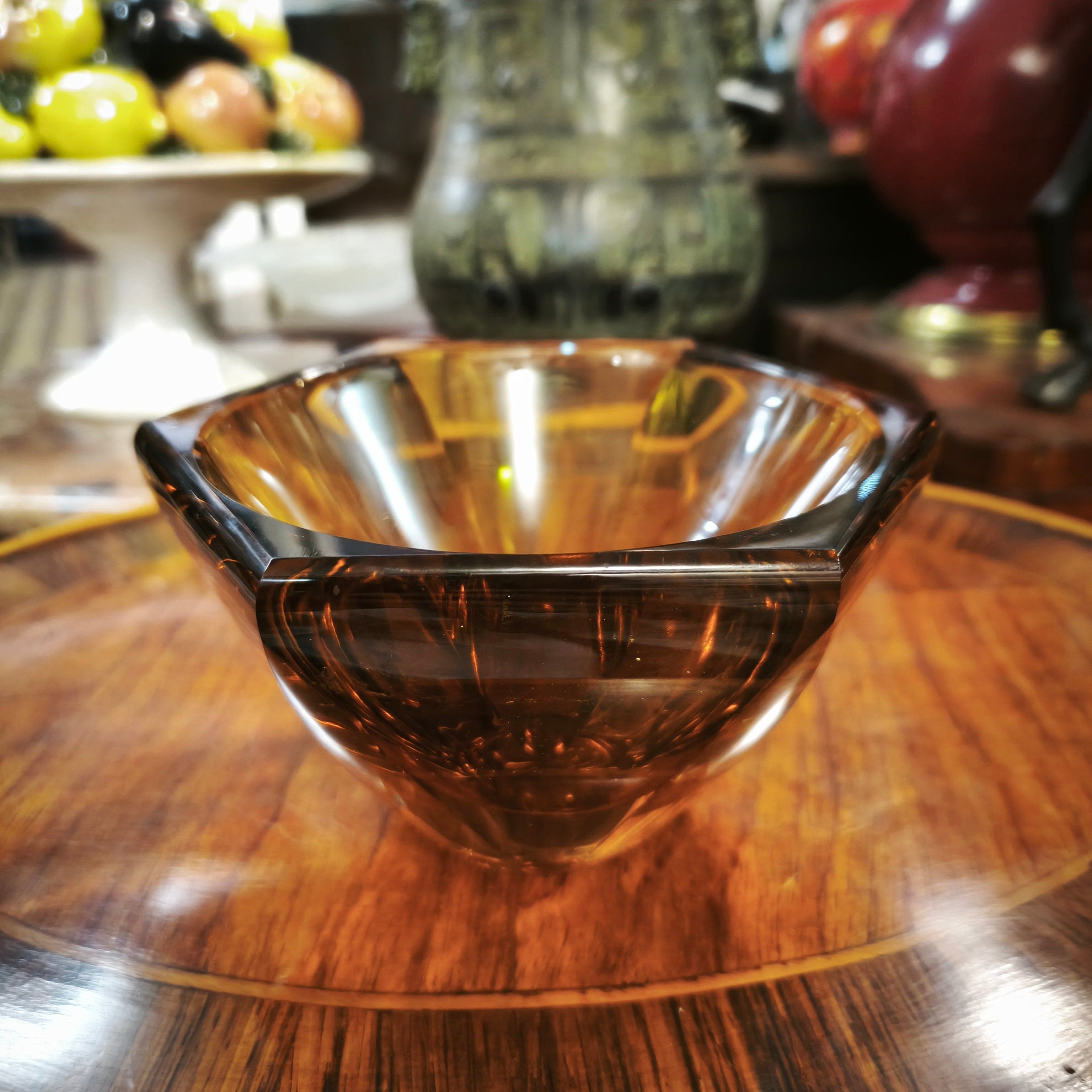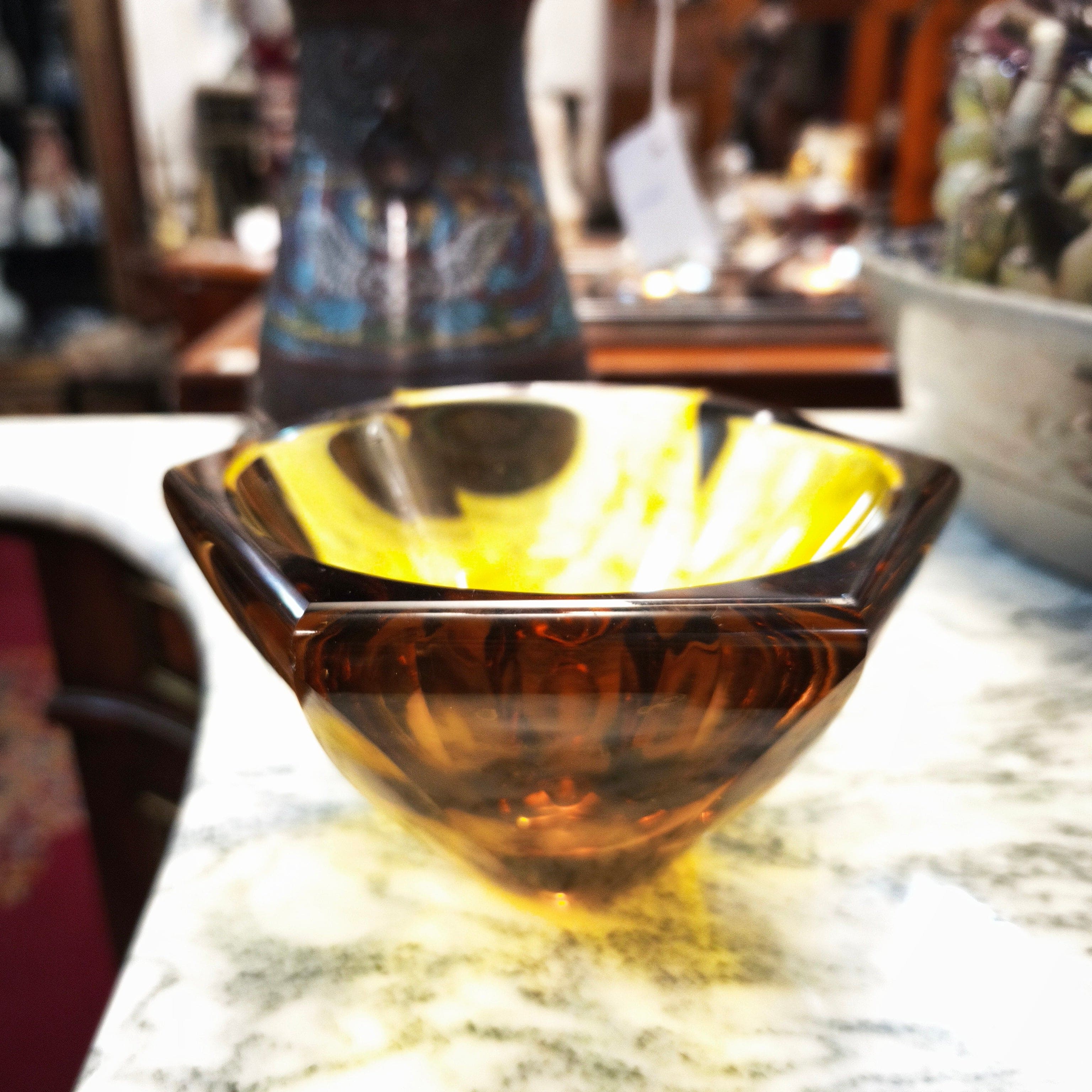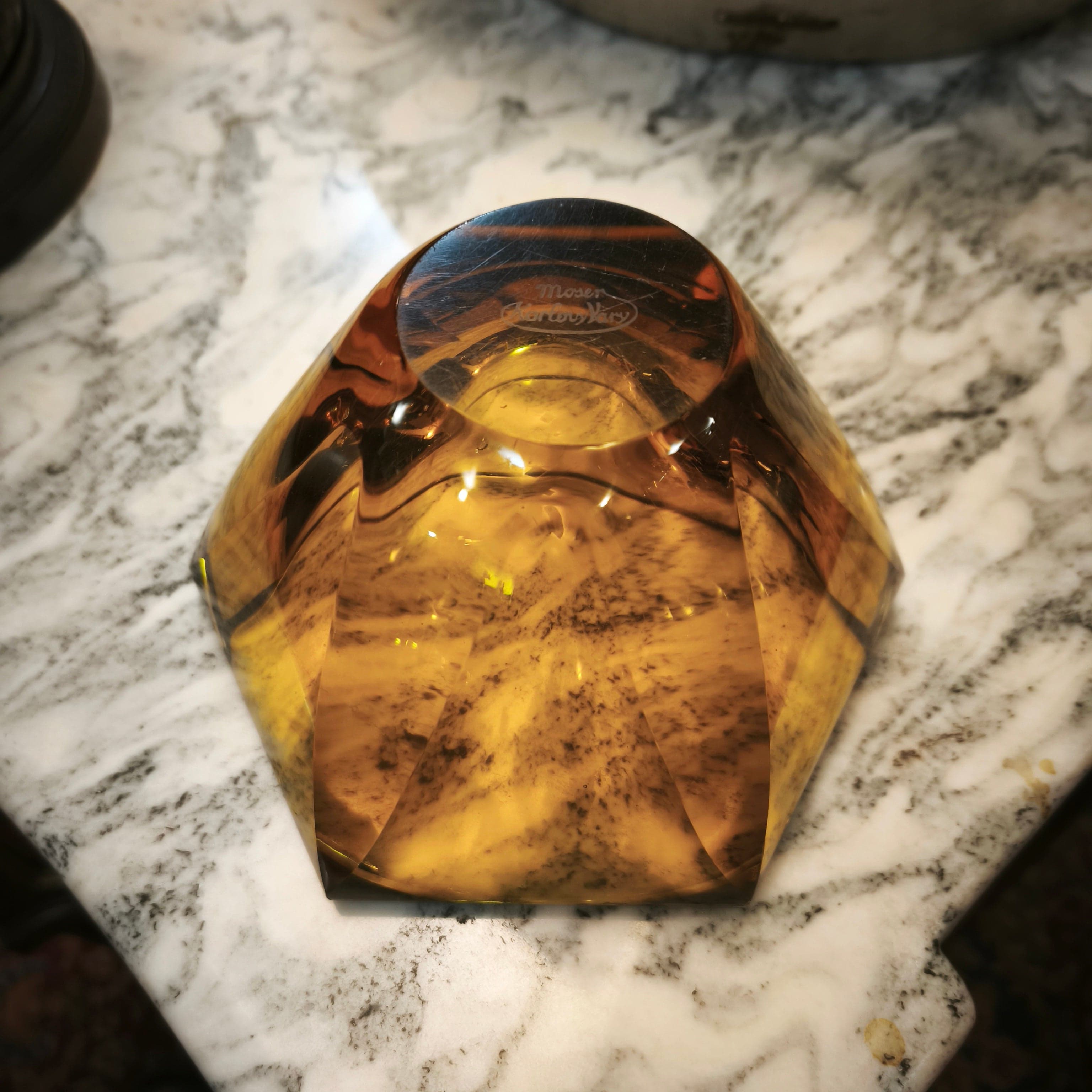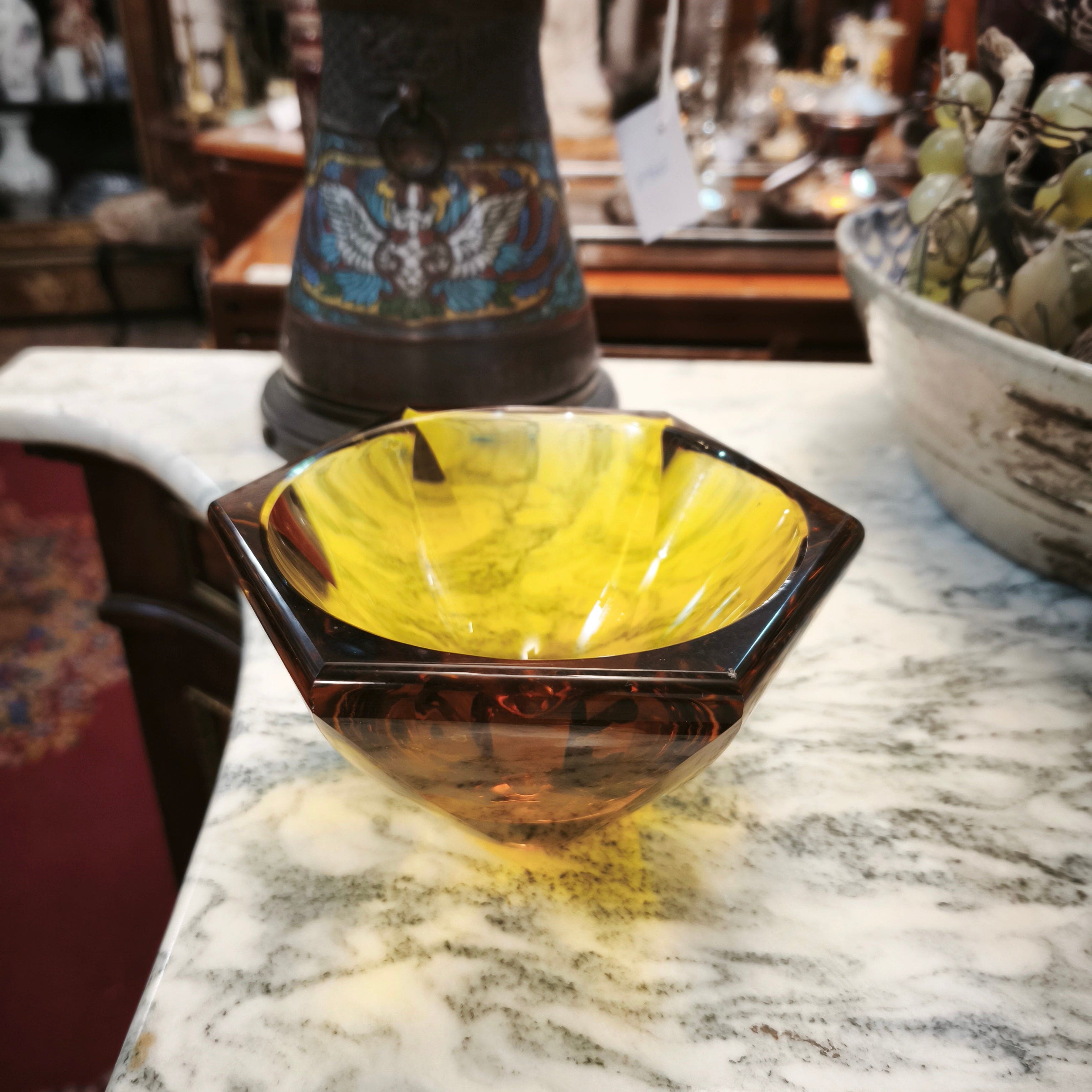 Bello centro de mesa color ámbar de la prestigiosa marca Checa Moser. Forma hexagonal color ámbar.
