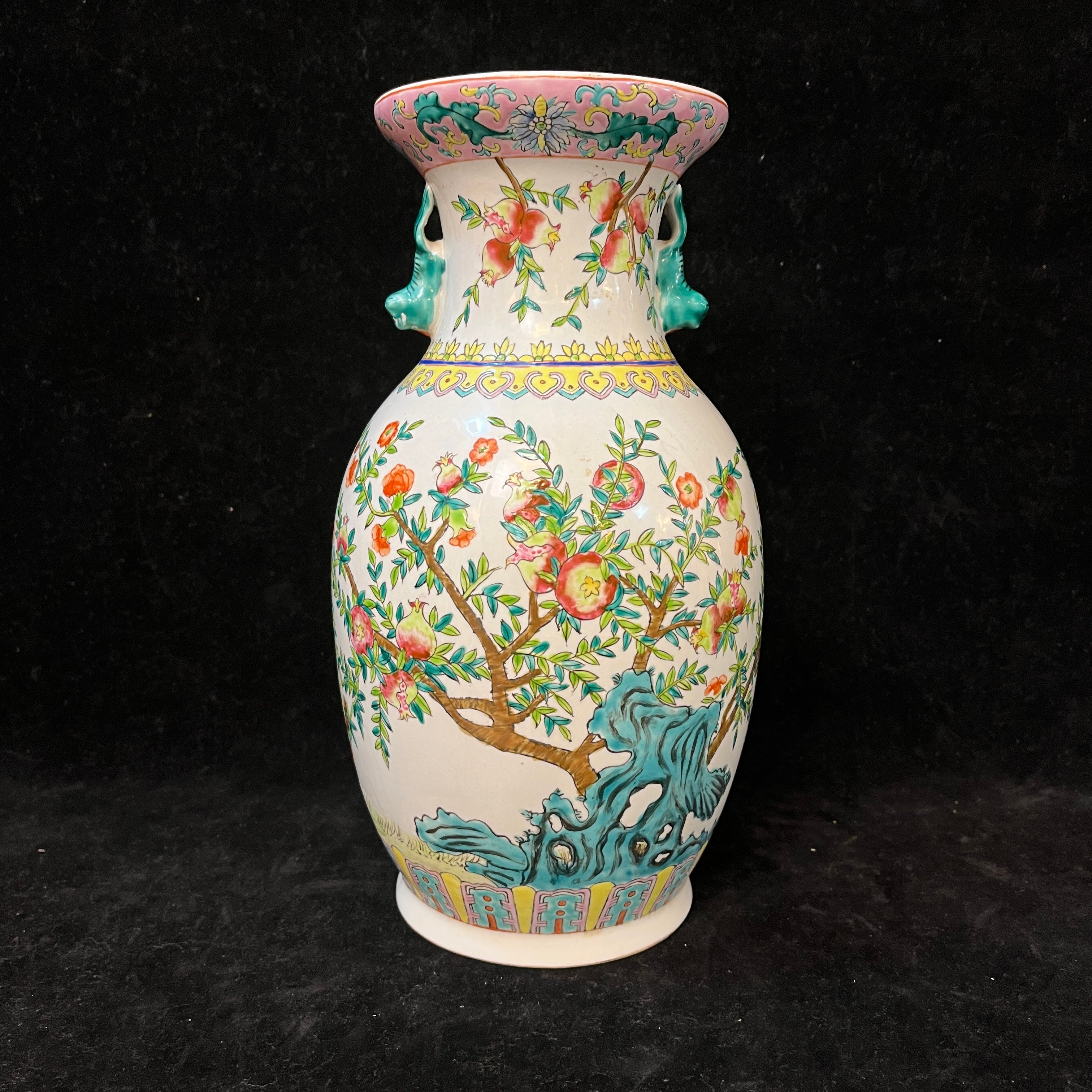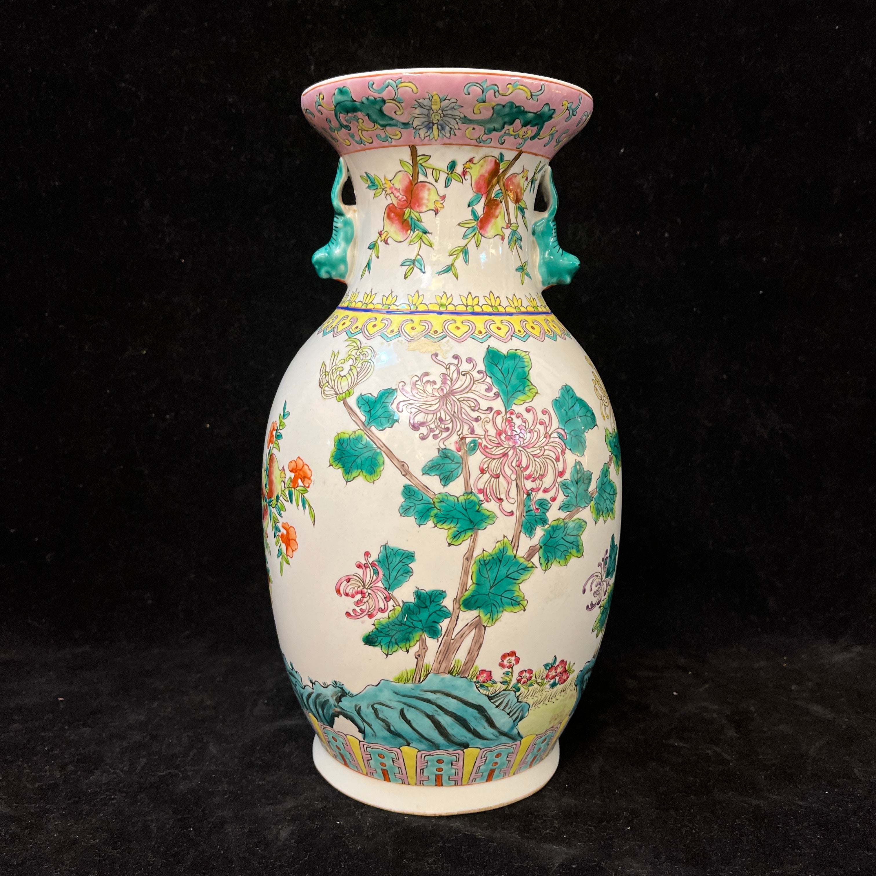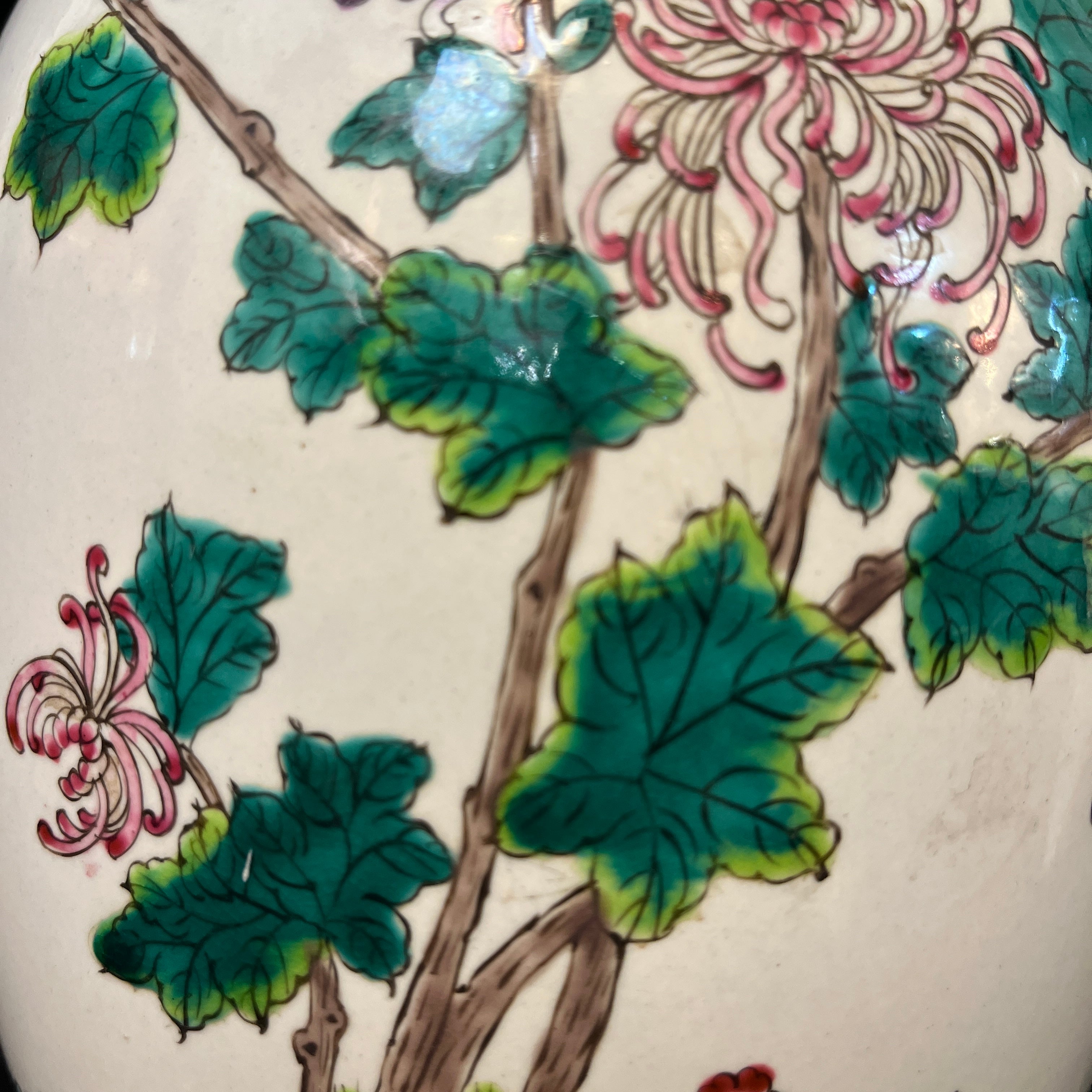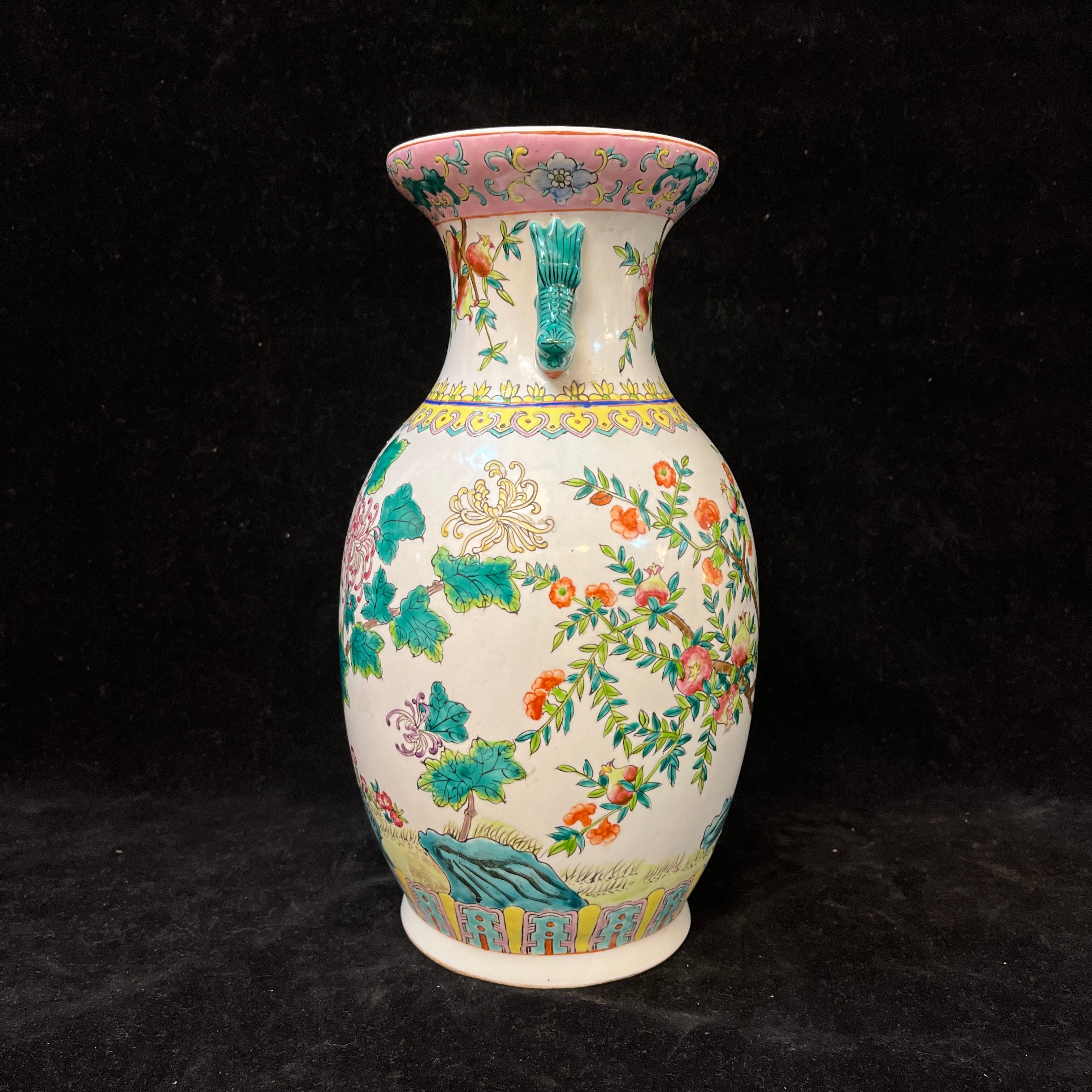 Hermoso jarrón de porcelana china famille rose representando un cerezo en flor, con vivos tonos verdes y rosados.