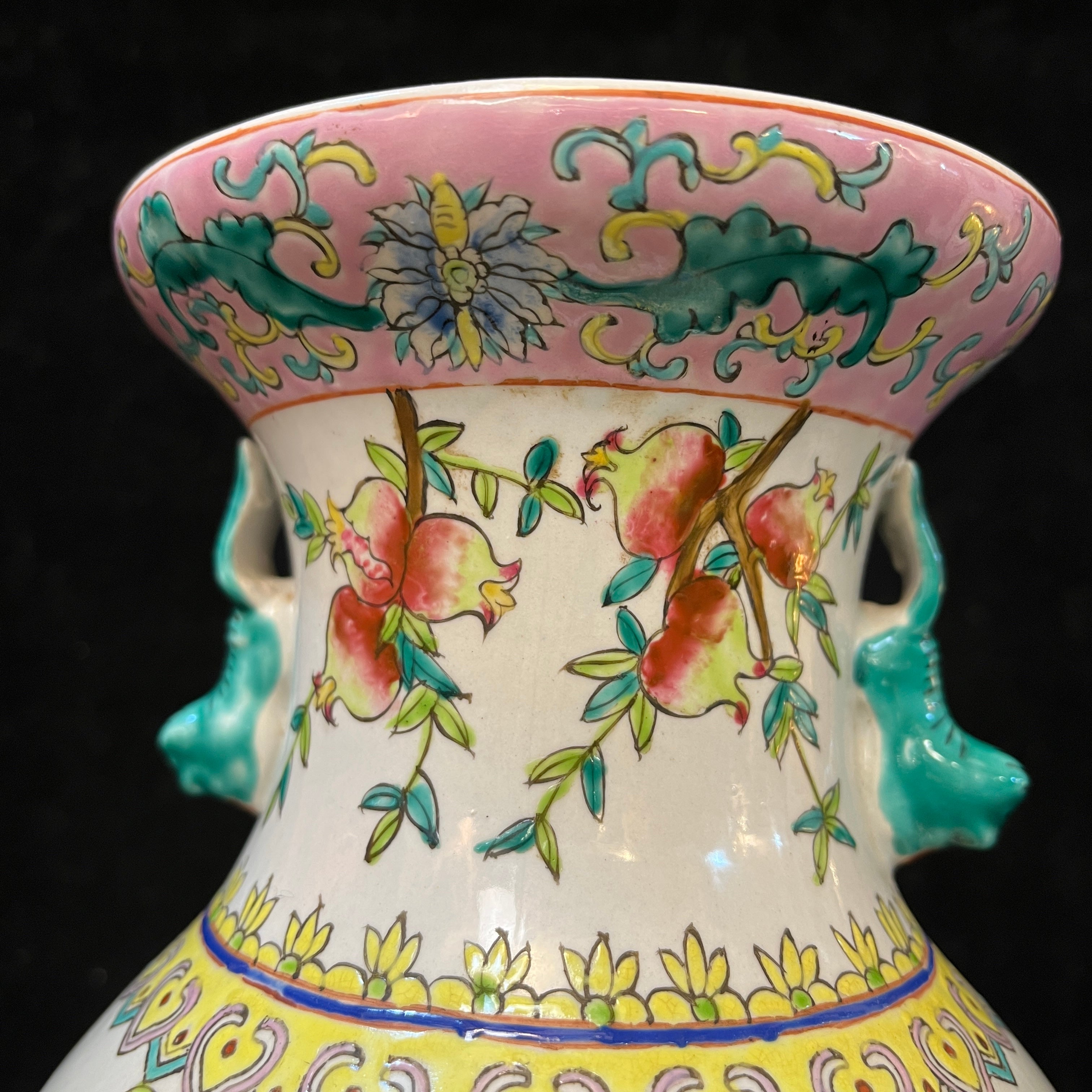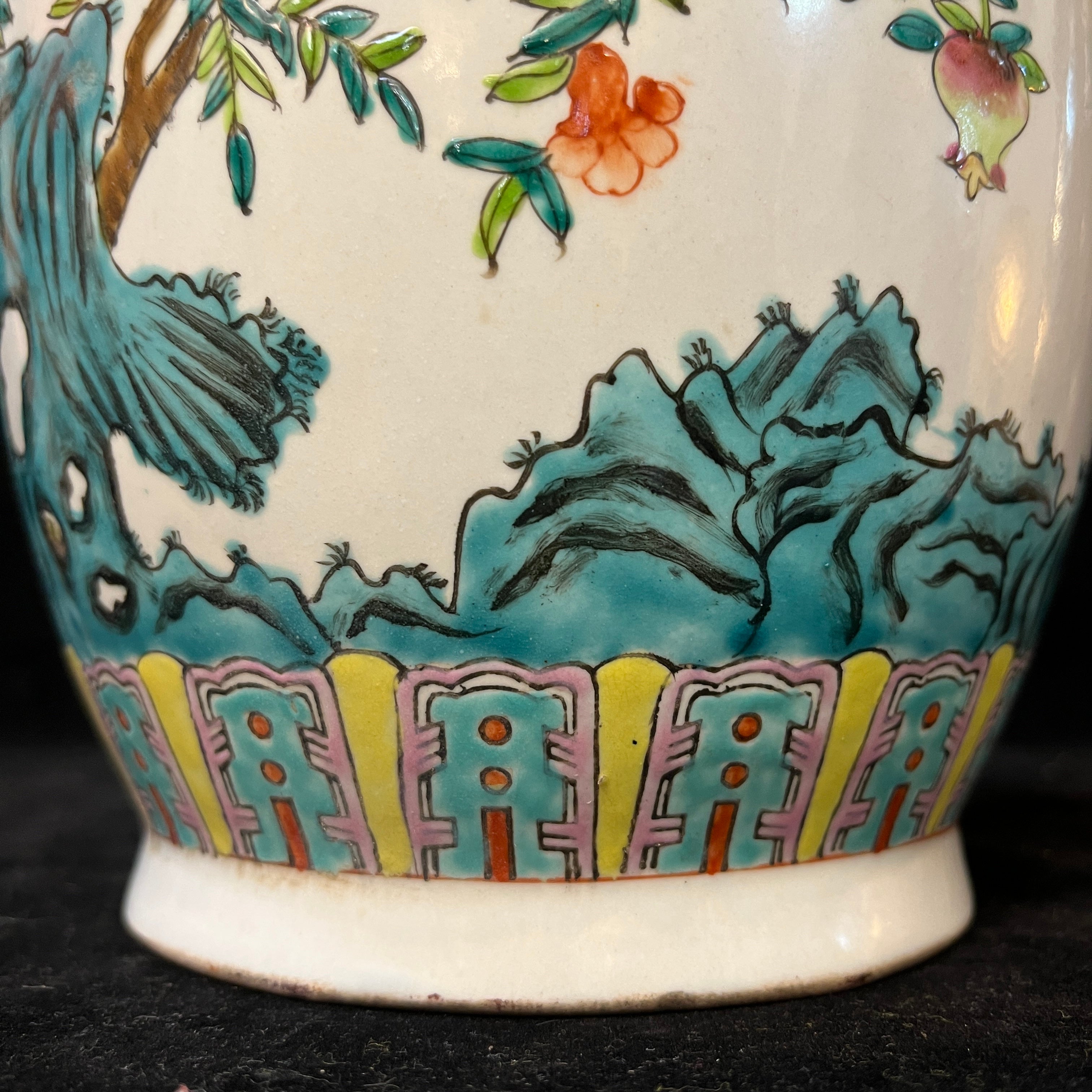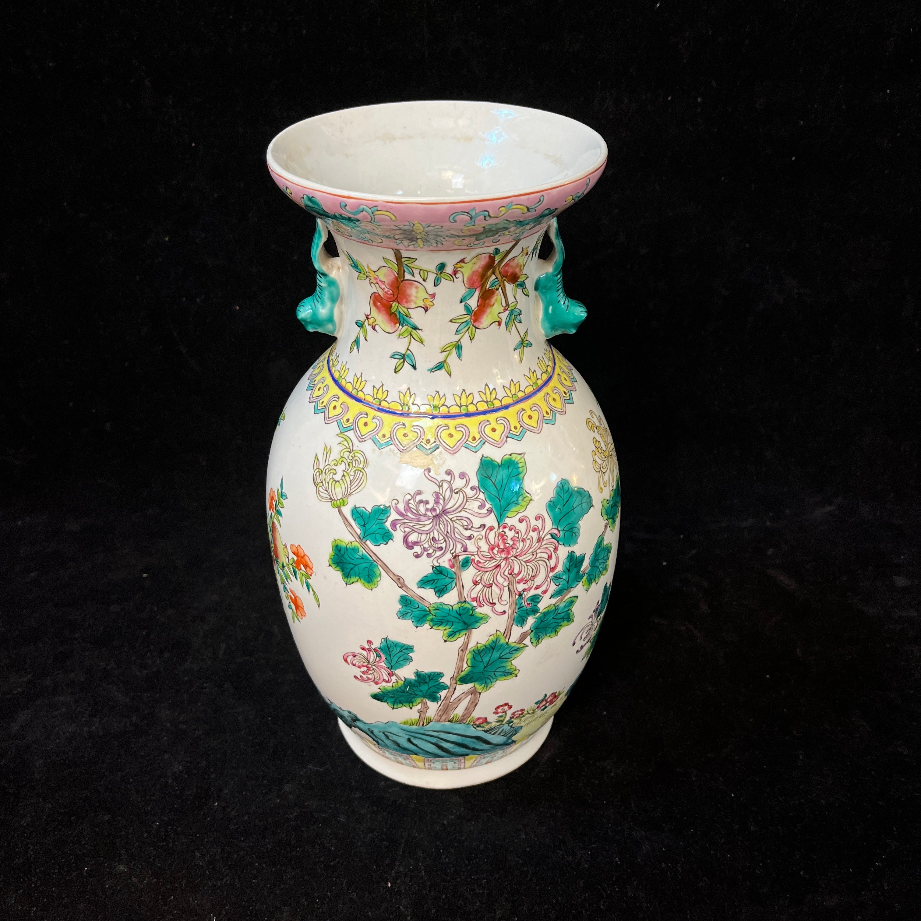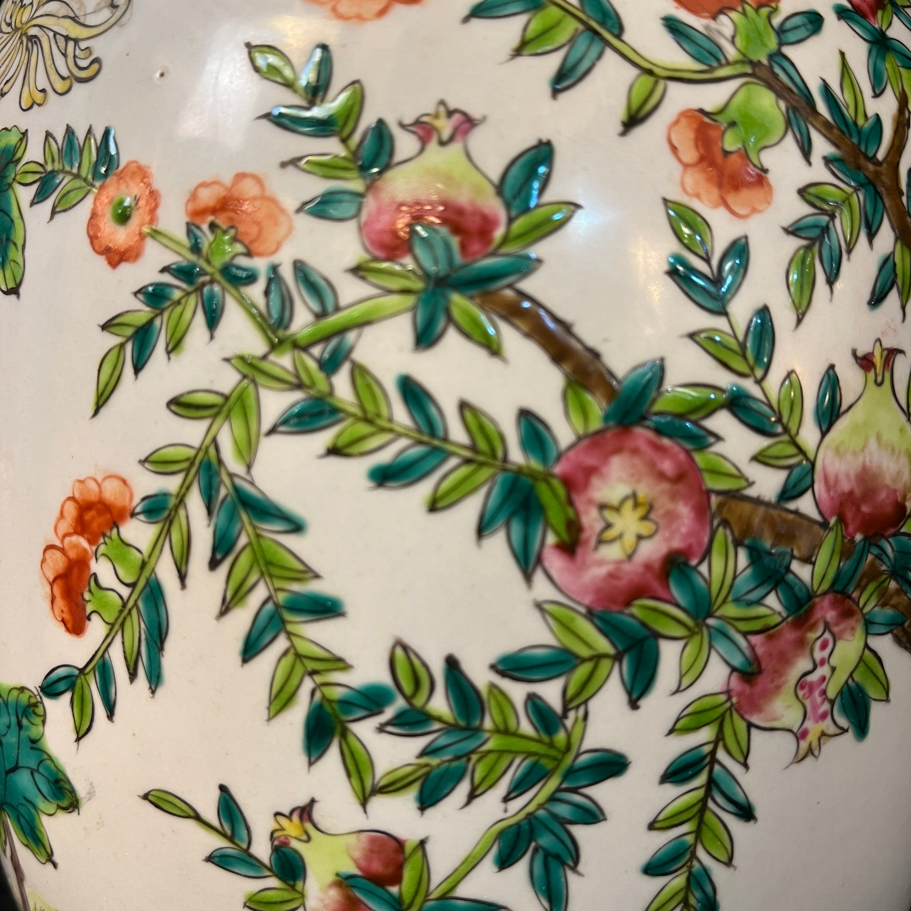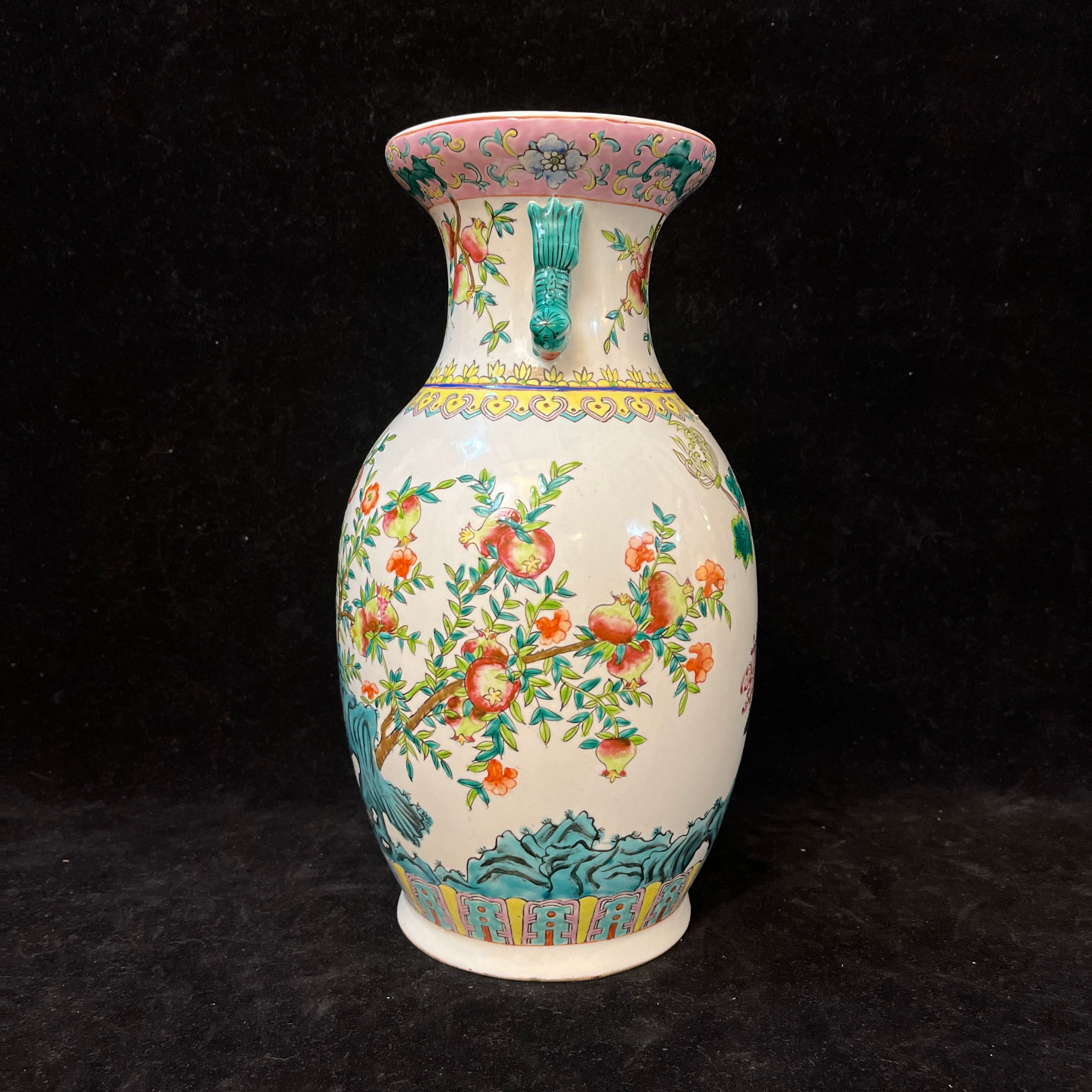 Hermoso jarrón de porcelana china famille rose representando un cerezo en flor, con vivos tonos verdes y rosados.