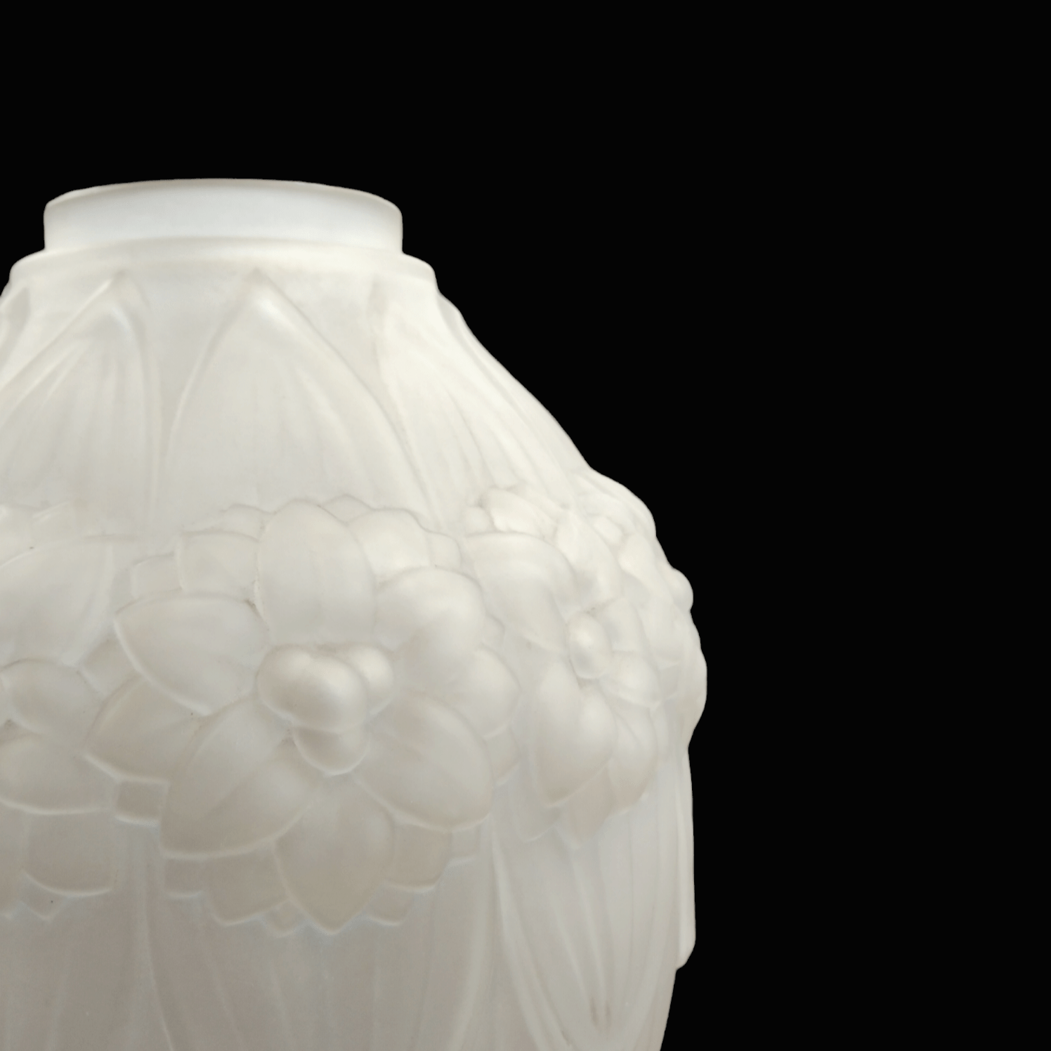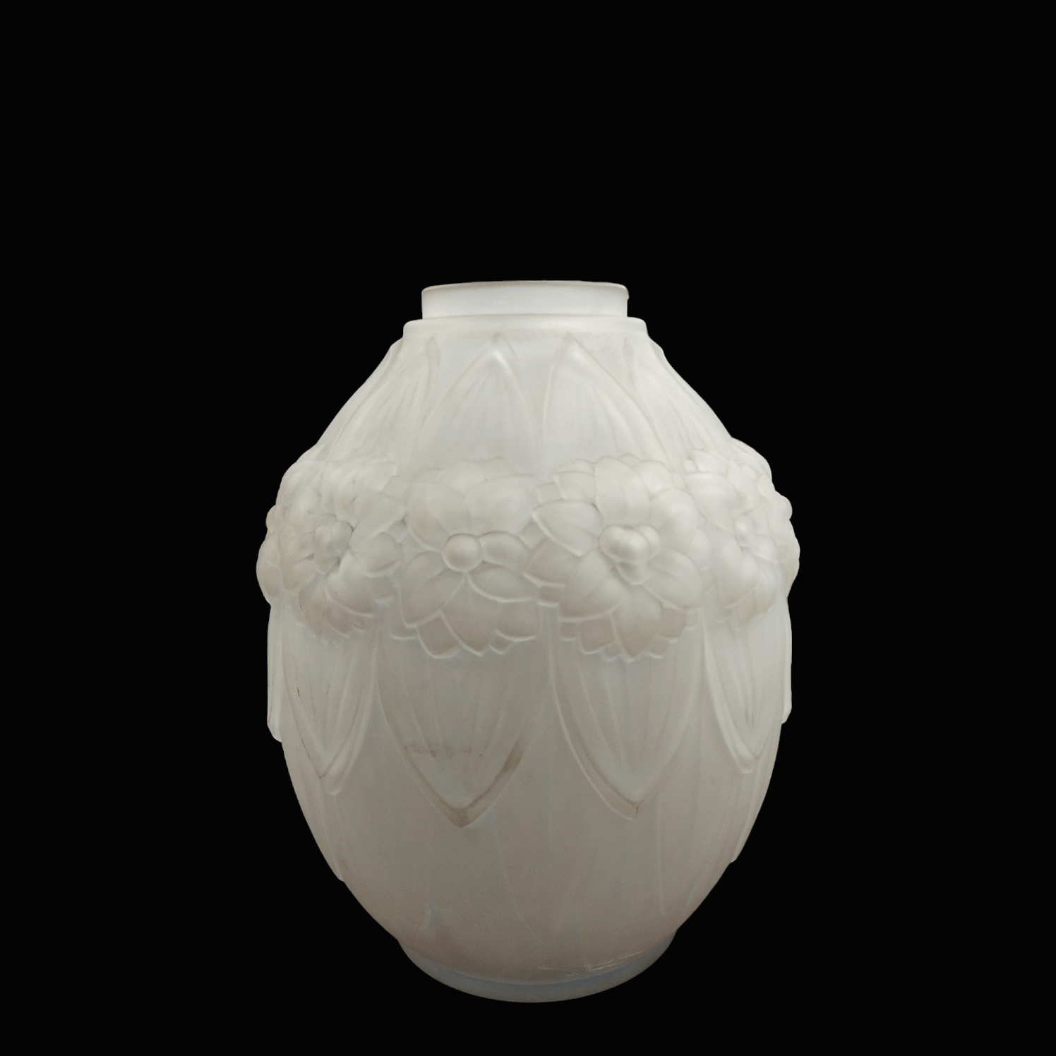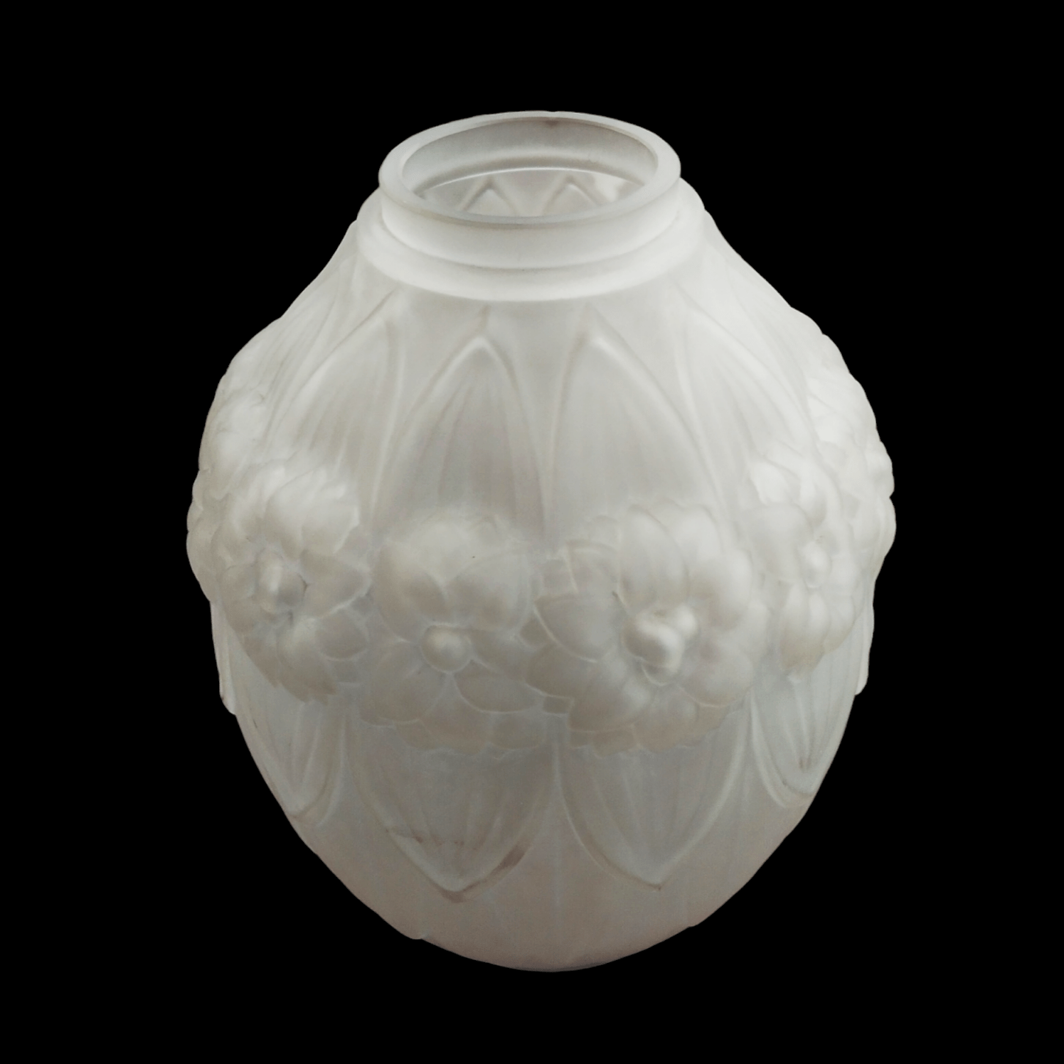 Elegante jarrón de vidrio estilo Lalique, de origen francés, con un bello diseño en relieve de una corona de flores.