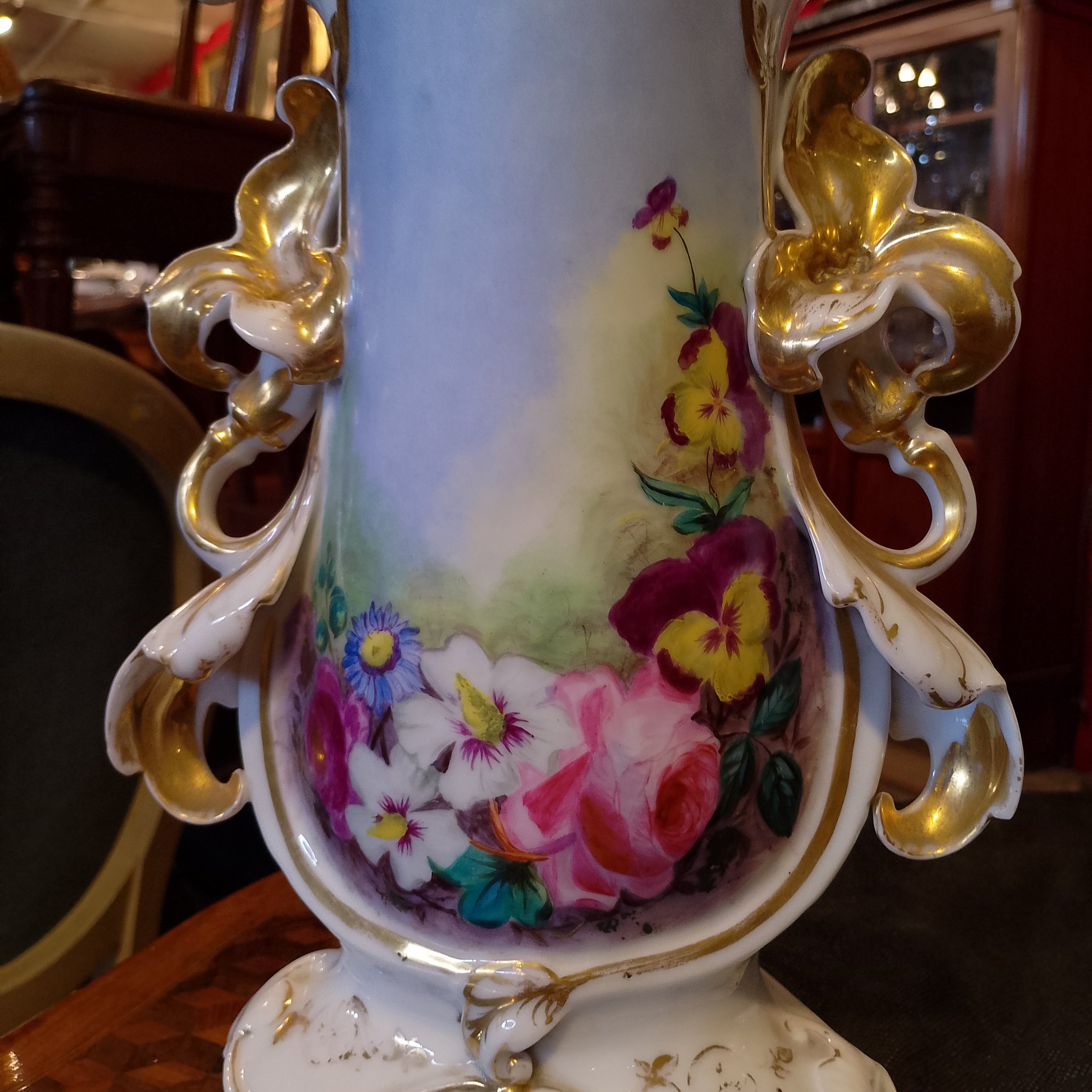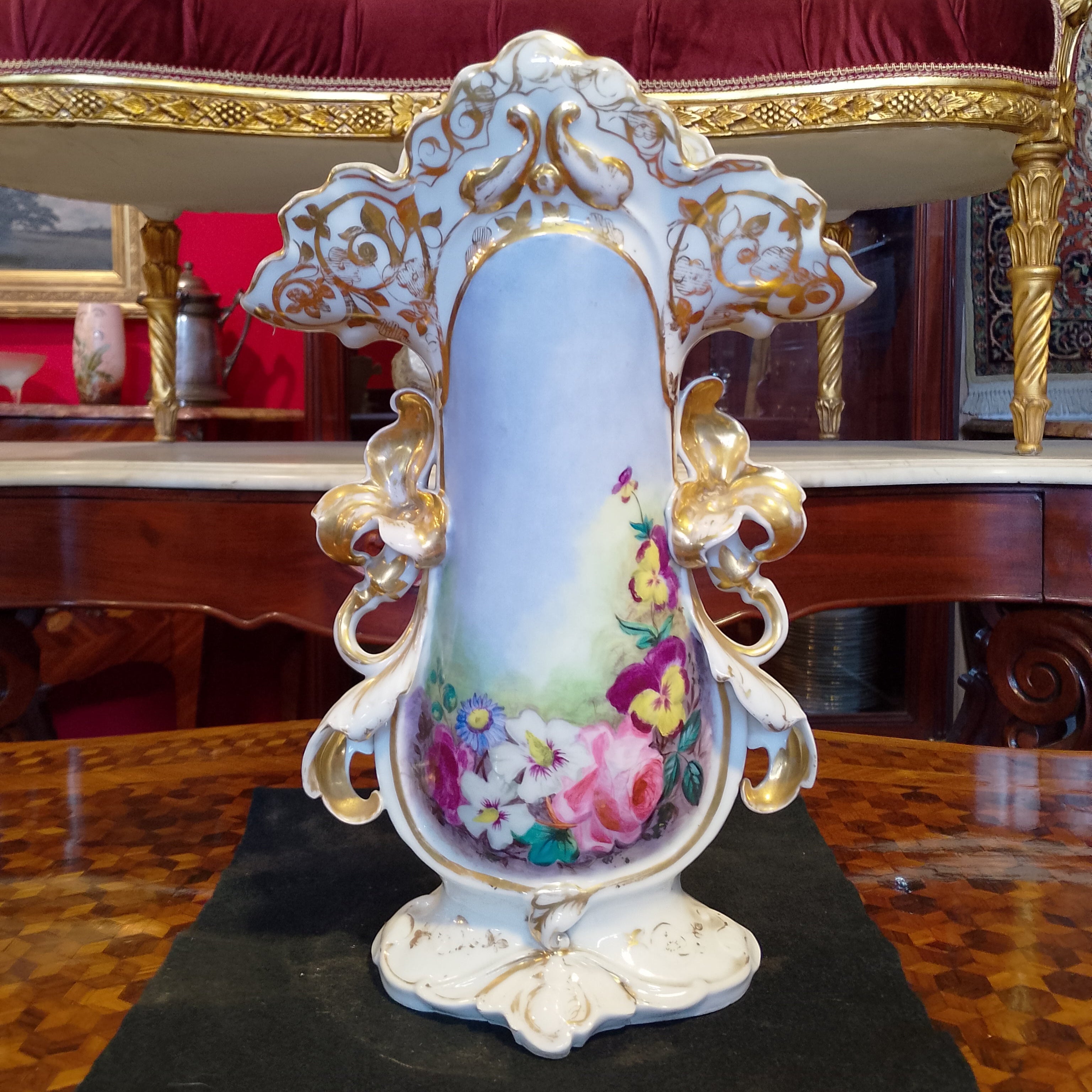 Hermoso jarrón isabelino Vieux Paris, pintado a mano, con un diseño floral en que predominan los colores vivos y el dorado, dando luminosidad y elegancia a su ambiente.
