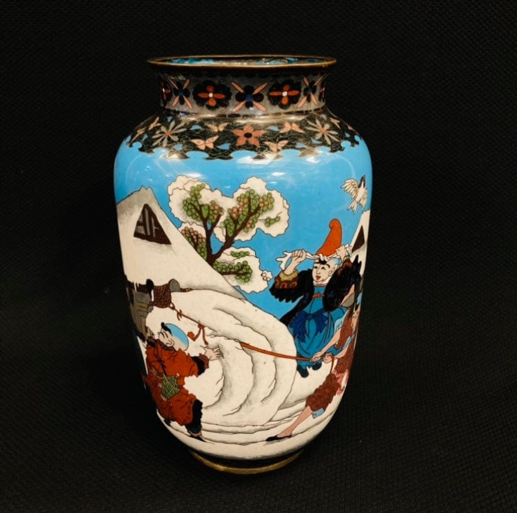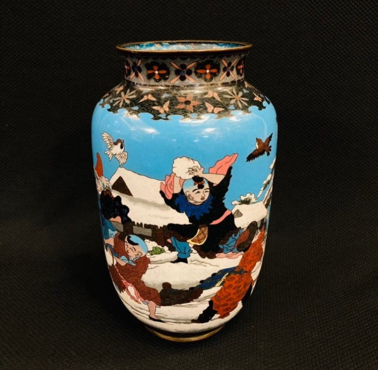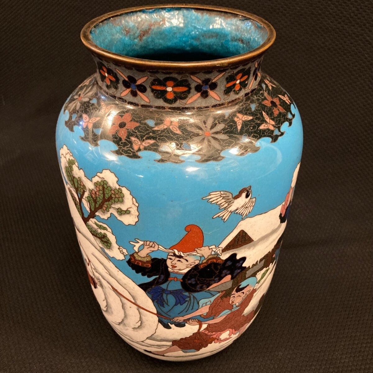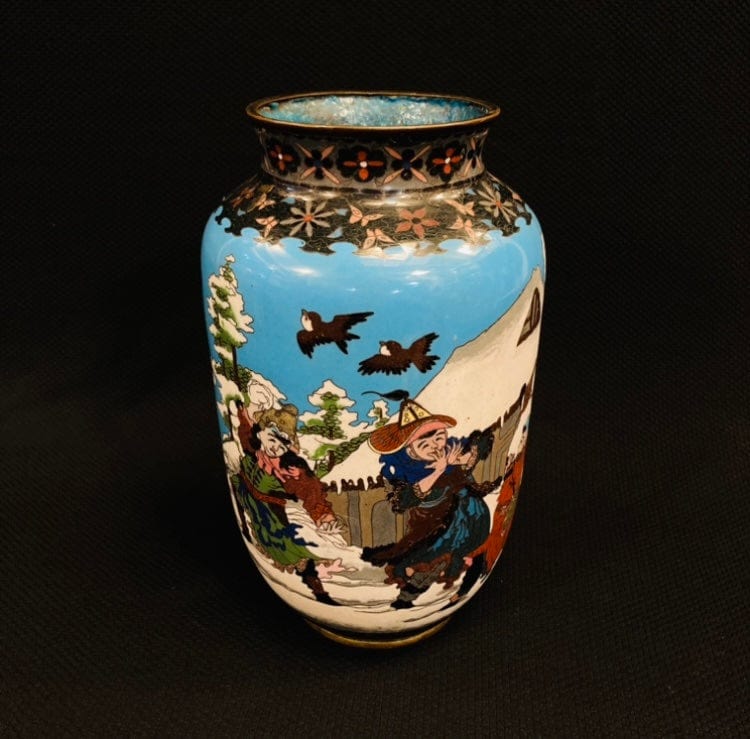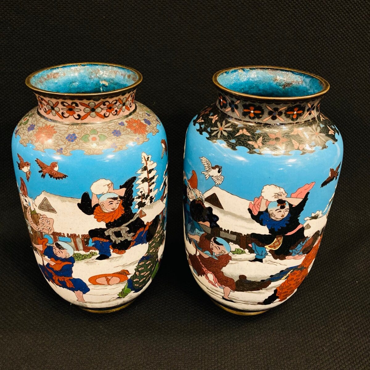 Jarrones japoneses de bronce y esmalte cloissoné motivo invernal