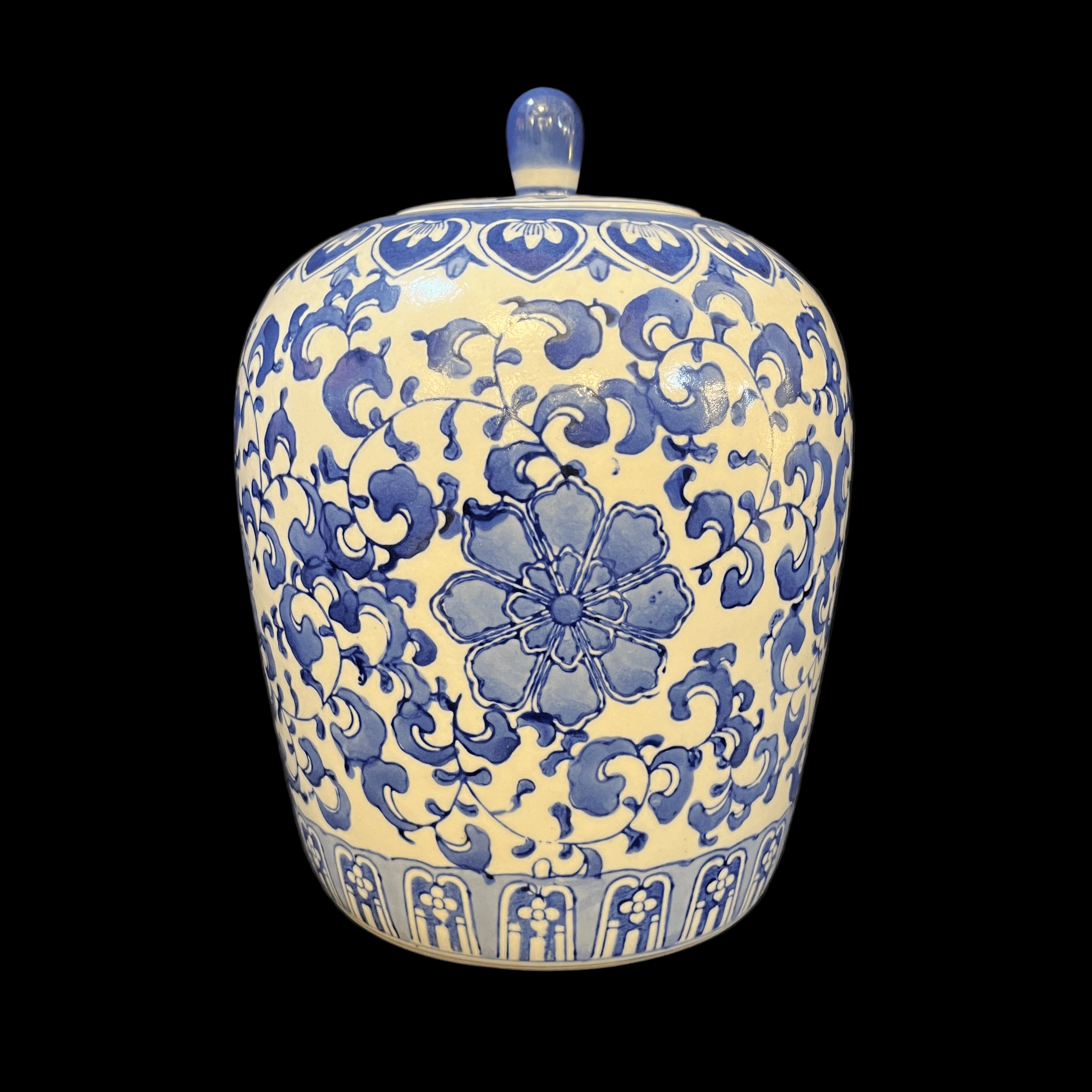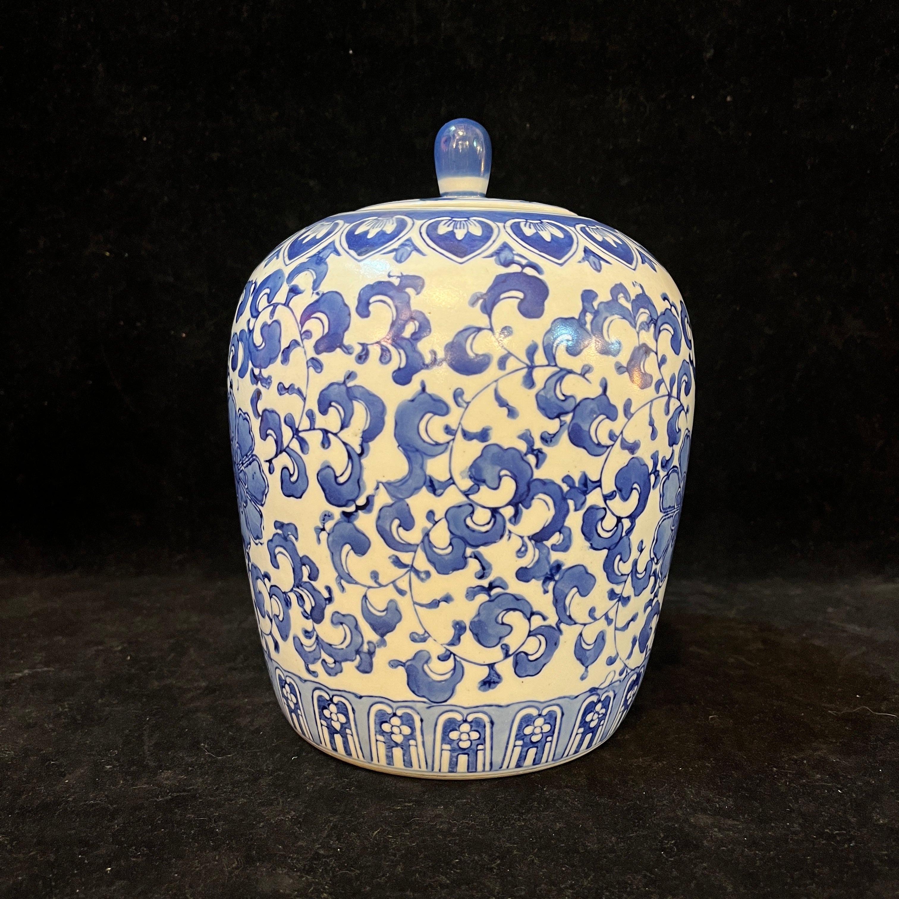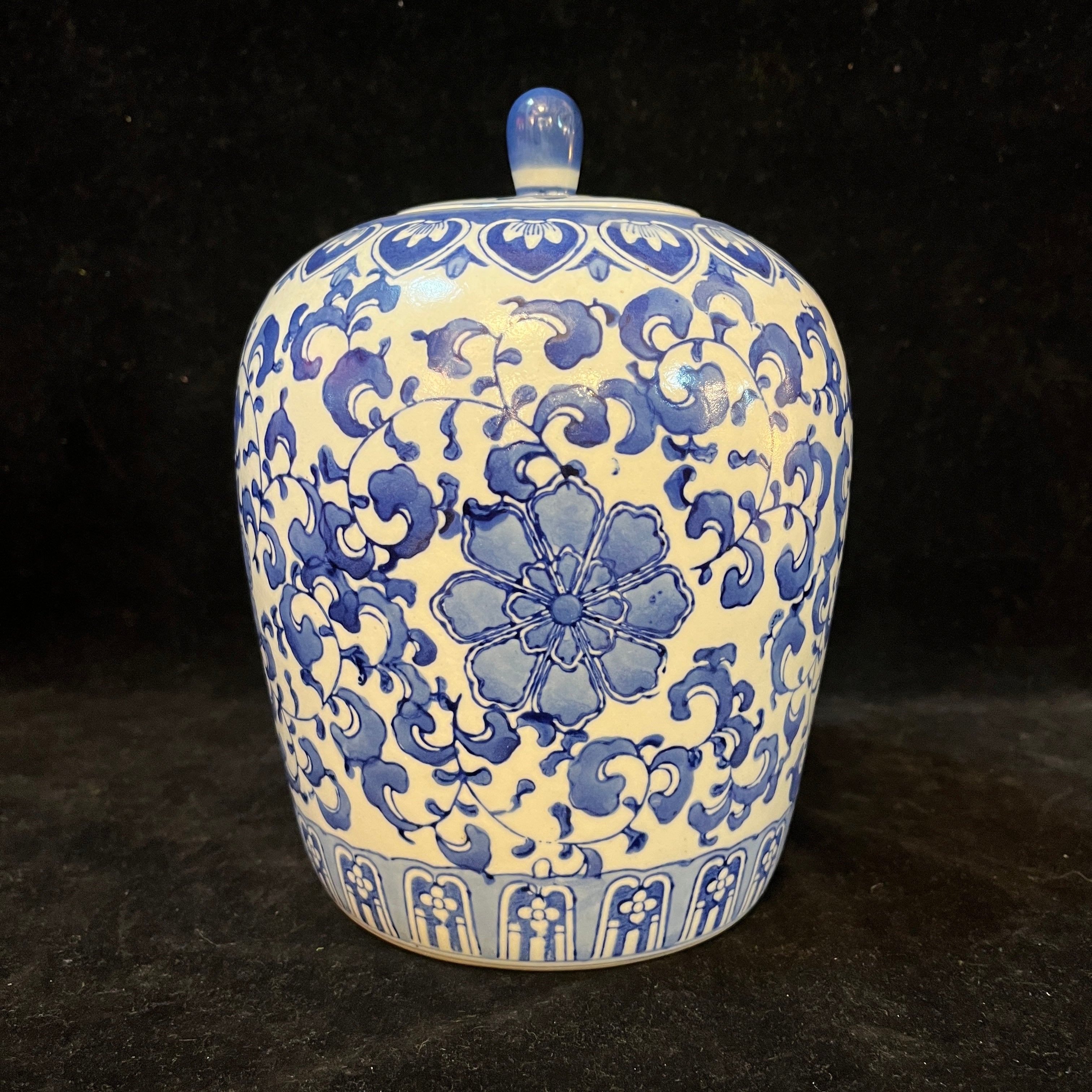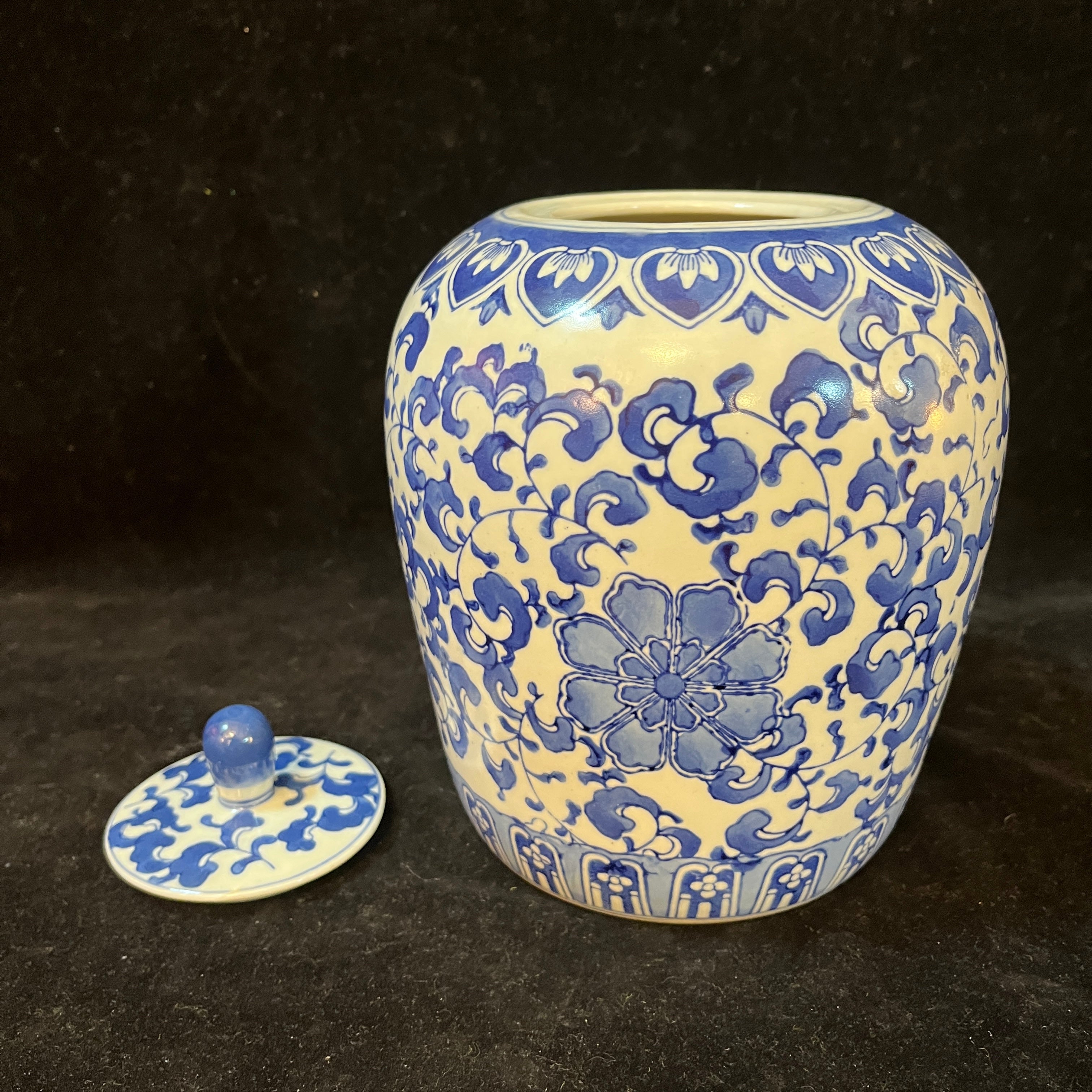 Hermoso potiche de porcelana de origen chino, con diseño de patrones florales en azul. Trae su tapa original y lleva el sello de fabricación en la base.