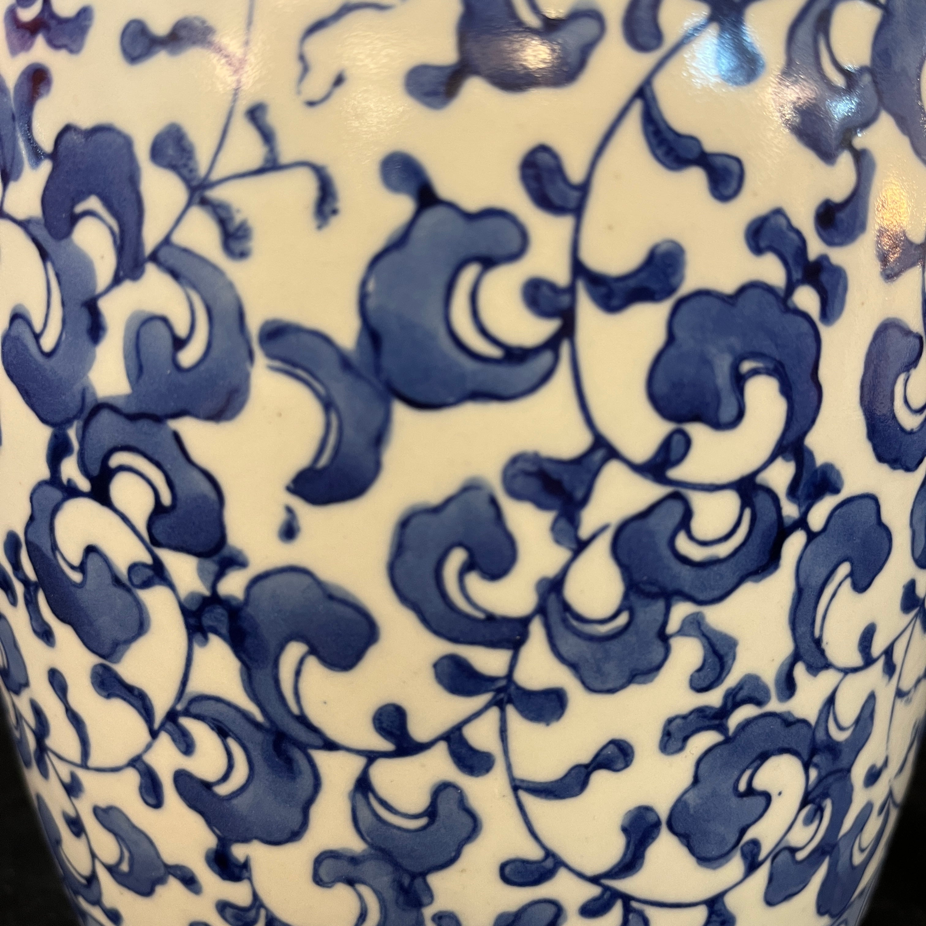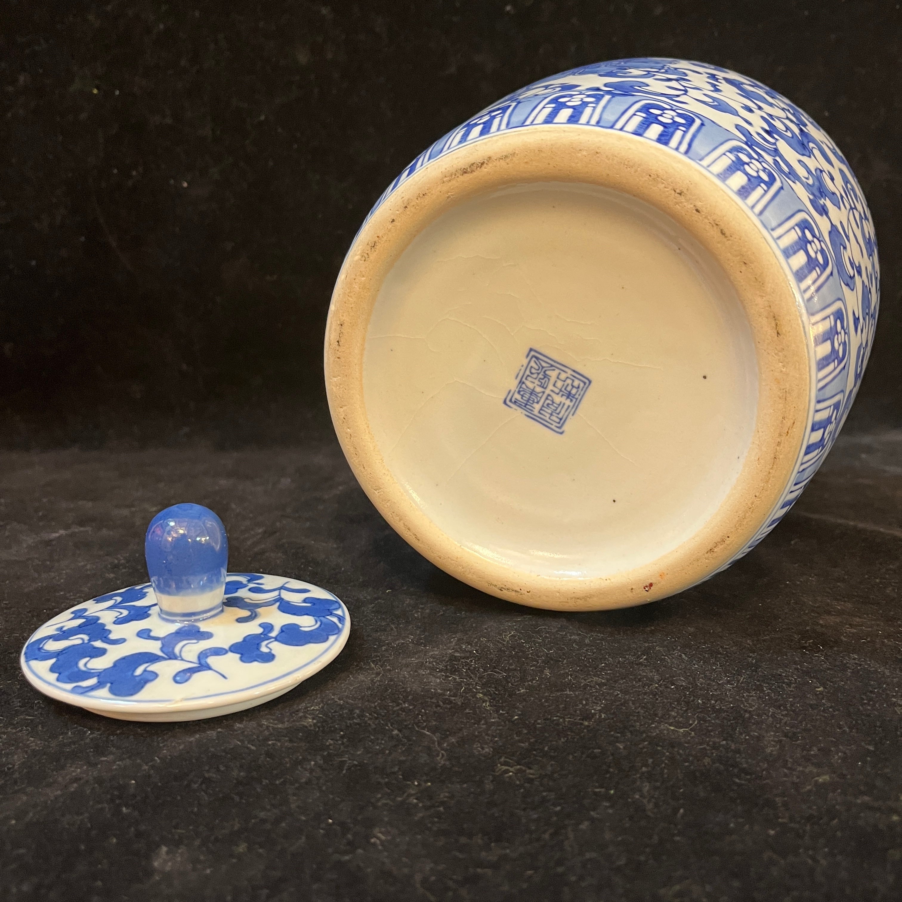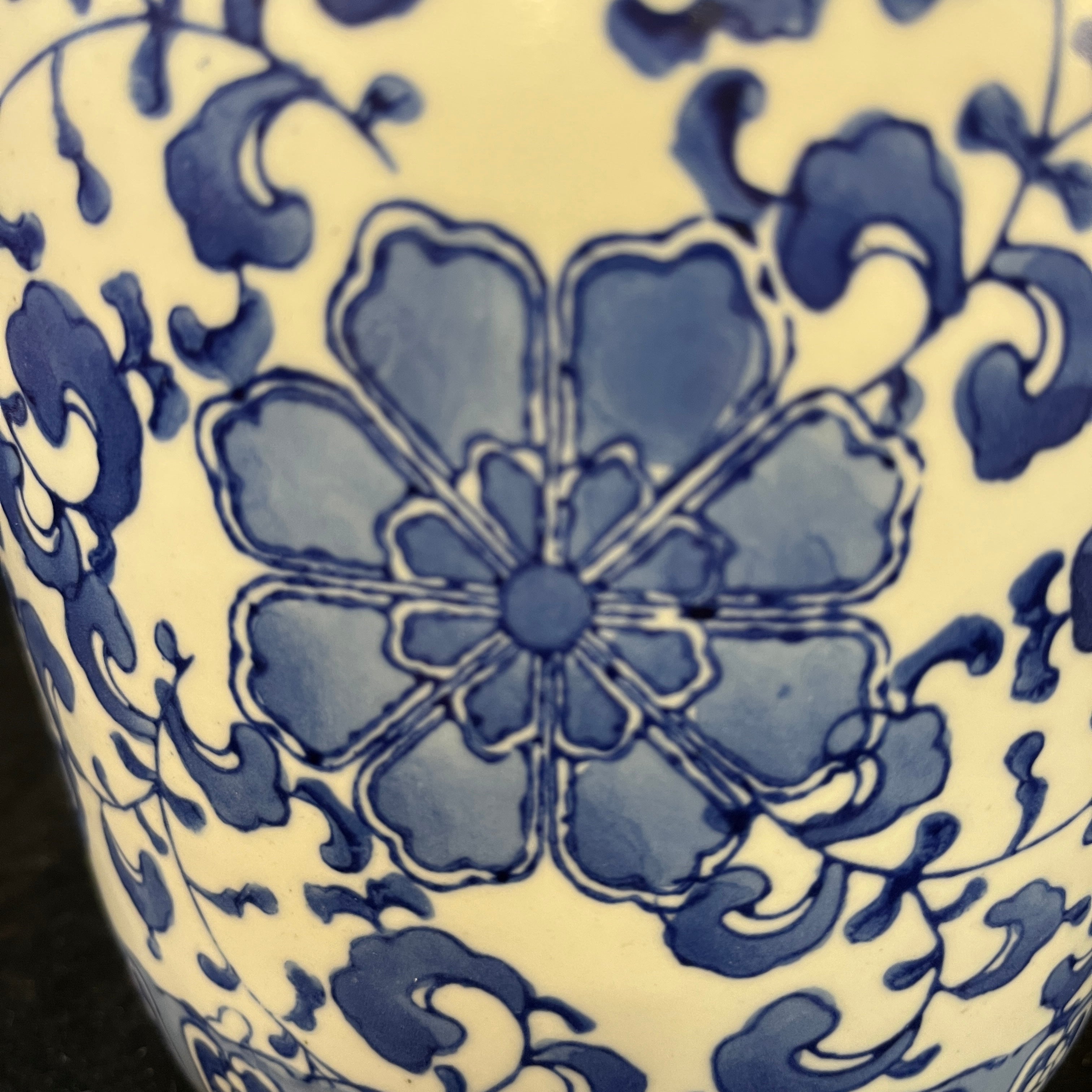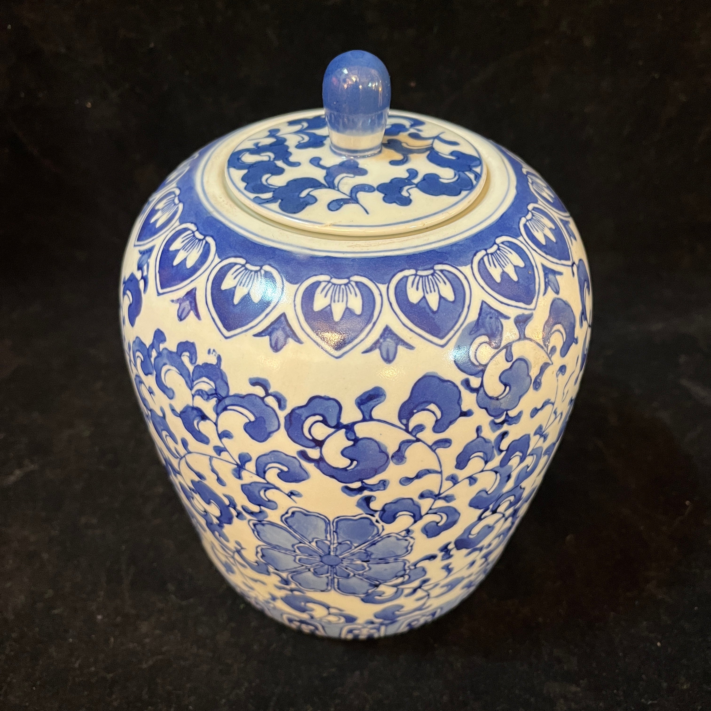 Hermoso potiche de porcelana de origen chino, con diseño de patrones florales en azul. Trae su tapa original y lleva el sello de fabricación en la base.