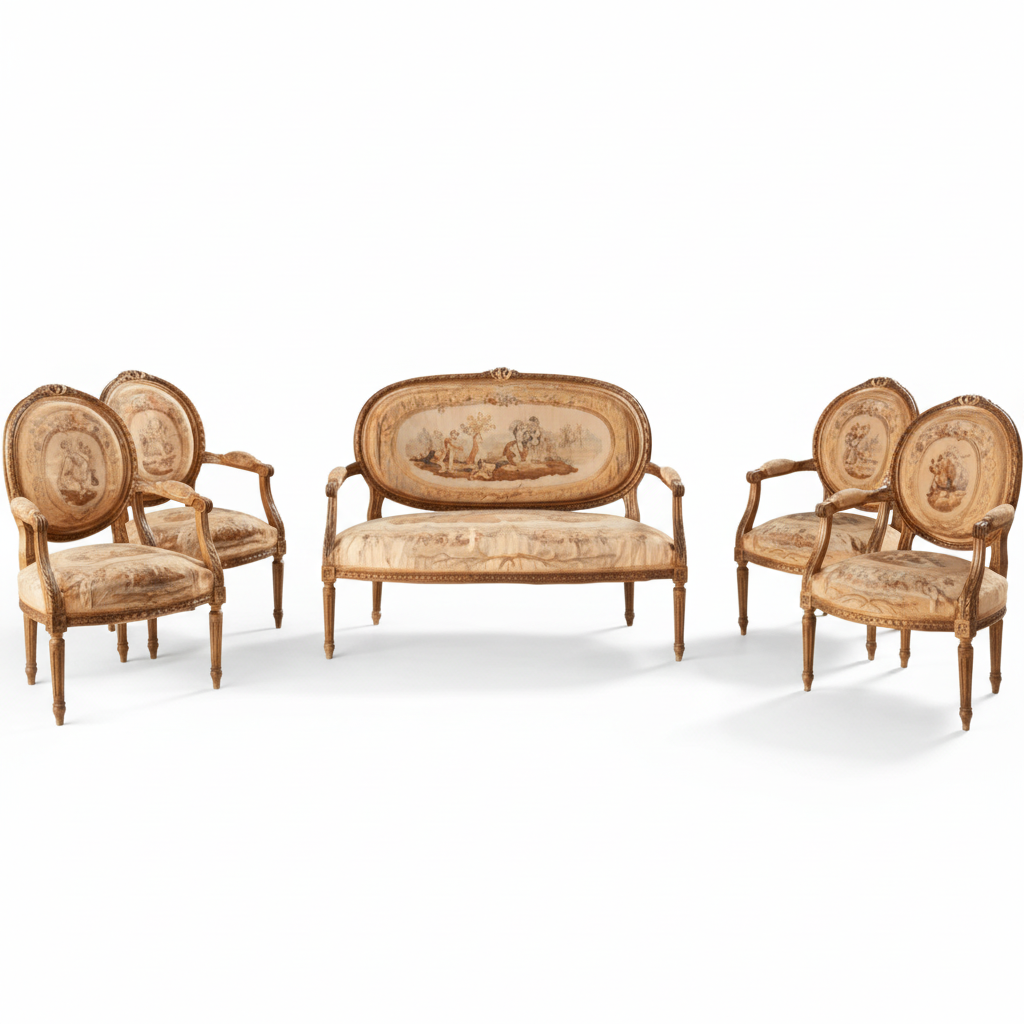 Conjunto compuesto por un sofá y cuatro sillones con respaldo medallón. Molduras con cintas y lazos; apoyabrazos con decoración de hojas de acanto; patas estriadas. Tapicería con escenas aldeanas y animales.