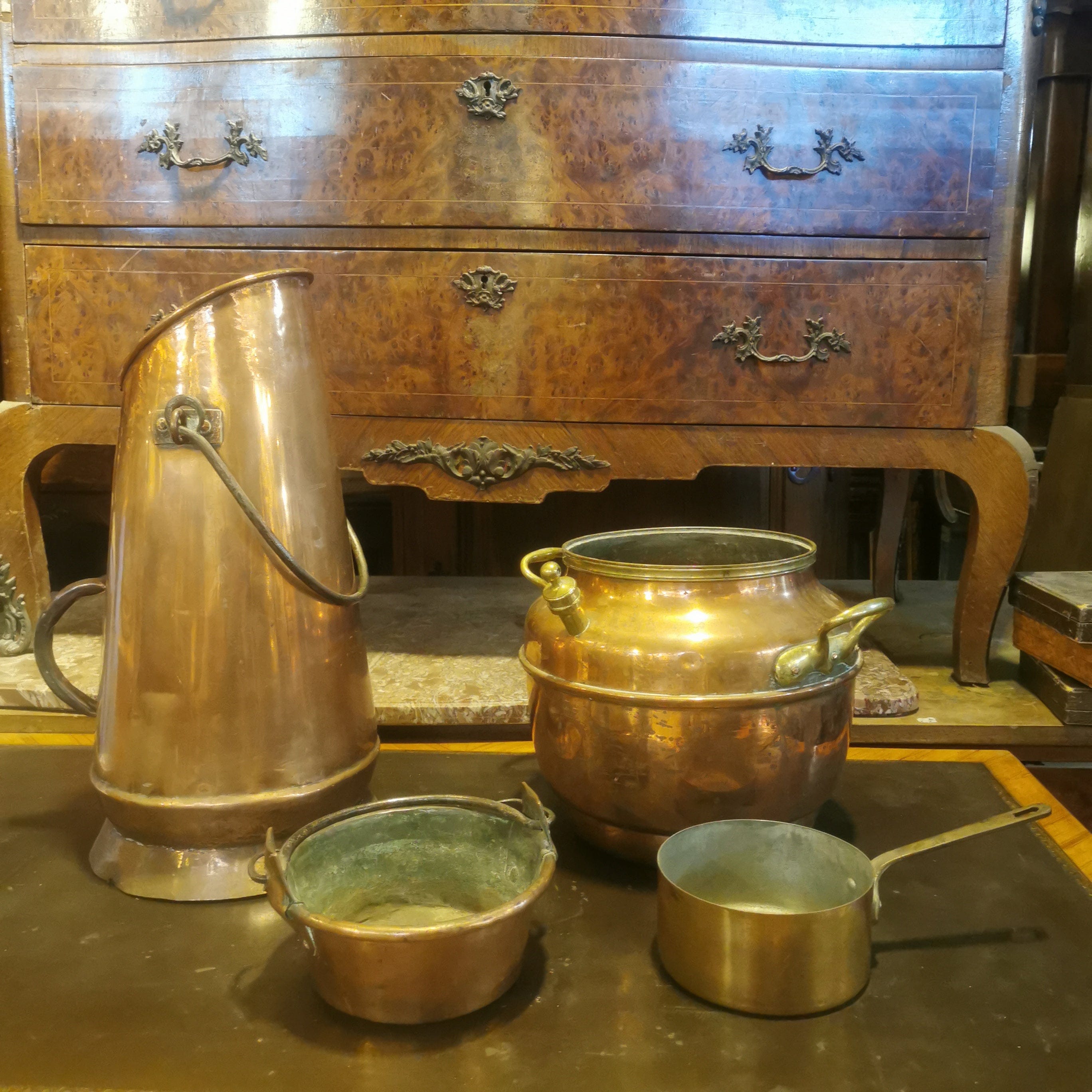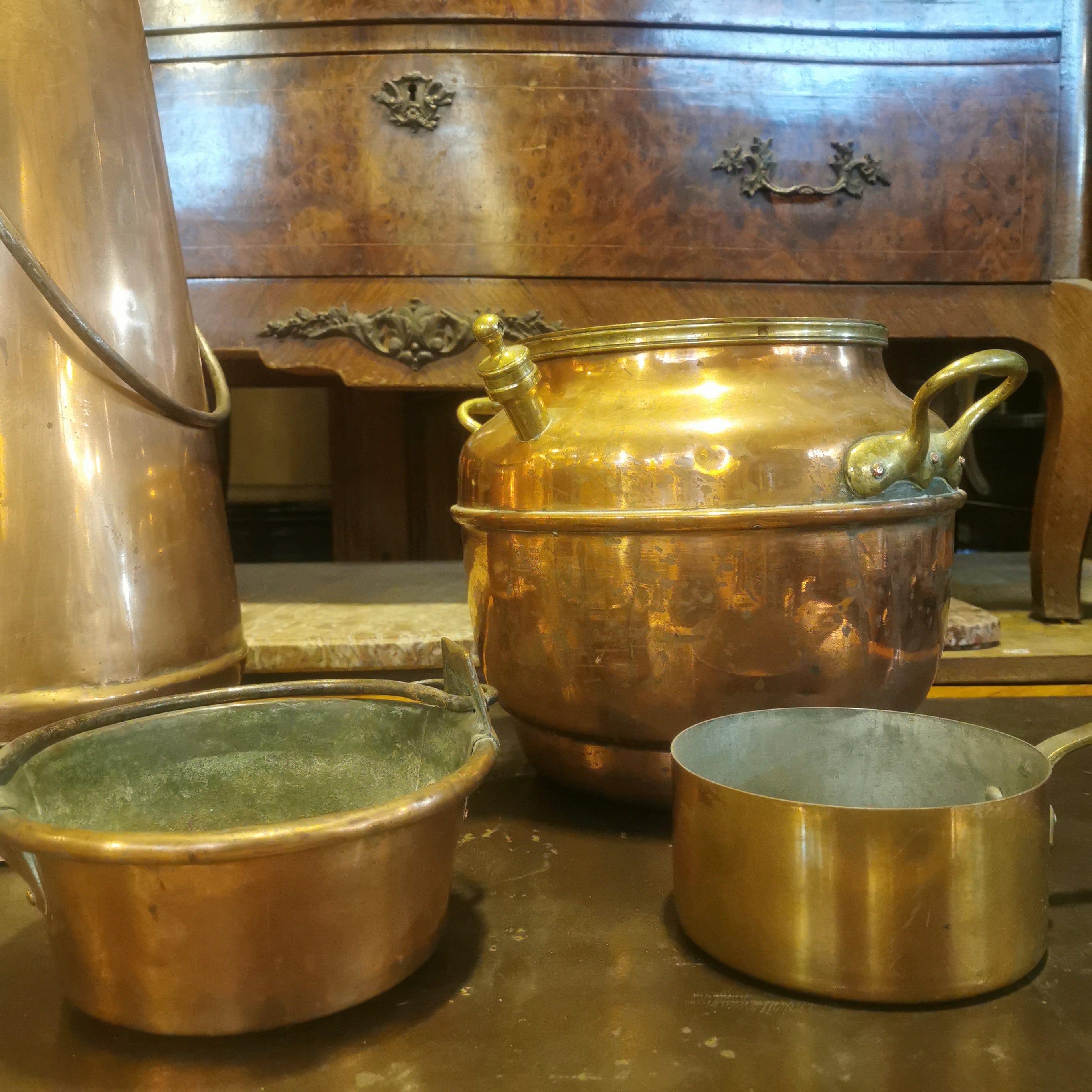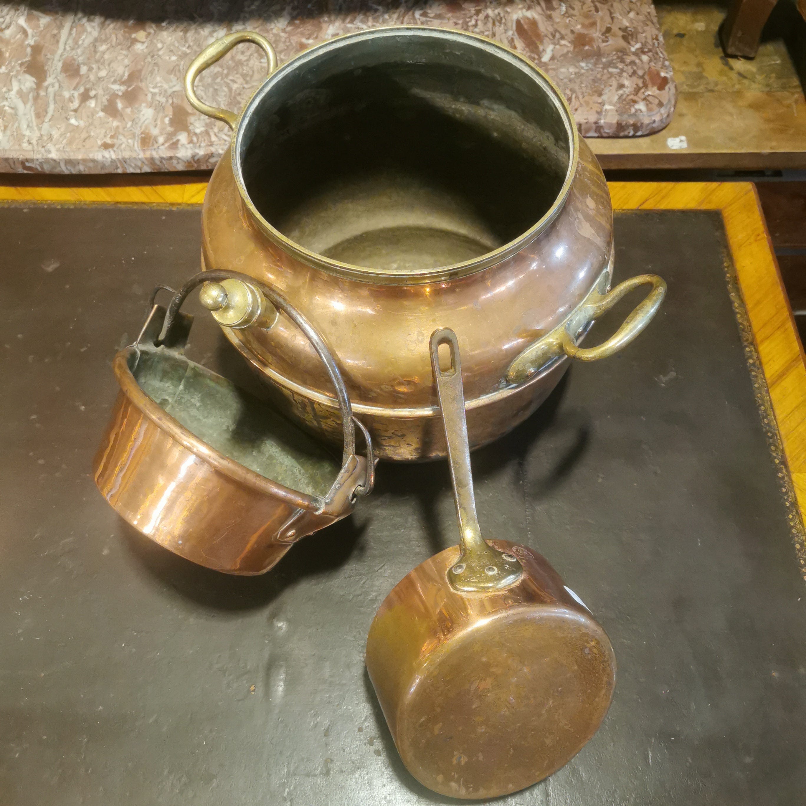 Bellas piezas de cobre francesas. Tres llevan su sello original.