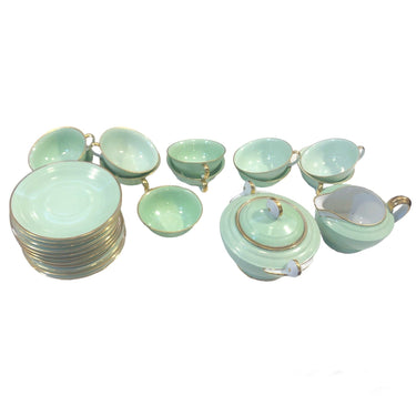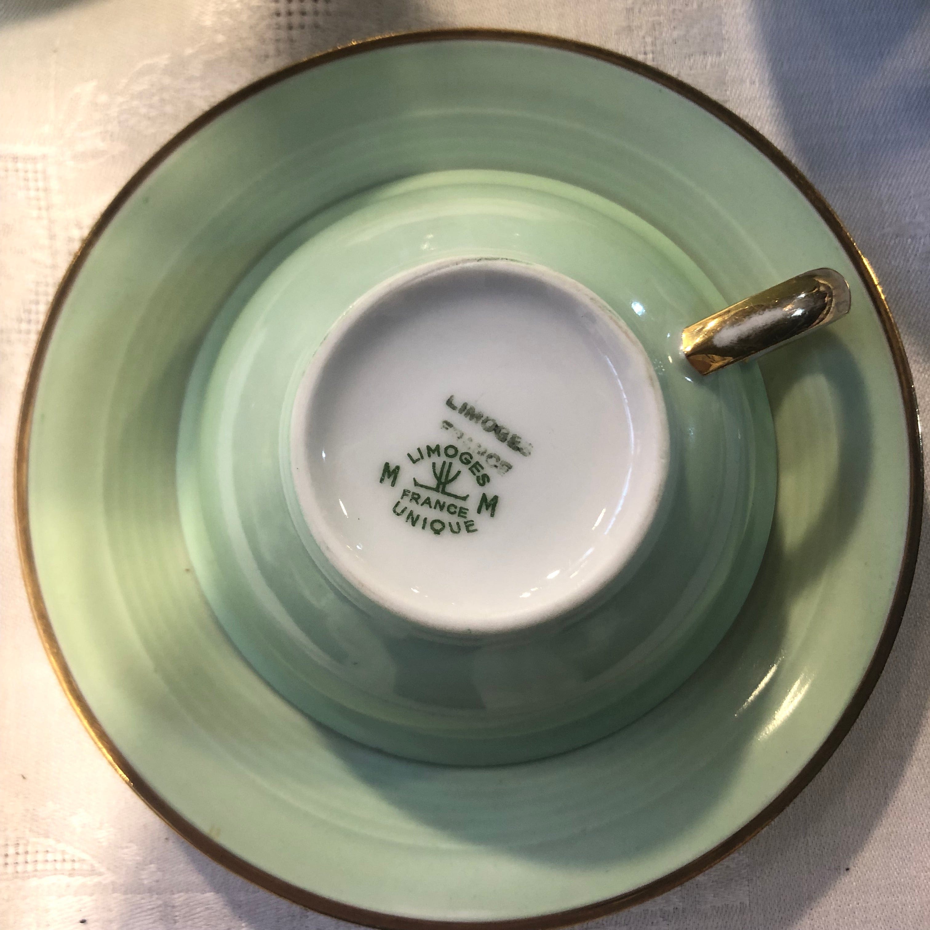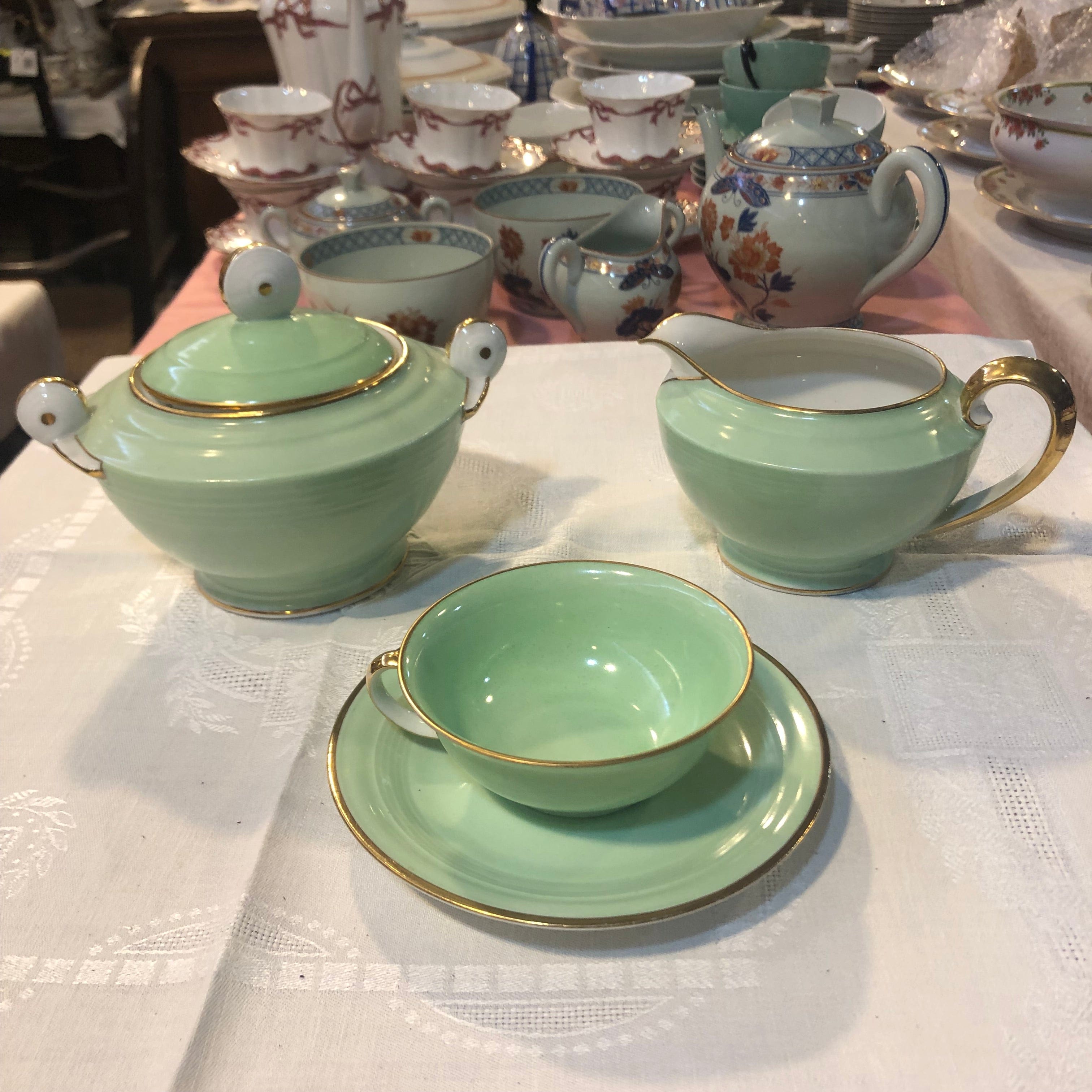 Precioso y fino juego de té de porcelana Limoges en verde y dorado.