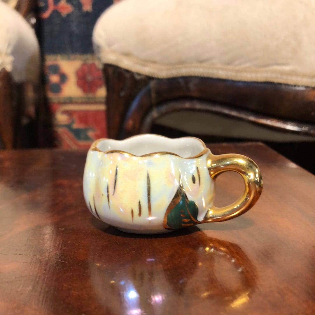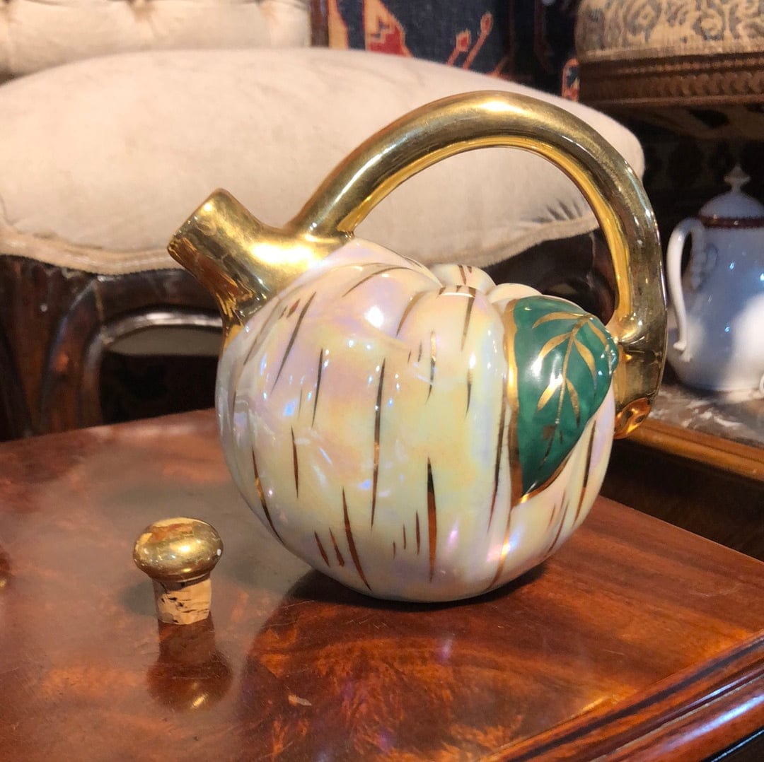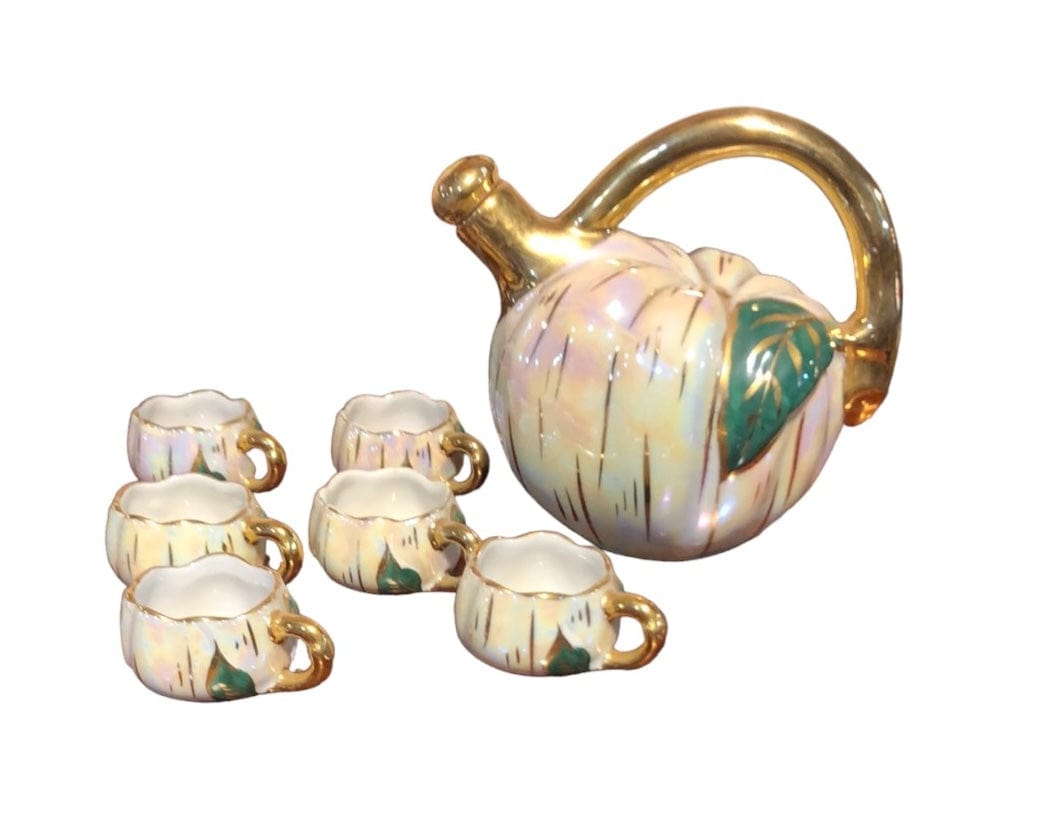 Preciosa licorera en forma de calabaza, con un juego de siete tacitas también emulando calabazas. La licorera cuenta con un corcho. Fábrica Berry de Limoges.