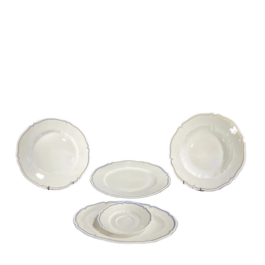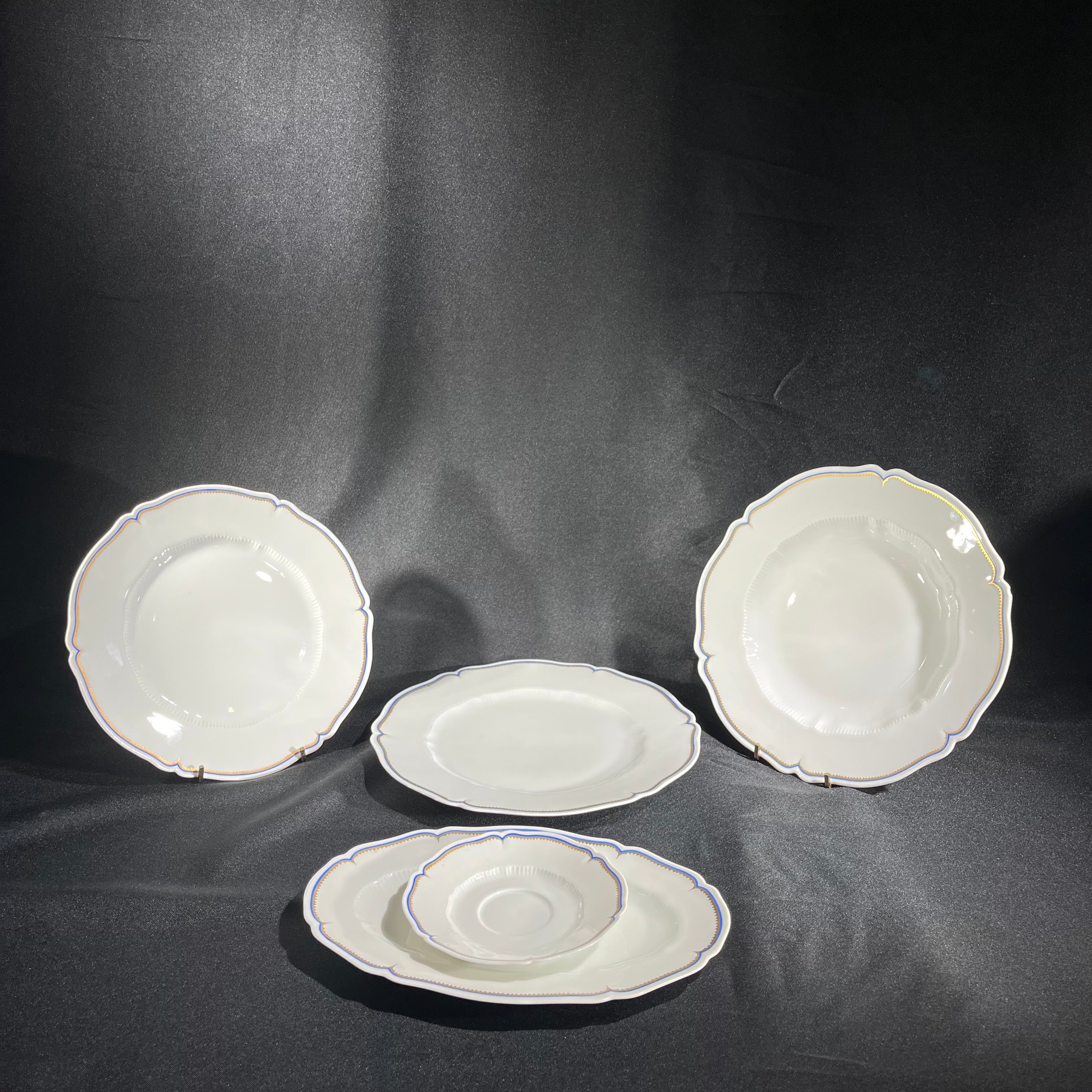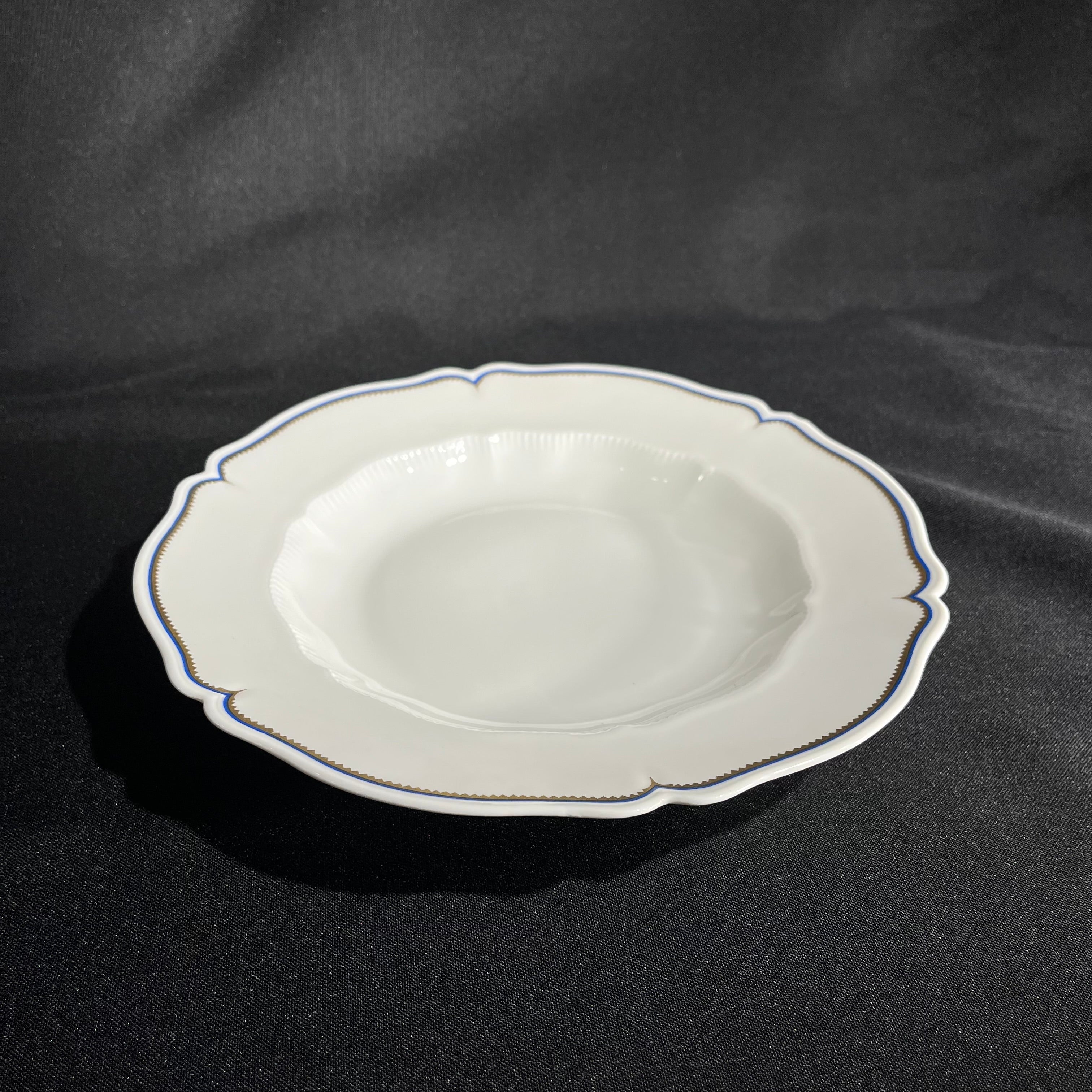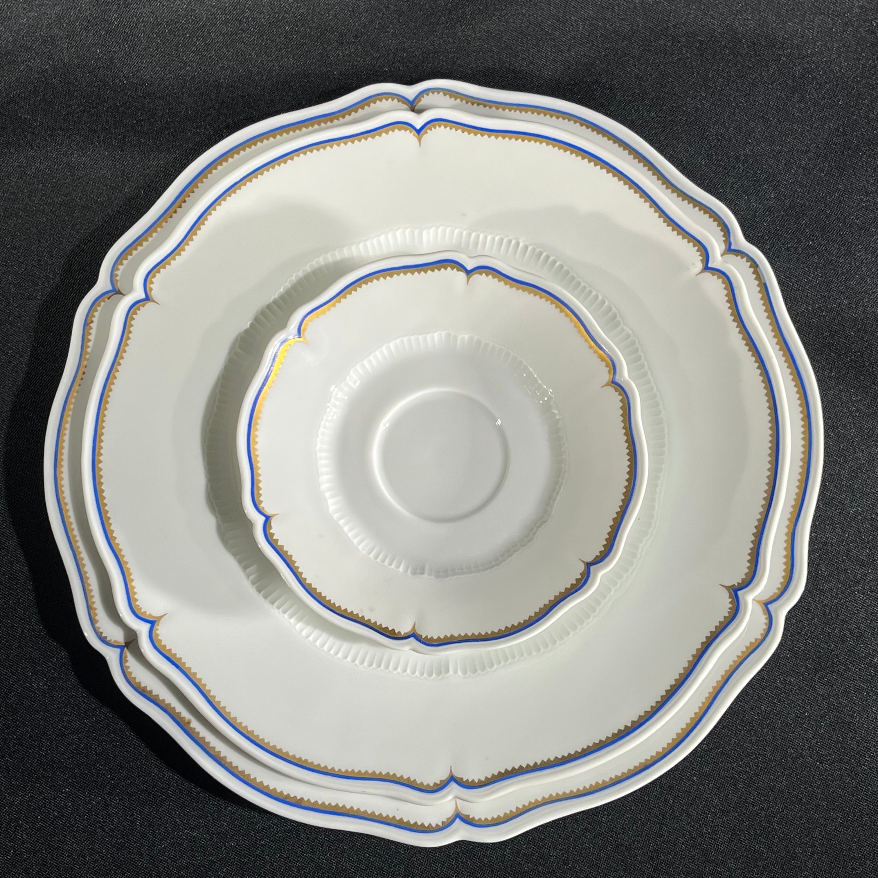 Porcelana francesa blanca Limoges Haviland con borde azul y detalle en oro para 12 personas
