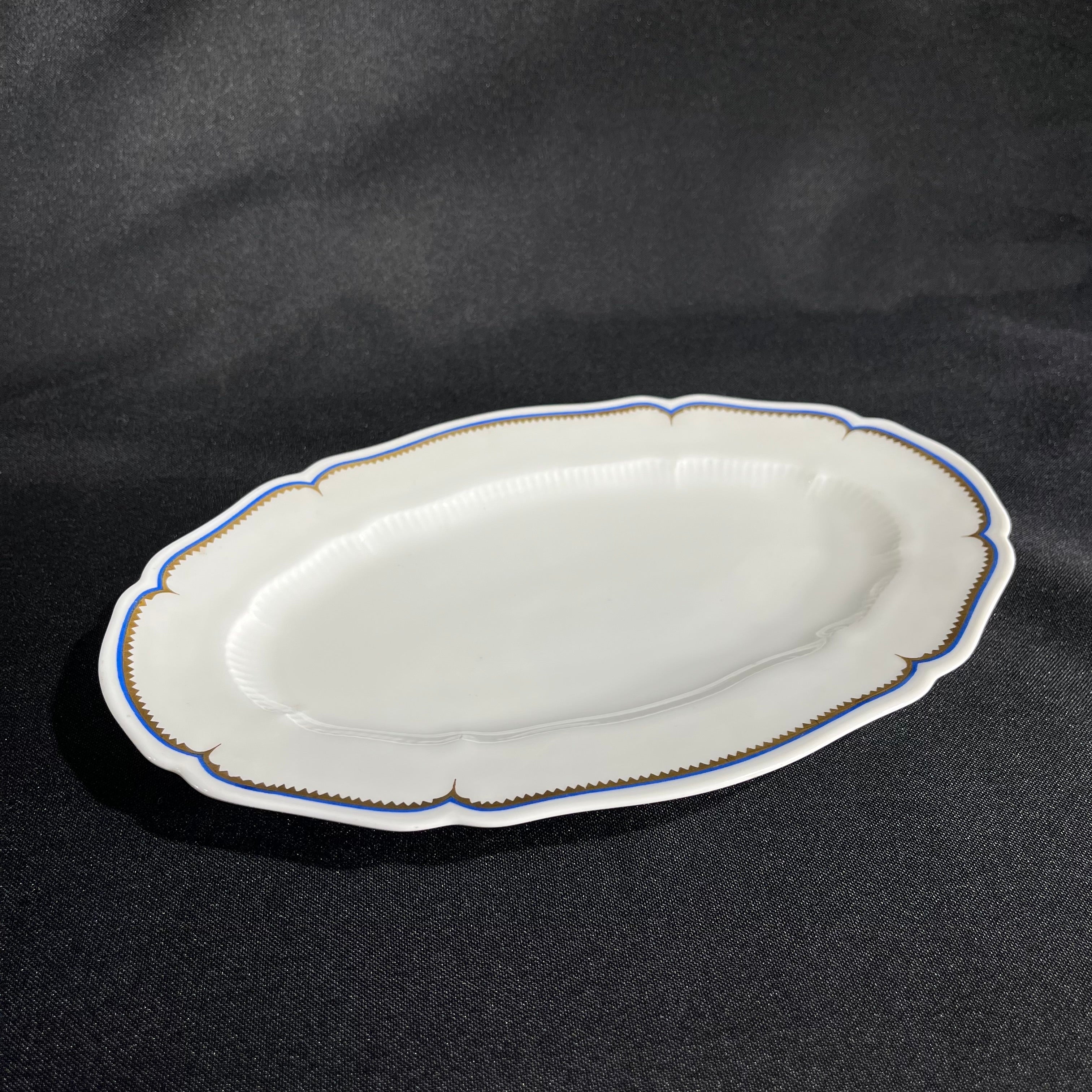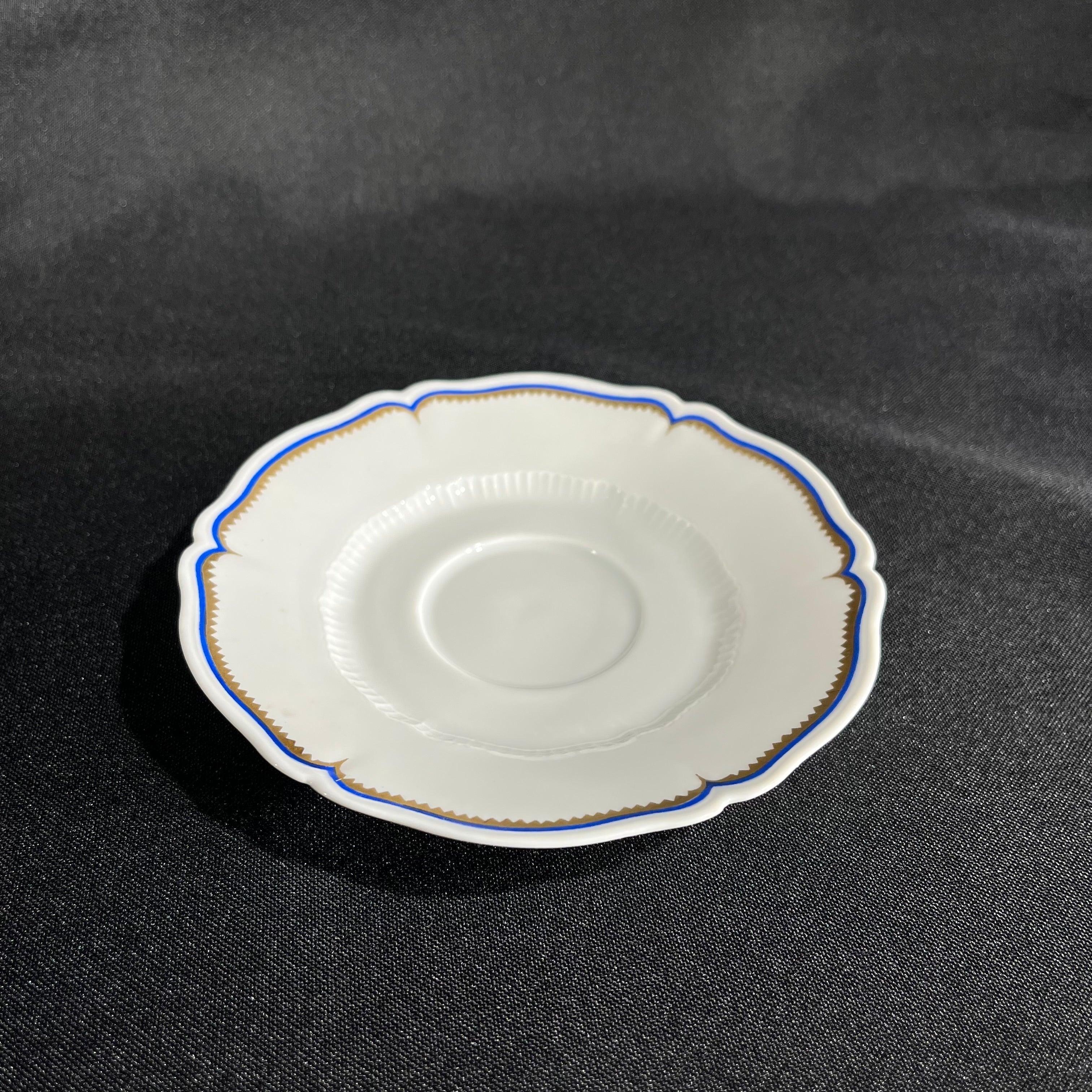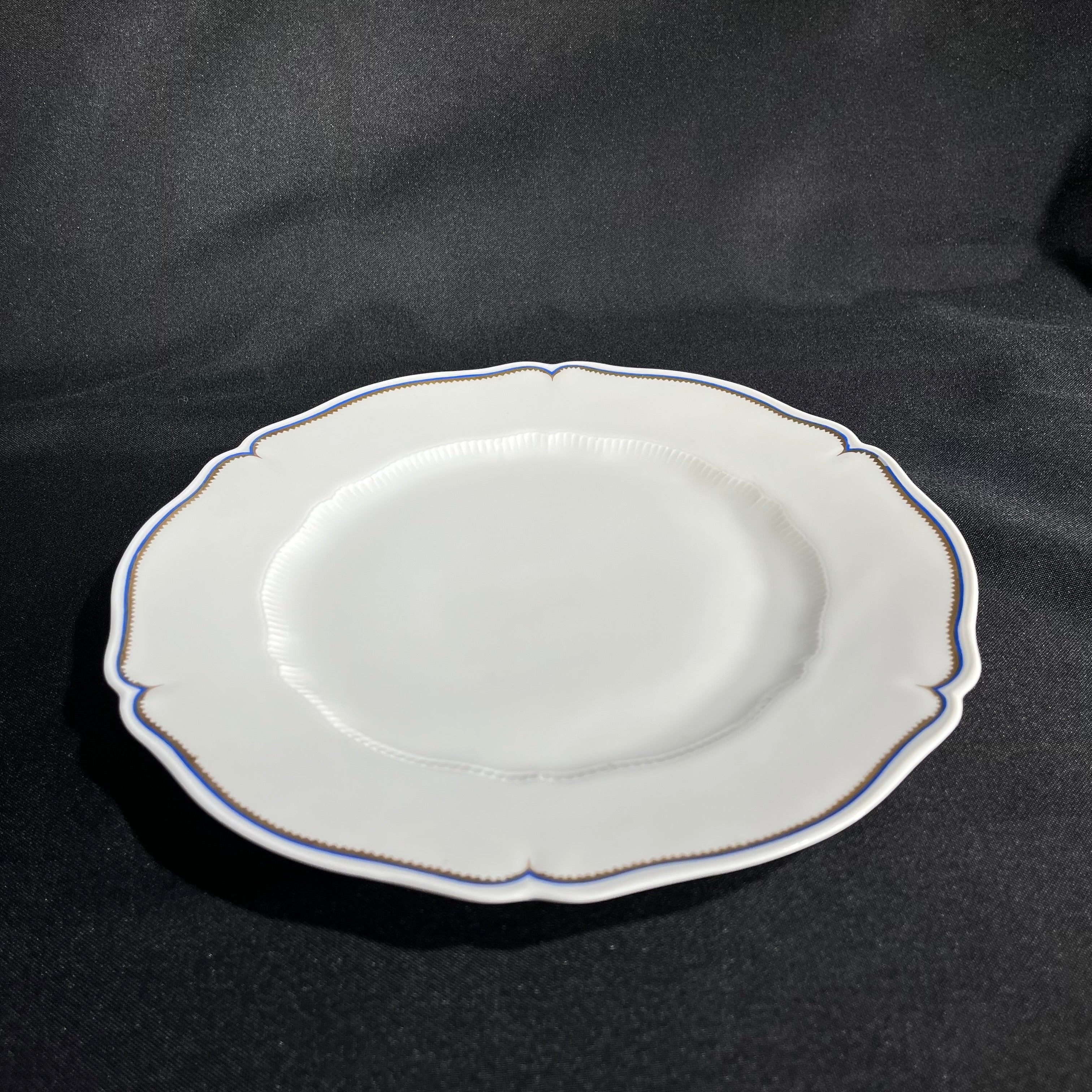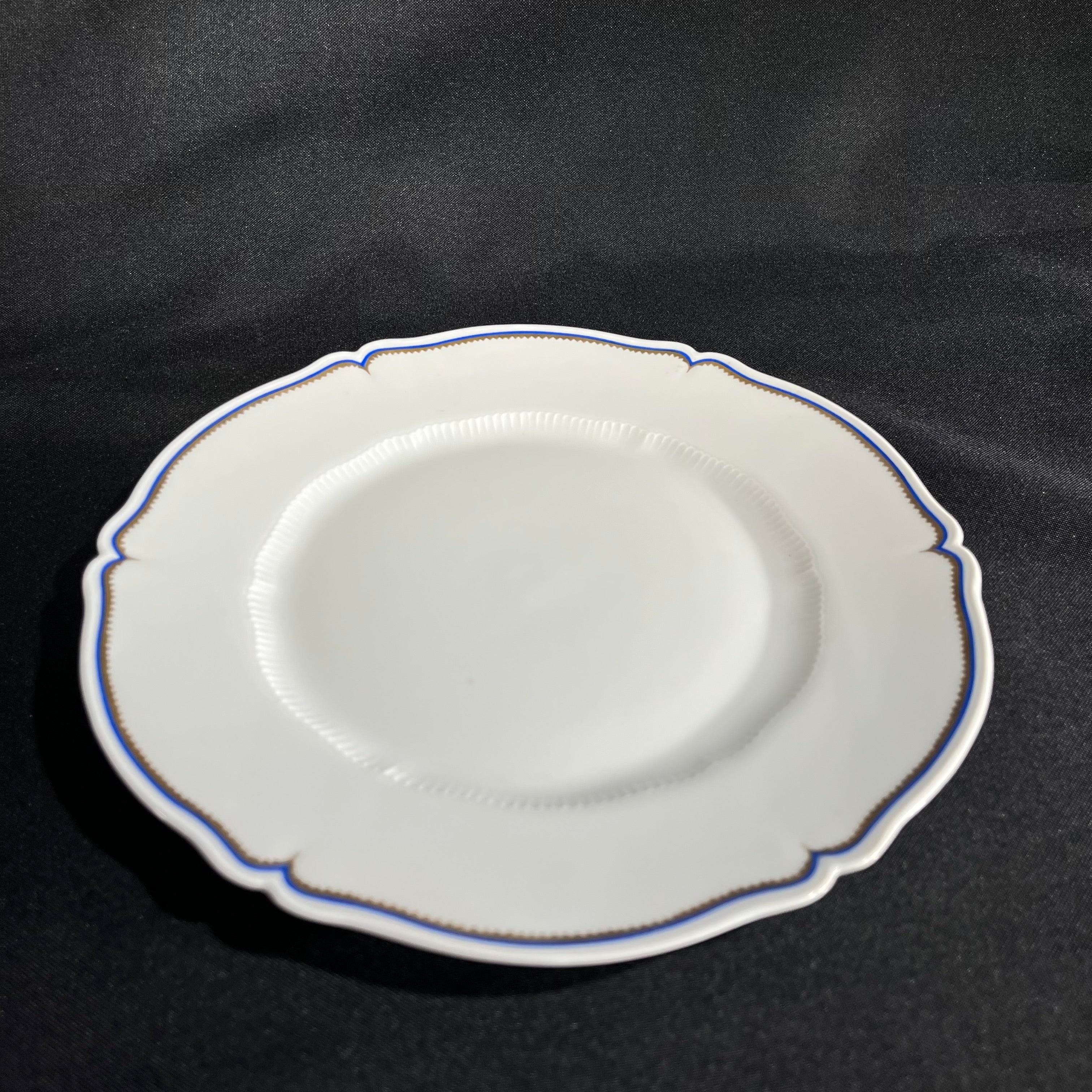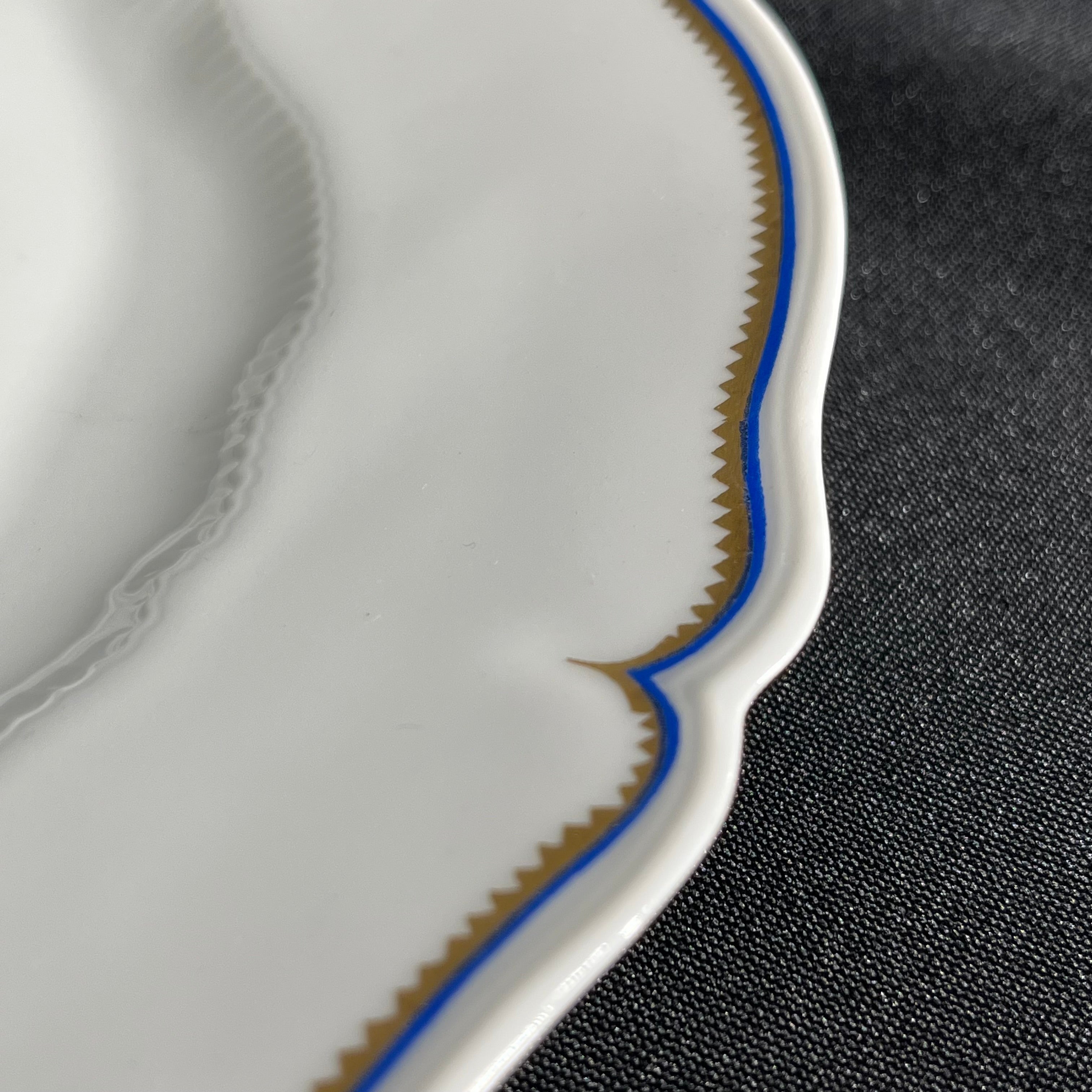 Precioso juego de platos para servir de la prestigiosa marca francesa Limoges Haviland, blanca con un fino delineado azul príncipe y terminación en oro. Los platos son circulares con borde lobulado. Es un juego ideal para utilizar en pequeñas cafeterías que deseen dar un toque especial en sus mesas.