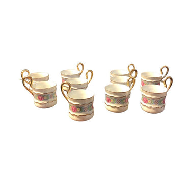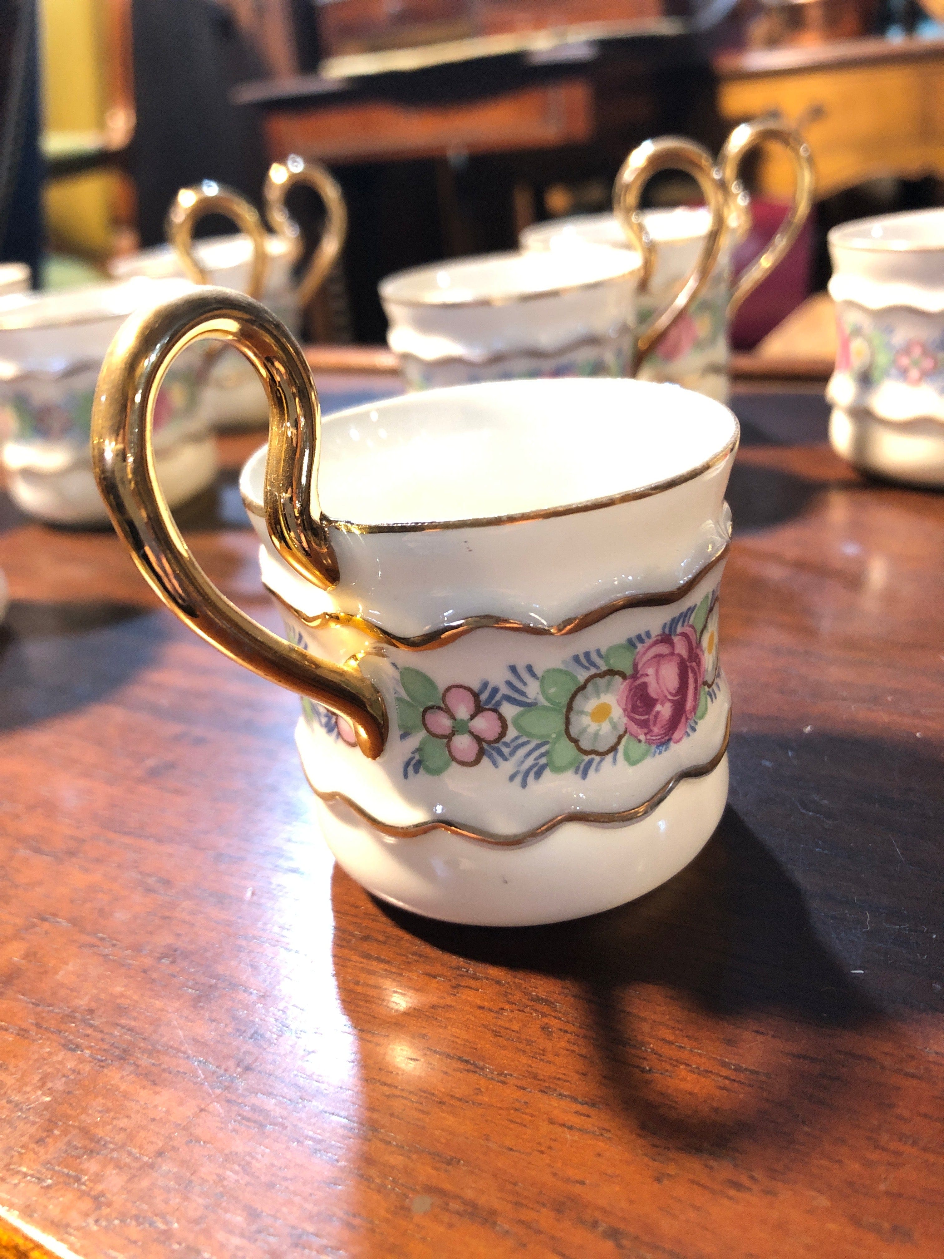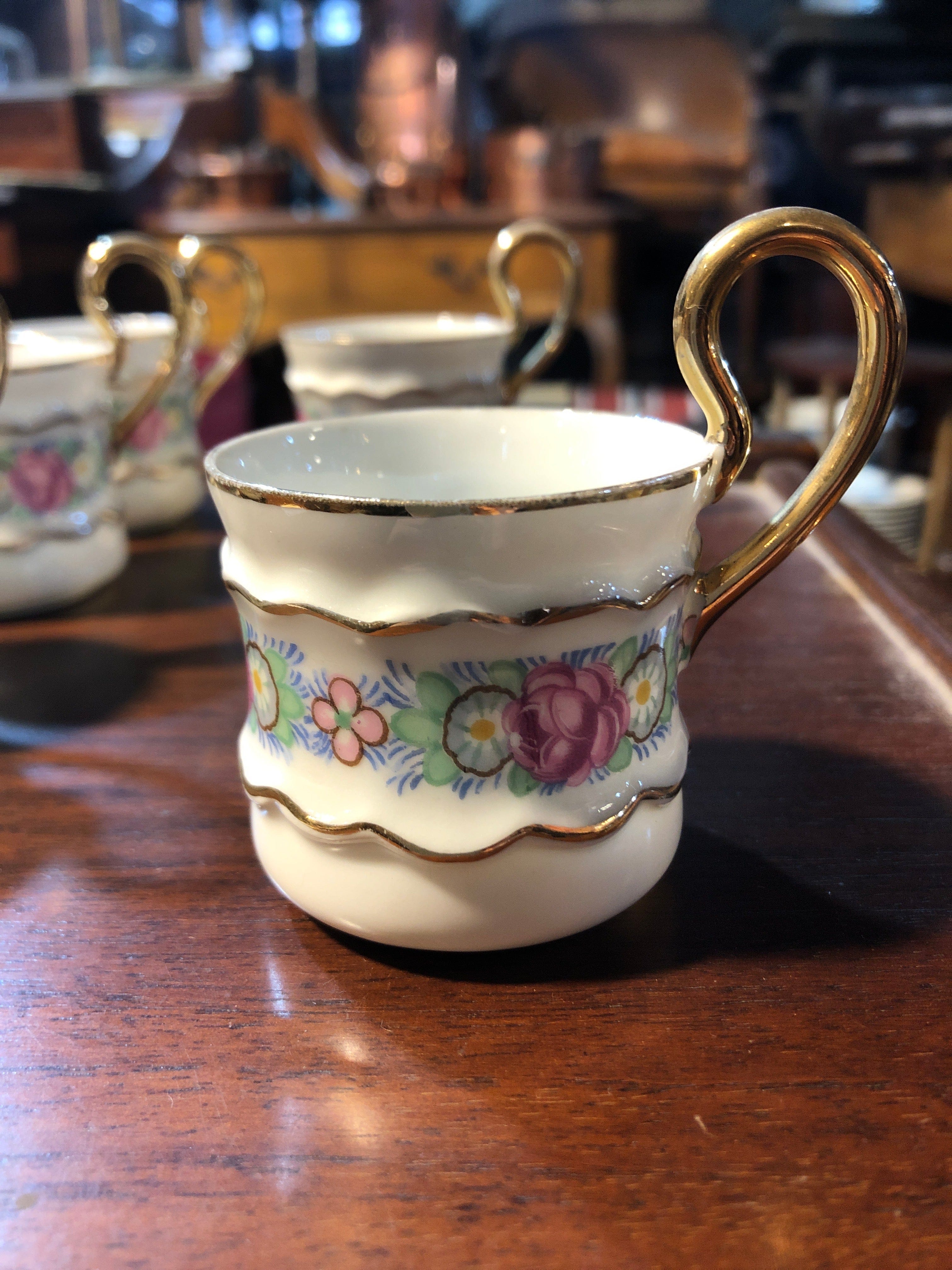 Precioso grupo de tacitas para café Mazagran de porcelana francesa, con oreja dorada y detalles florales en el cuerpo.