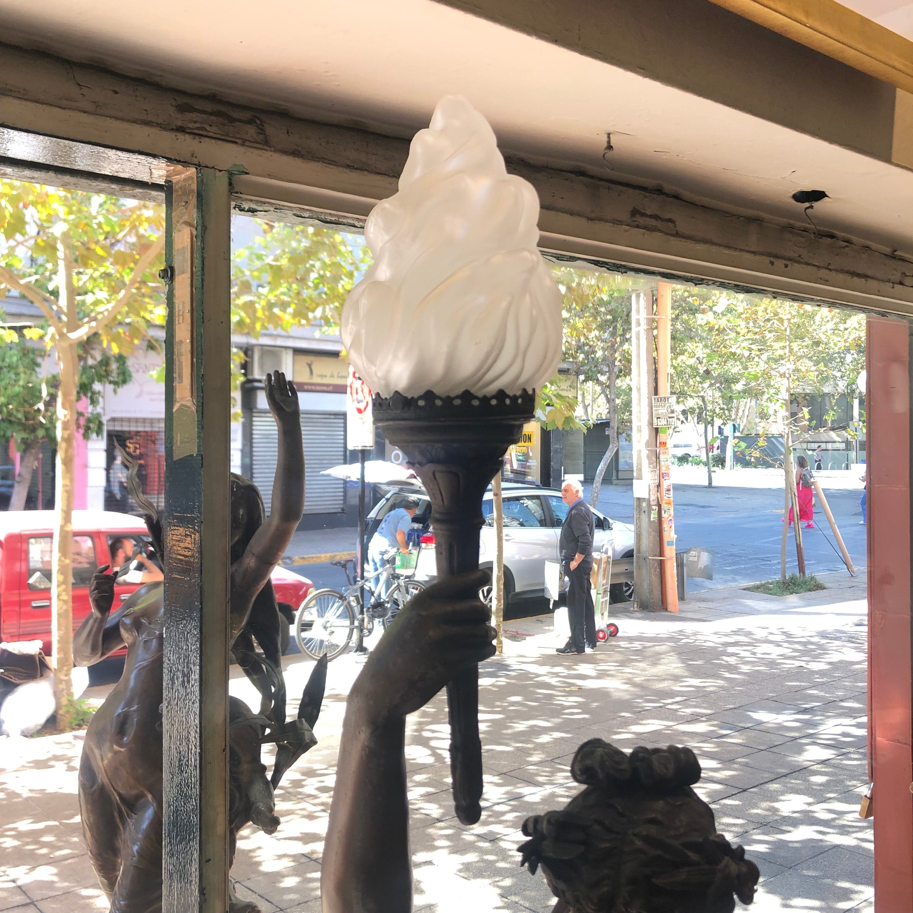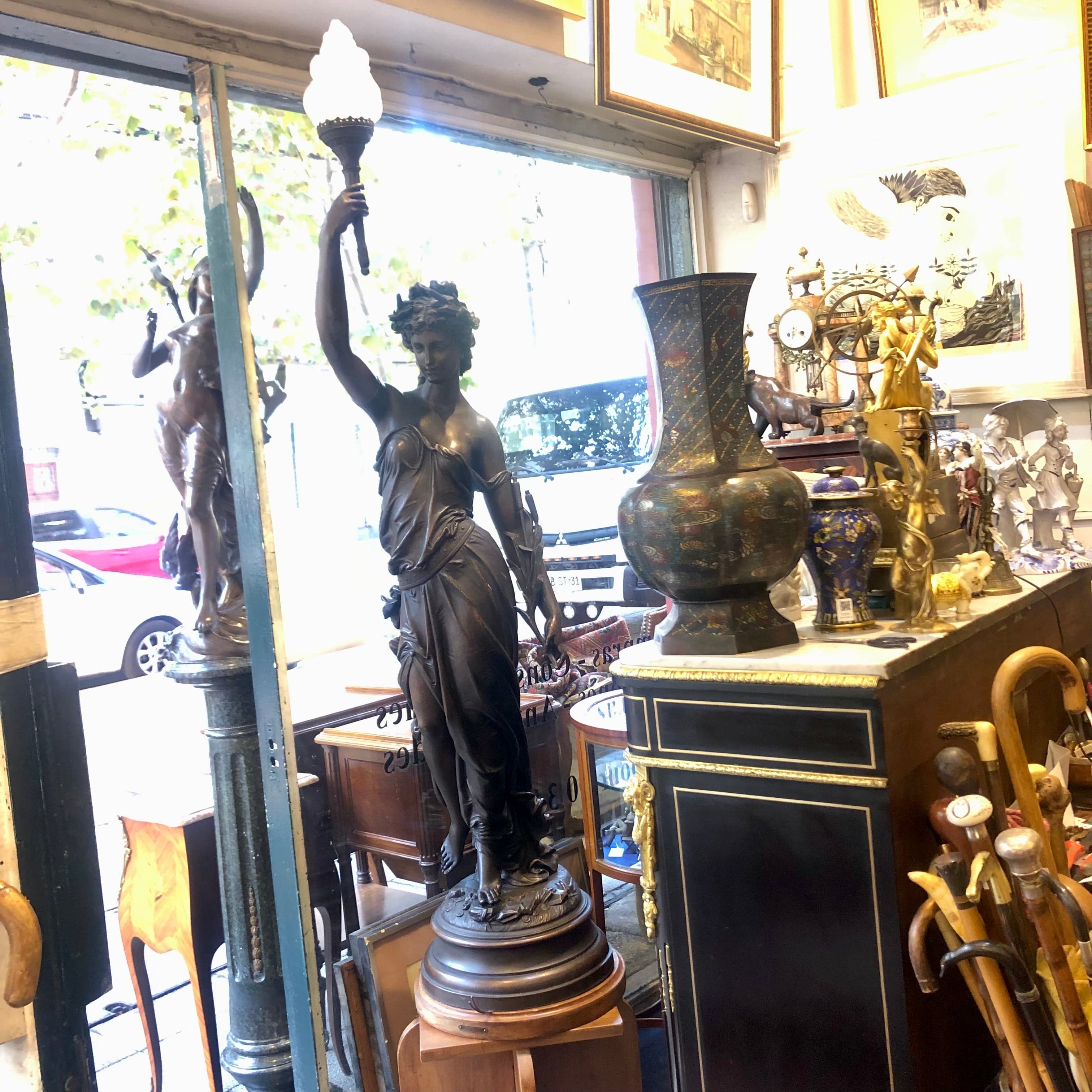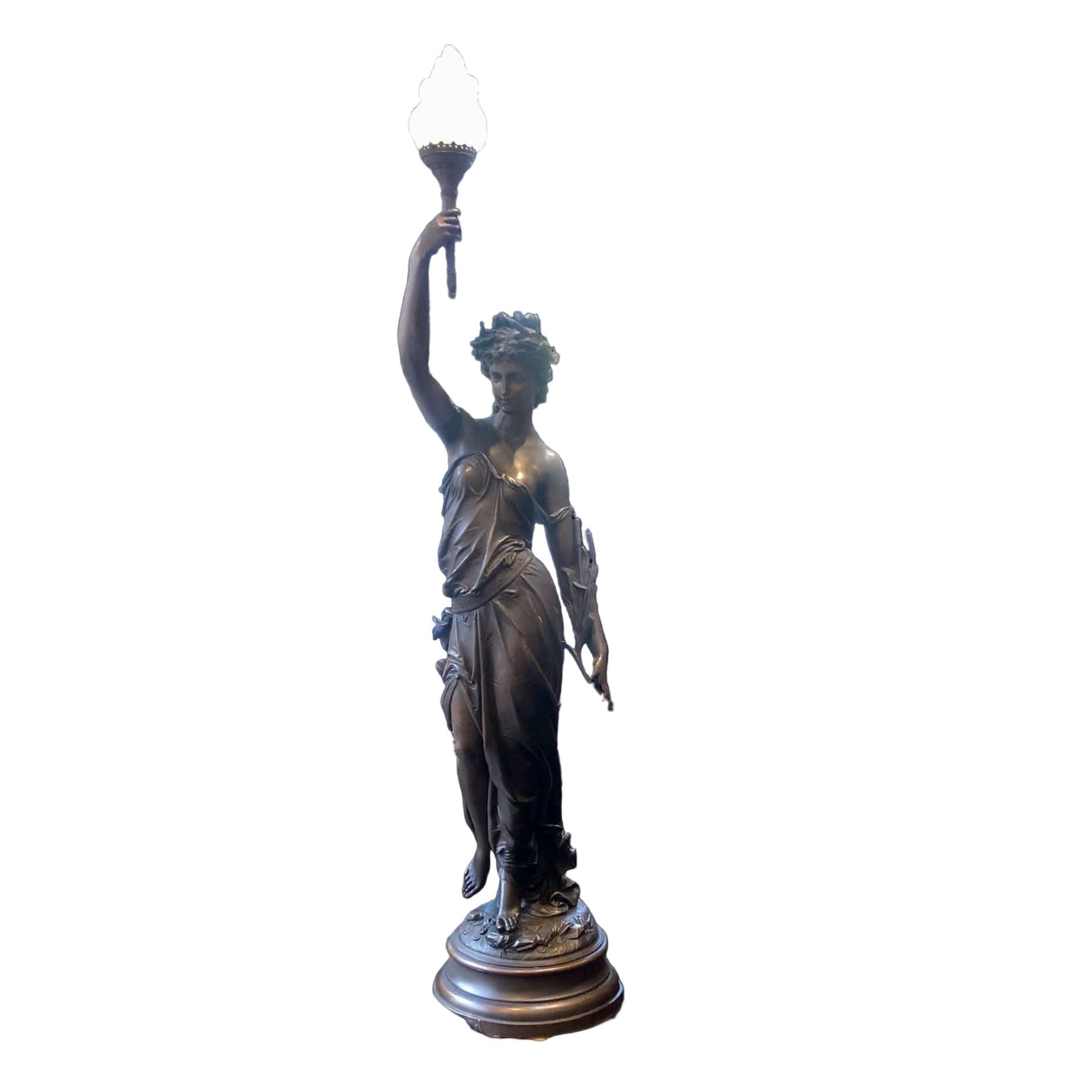 Bella escultura de mujer sosteniendo una antorcha de peltre. La escultura está habilitada como lámpara.