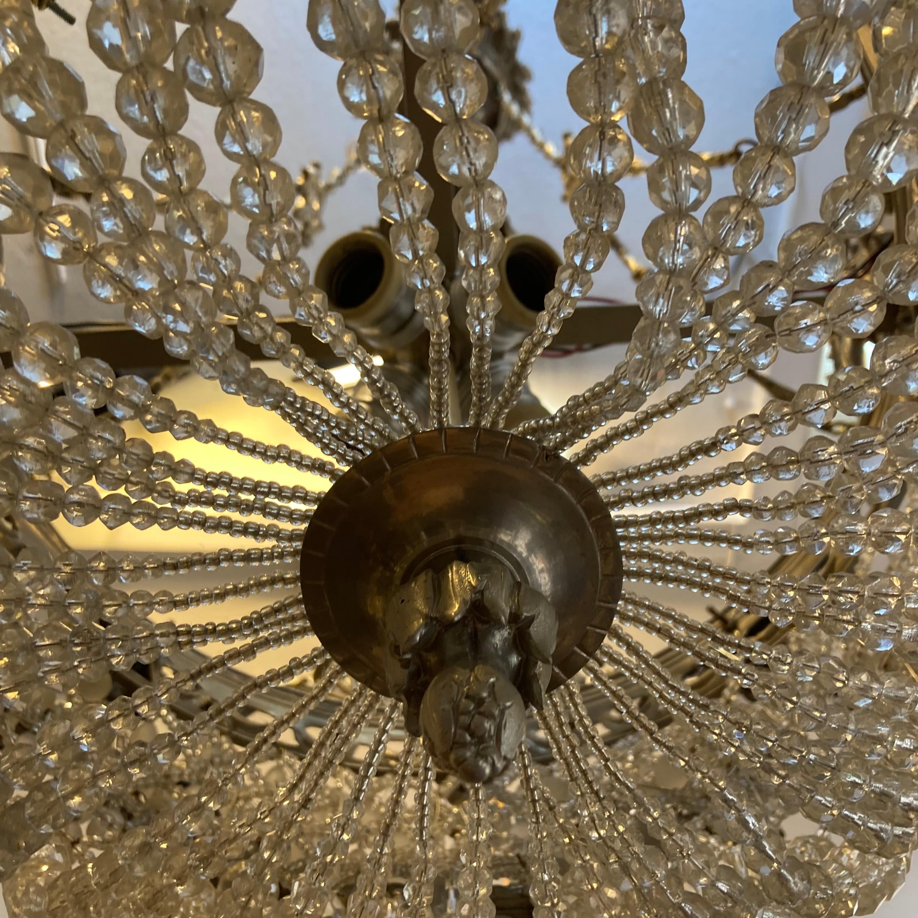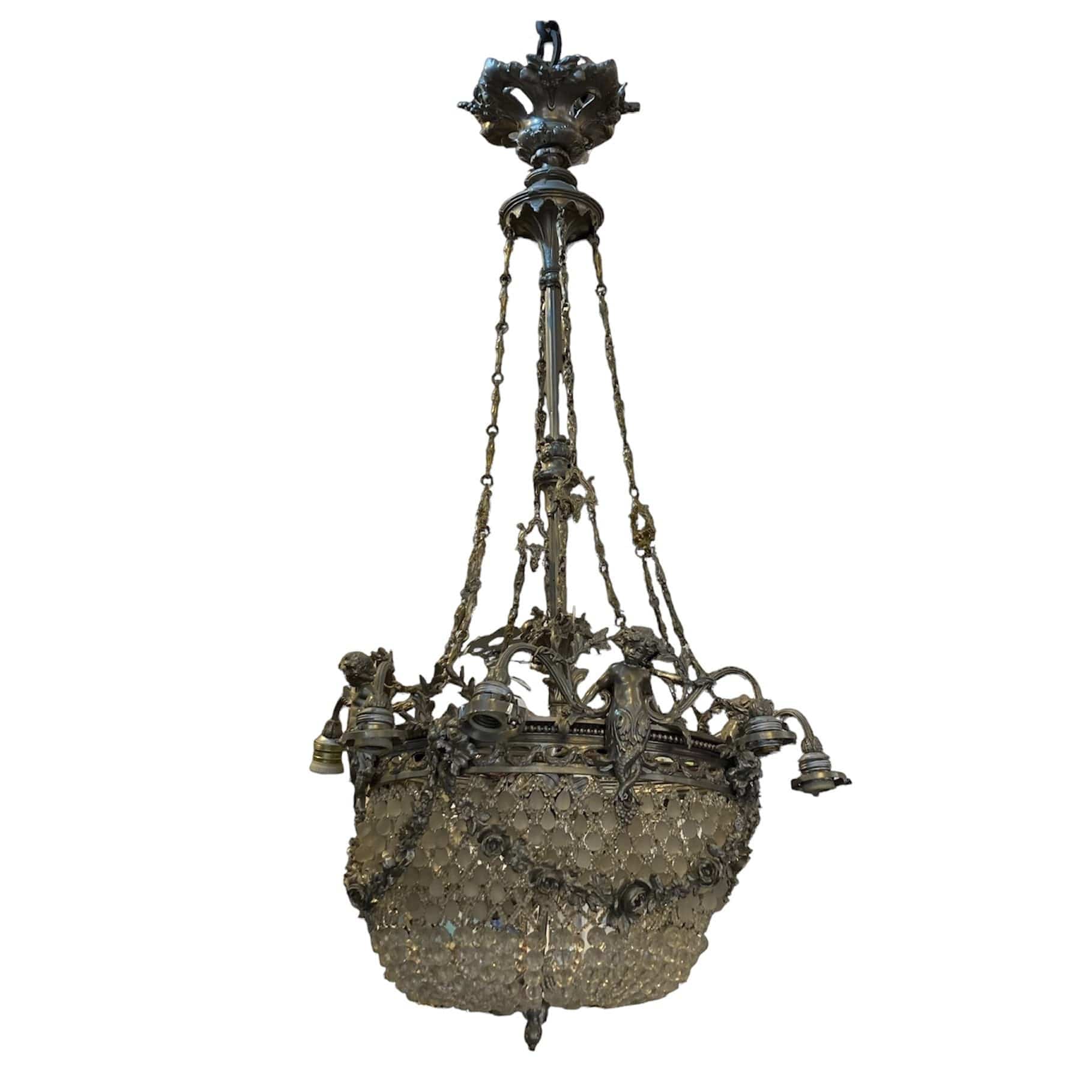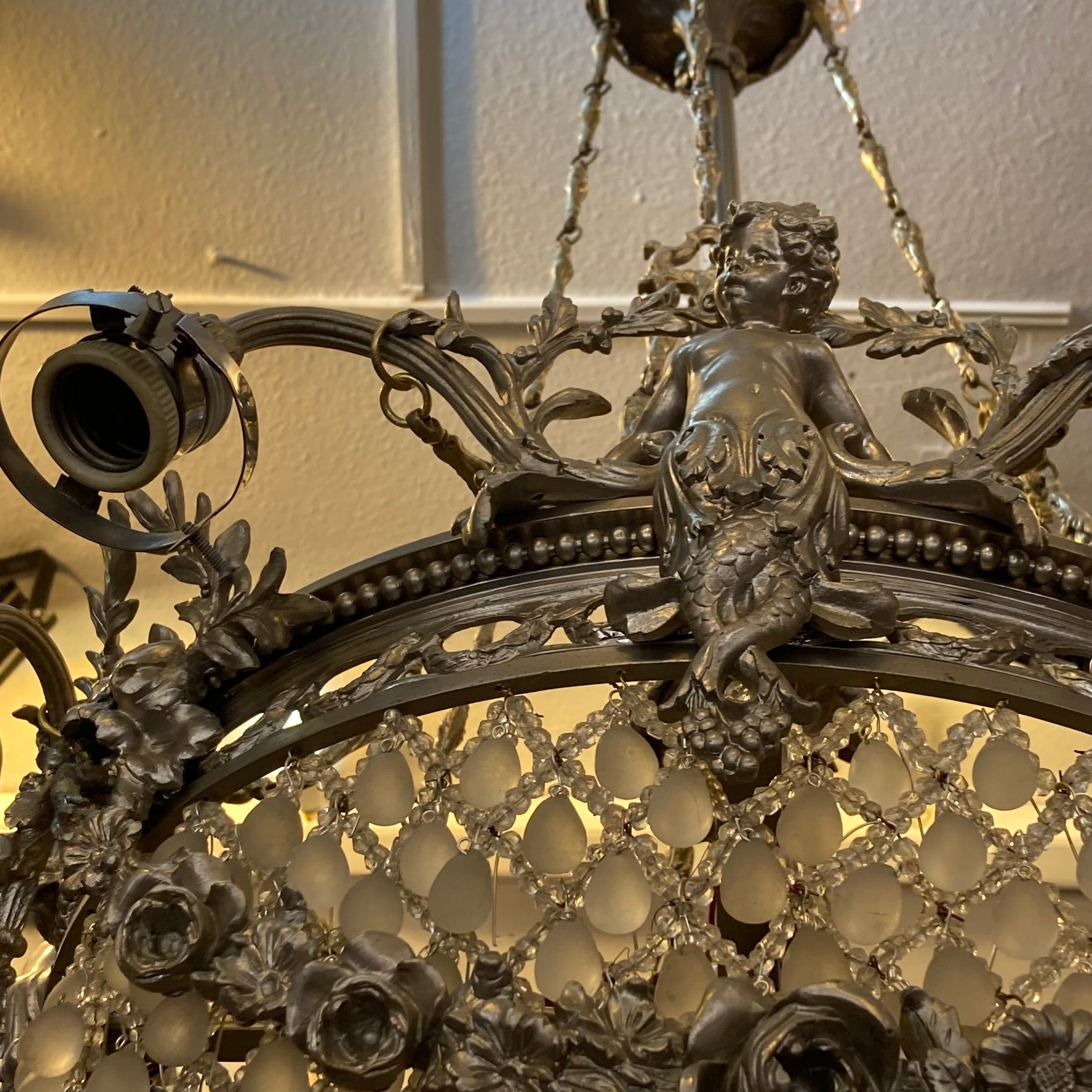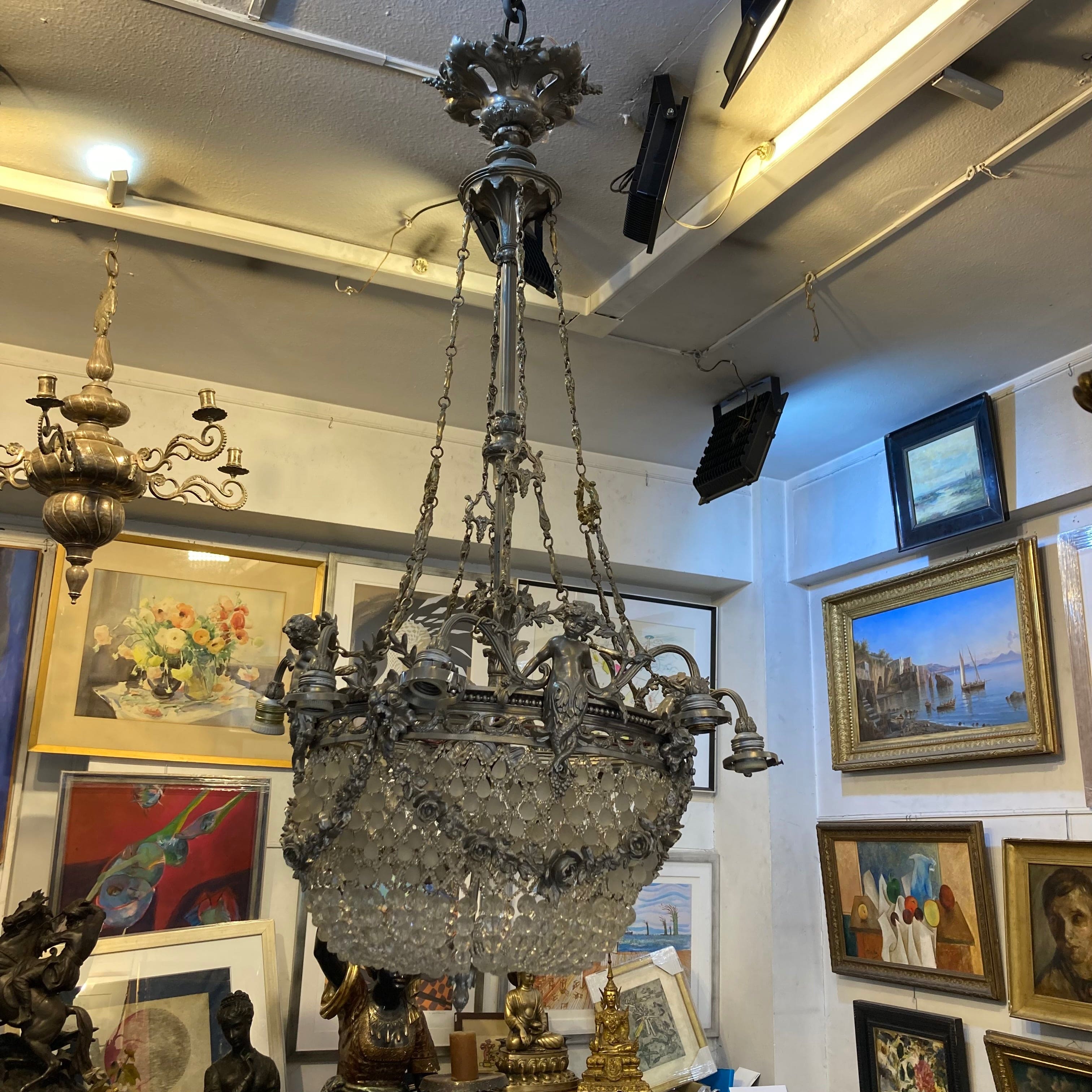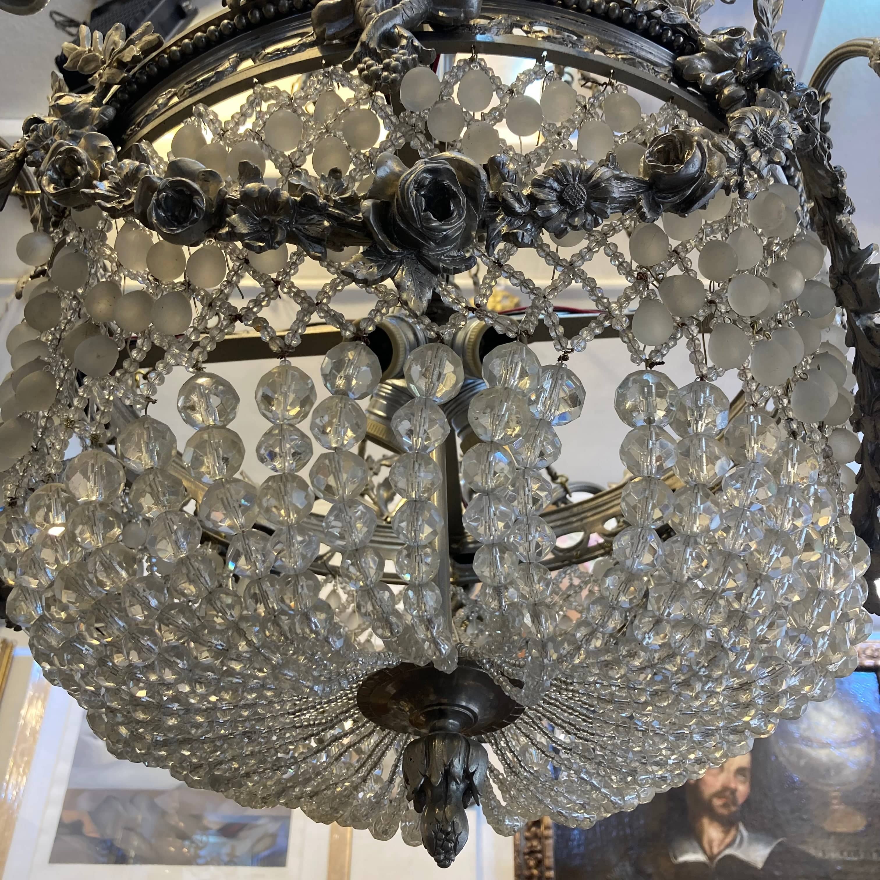 Elegante lámpara Luis XV de bronce plateado. Cuenta con diseño en vidrio cristal y 8 luces por fuera y 4 por dentro