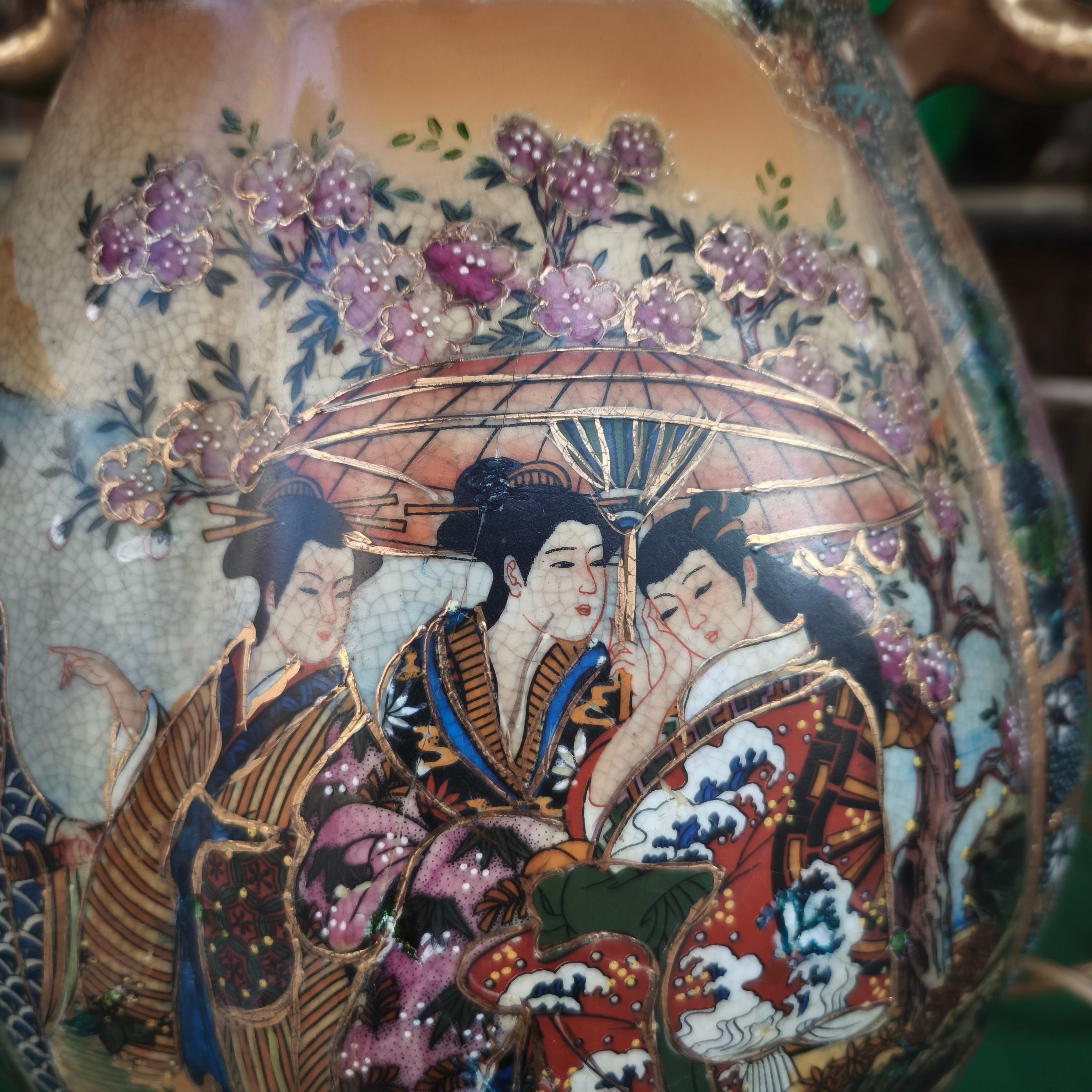 Lámpara de origen chino en estilo Satsuma y fabricación contemporánea, con bellos diseños florales y decorados y asas terminadas en elegante dorado, además de varias representaciones de escenas con personajes con coloridas vestimentas en jardines. La pieza tiene una pena de madera tallada que se encuentra con algunos detalles. La pantalla es color crema con decorados en hilo cobrizo, dorado y celeste.
