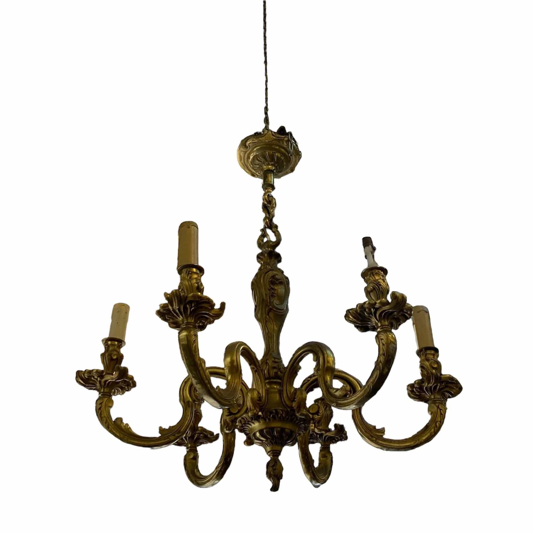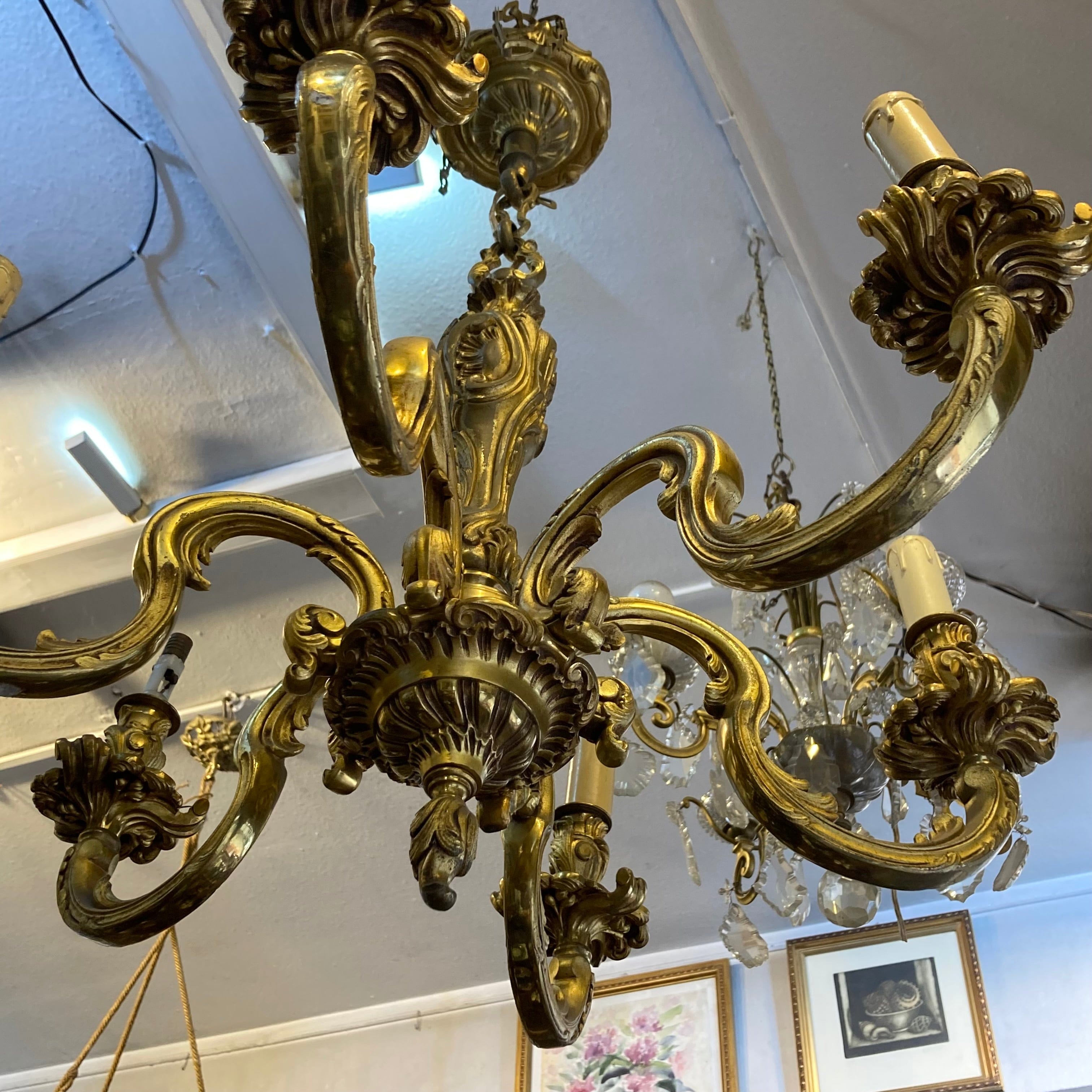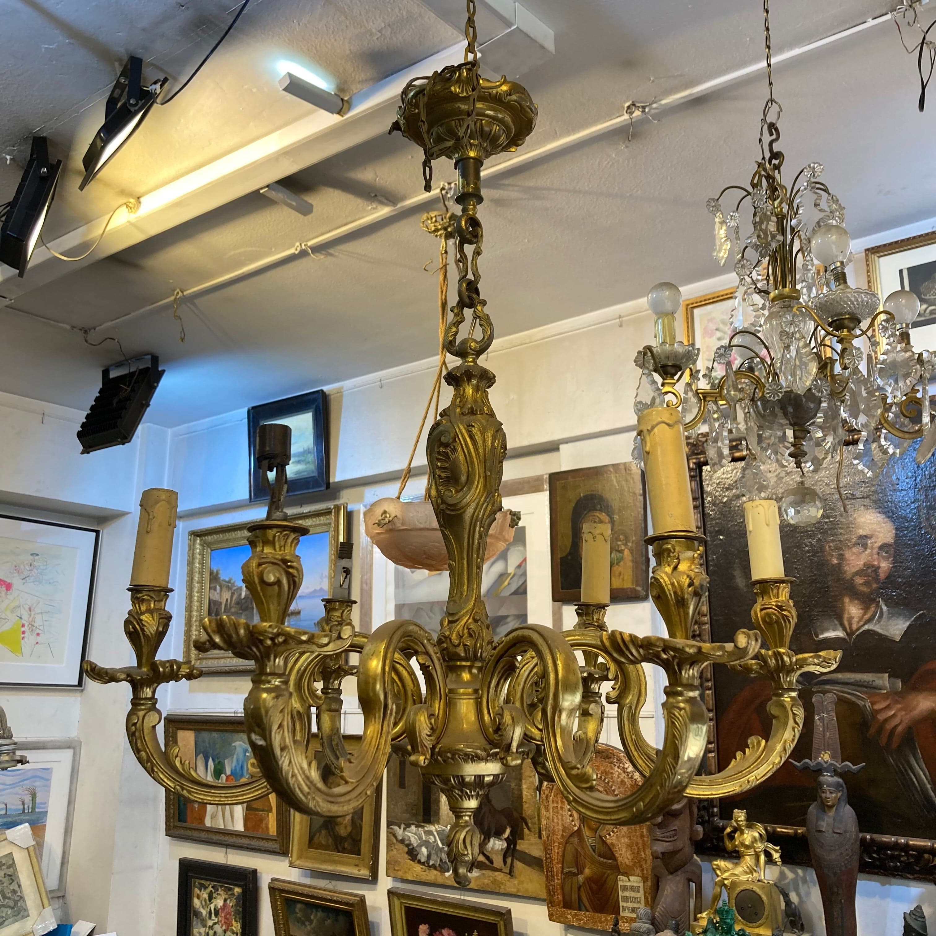 Elegante lámpara de bronce Luis XV. Cuenta con 6 brazos y respectivas luces.  Refinados detalles característicos del estilo Luis VX, son parte de su diseño.