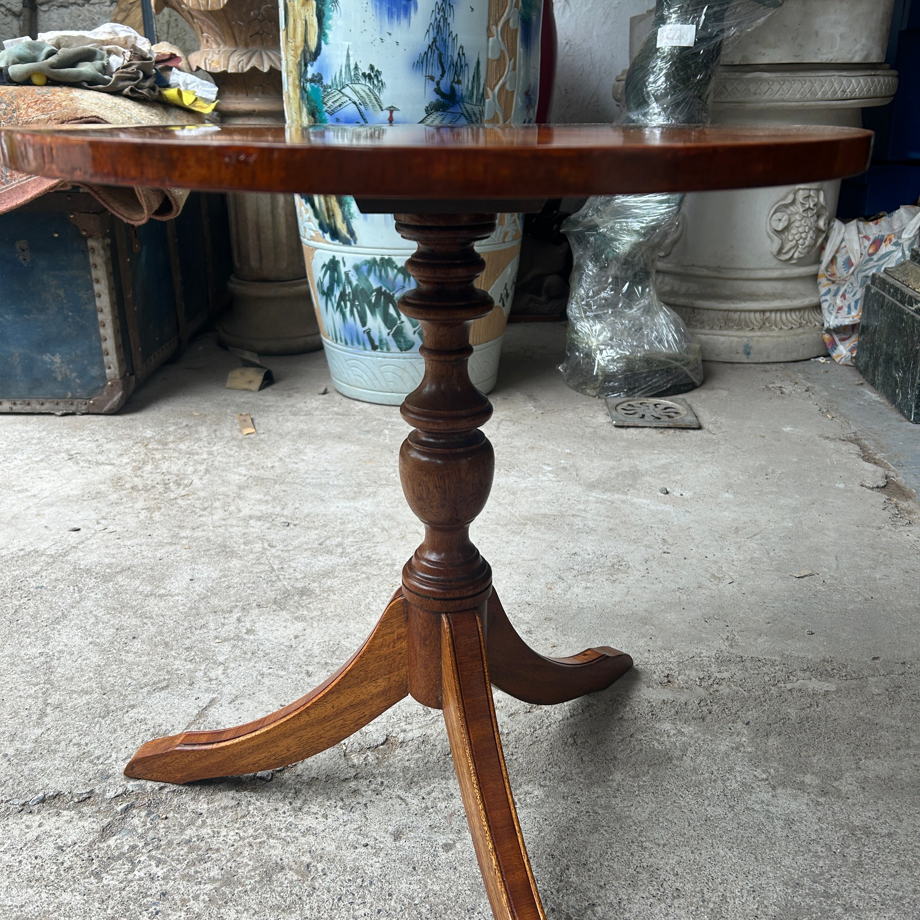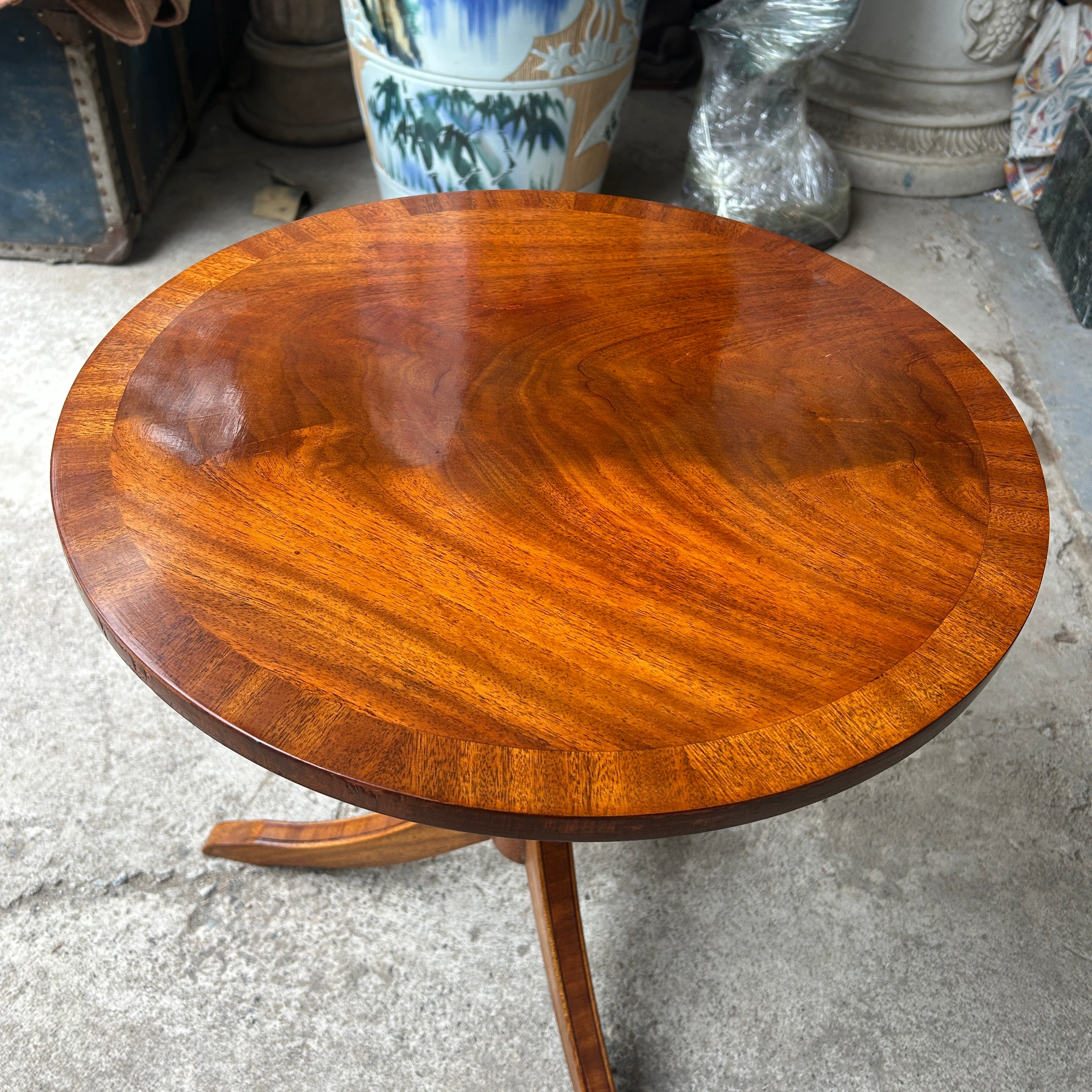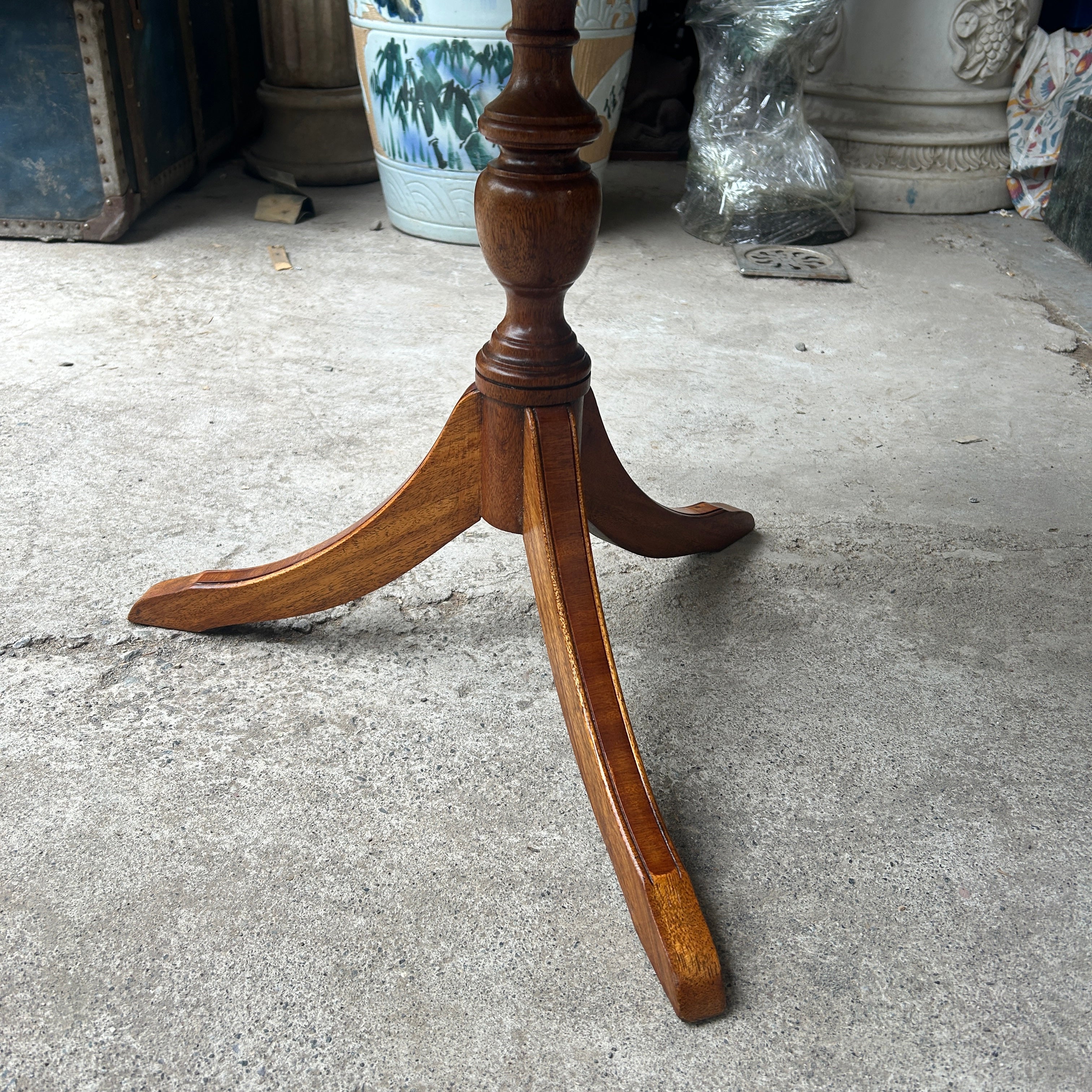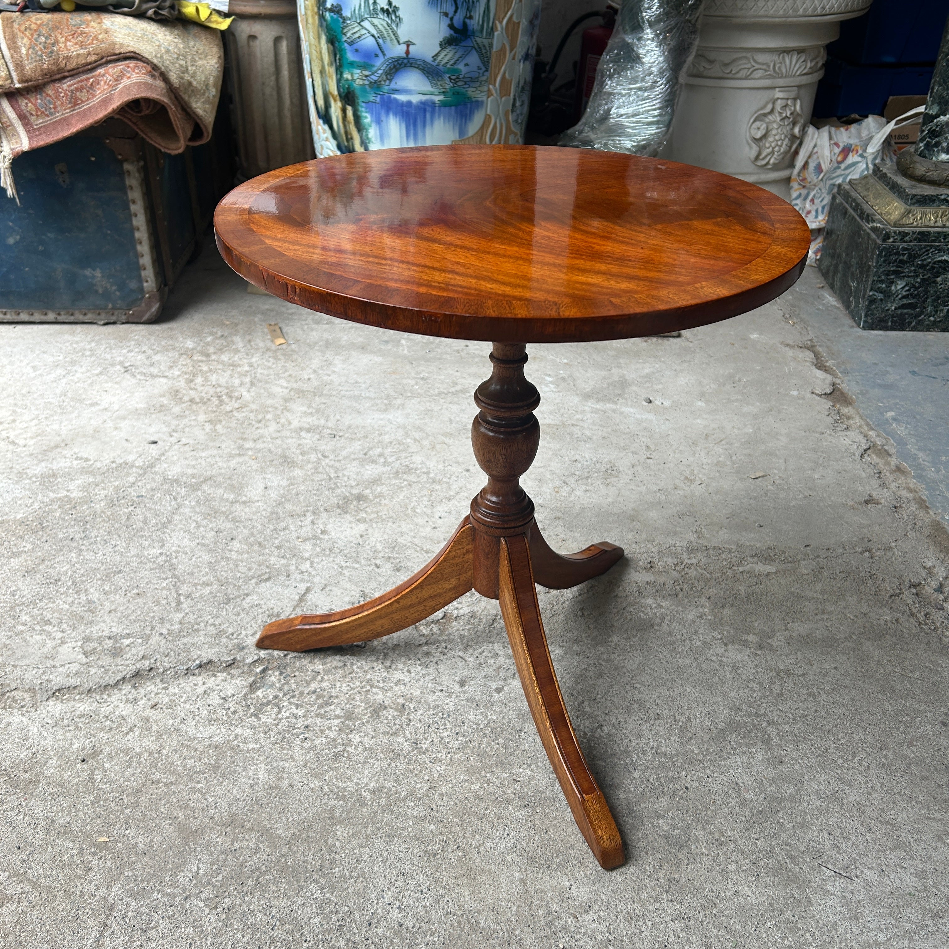 Bonita mesa lateral de apoyo de madera de caoba con cubierta circular y patas trípodes. Inglaterra, años 50.