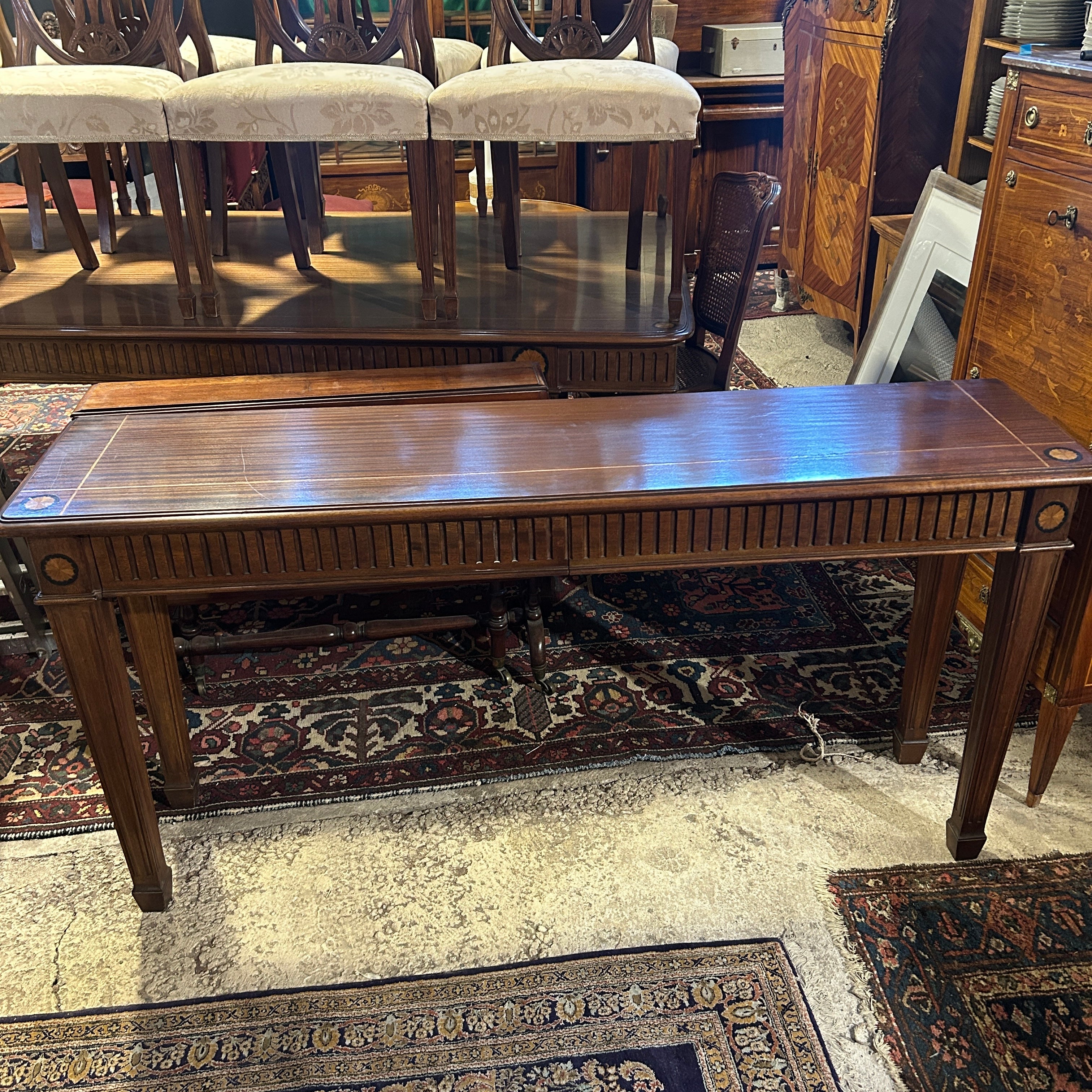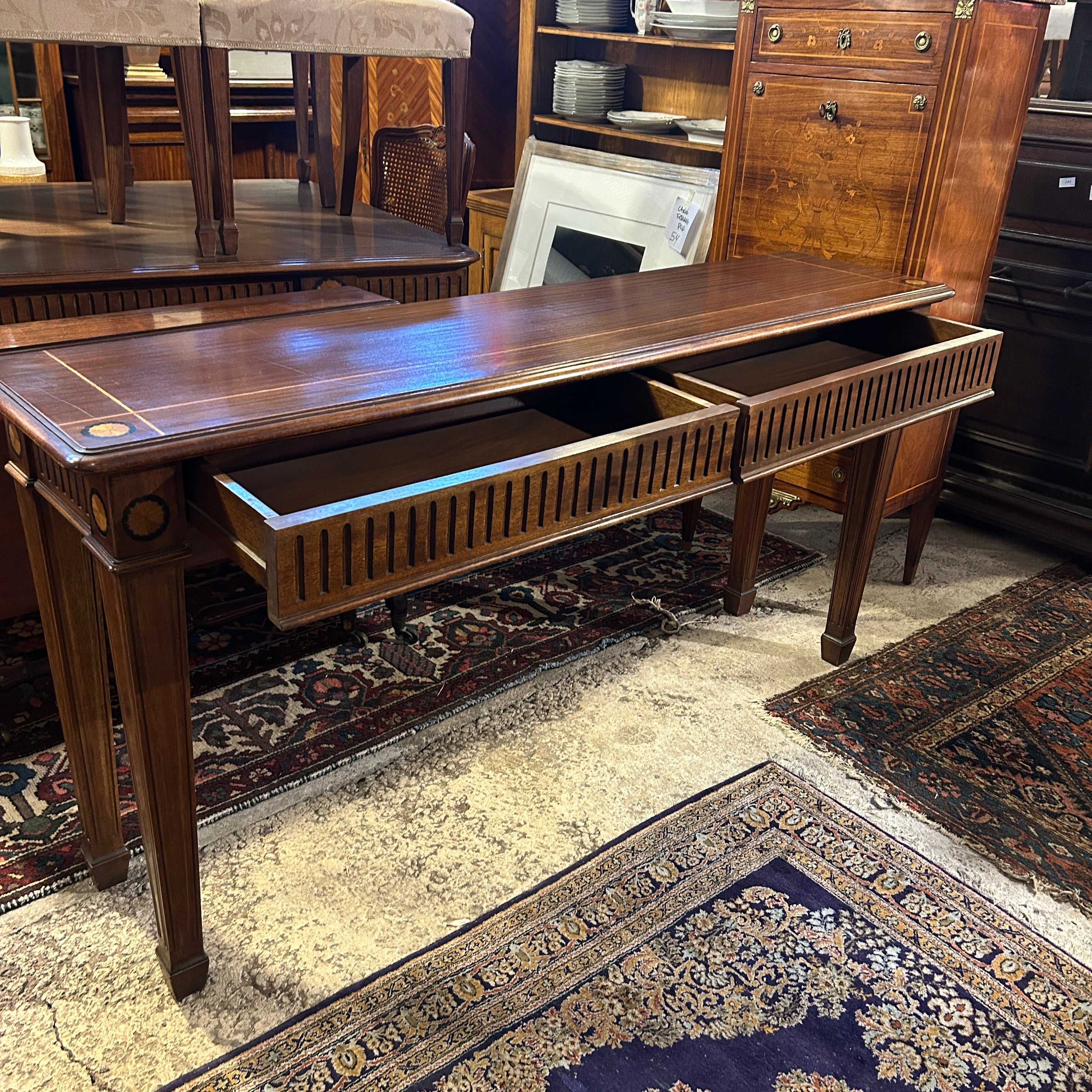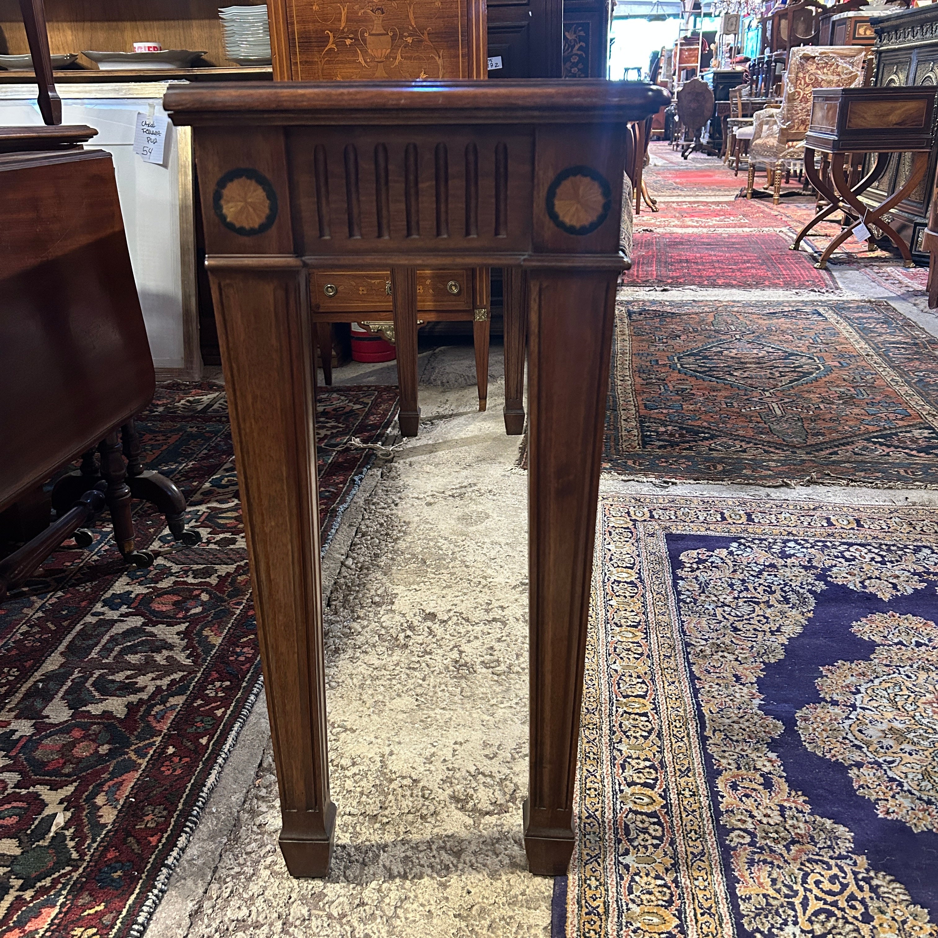 Precioso arrimo estilo inglés, hepplwhite, en caoba satinada con filetes y marqueteria, tallado a mano. Tiene dos amplios cajones frontales.