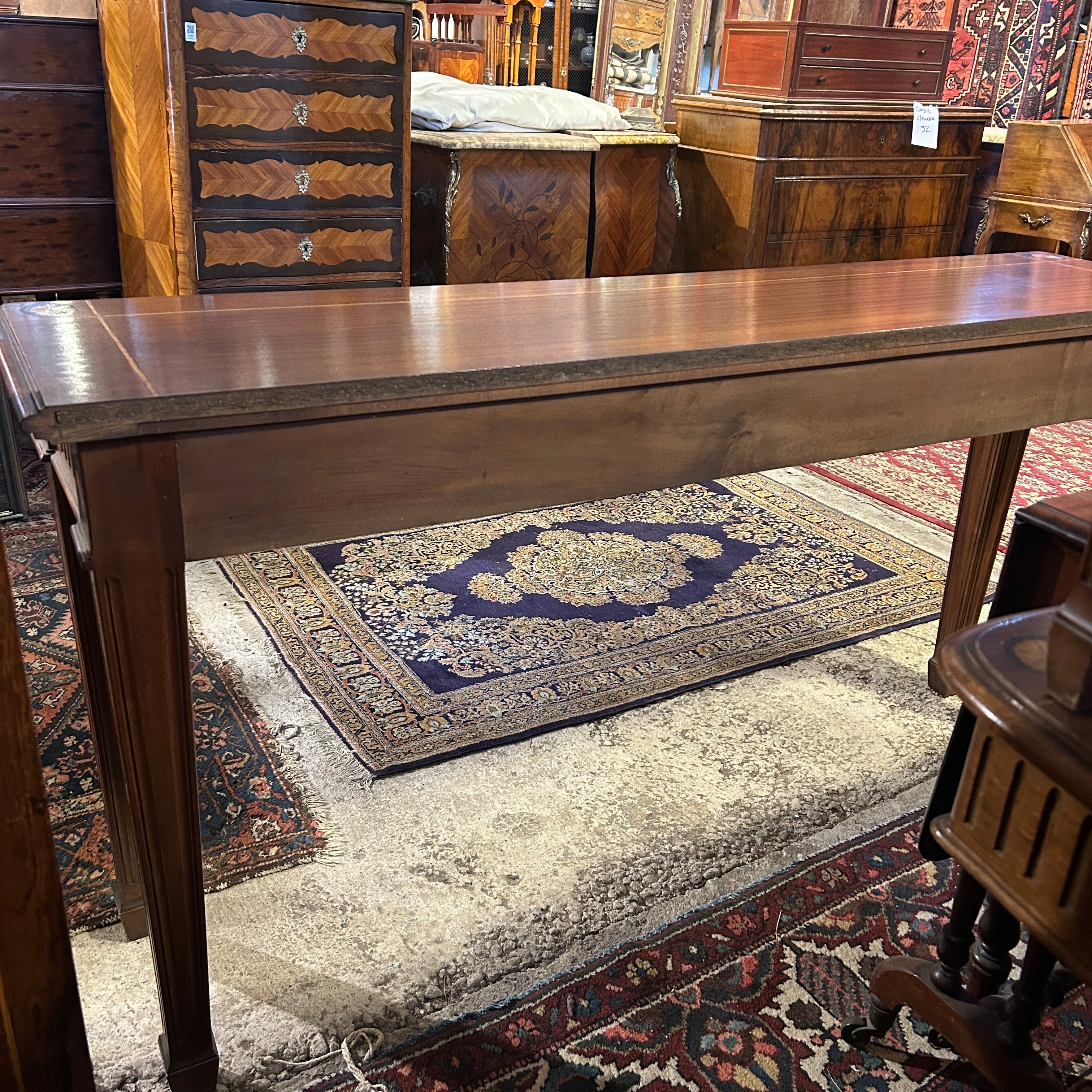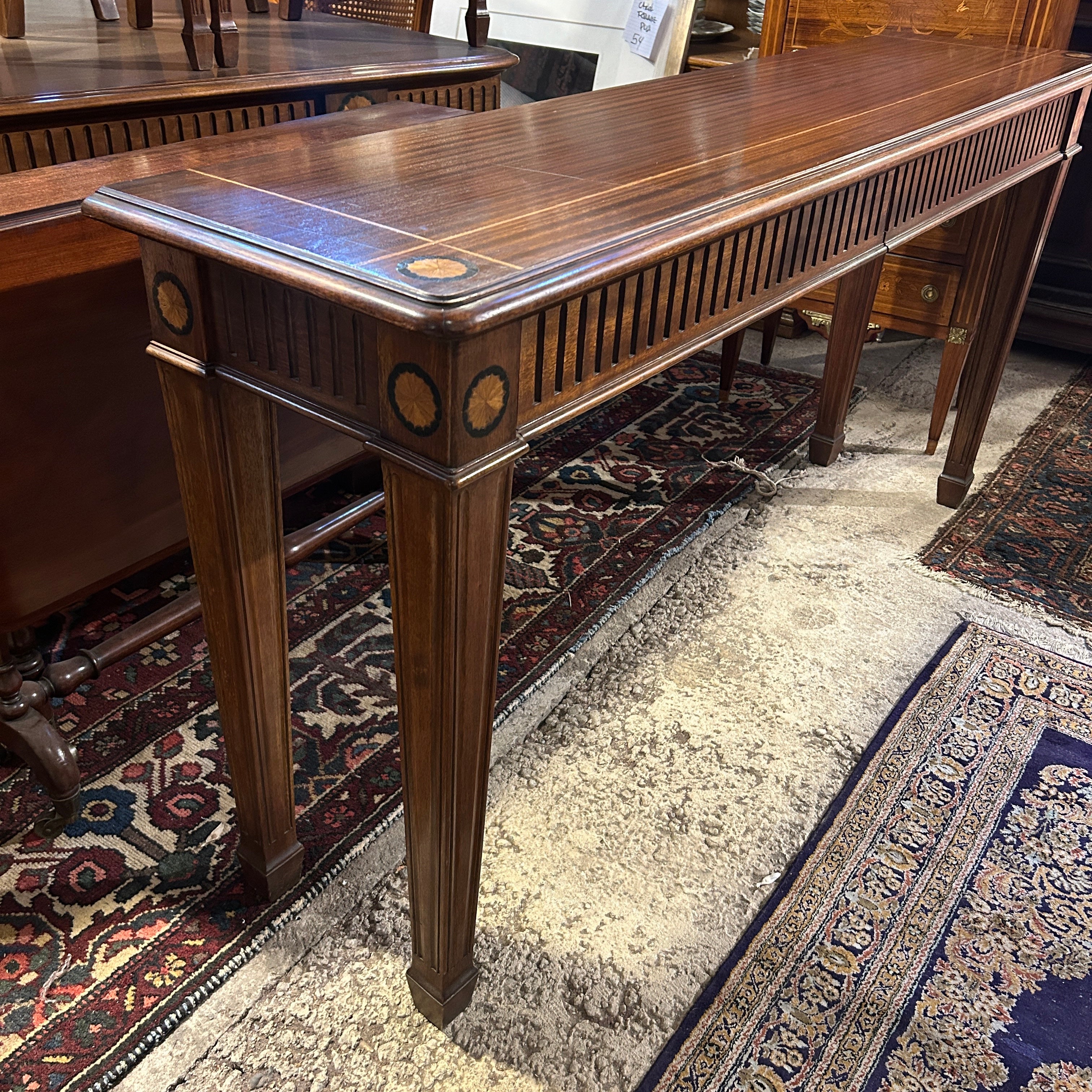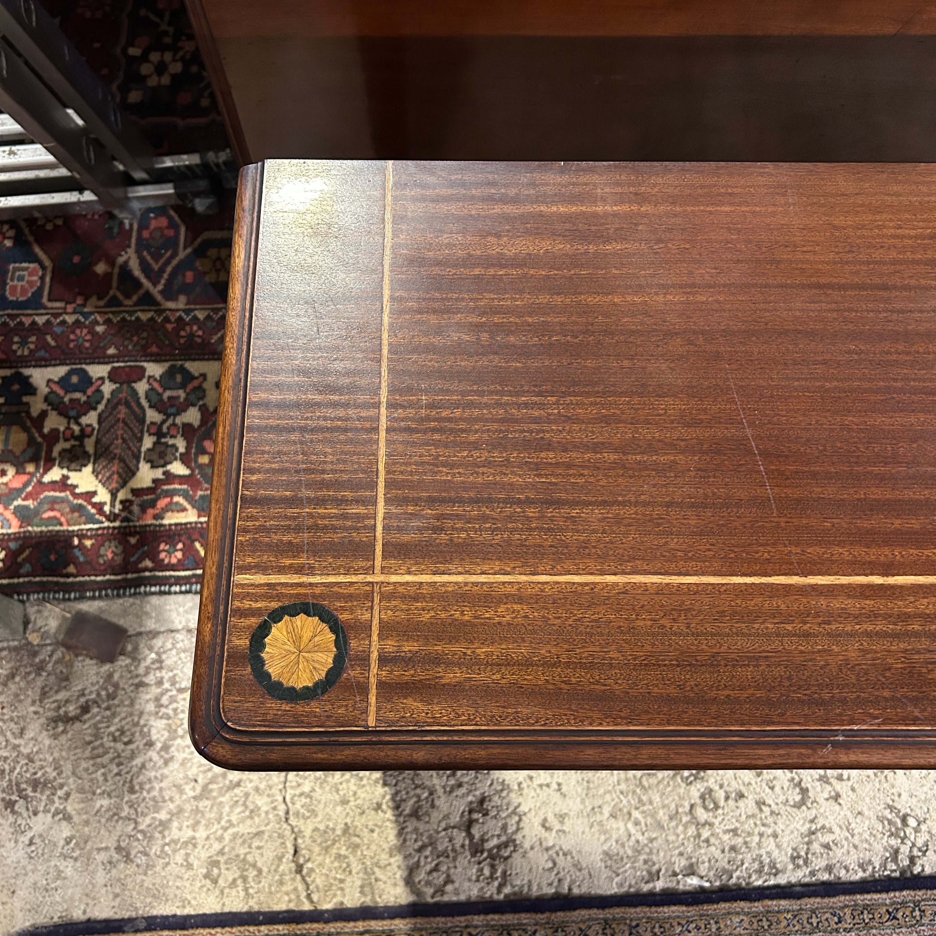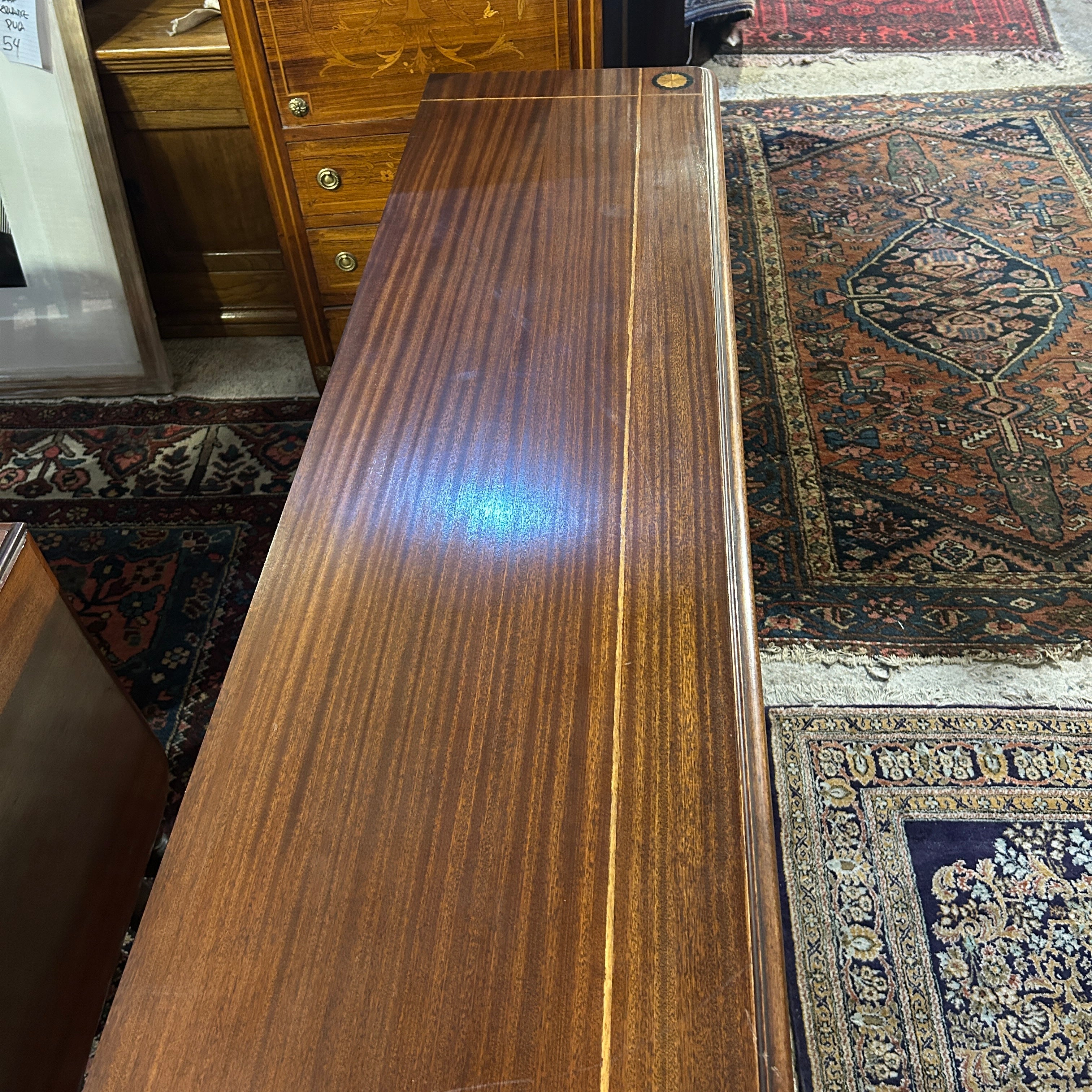 Precioso arrimo estilo inglés, hepplwhite, en caoba satinada con filetes y marqueteria, tallado a mano. Tiene dos amplios cajones frontales.