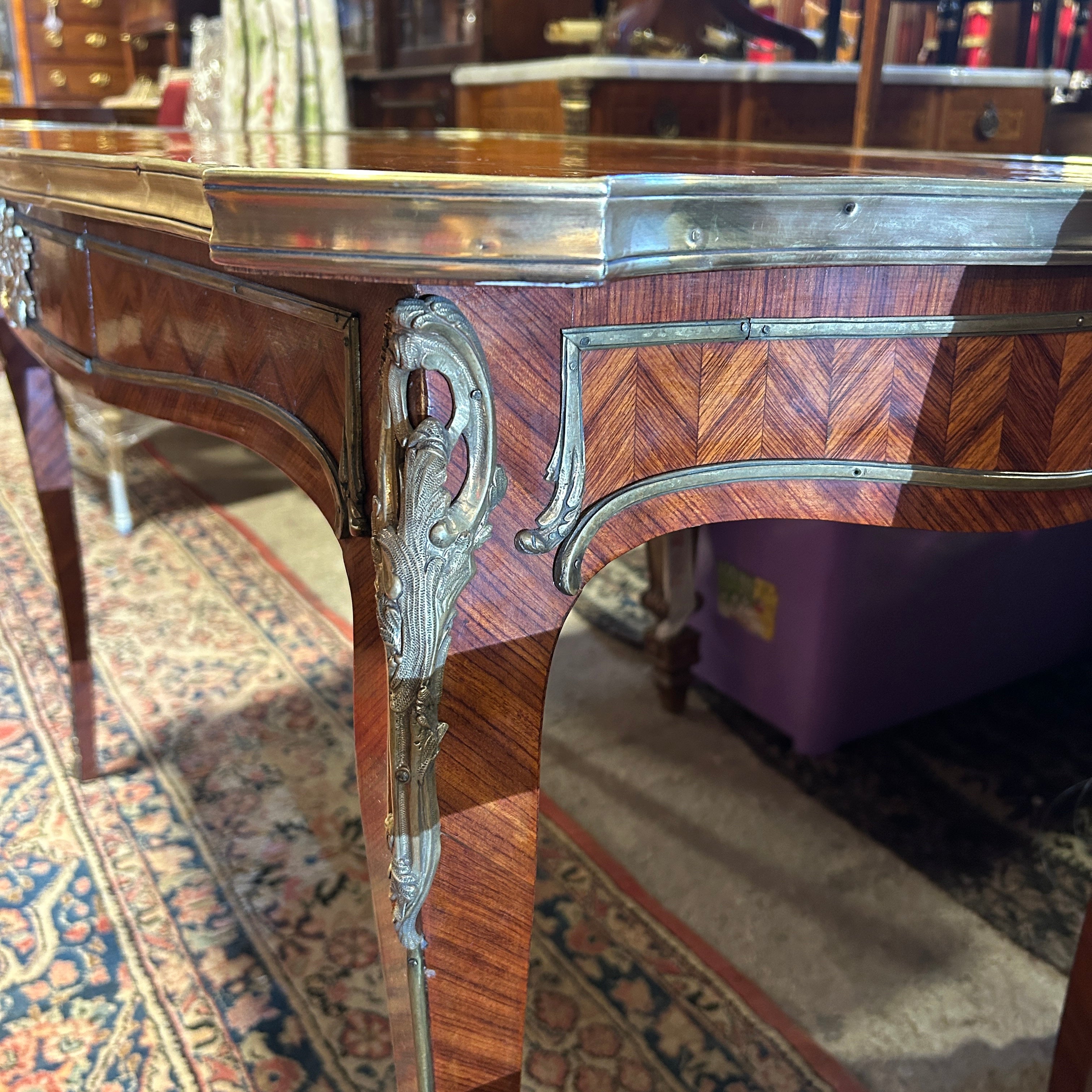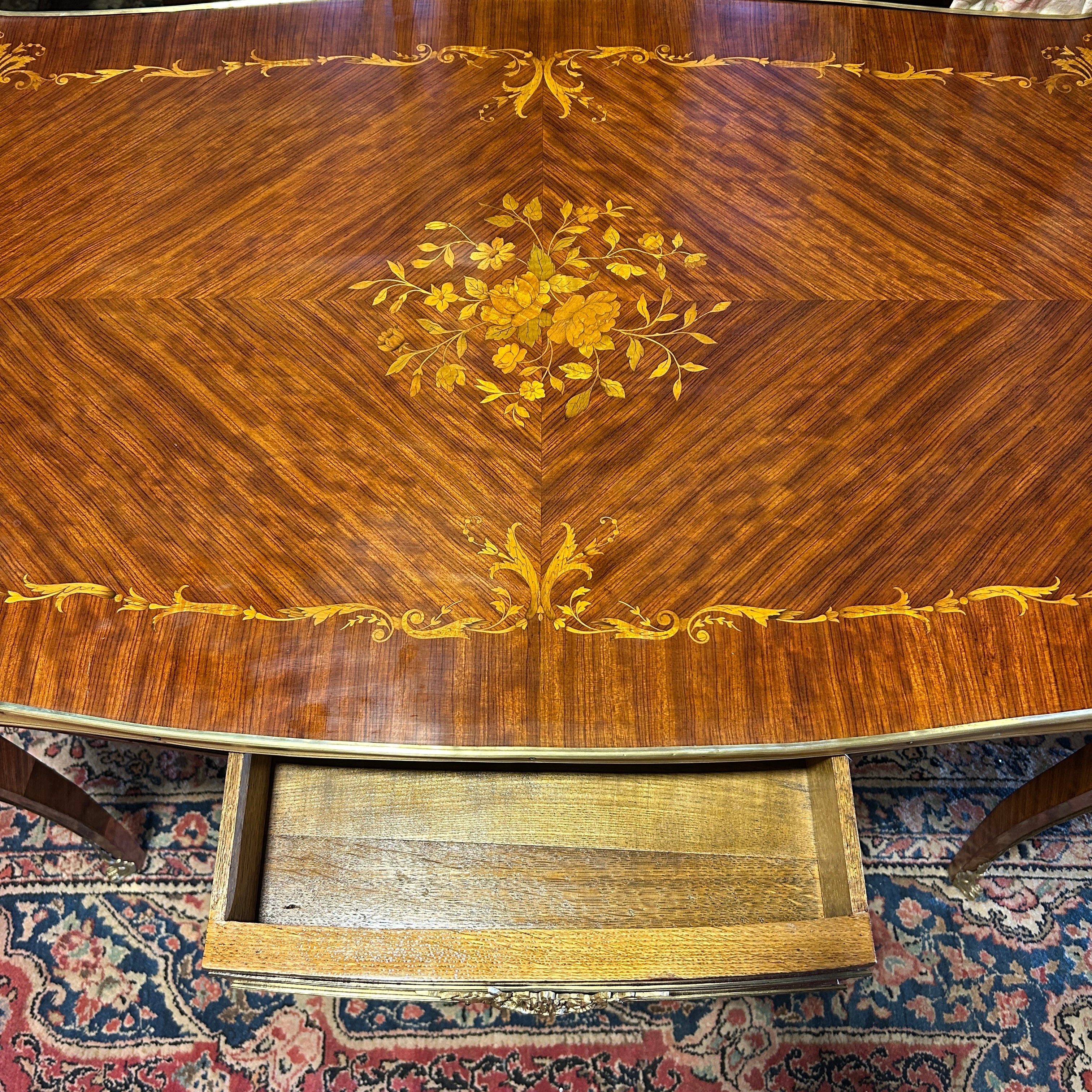 Elegante mesa de escritorio francesa de estilo Luis XV de palo de rosa y estructura e interior cajón de roble con hermosa y fina marquetería floral y detalles en bronce en cajón central, patas y bordes de mesa. Francia, años 50.