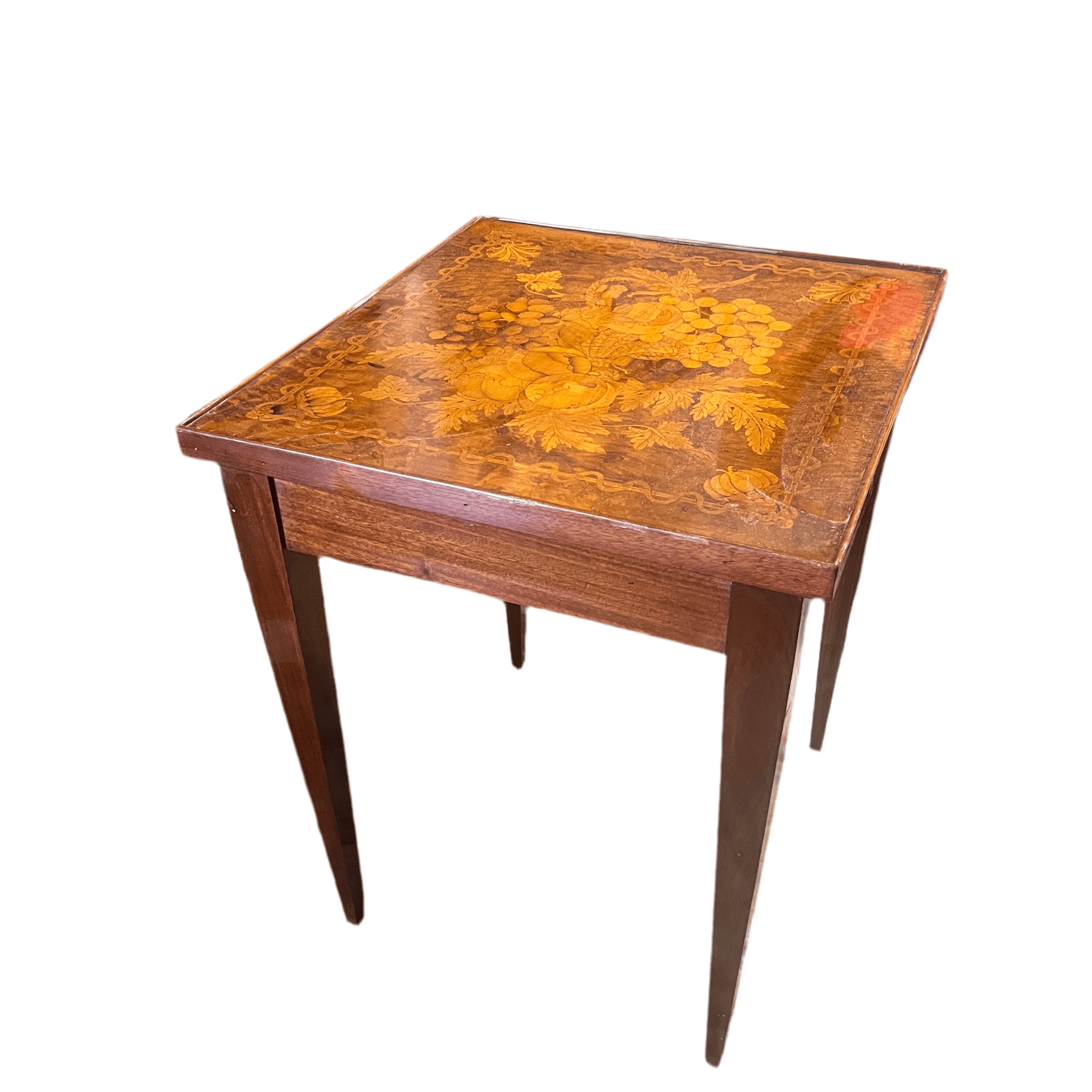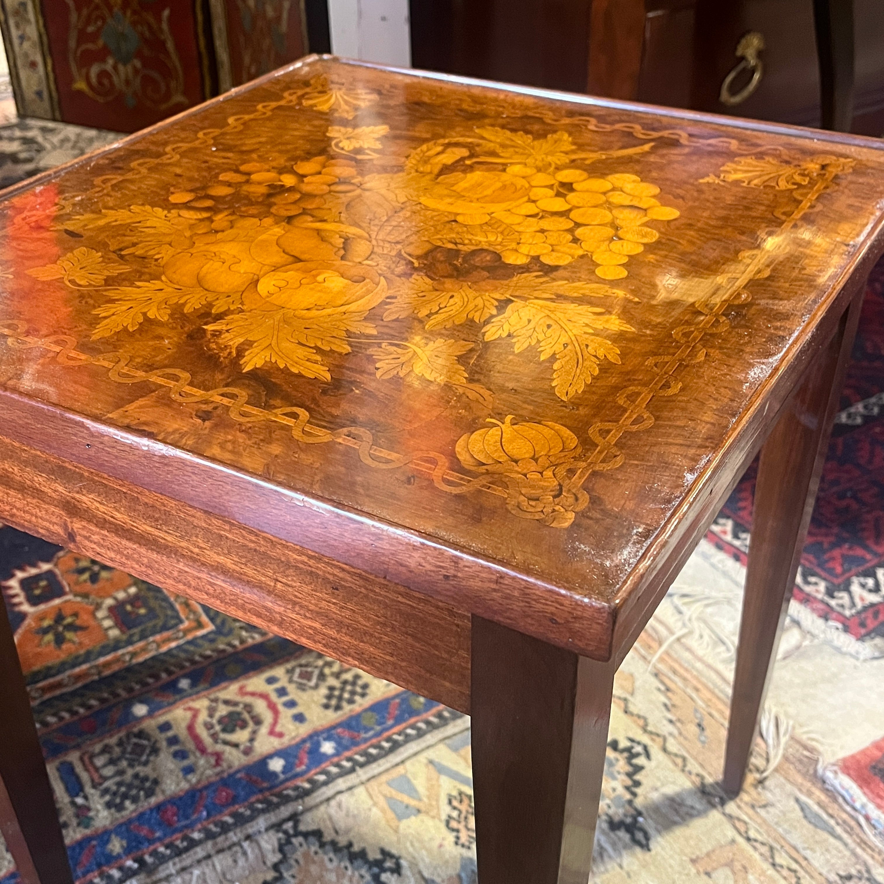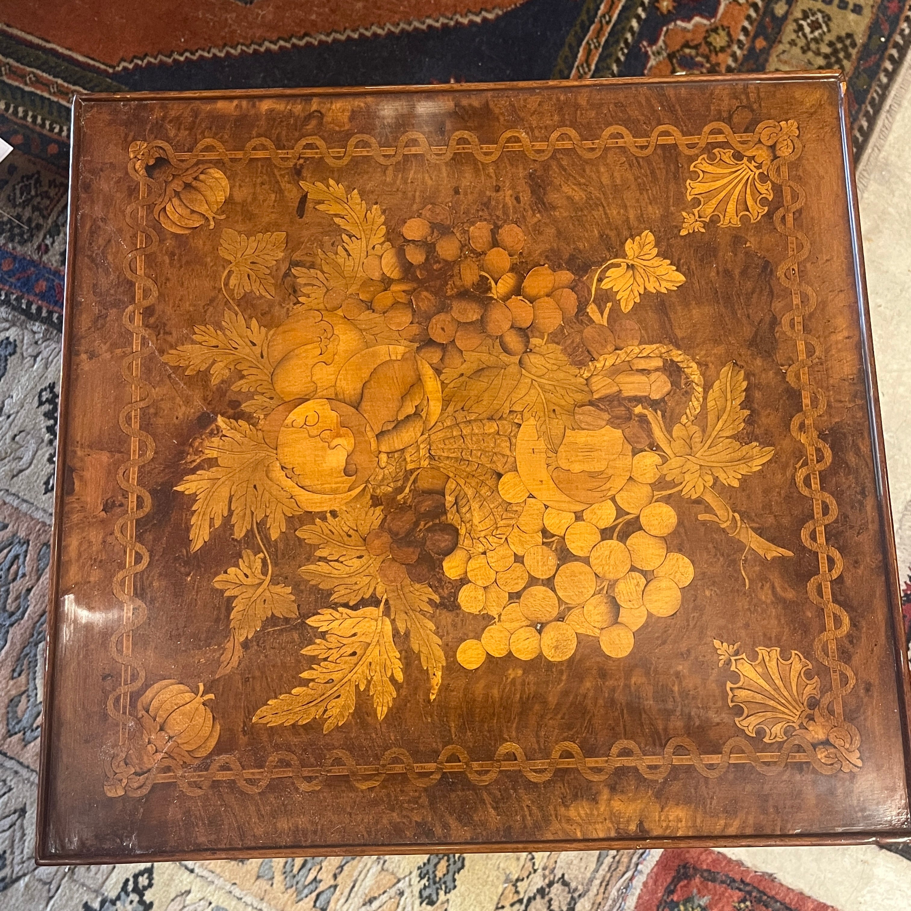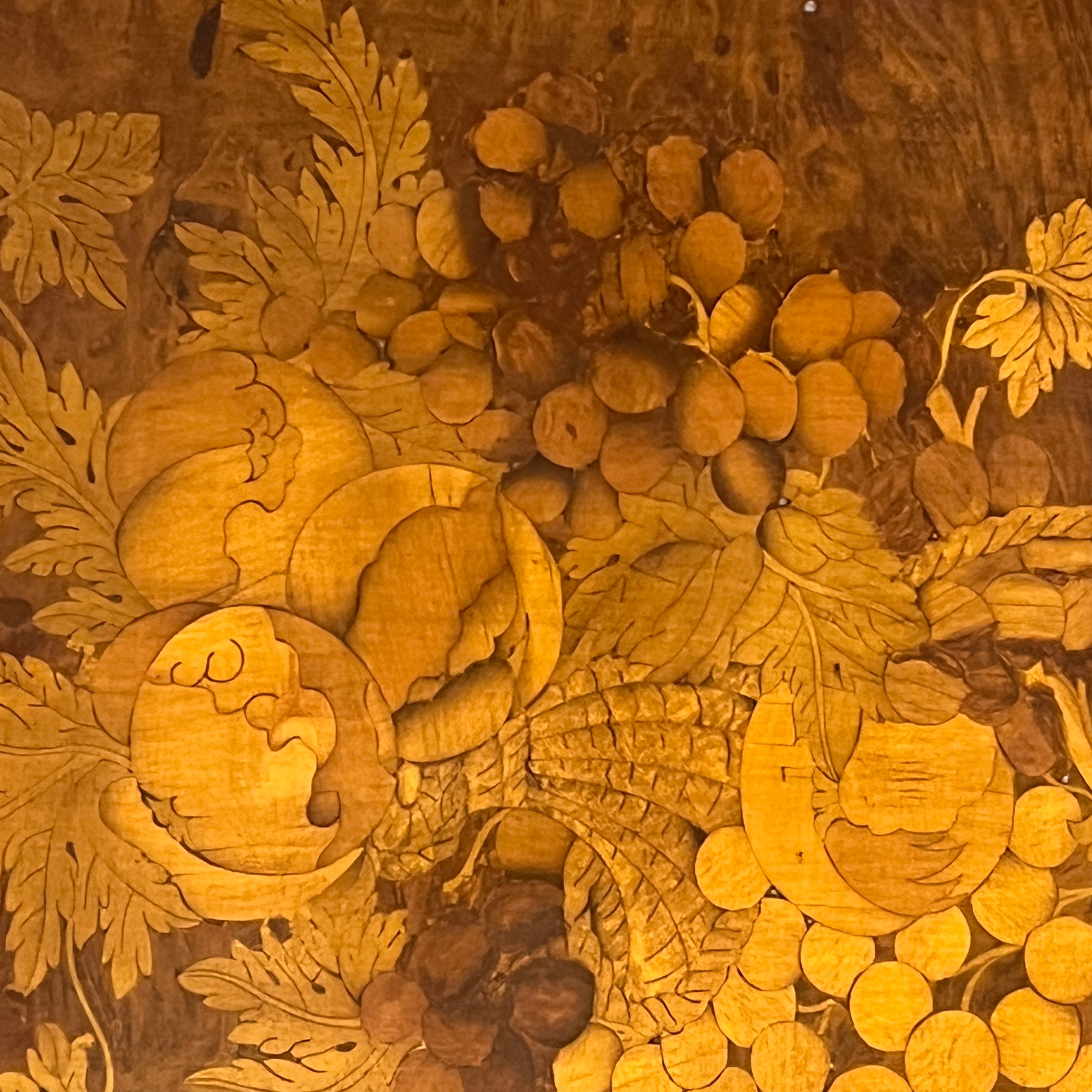 Mesita de apoyo holandesa de fabricación contemporánea, hecha de madera de pino enchapada en múltiples maderas frutales y un diseño de marquetería finísimo, representando un bodegón con fruta, flores y un cuerno.