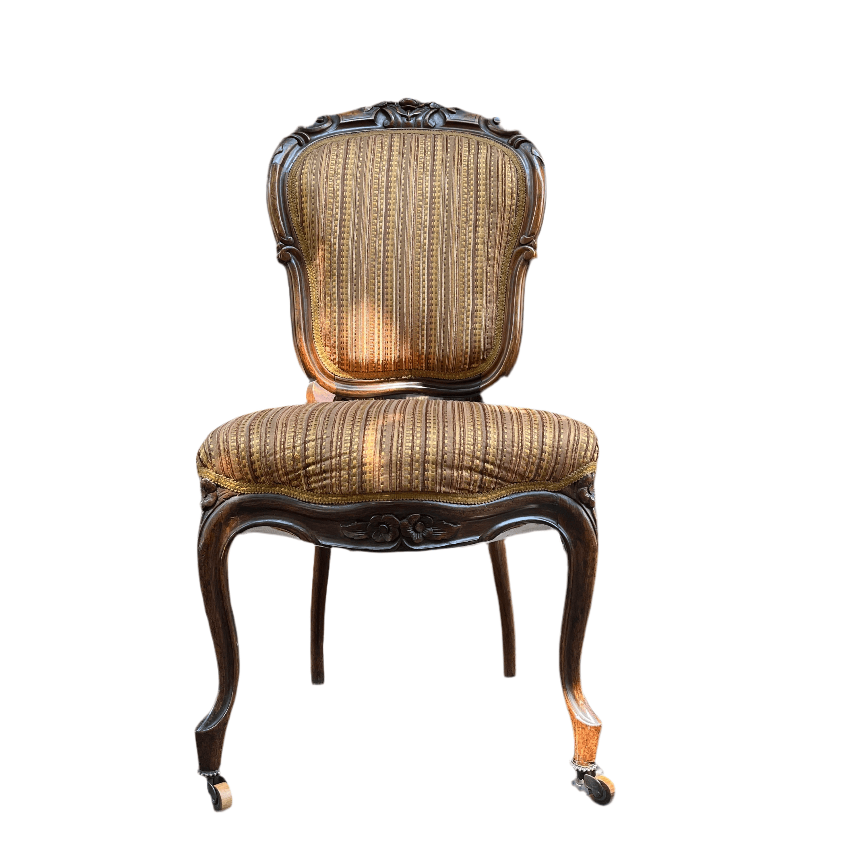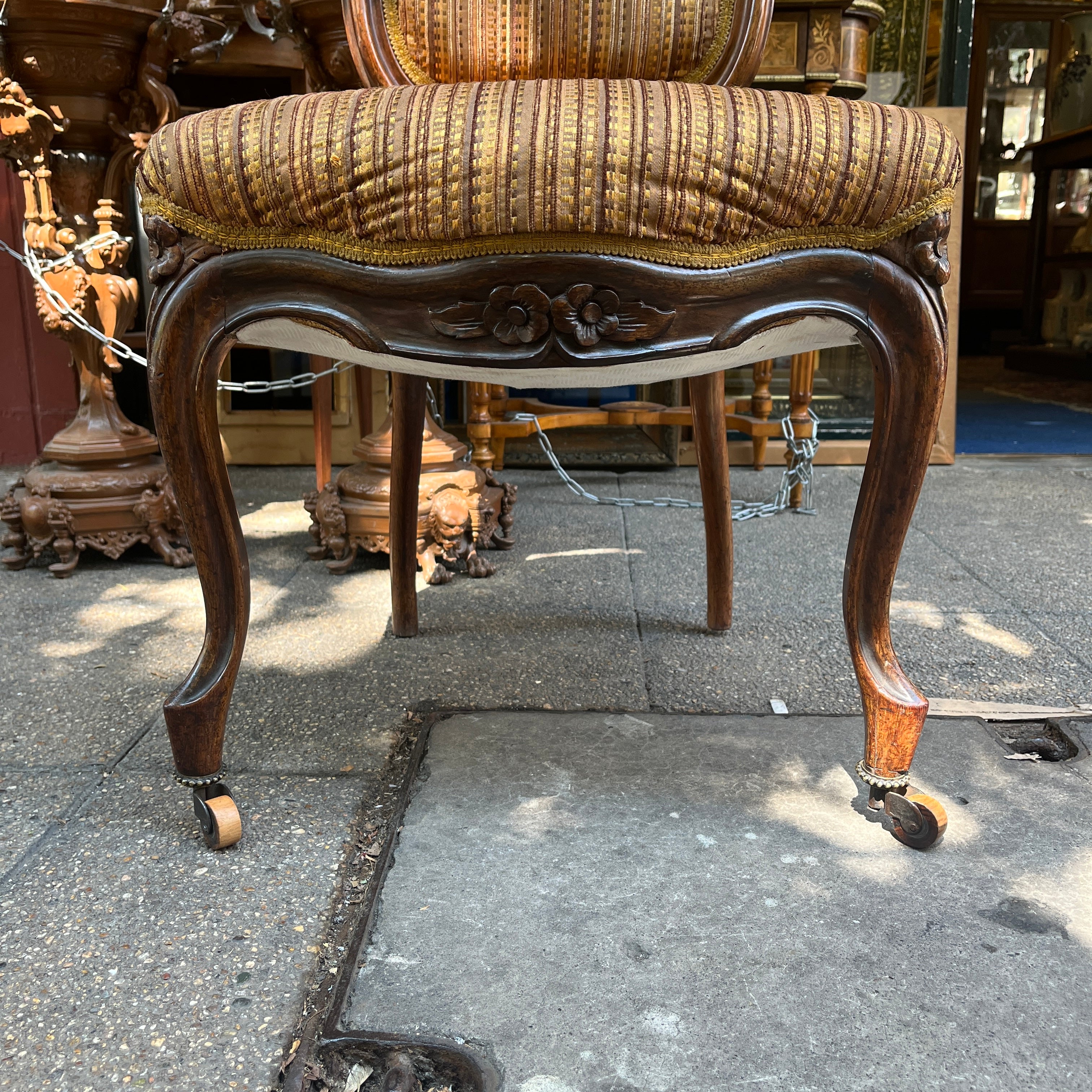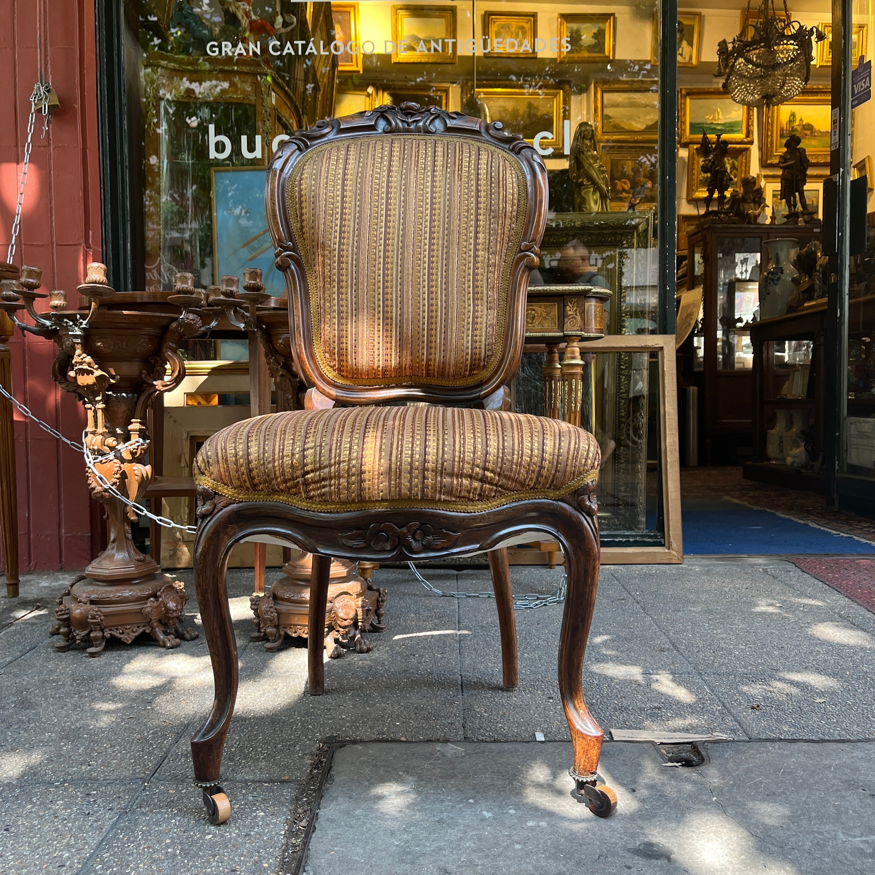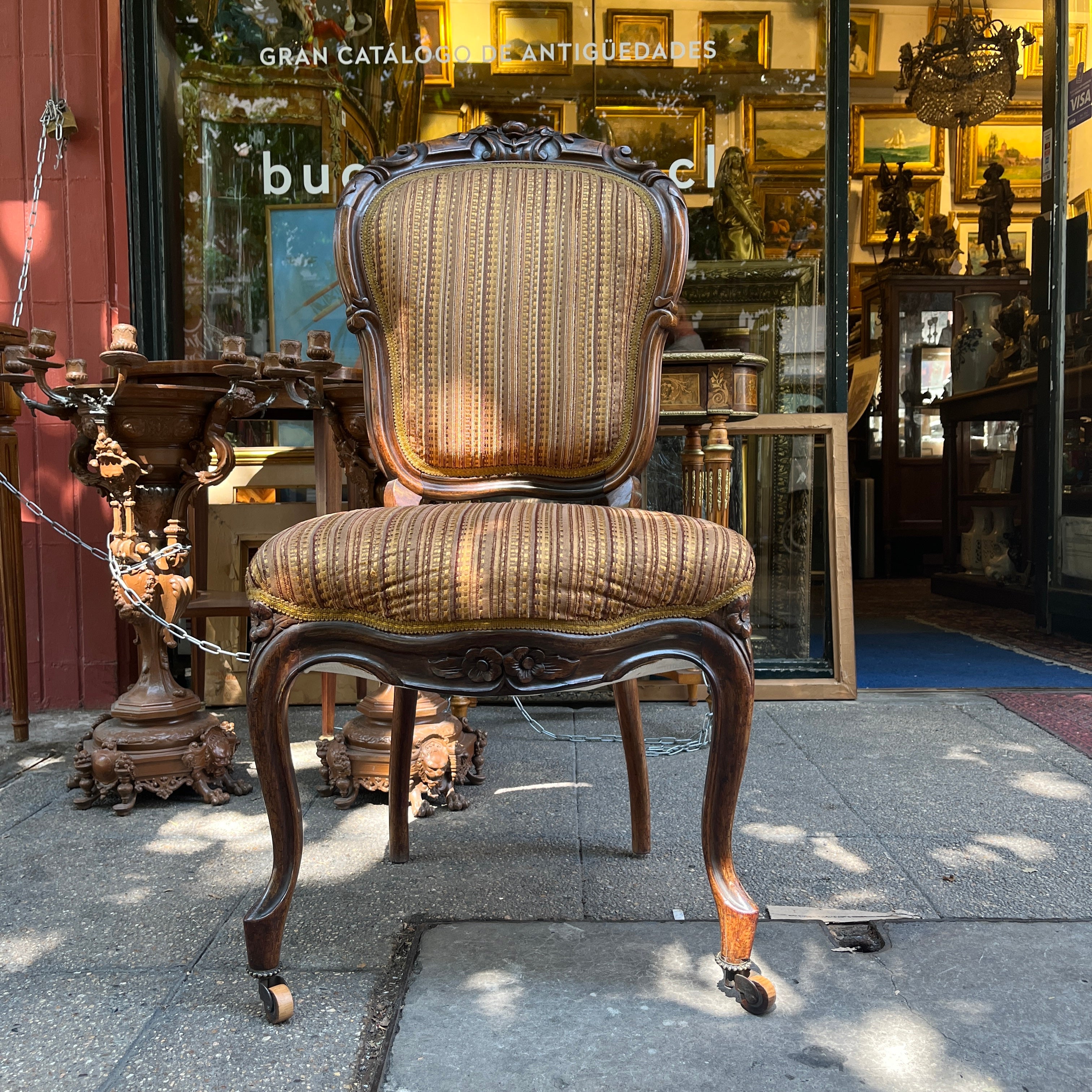 Finísimas sillas francesas estilo victoriano en madera jacarandá, con un delicado tallado floral en su respaldo que realza la belleza de la madera sin recargarla. Tiene dos hermosas ruedas de madera en sus patas delanteras con una sutil corona de bronce, que facilitan su desplazamiento y otorgan un detalle especial en su confección. El tapiz es contemporáneo, sin embargo no altera el estilo de las sillas.
