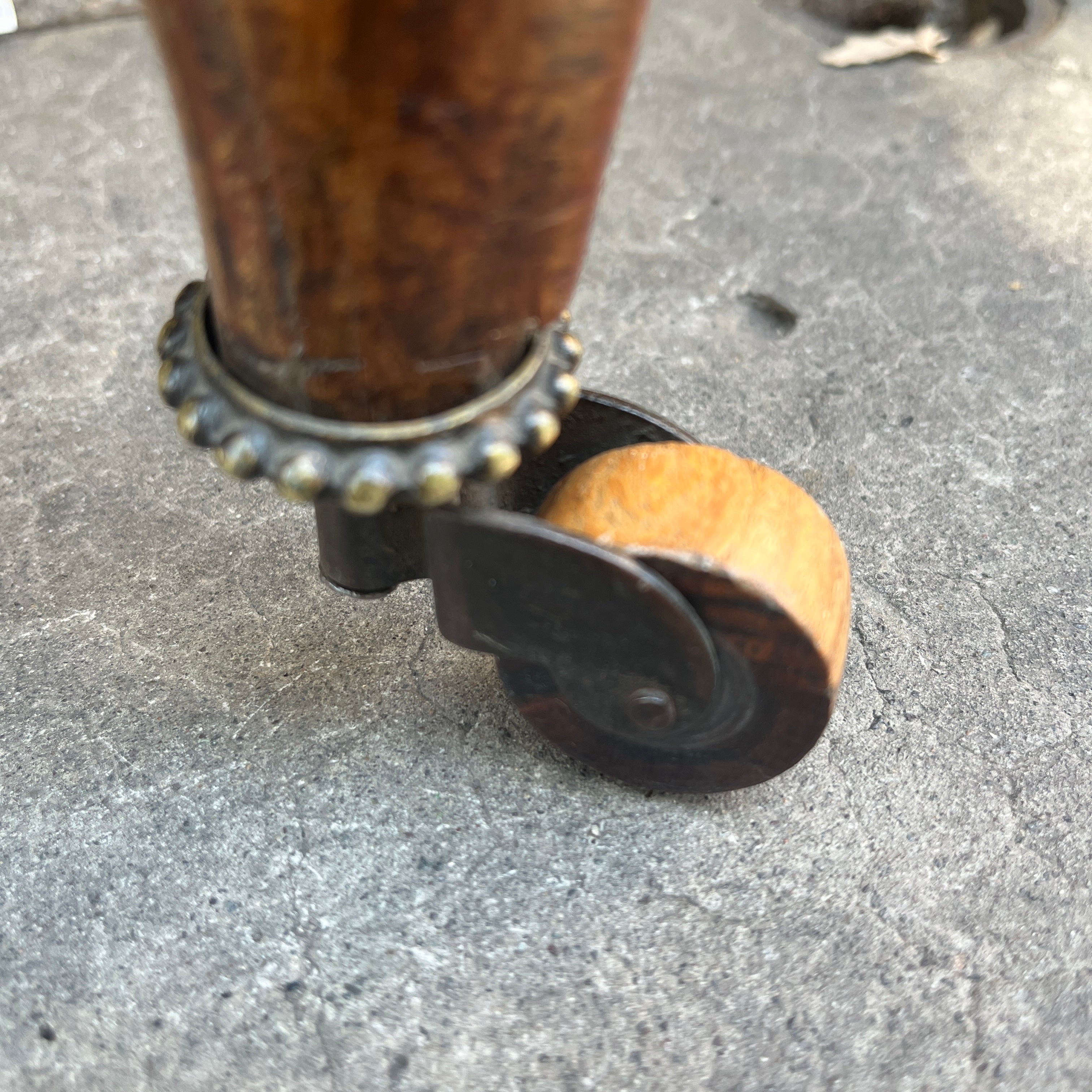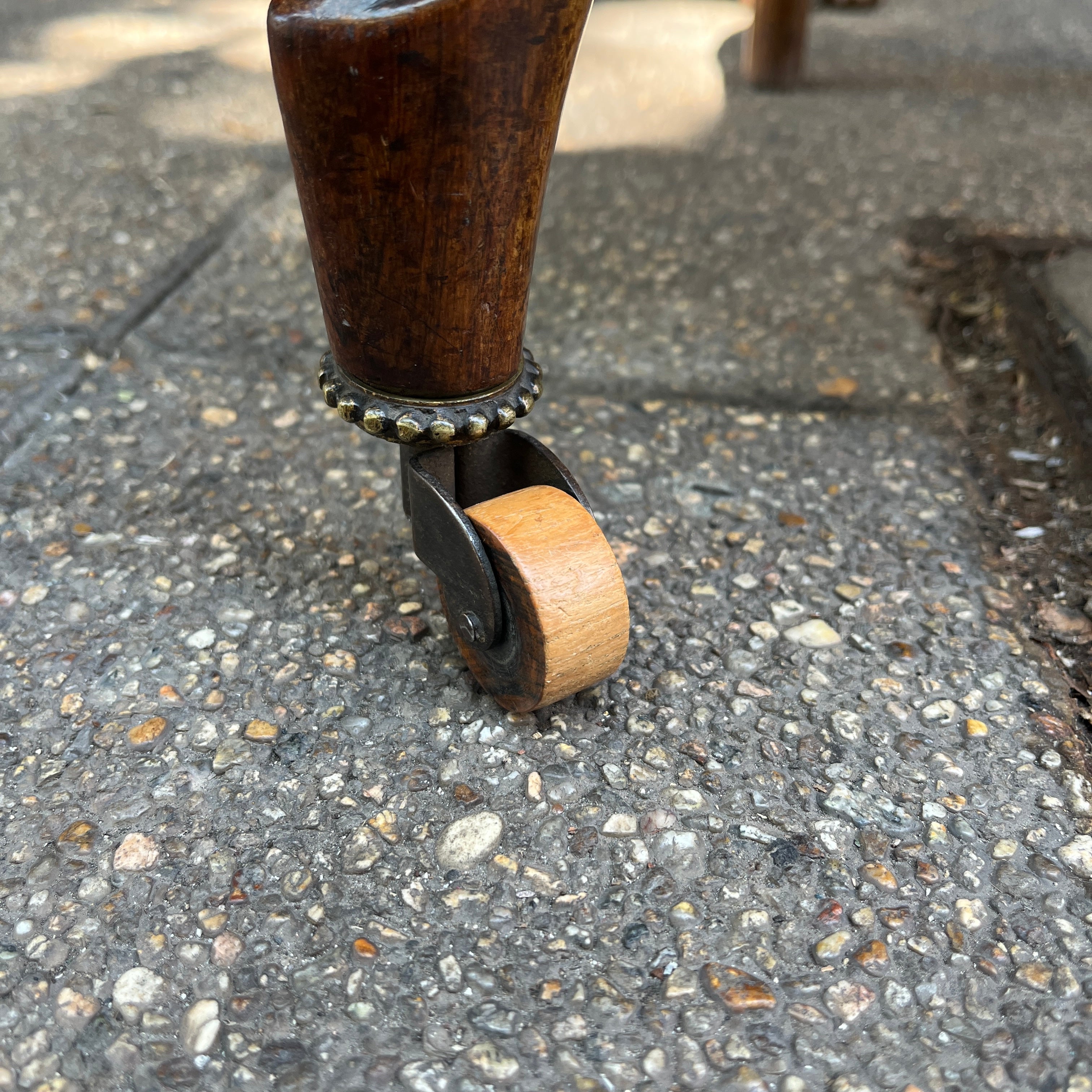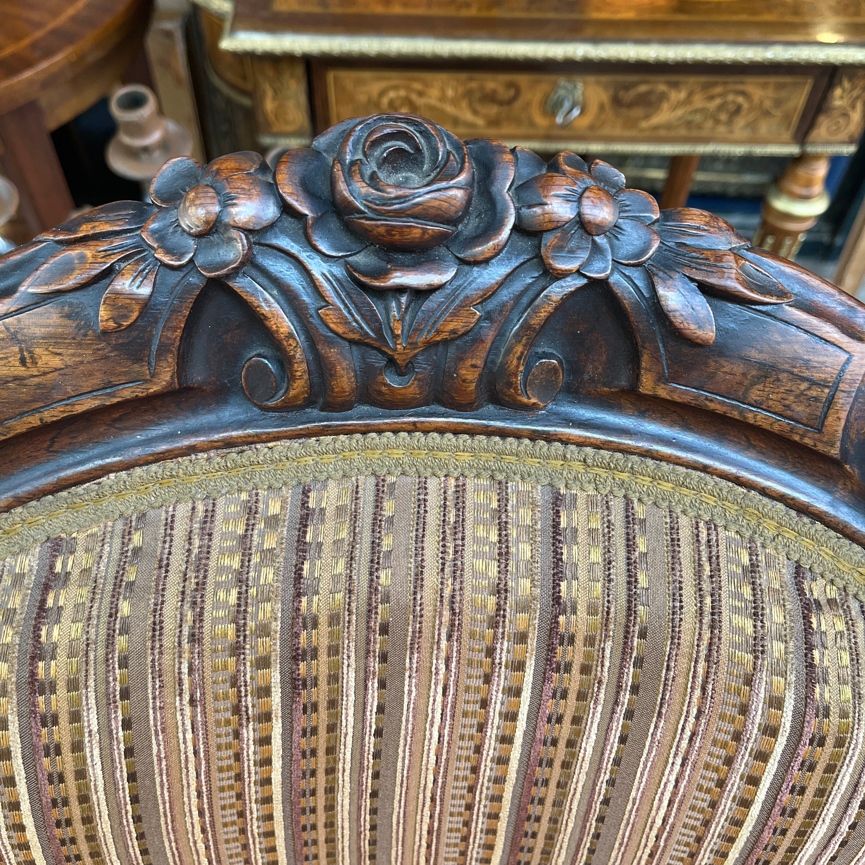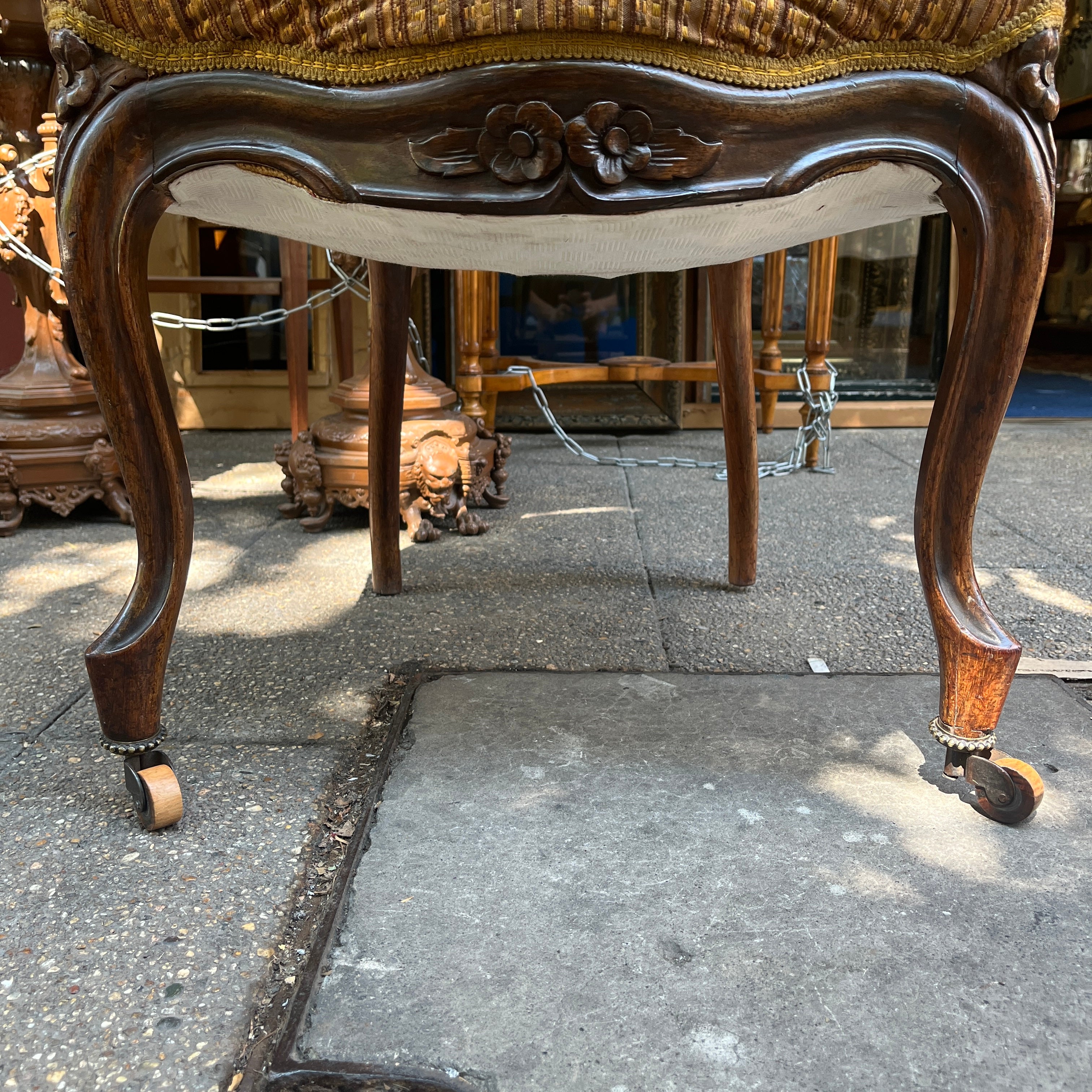 Finísimas sillas francesas estilo victoriano en madera jacarandá, con un delicado tallado floral en su respaldo que realza la belleza de la madera sin recargarla. Tiene dos hermosas ruedas de madera en sus patas delanteras con una sutil corona de bronce, que facilitan su desplazamiento y otorgan un detalle especial en su confección. El tapiz es contemporáneo, sin embargo no altera el estilo de las sillas.