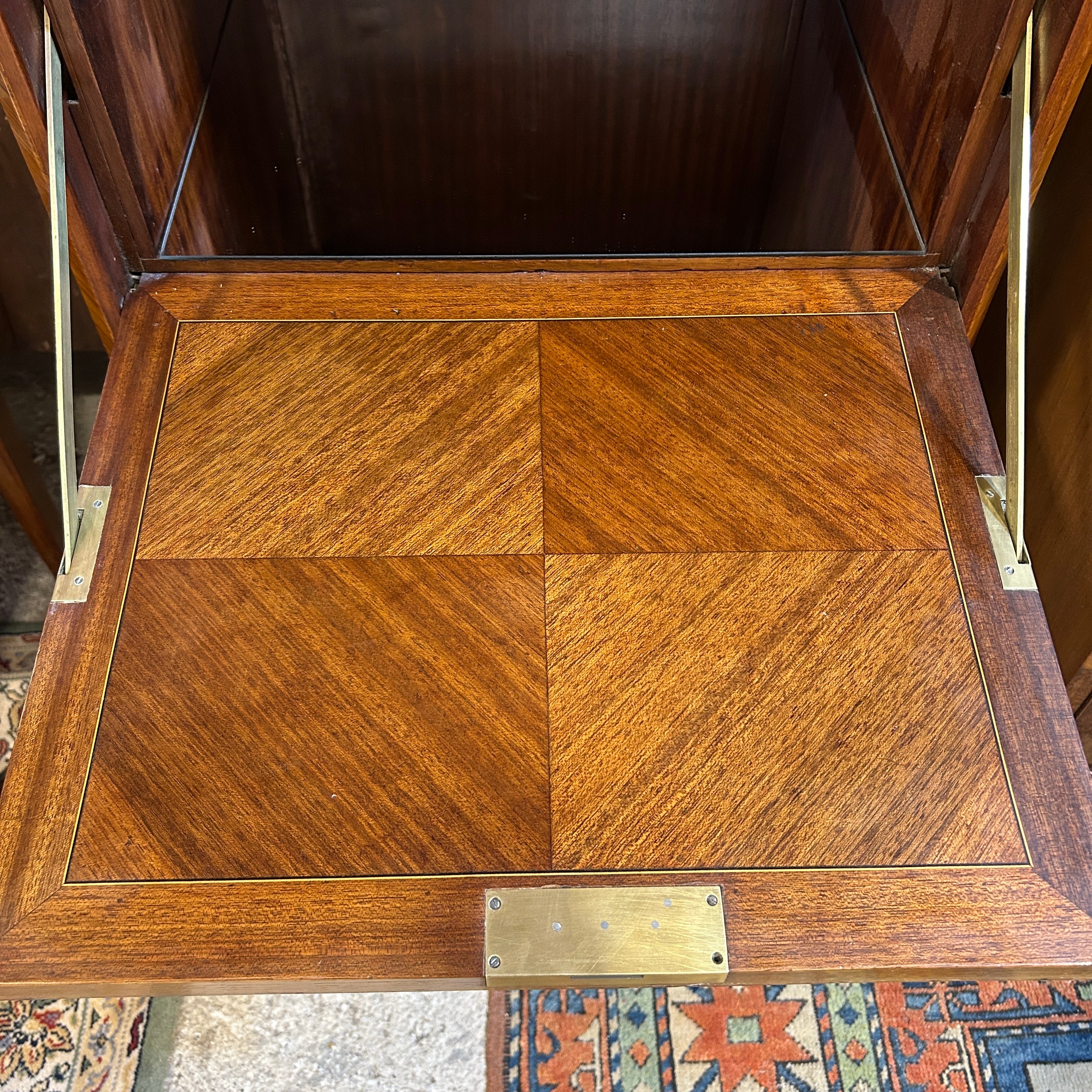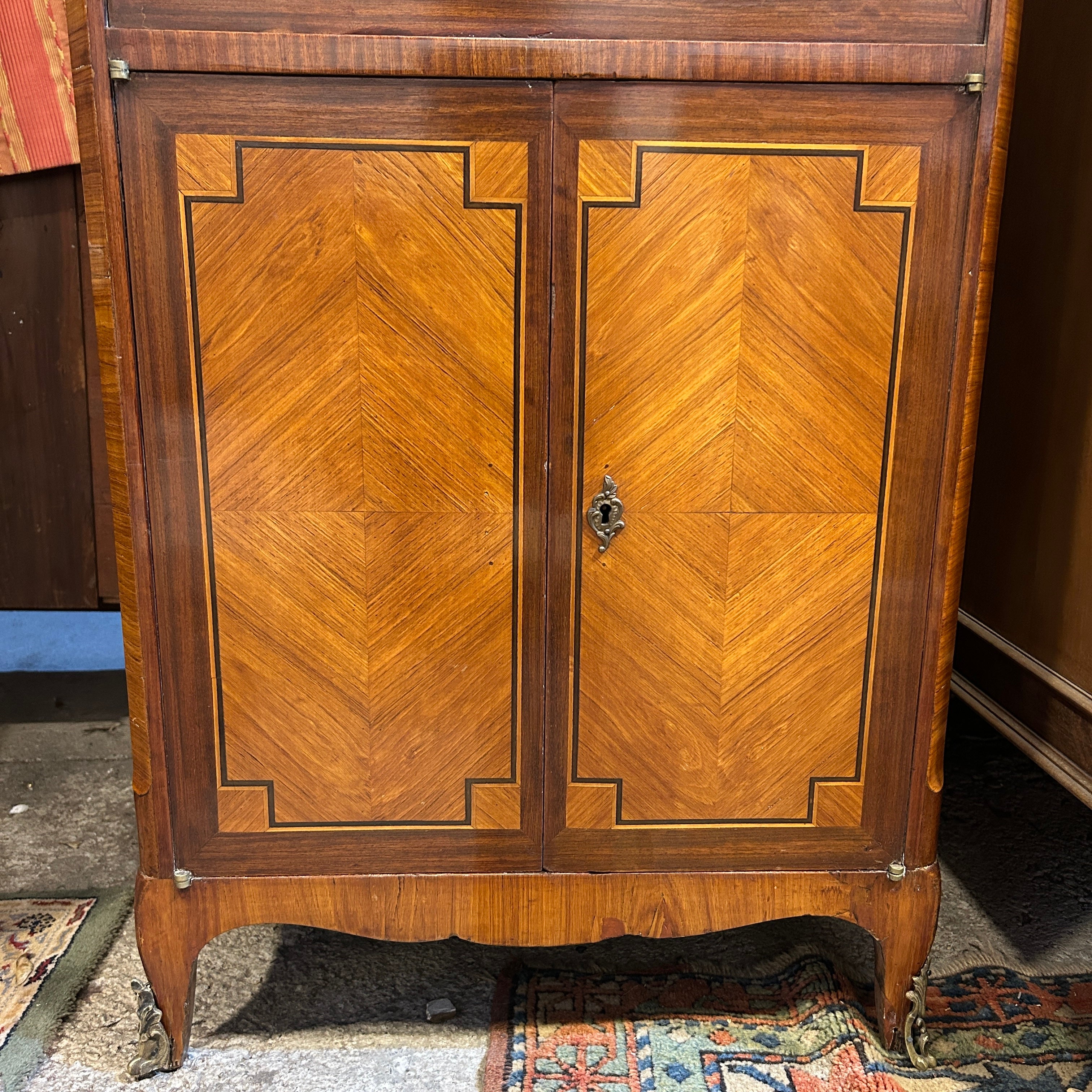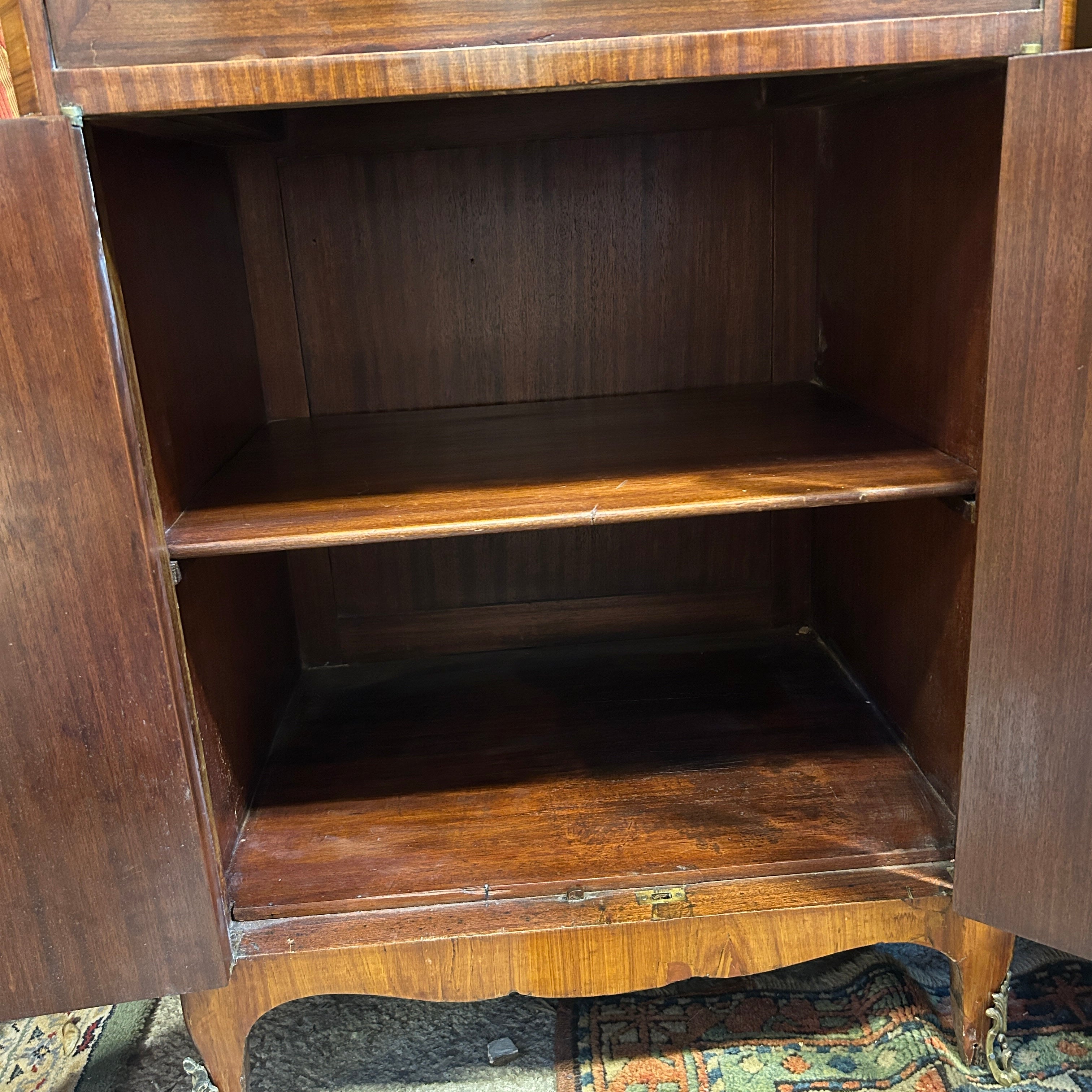 Magnífico petit chiffonier francés estilo transición principios del siglo XX en madera de caoba y palo de rosa y hermosa cubierta de mármol de origen. Es un mueble ideal para situarlo en un lugar donde pueda lucirse, por su sublime trabajo en marquetería. Podemos apreciar el juego de contrastes que se logra con el ensamble de las maderas; En sus muros laterales encontramos dos cuadros compuestos por 4 ensambles cada uno creando un efecto geométrico perfecto, al igual que al interior de la puerta abatible, donde también logra dicho efecto. Cuenta con un cajón superior, una puerta abatible en el centro y en su interior un espejo base. Y dos puertas inferiores; ambos compartimentos con amplio espacio. Este mueble es puede ser utilizado como licorera o mueble para bar.