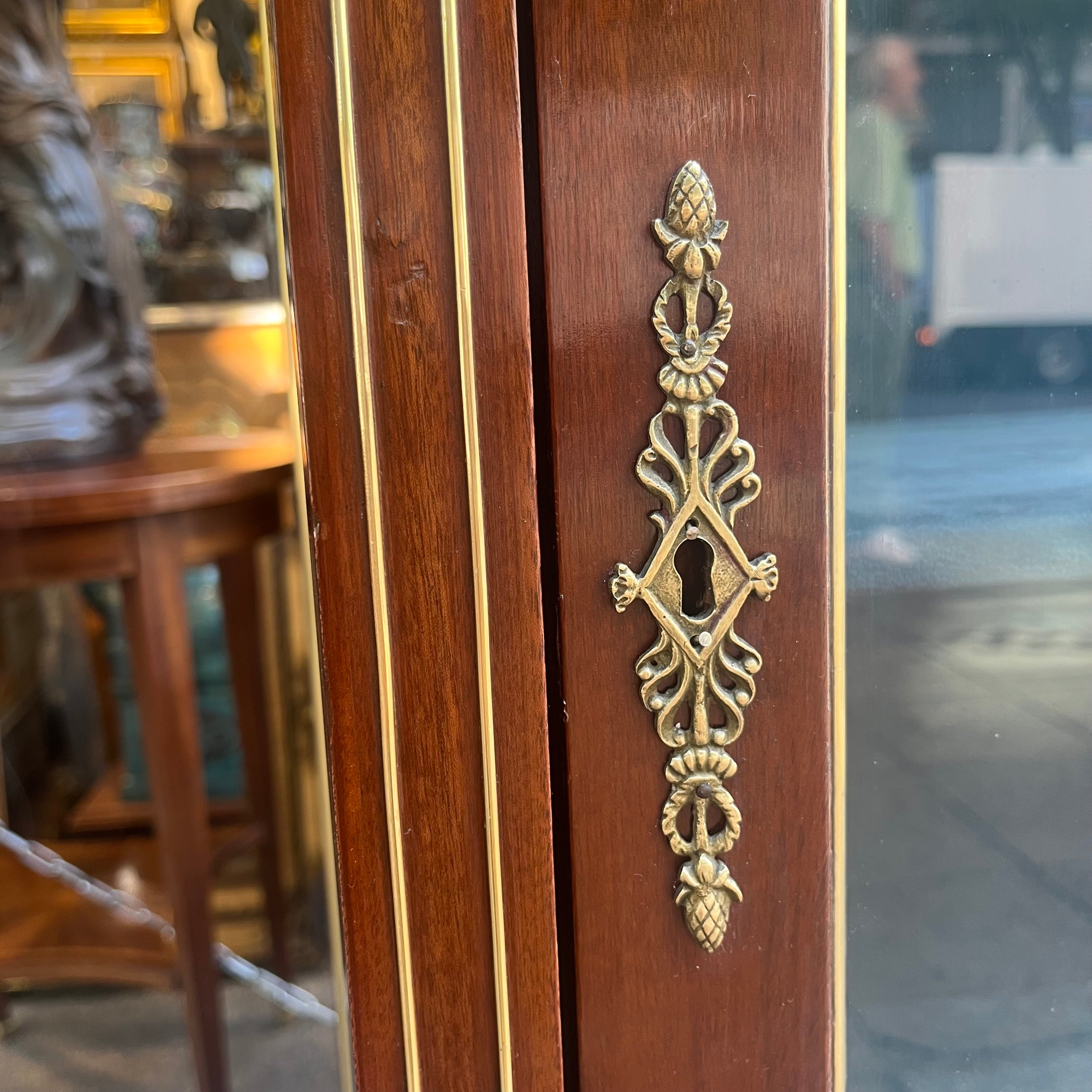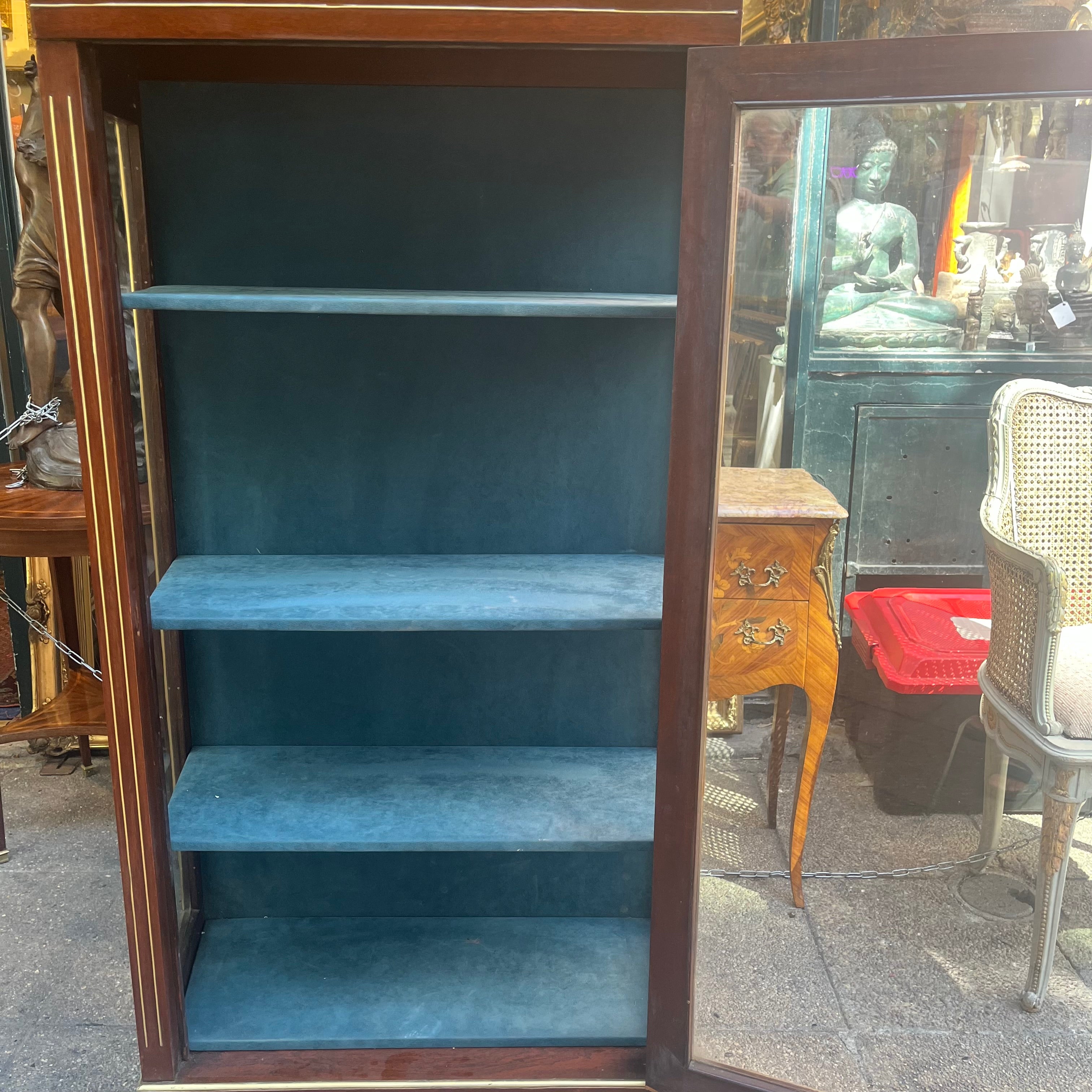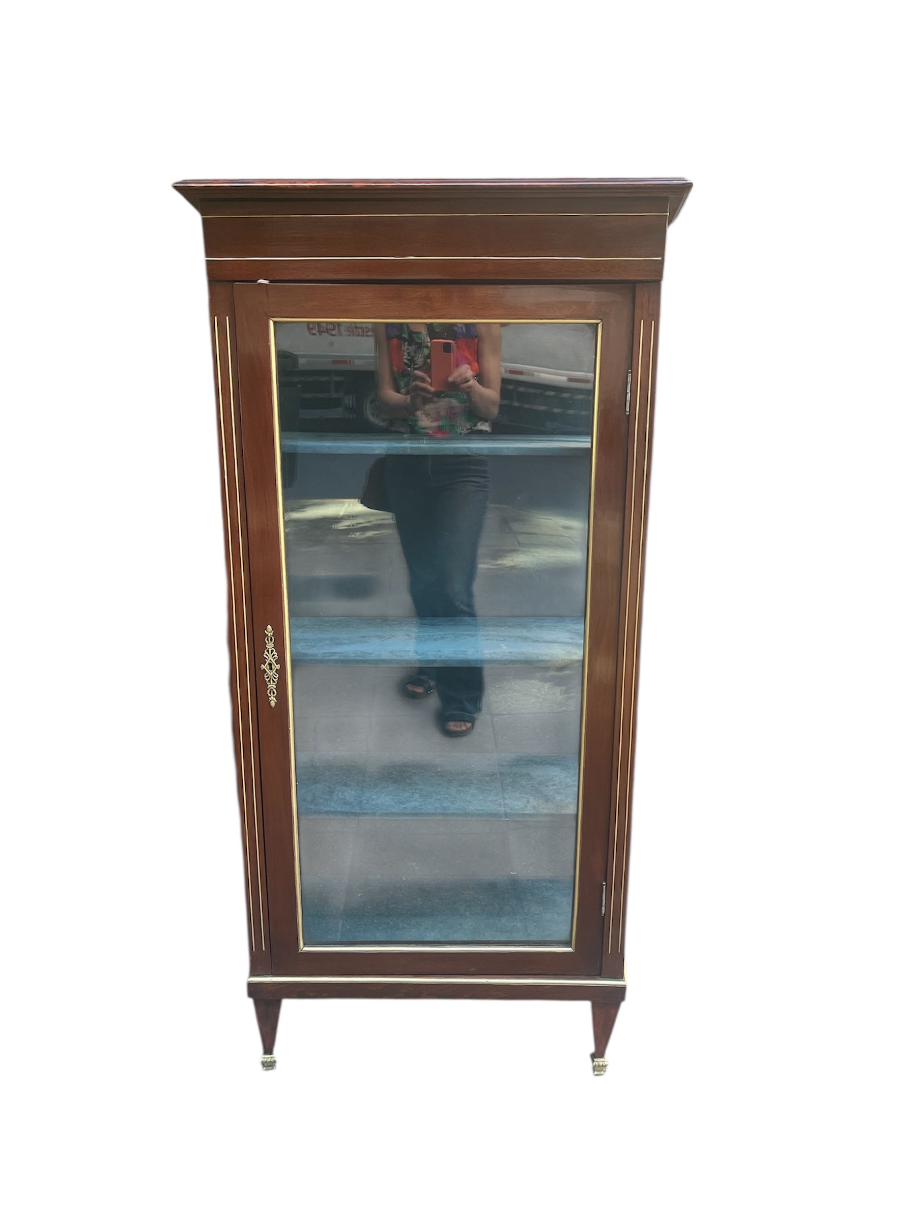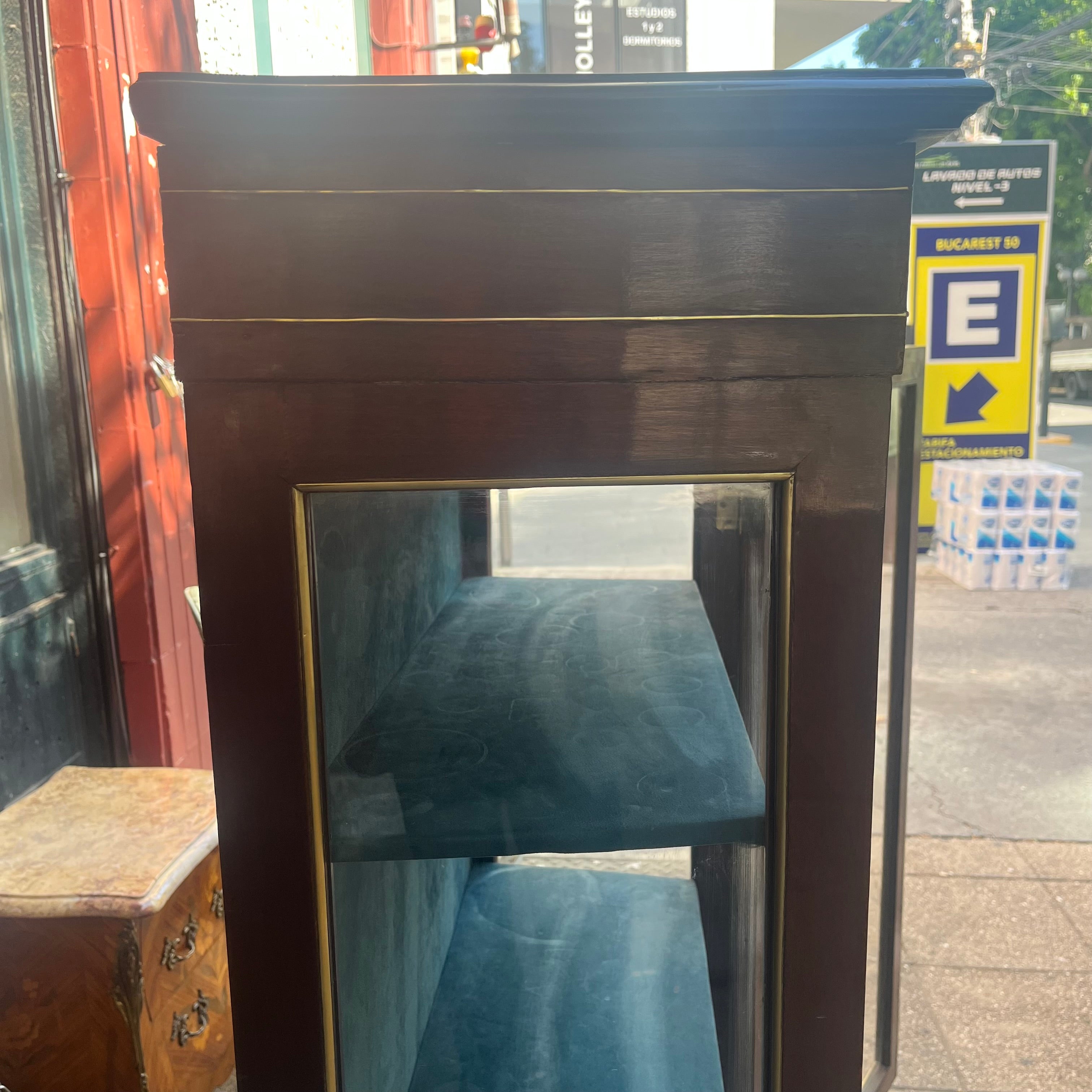 Preciosa vitrina Luís XVI caoba con vidrio frontal y laterales con decoraciones en bronce en su exterior. El interior se encuentra tapizado en azul acero aterciopelado y tres cuenta con tres repisas.