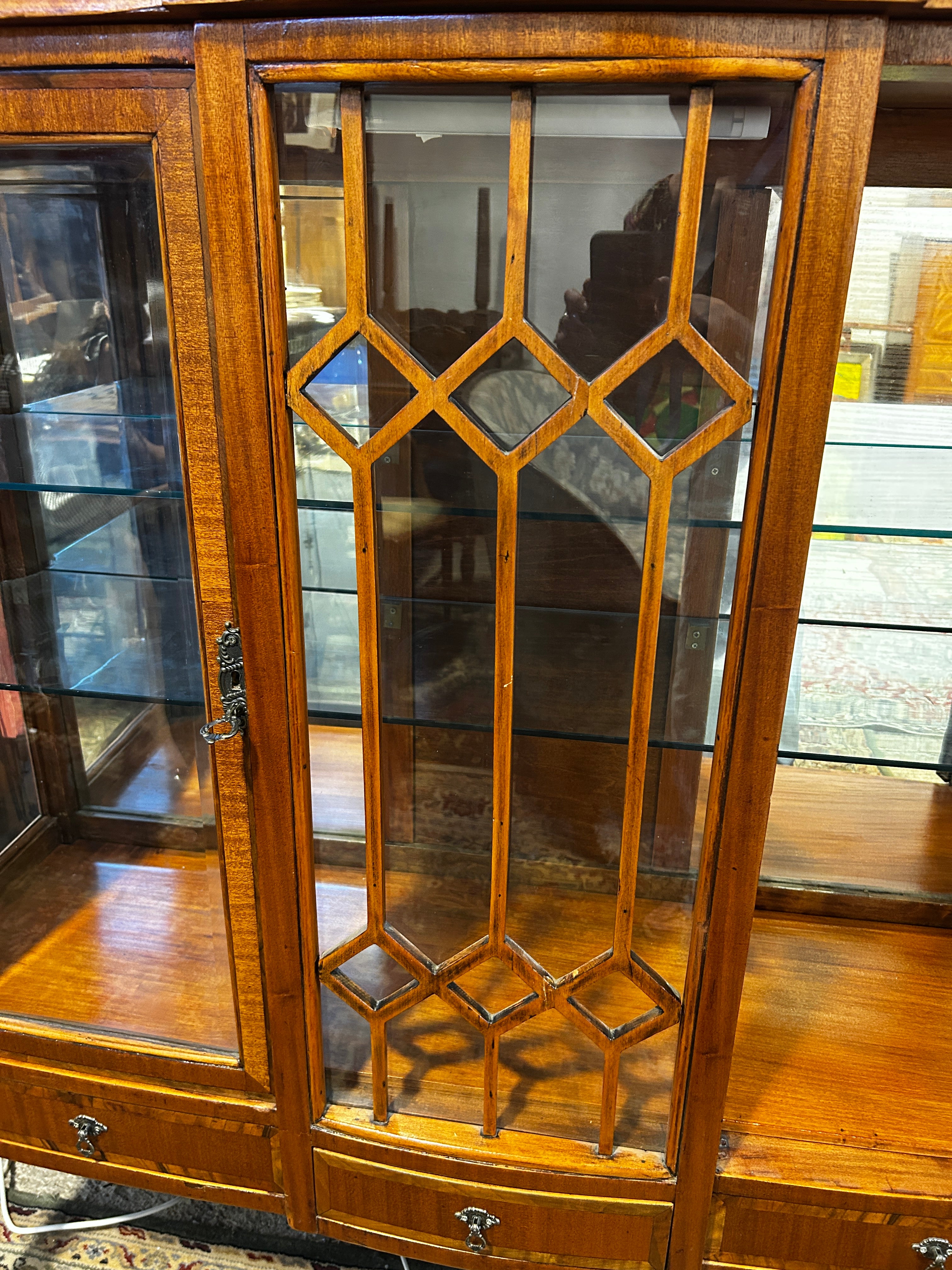 Exclusiva vitrina cristalera baja, chilena, estilo inglés, de los años cincuenta, de madera de lingue. Tiene unas hermosas puertas frontales de vidrio biselado, con preciosa palillería estilo edwardian, tres cajoneras frontales en perfectas condiciones. En su interior cuenta con dos repisas de vidrio y espejo también biselados.