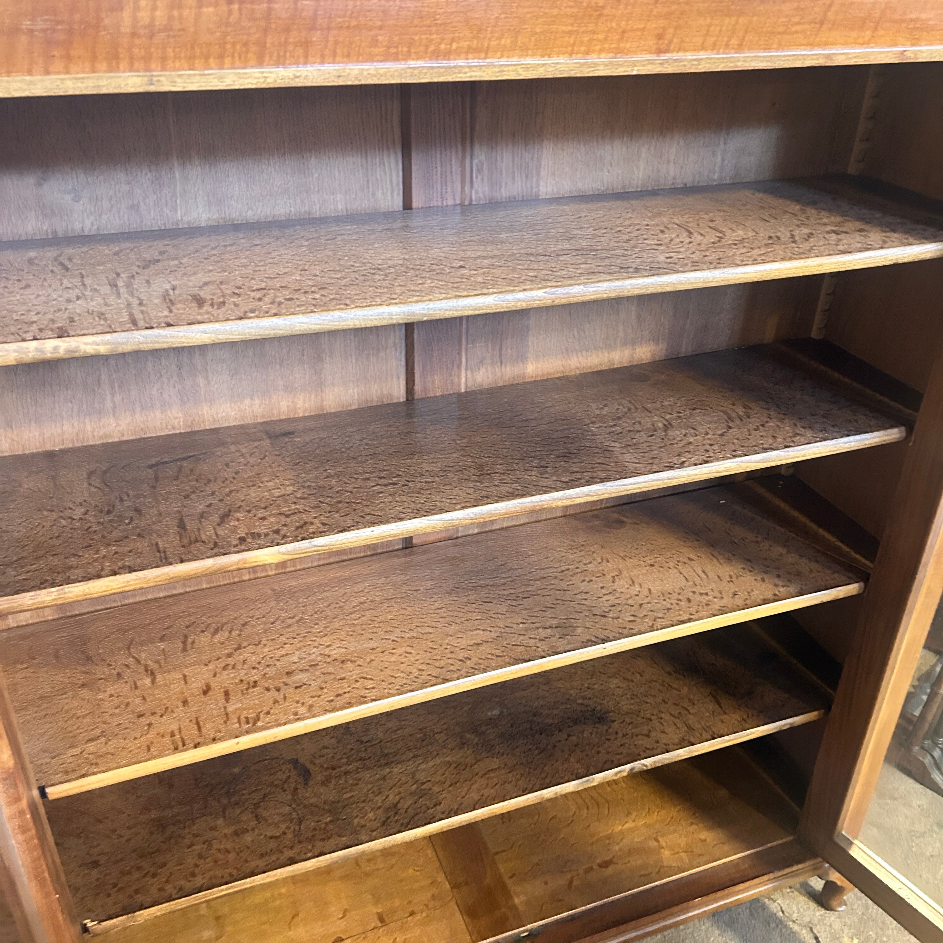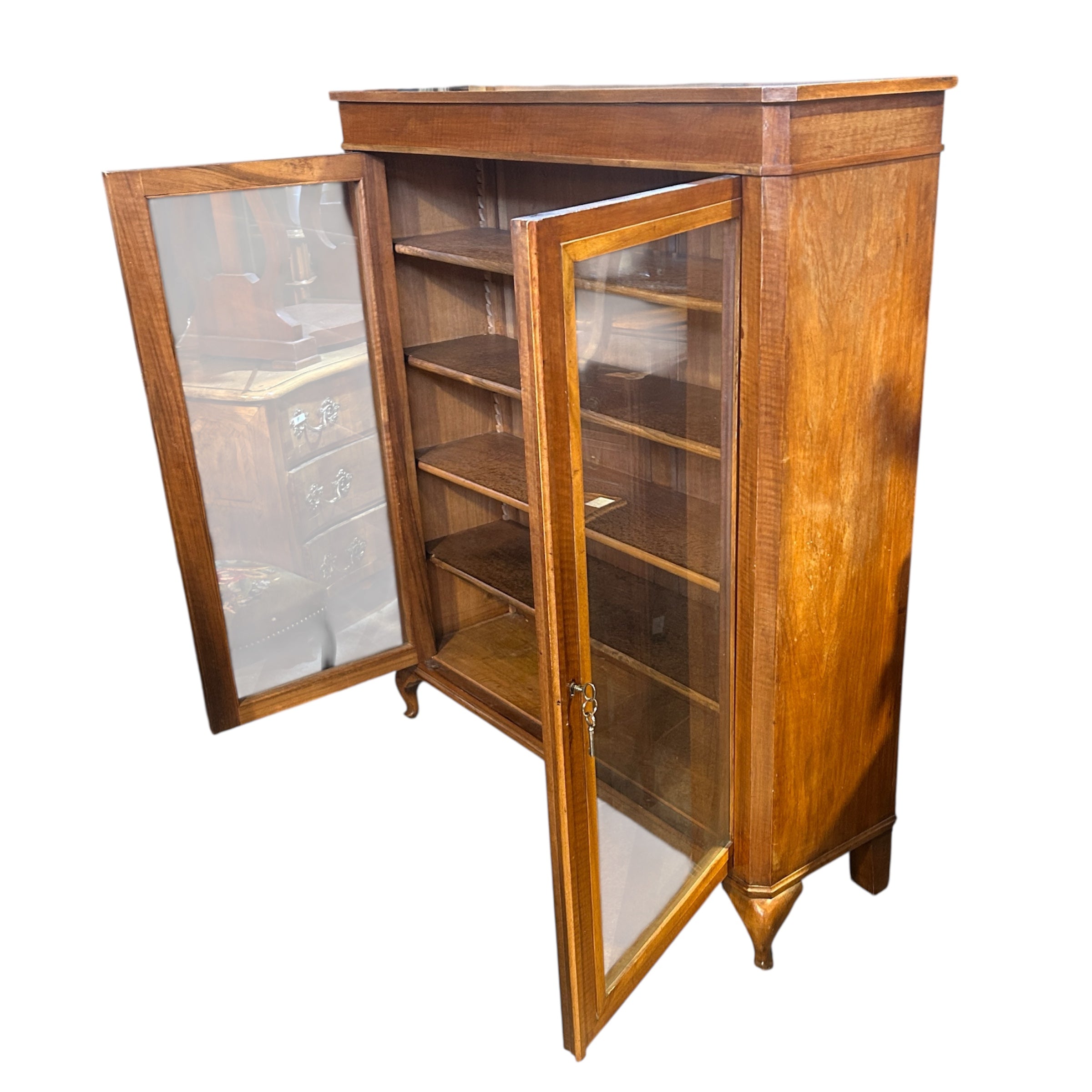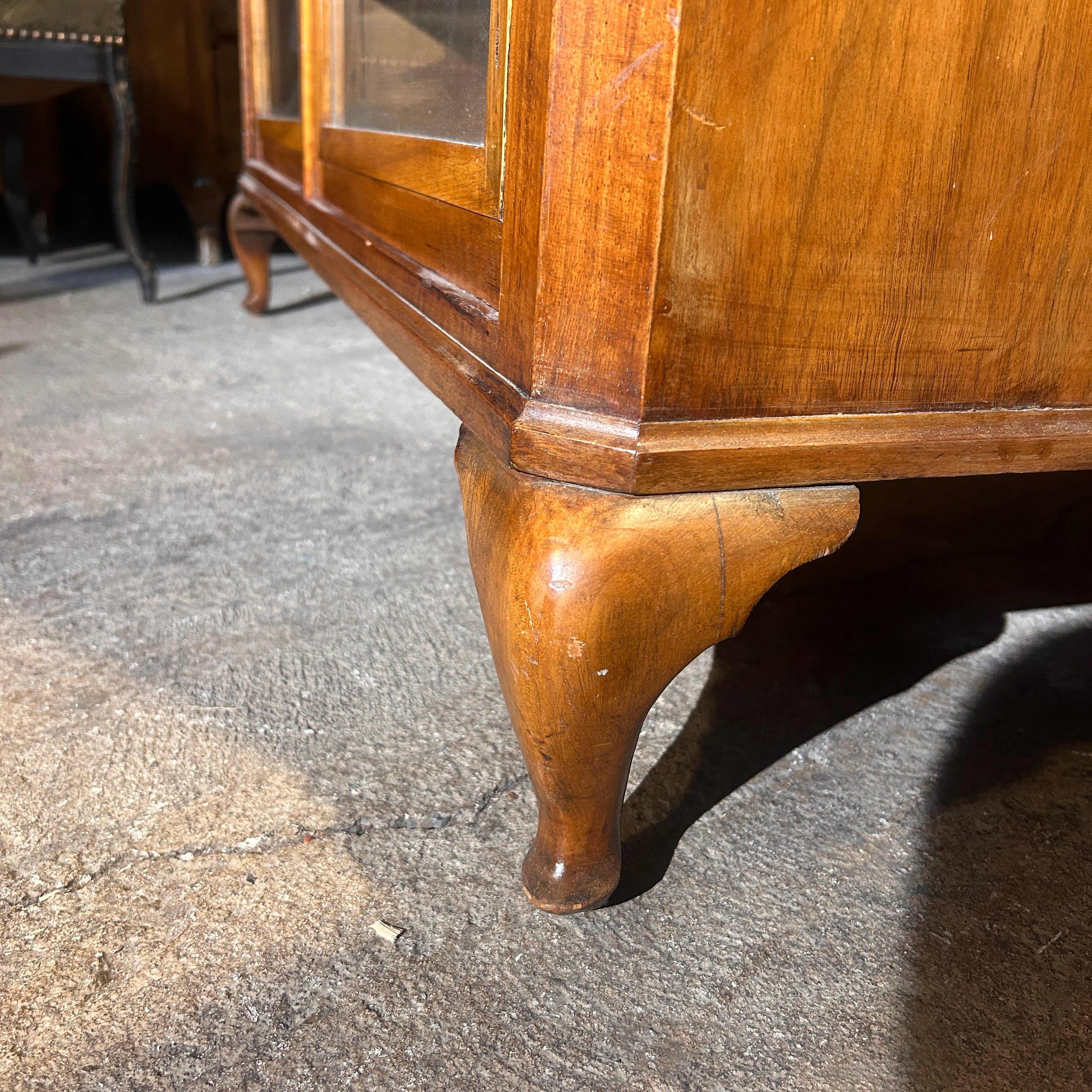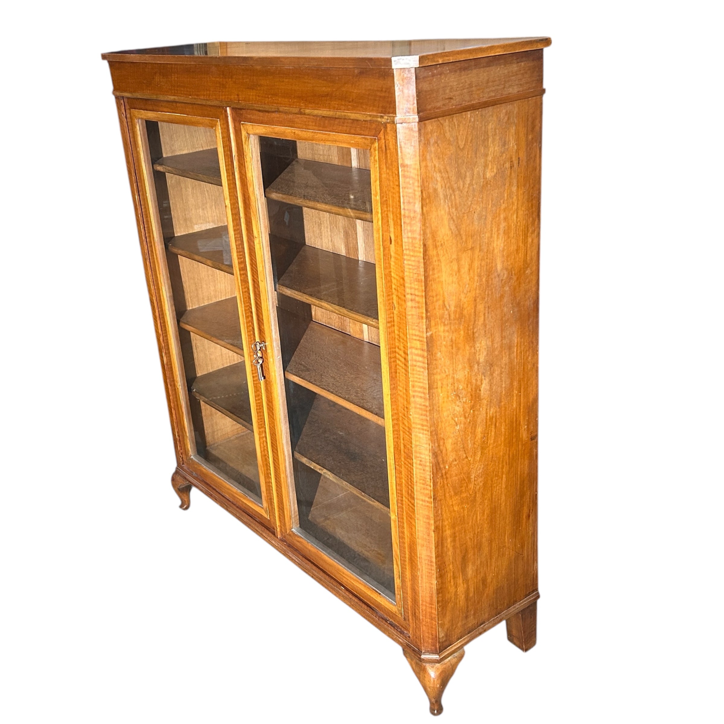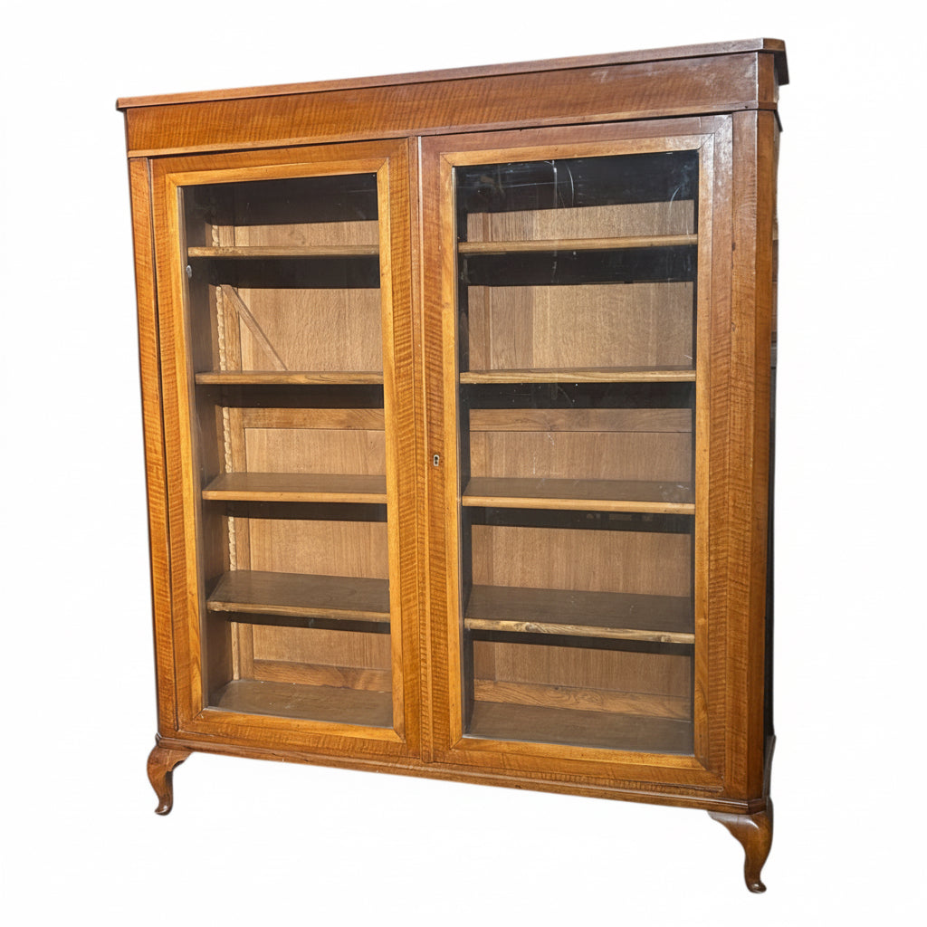 Sobrio librero francés de principios del siglo XX circa 1930 , hecho en madera de nogal y doble puerta vidriada. La pieza, de líneas rectas y en contrapunto con sus patas curvas, tiene 4 elegantes repisas de encino con un llamativo veteado. La pieza se encuentra en buen estado. Pequeño detalle en su cubierta.