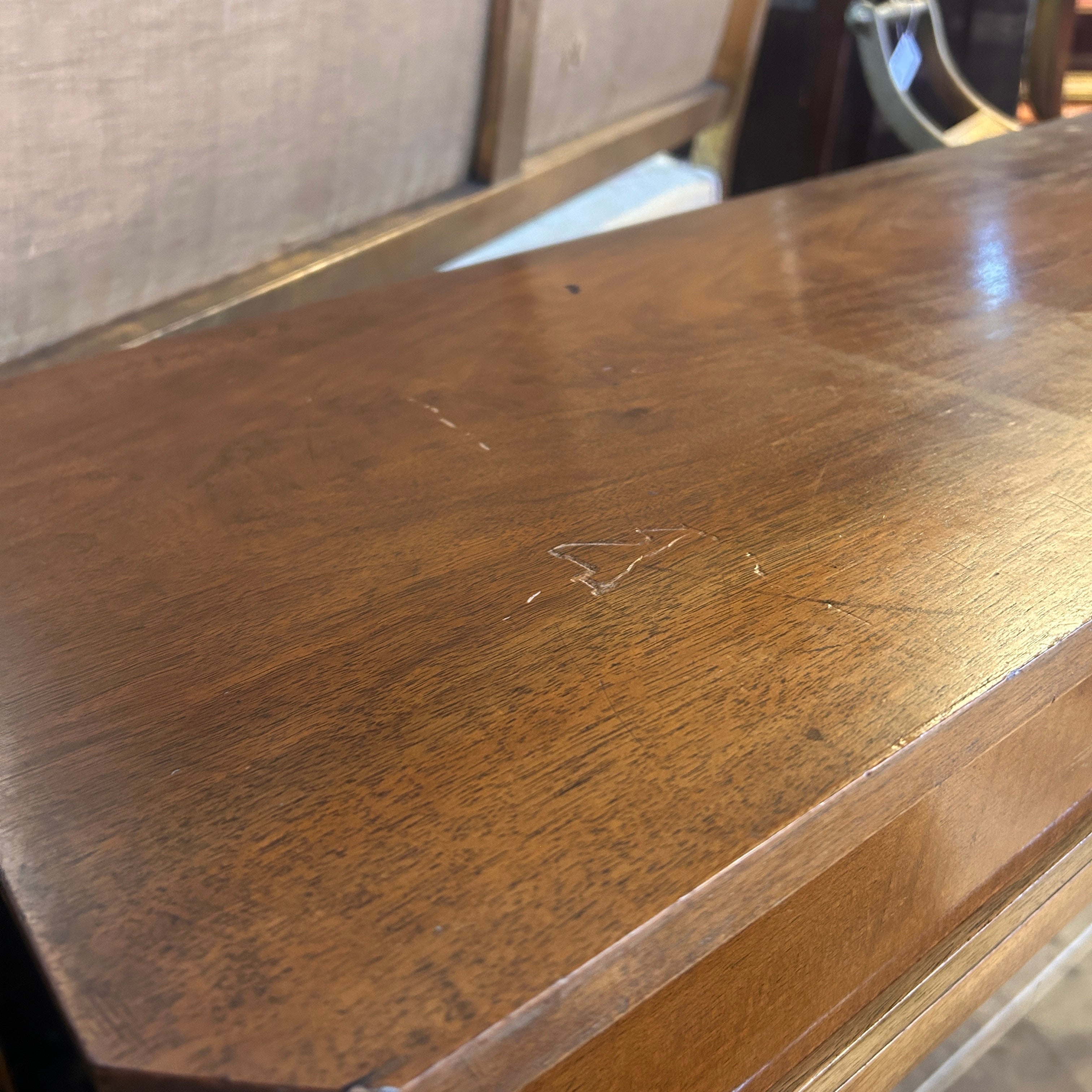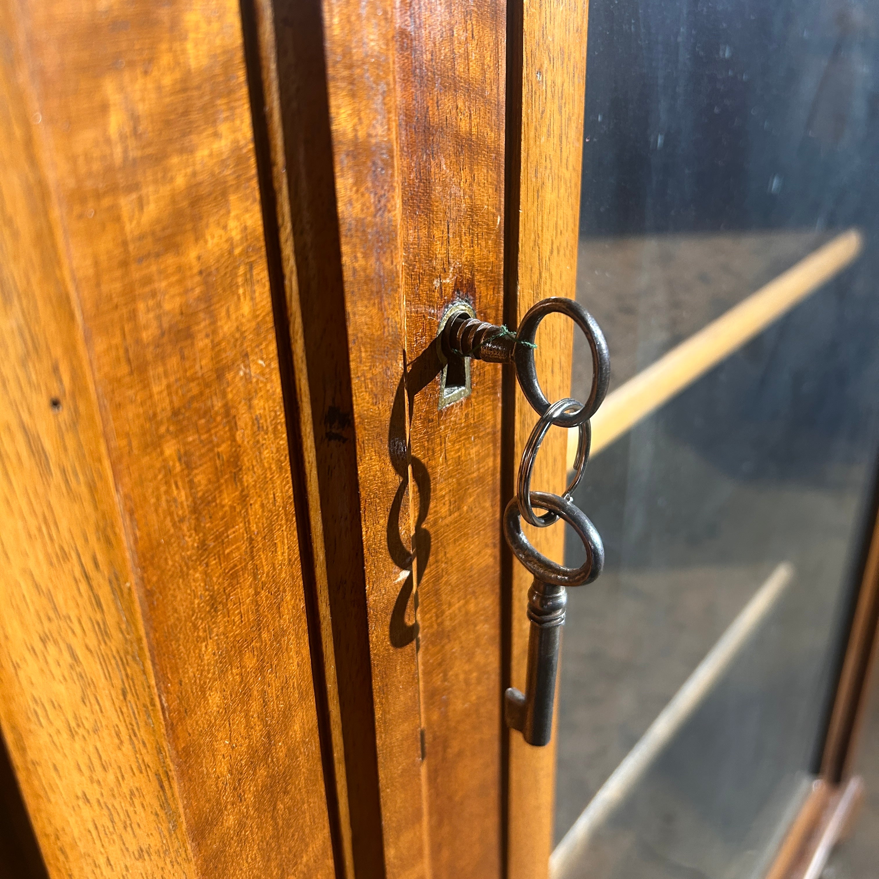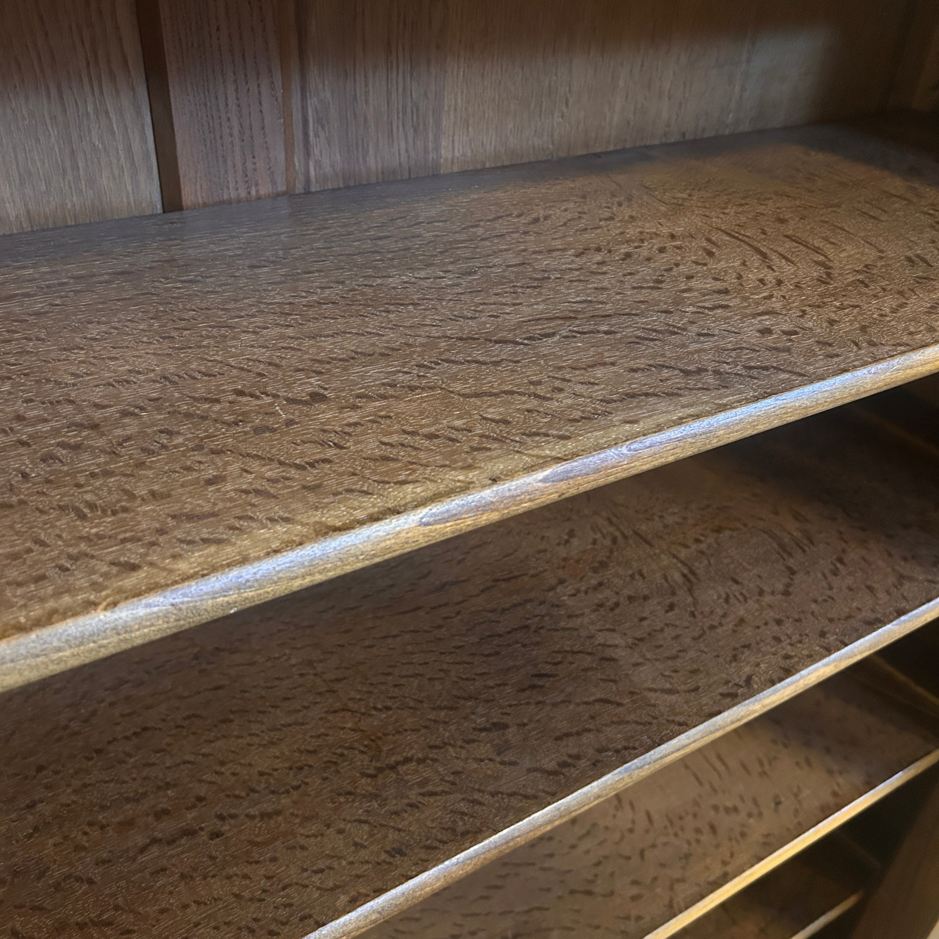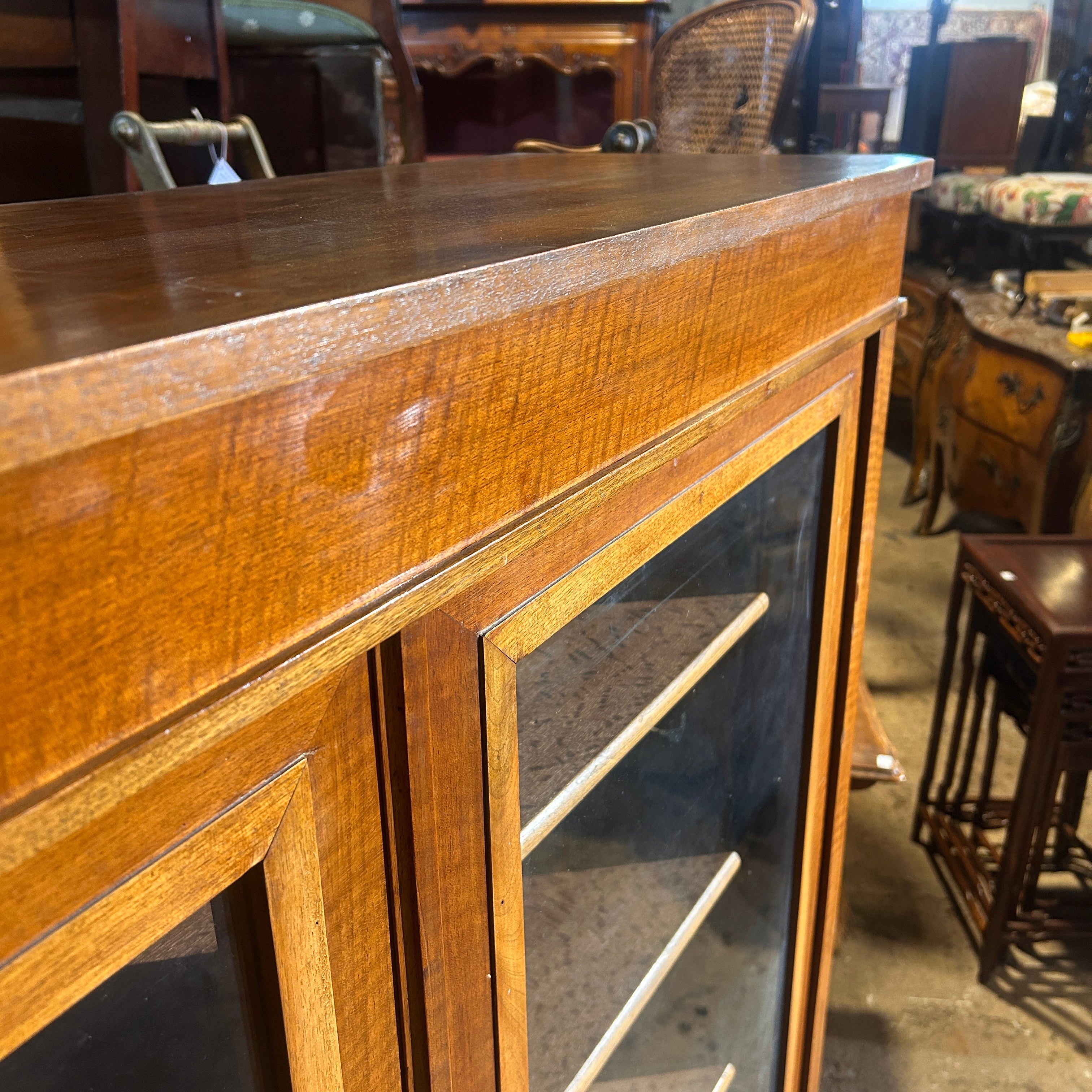 Sobrio librero francés de principios del siglo XX circa 1930 , hecho en madera de nogal y doble puerta vidriada. La pieza, de líneas rectas y en contrapunto con sus patas curvas, tiene 4 elegantes repisas de encino con un llamativo veteado. La pieza se encuentra en buen estado. Pequeño detalle en su cubierta.