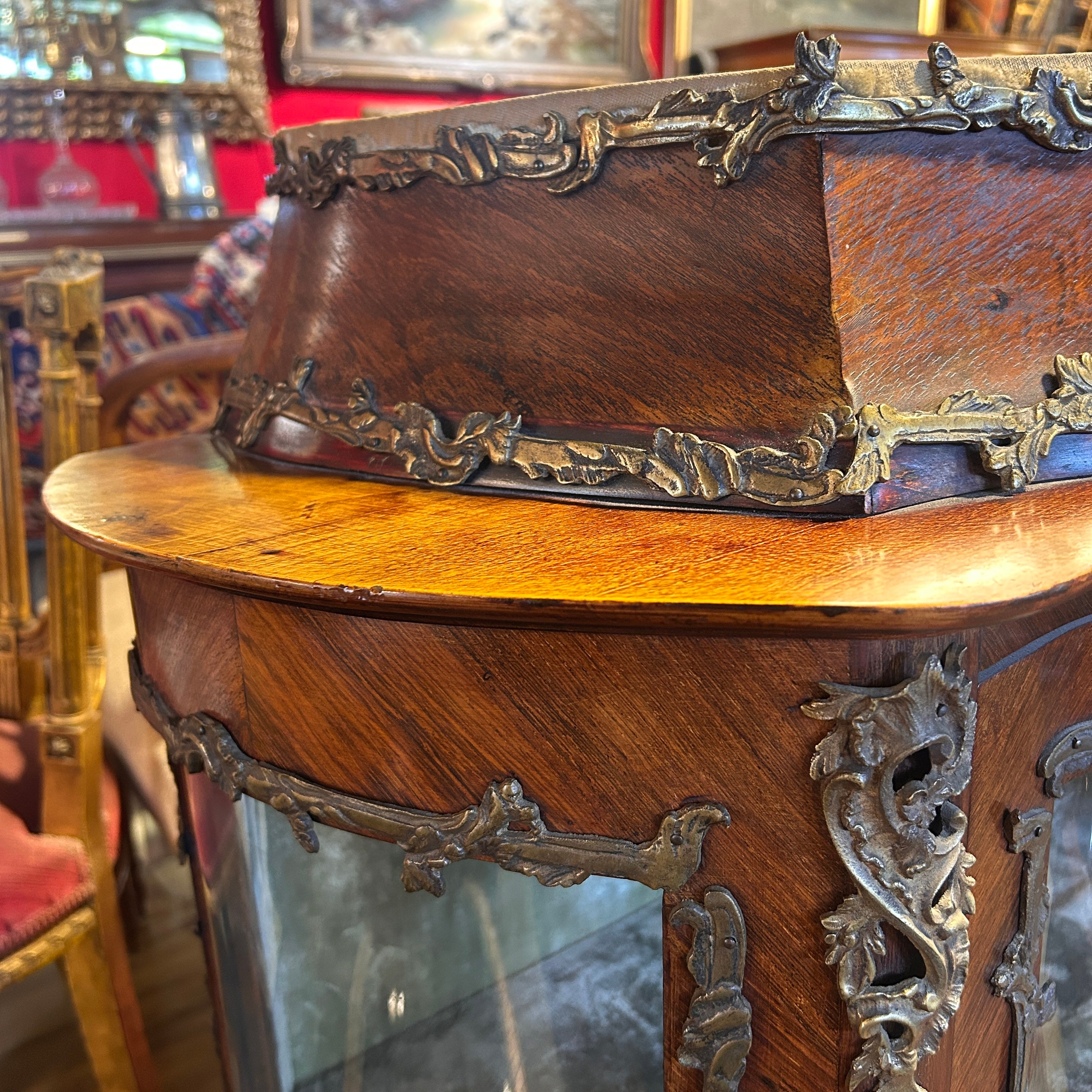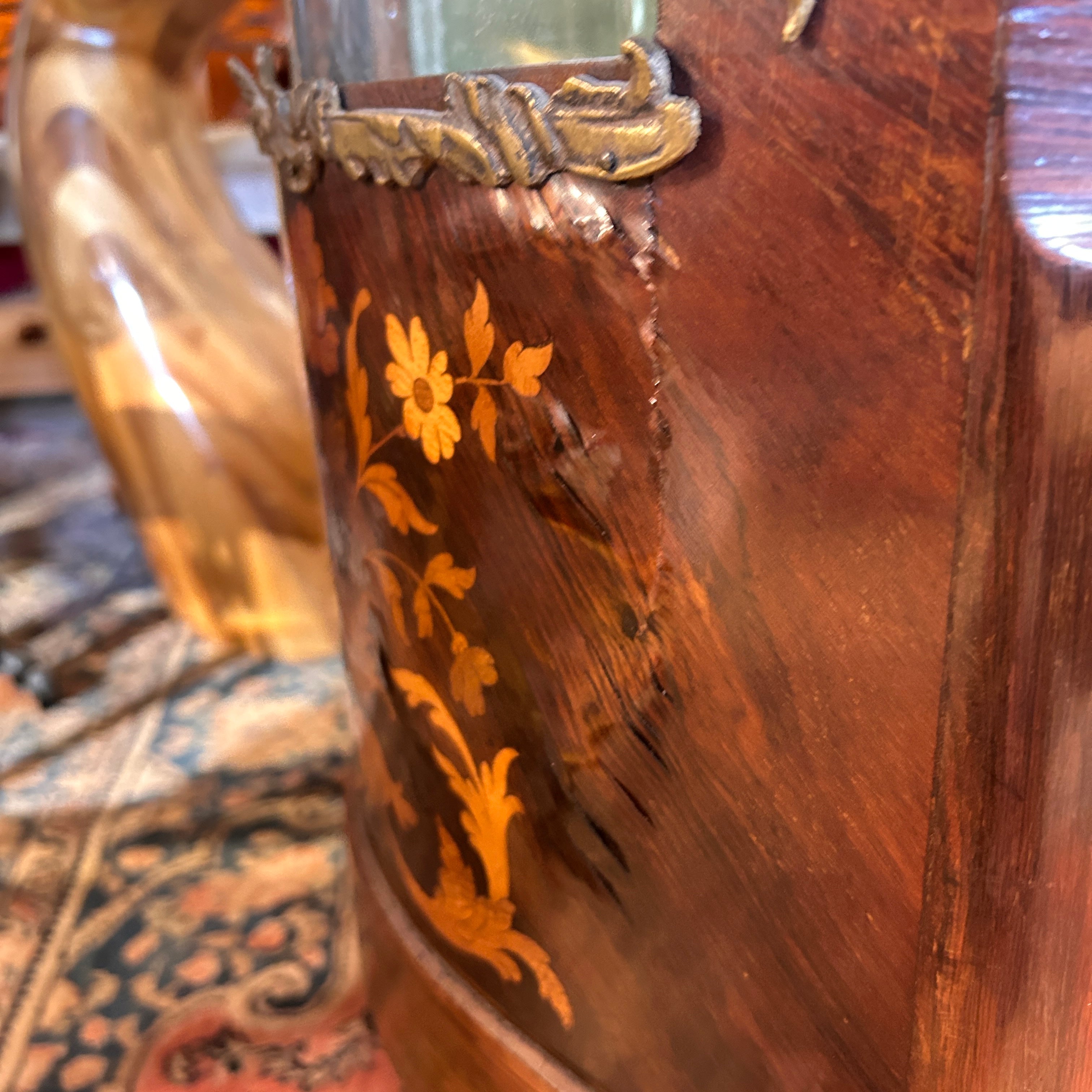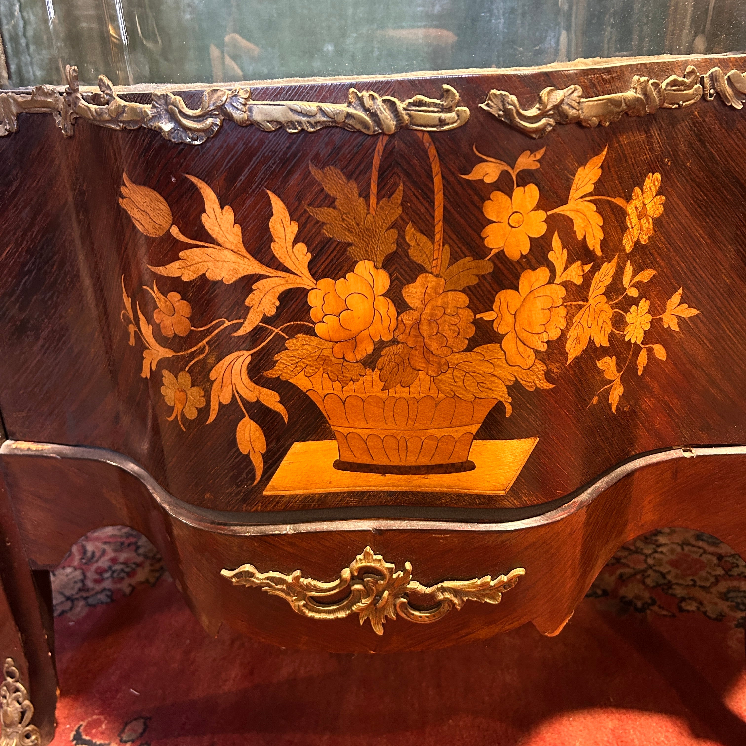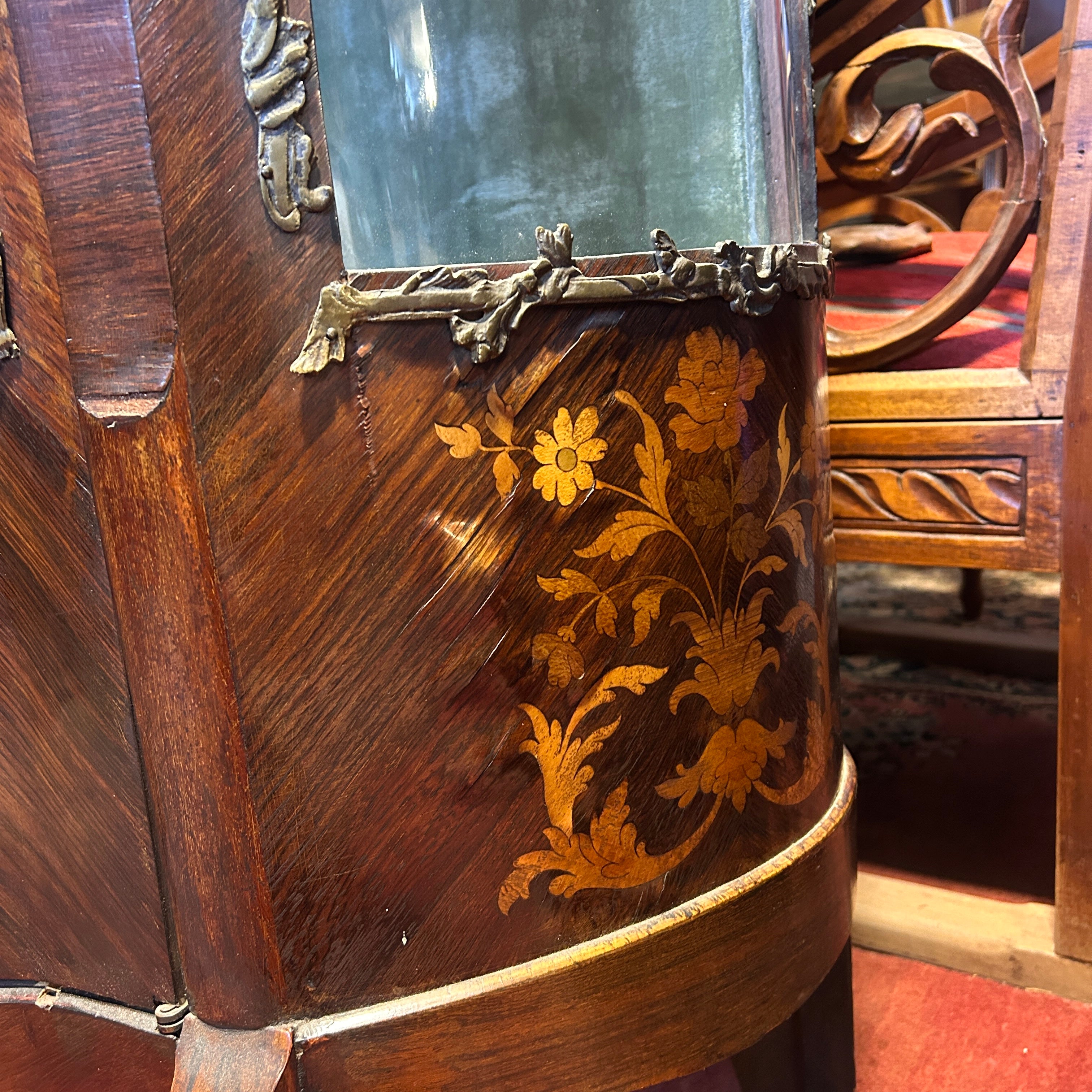 Vitrina francesa serpentine estilo Napoleón III principios del s.XX, en madera de jacaranda con marquetería frutal en diseño de flores, bellos bronces cincelados, tablero de vidrio y vajilla italiana de tres niveles en terciopelo verde, además de un compartimento oculto. Se entrega barnizada y con cubierta de mármol.
