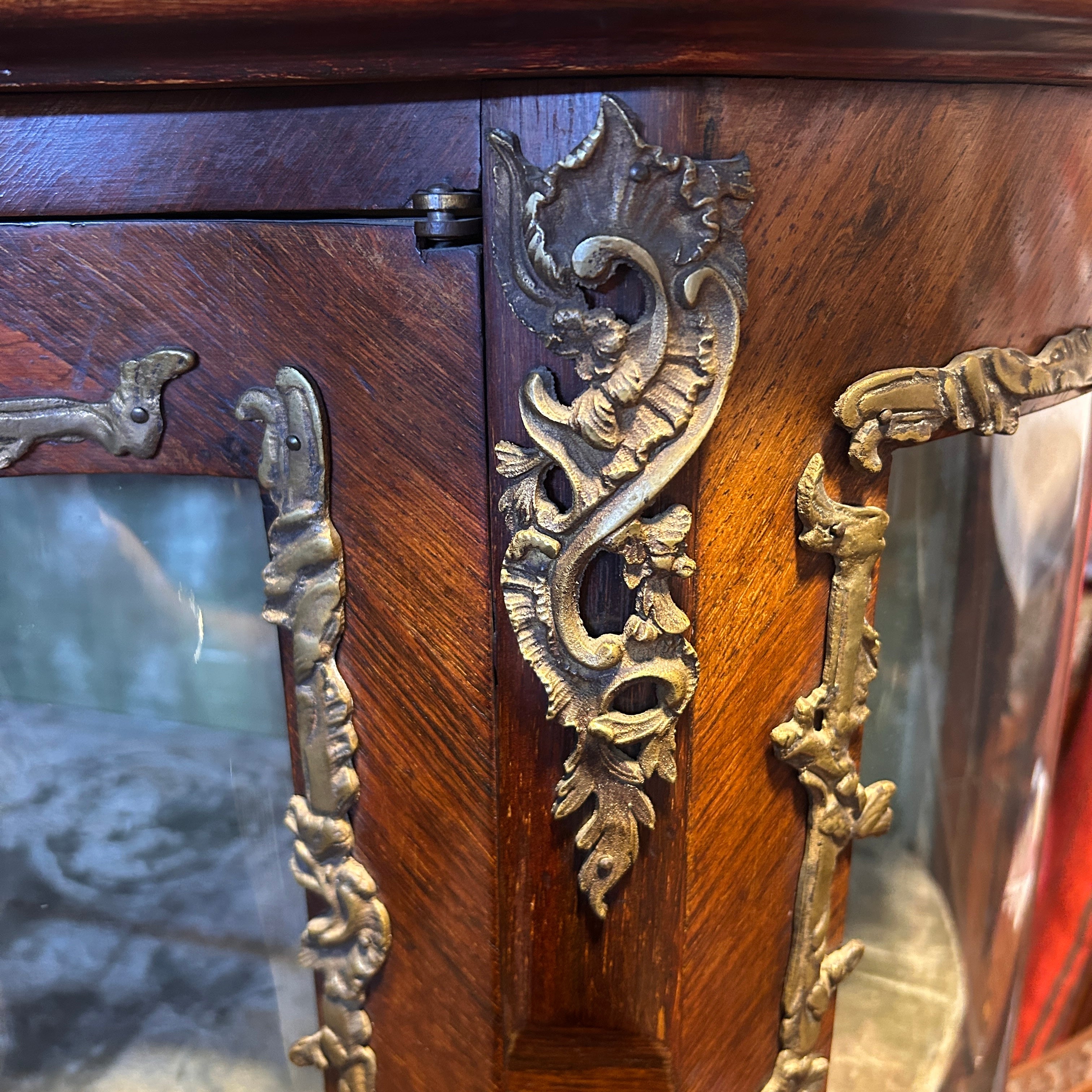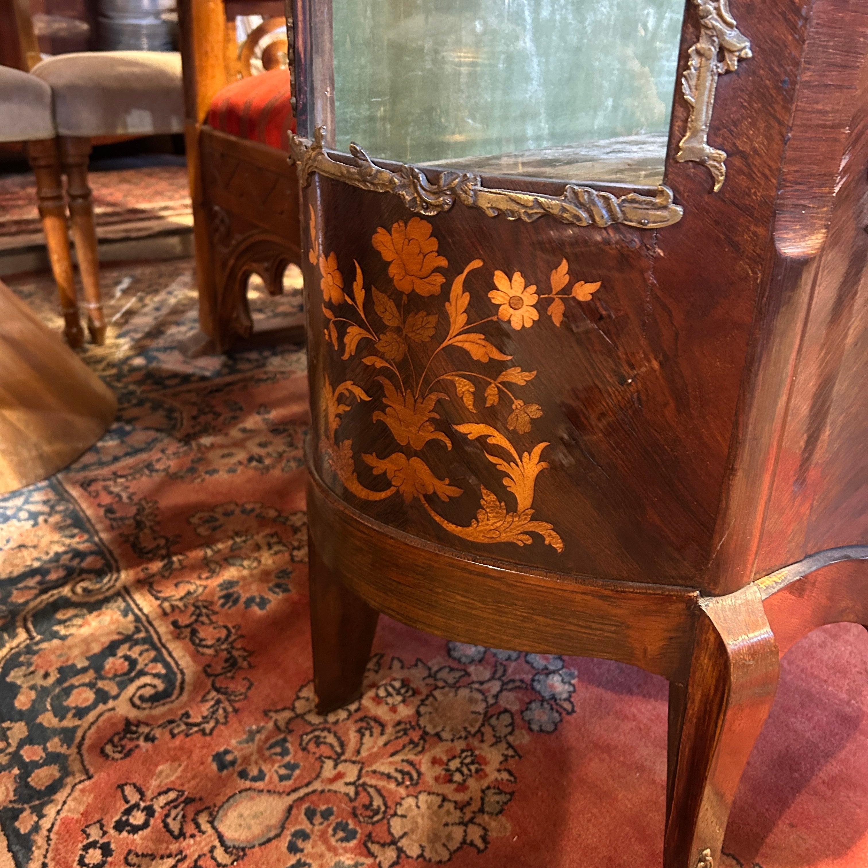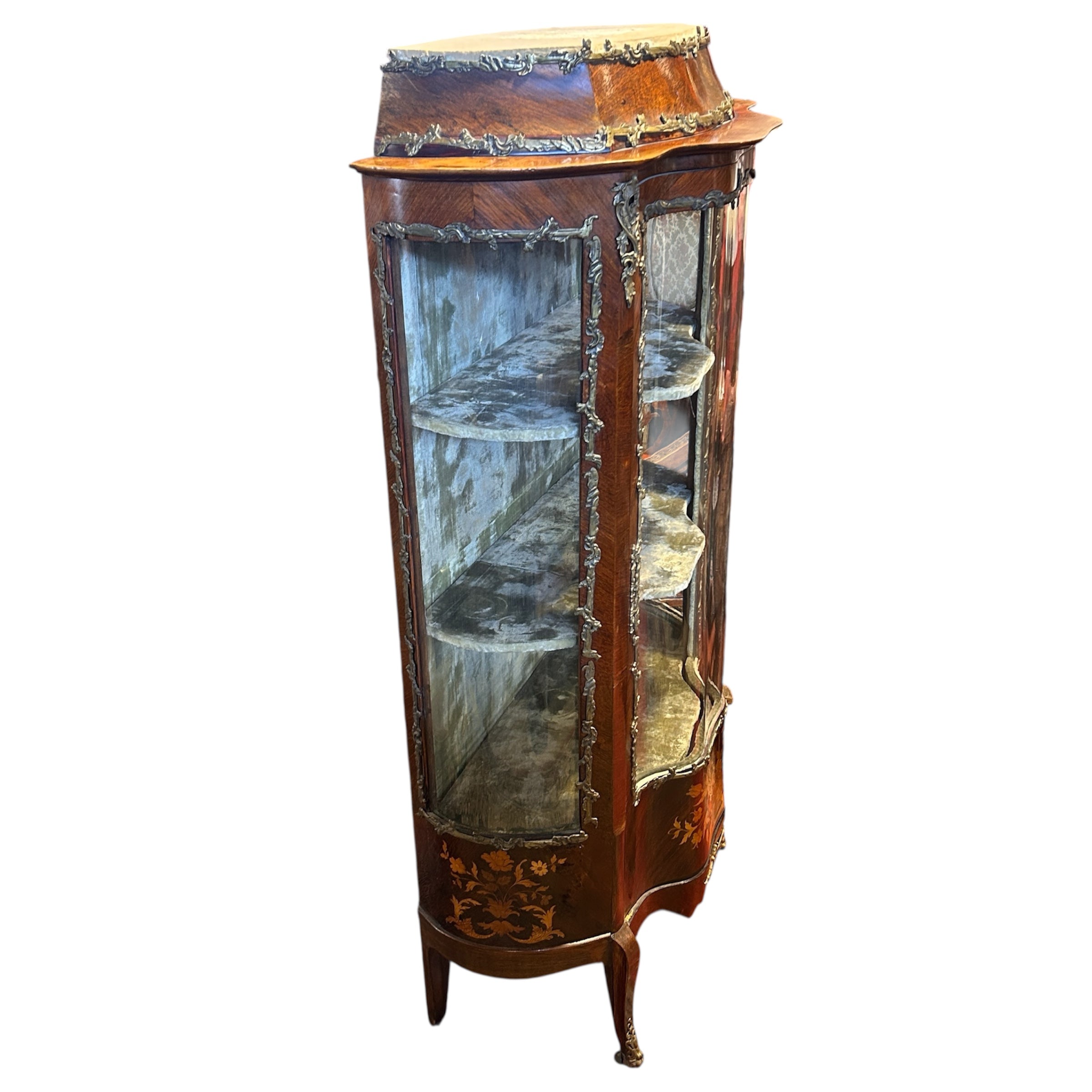 Vitrina francesa serpentine estilo Napoleón III principios del s.XX, en madera de jacaranda con marquetería frutal en diseño de flores, bellos bronces cincelados, tablero de vidrio y vajilla italiana de tres niveles en terciopelo verde, además de un compartimento oculto. Se entrega barnizada y con cubierta de mármol.
