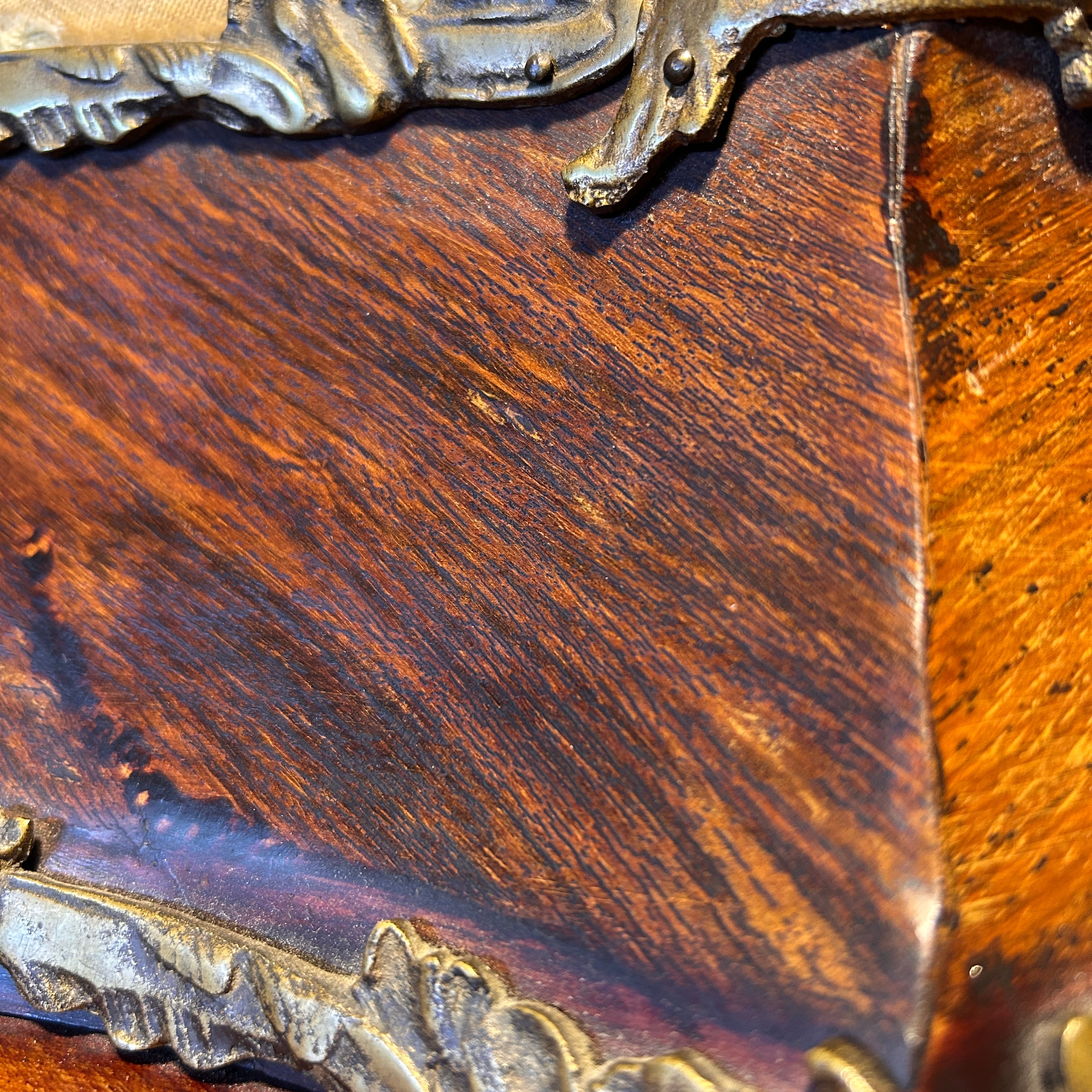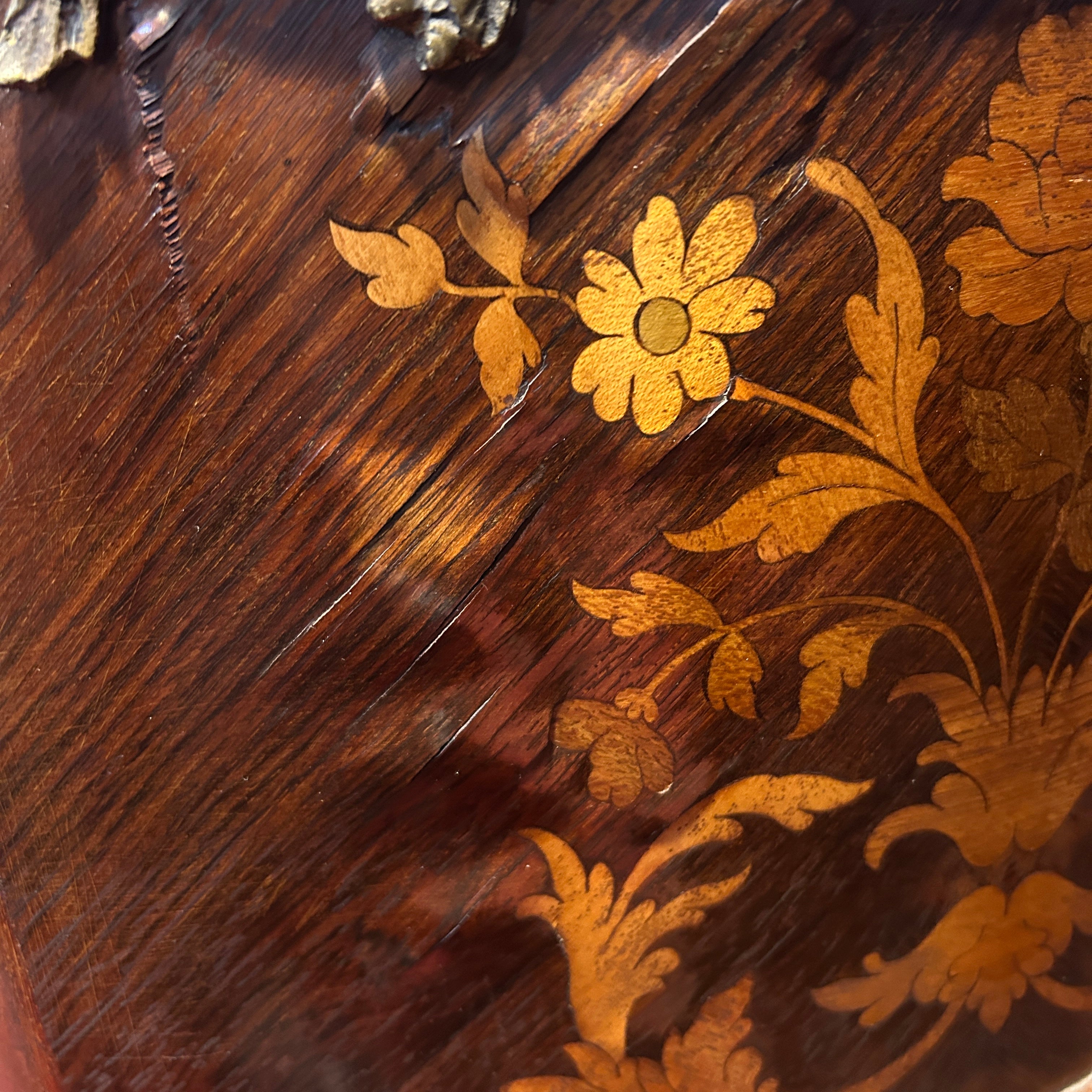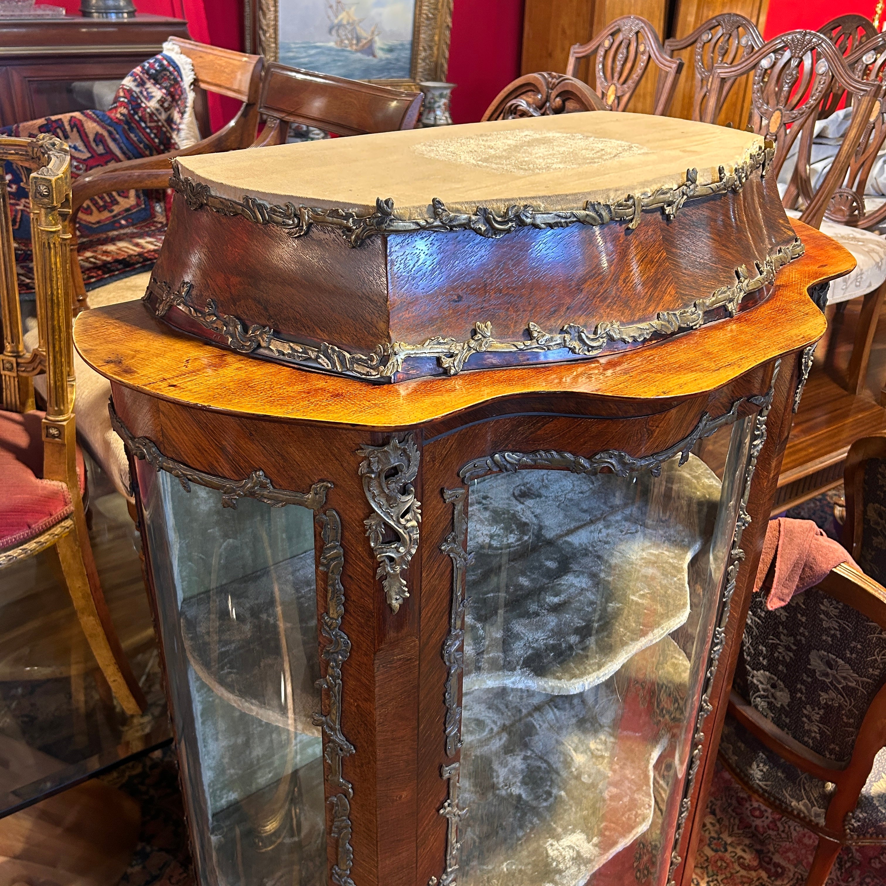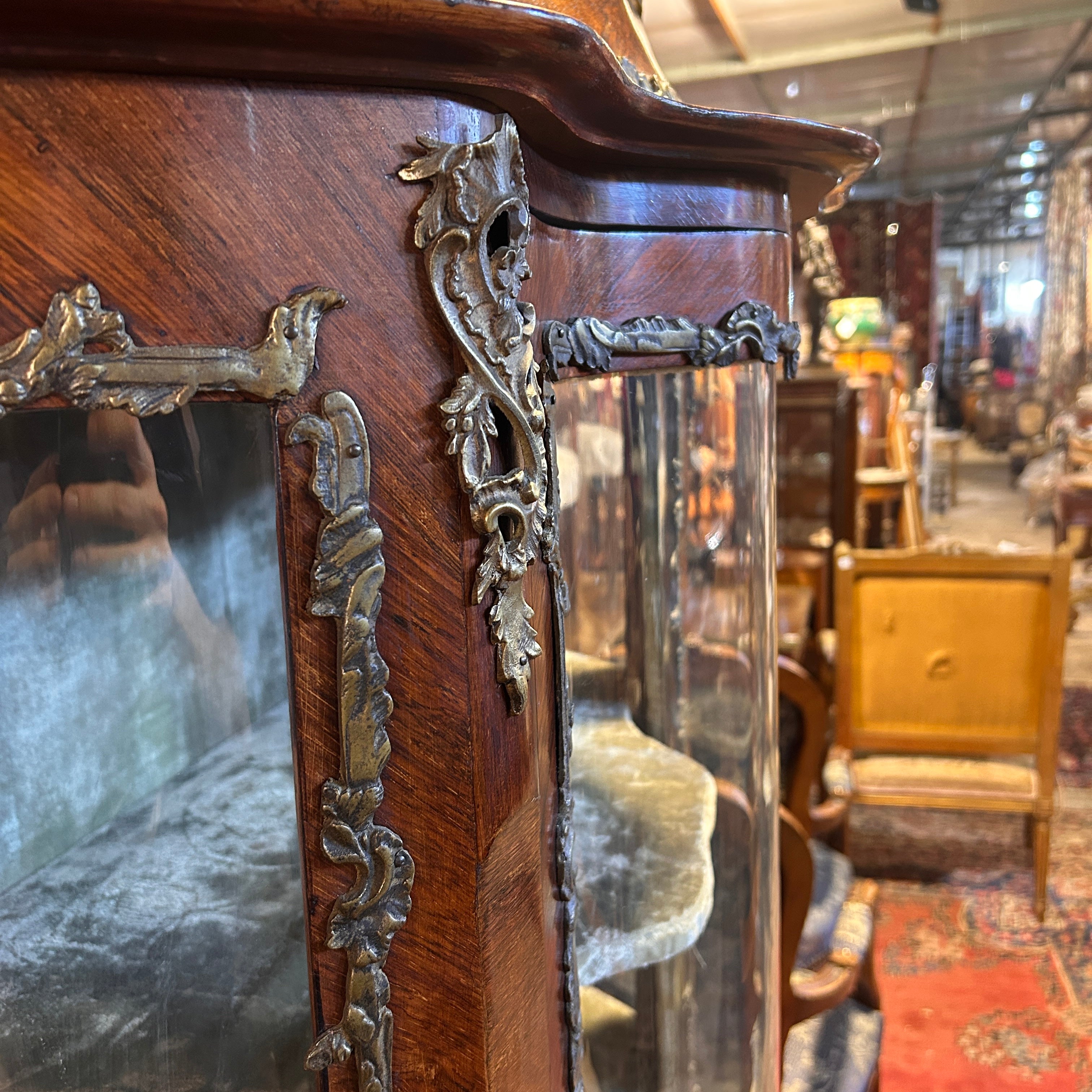 Vitrina francesa serpentine estilo Napoleón III principios del s.XX, en madera de jacaranda con marquetería frutal en diseño de flores, bellos bronces cincelados, tablero de vidrio y vajilla italiana de tres niveles en terciopelo verde, además de un compartimento oculto. Se entrega barnizada y con cubierta de mármol.