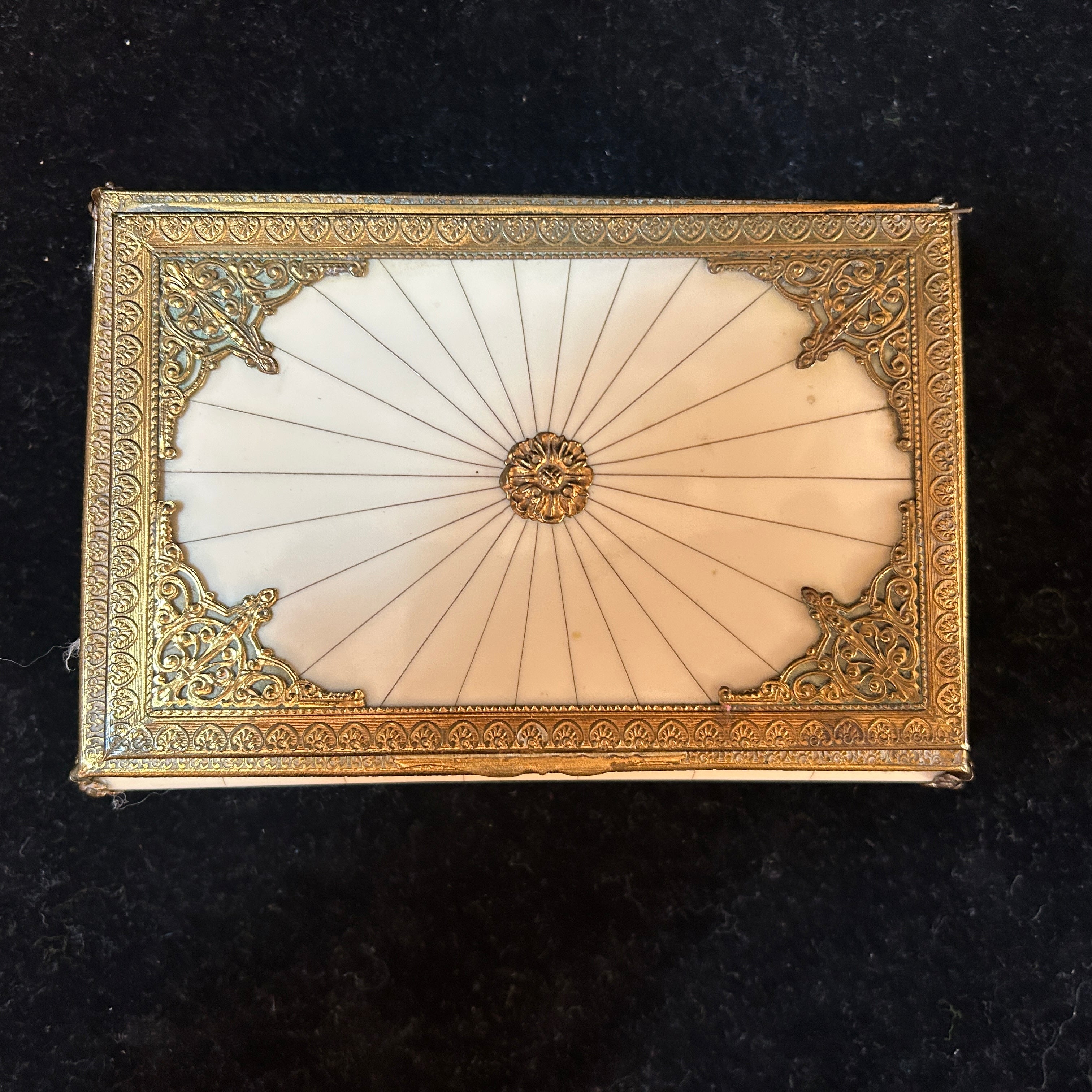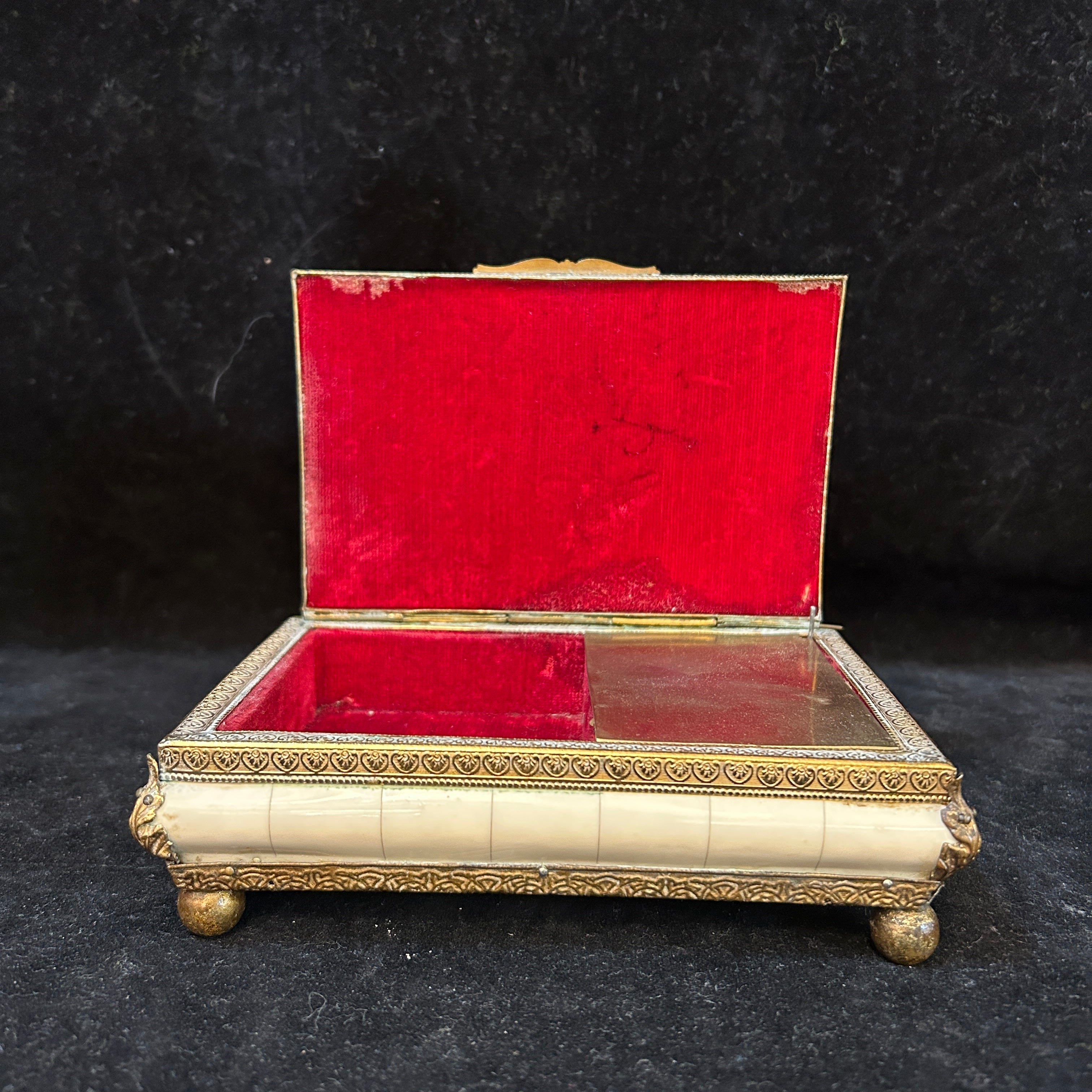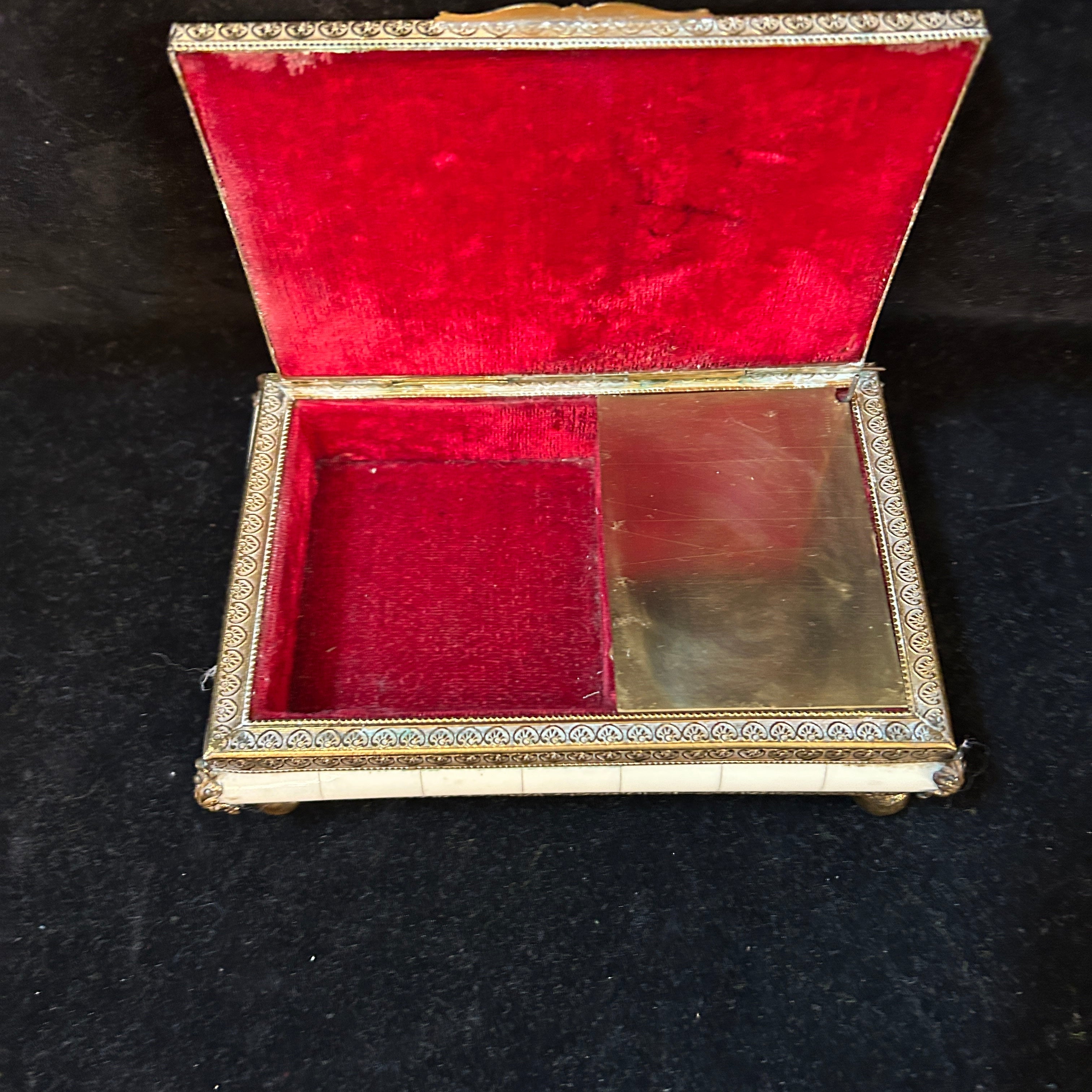 Enternecedora caja musical de bronce y baquelita con terciopelo rojo carmín en su interior. En la superficie se puede apreciar un muy delicado tallado en bronce con motivos tribales dejando la baquelita segmentada y un hermoso rosetón nuclear. Se presume que es de principios del 1900.