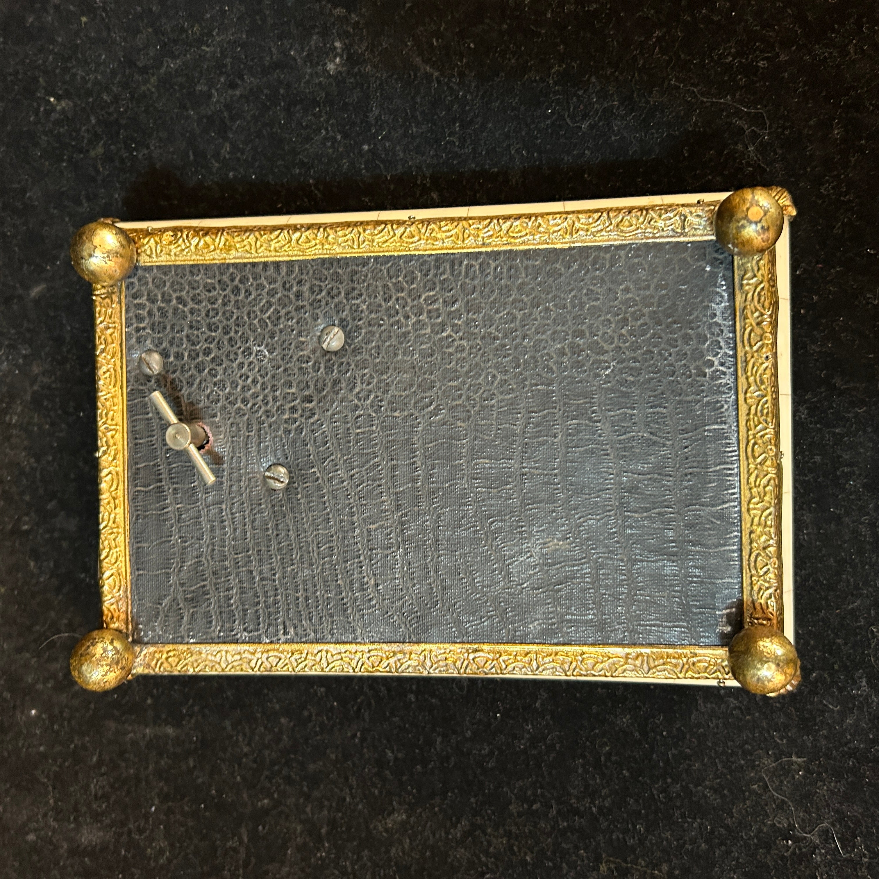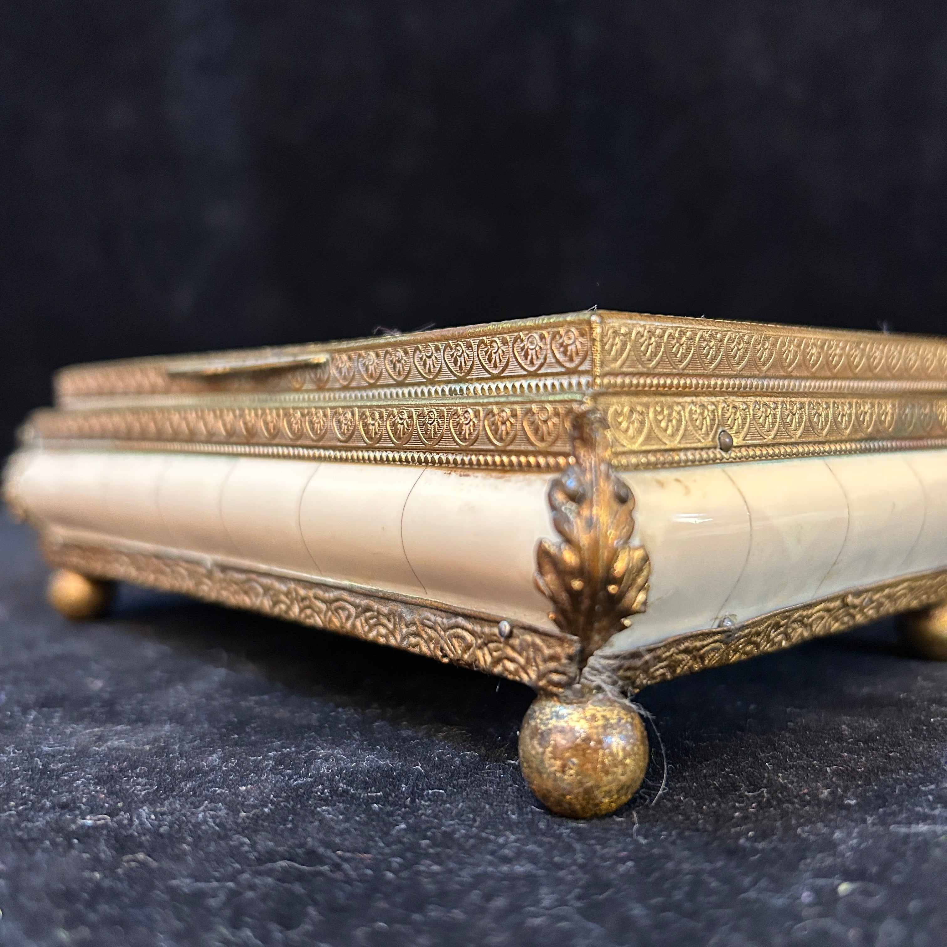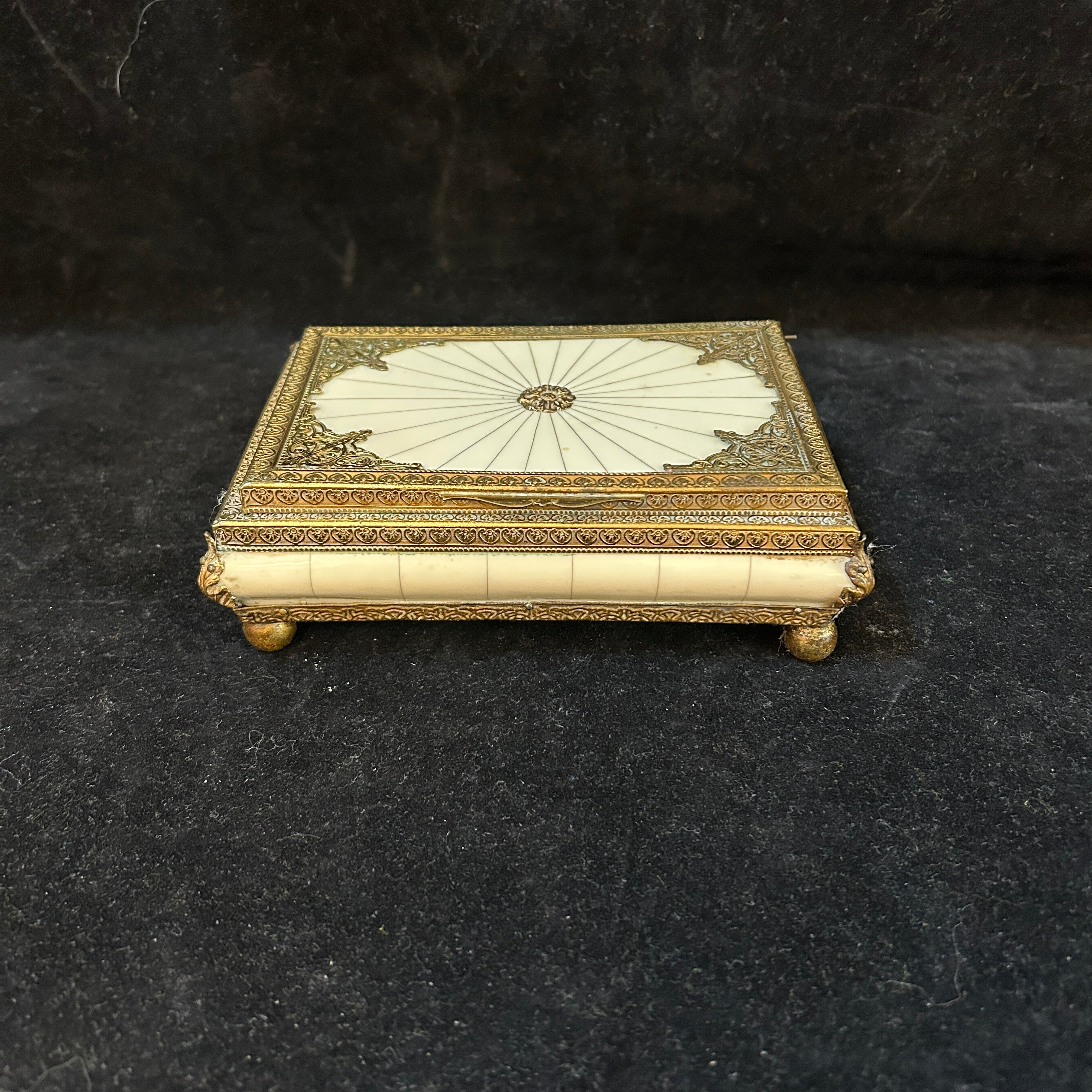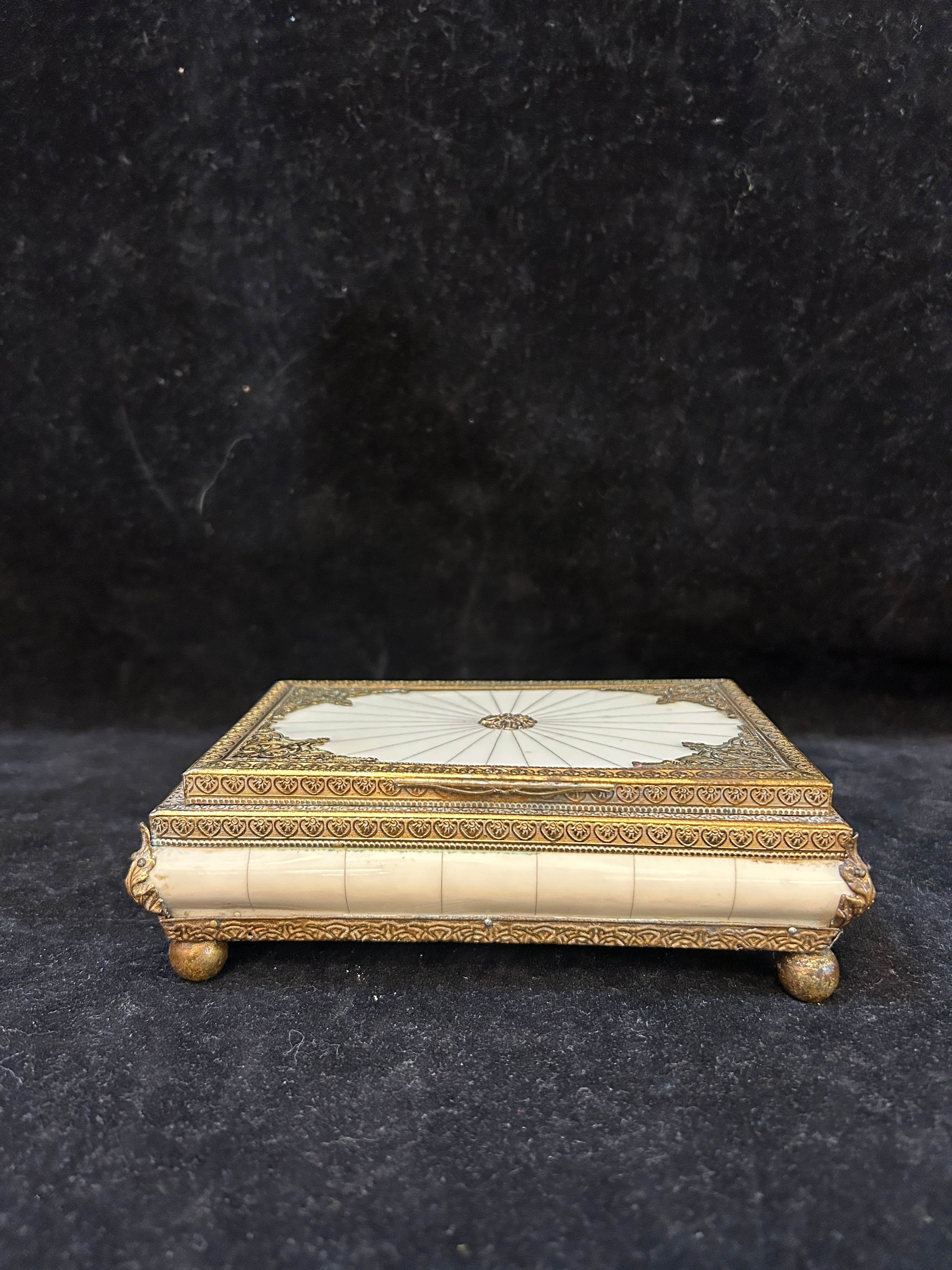 Enternecedora caja musical de bronce y baquelita con terciopelo rojo carmín en su interior. En la superficie se puede apreciar un muy delicado tallado en bronce con motivos tribales dejando la baquelita segmentada y un hermoso rosetón nuclear. Se presume que es de principios del 1900.