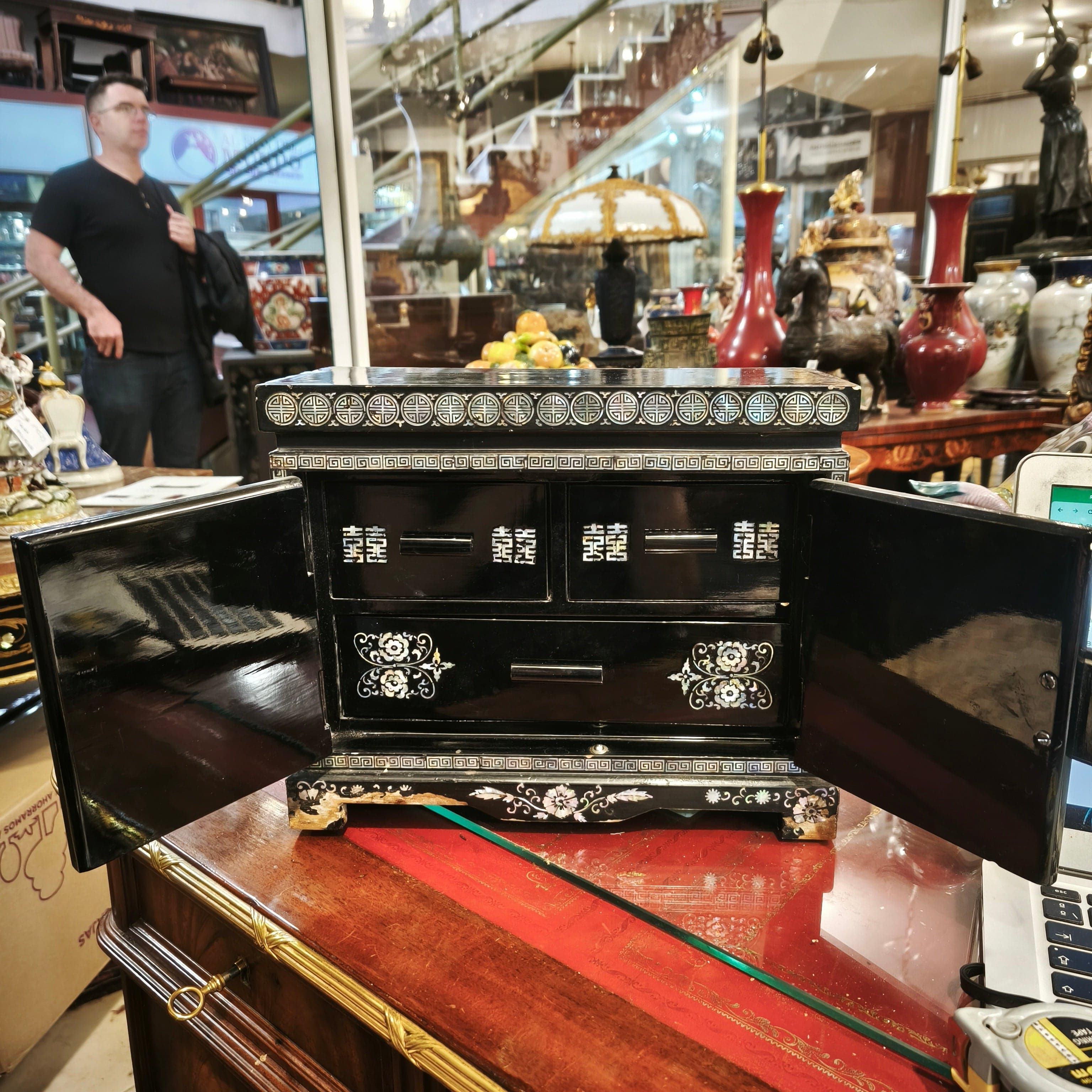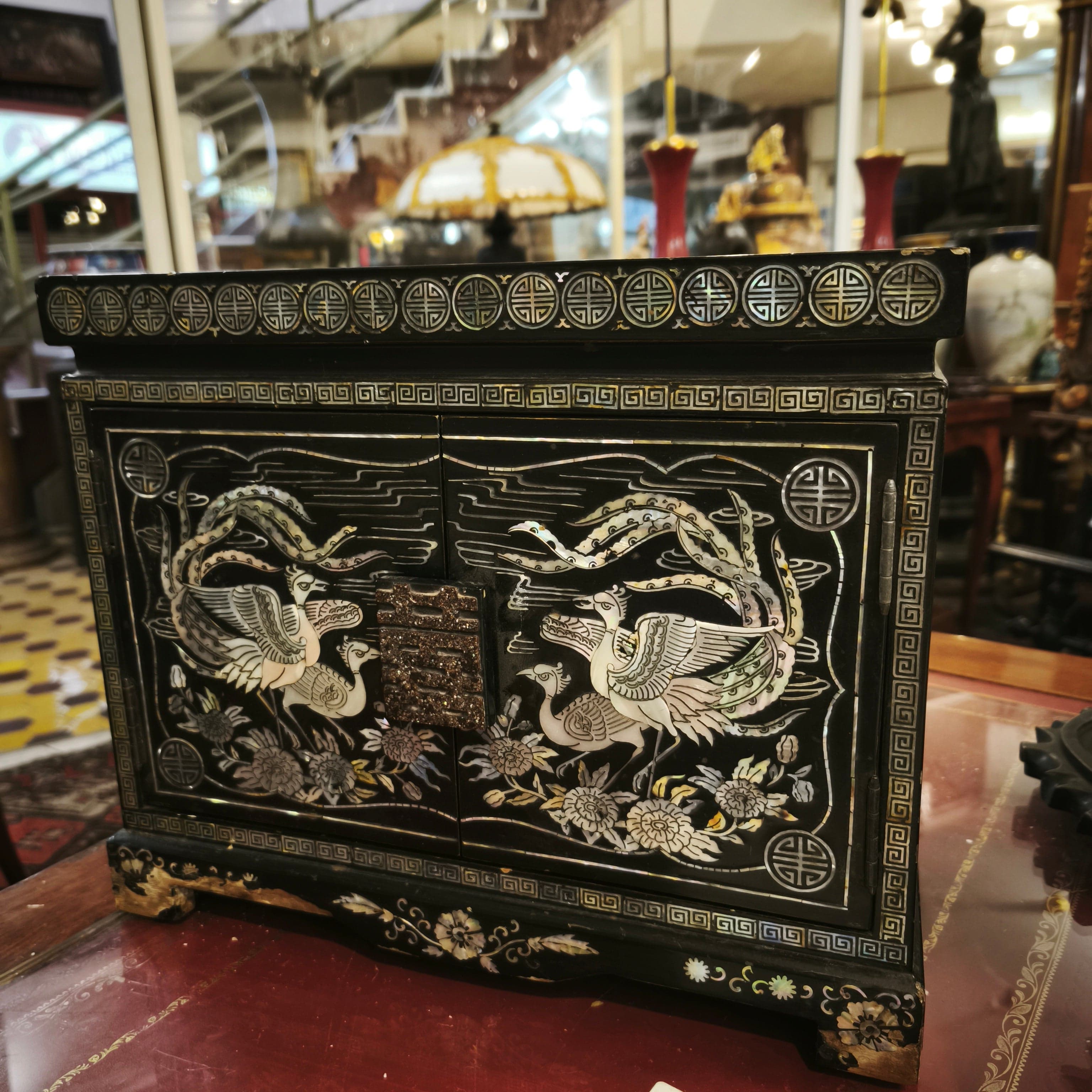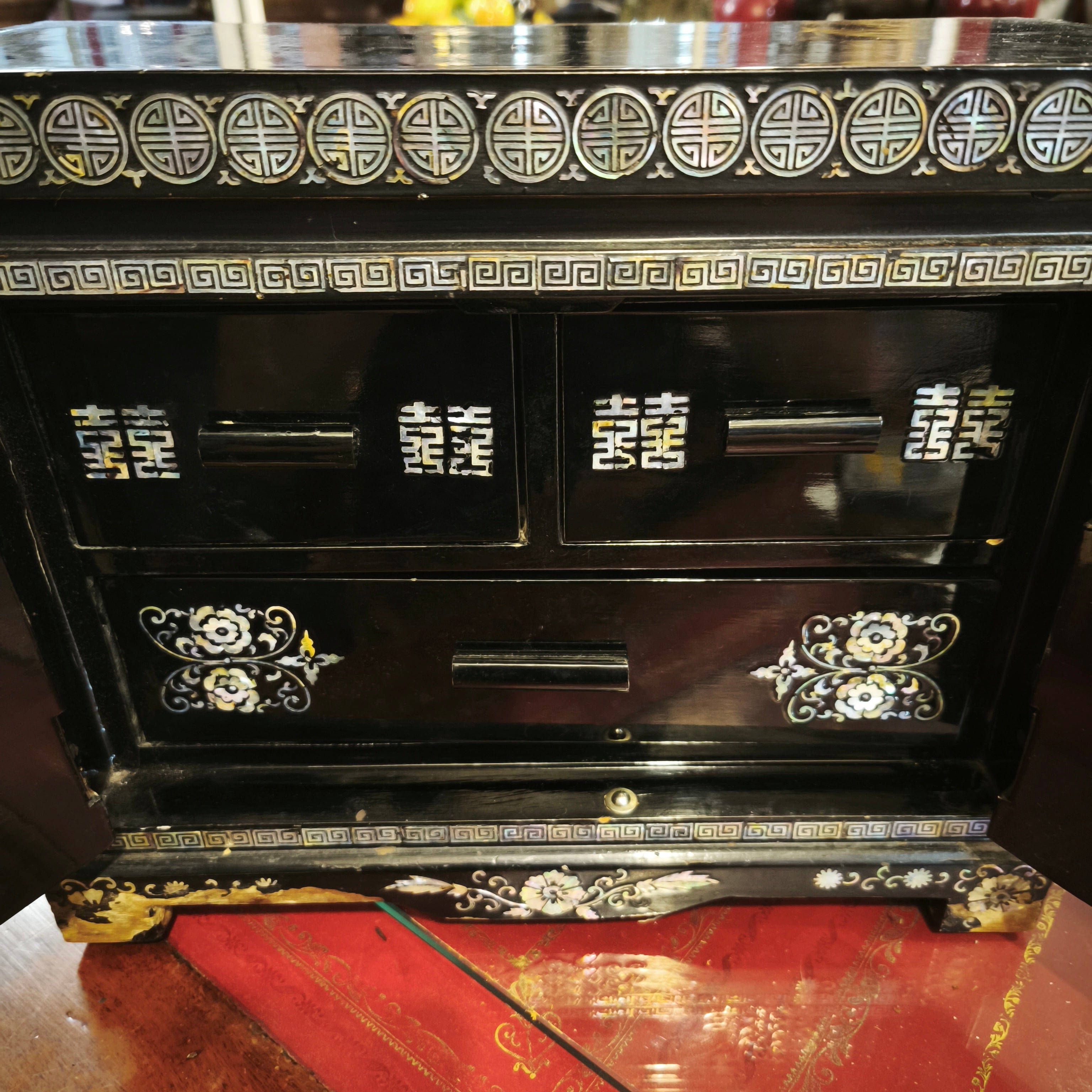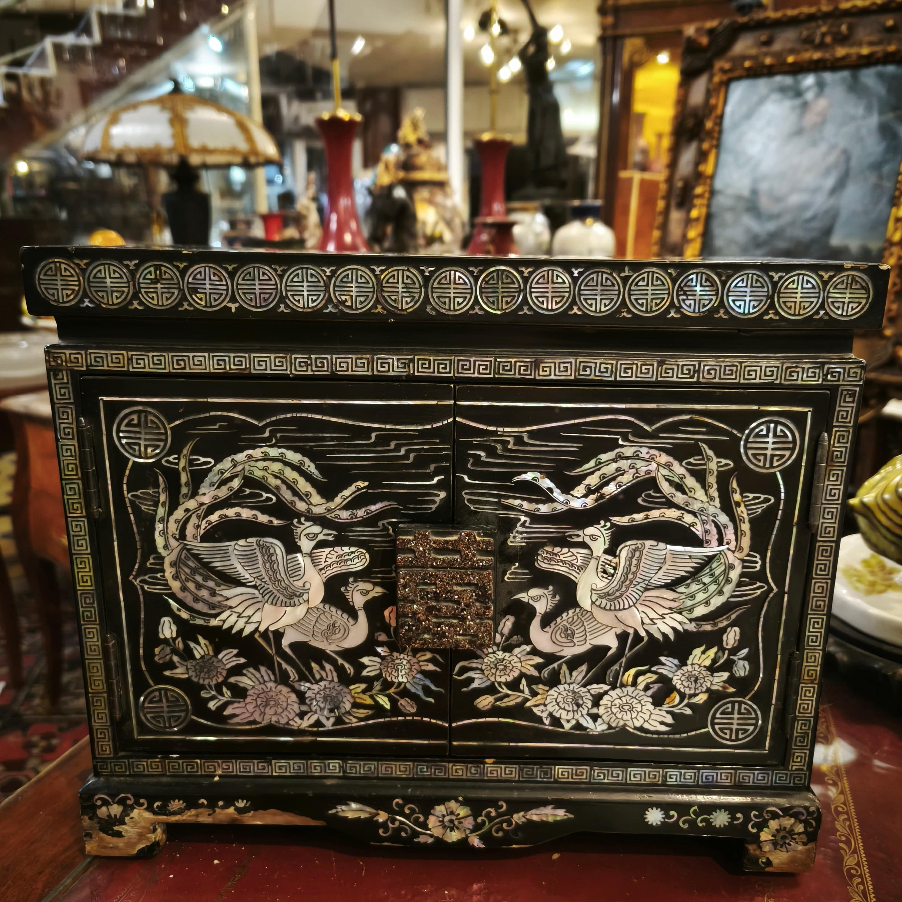 Bellísimo mueblecito joyero chino con terminación lacada e increíbles diseños realizados con incrustaciones de nácar, representando motivos florales, geométricos y a cuatro pavos reales como figuras centrales. El mueble tiene dos puertas exteriores que cubren los tres cajones de almacenaje, dos pequeños en la parte superior, y uno inferior de mayor tamaño. Los cajones también tienen terminaciones en nacar y un interior forrado en un patron a rayas de colores. Se trata de una pieza antigua que posiblemente servía para guardar pinceles o joyas.