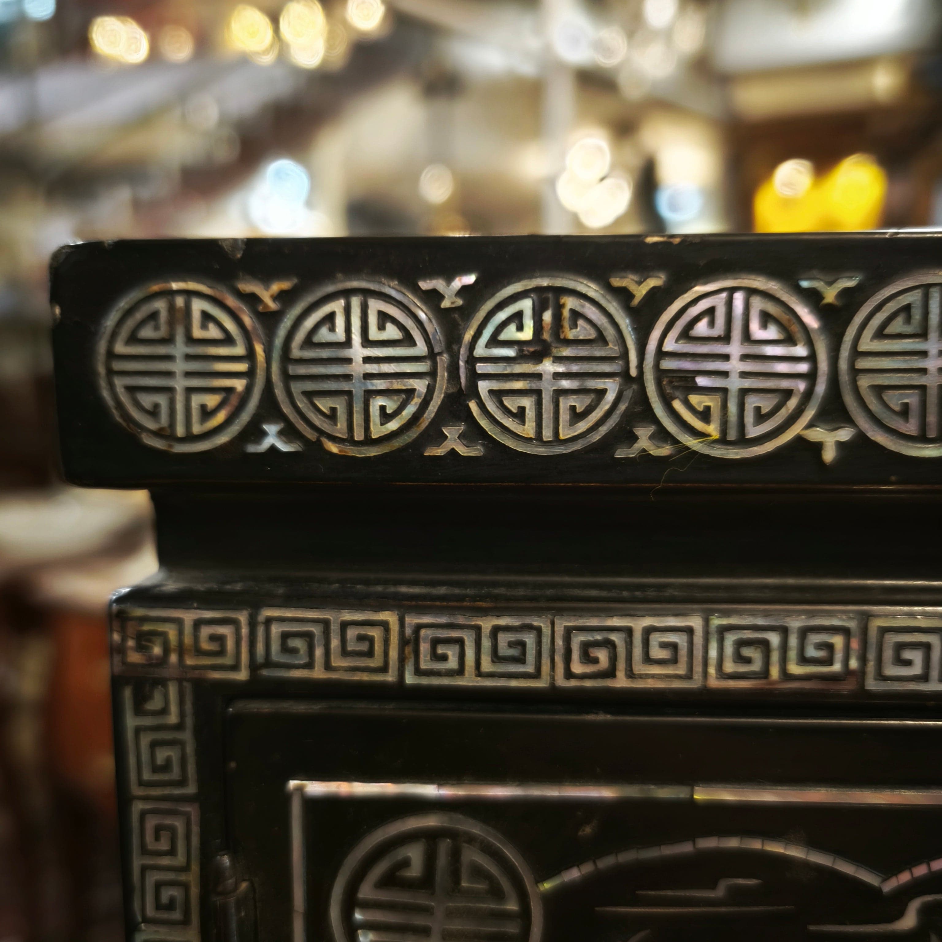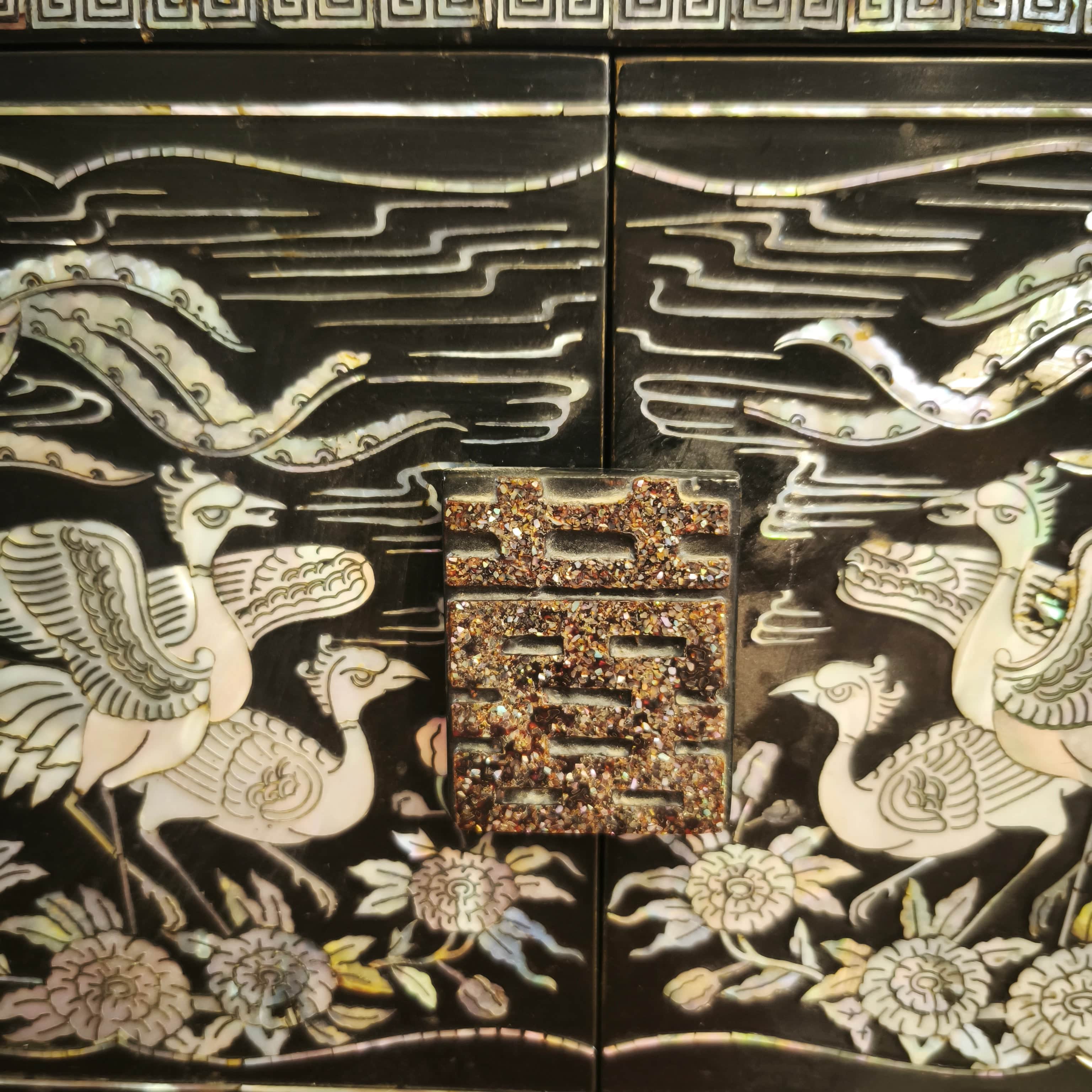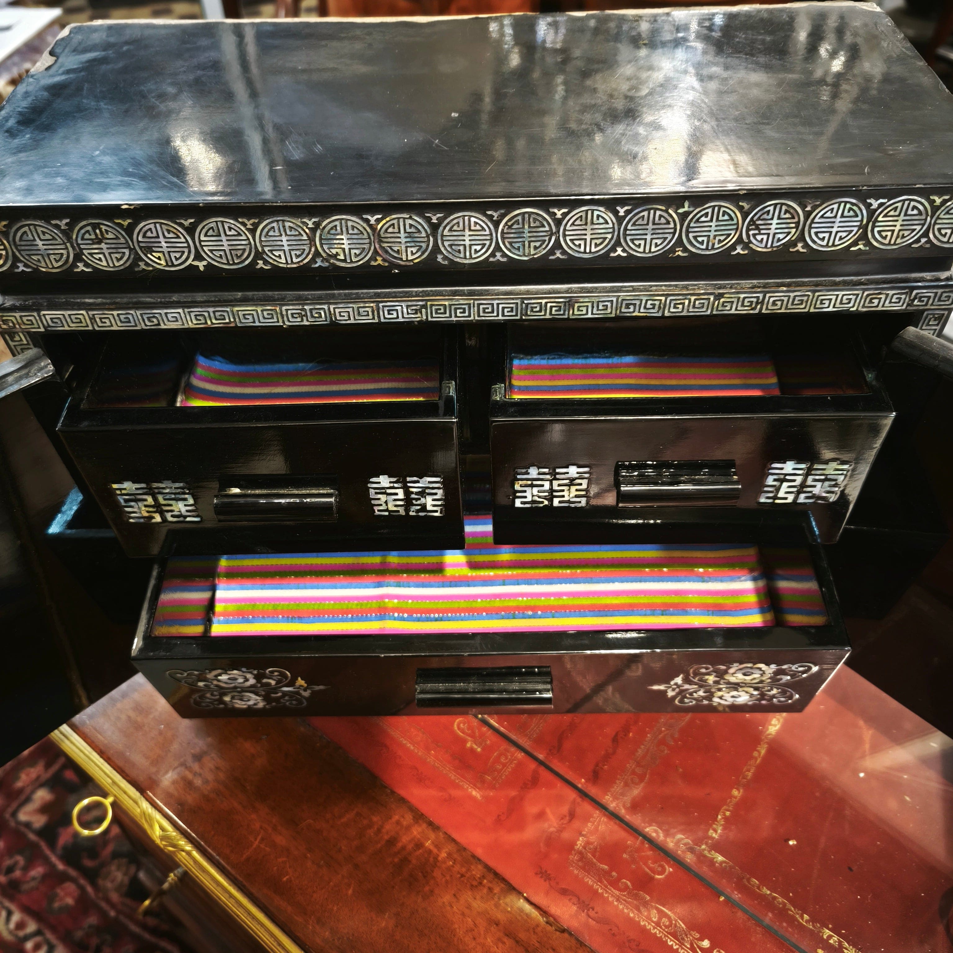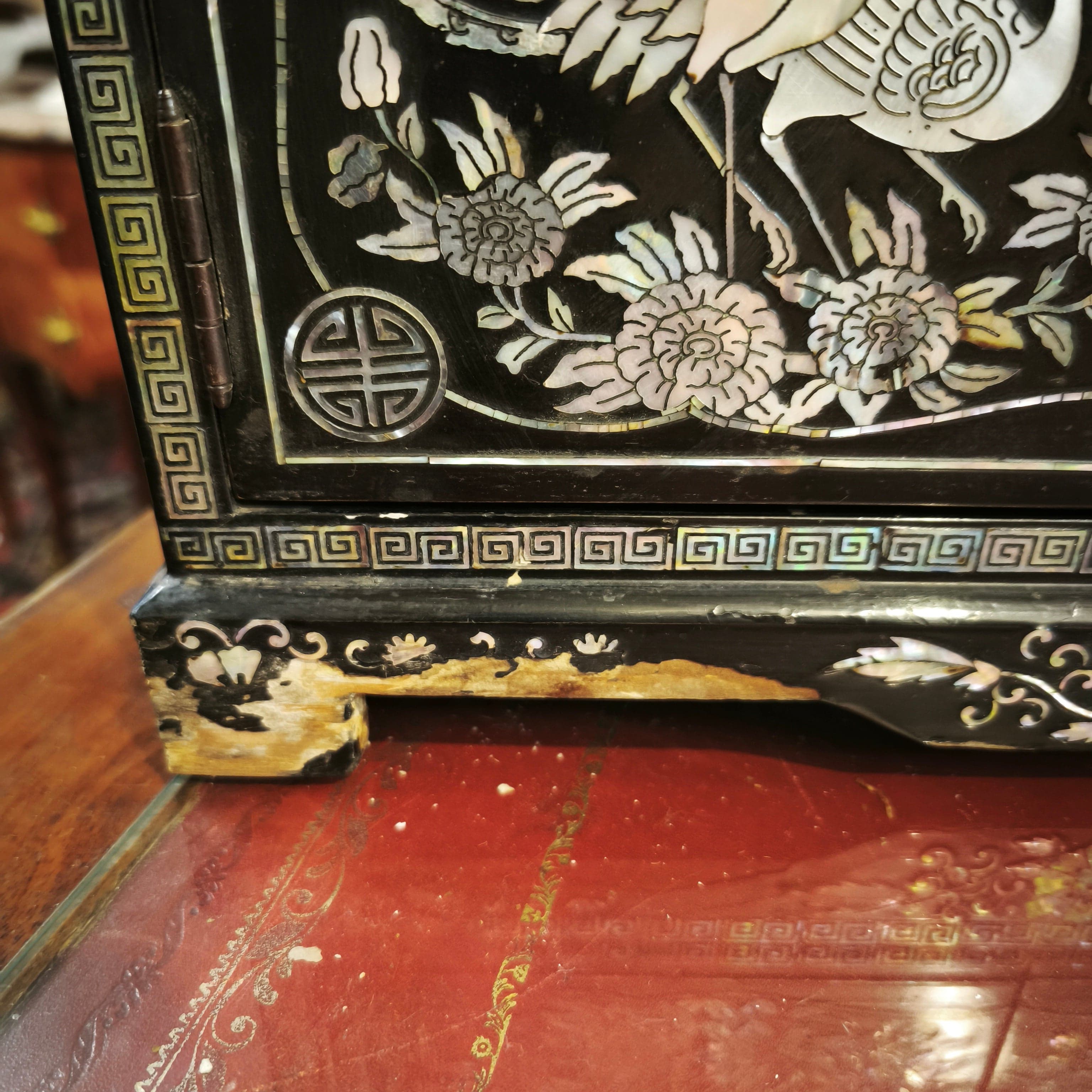 Bellísimo mueblecito joyero chino con terminación lacada e increíbles diseños realizados con incrustaciones de nácar, representando motivos florales, geométricos y a cuatro pavos reales como figuras centrales. El mueble tiene dos puertas exteriores que cubren los tres cajones de almacenaje, dos pequeños en la parte superior, y uno inferior de mayor tamaño. Los cajones también tienen terminaciones en nacar y un interior forrado en un patron a rayas de colores. Se trata de una pieza antigua que posiblemente servía para guardar pinceles o joyas.