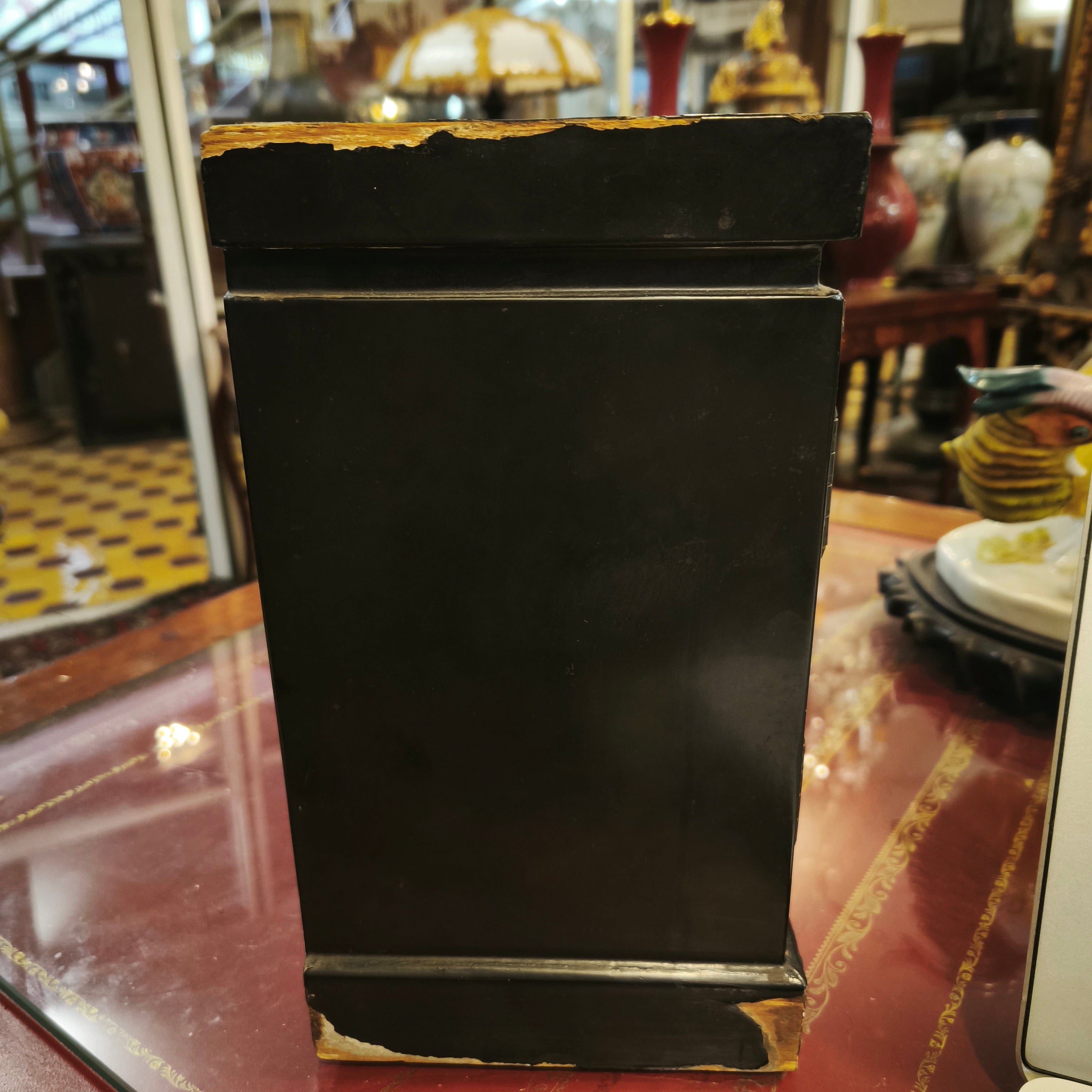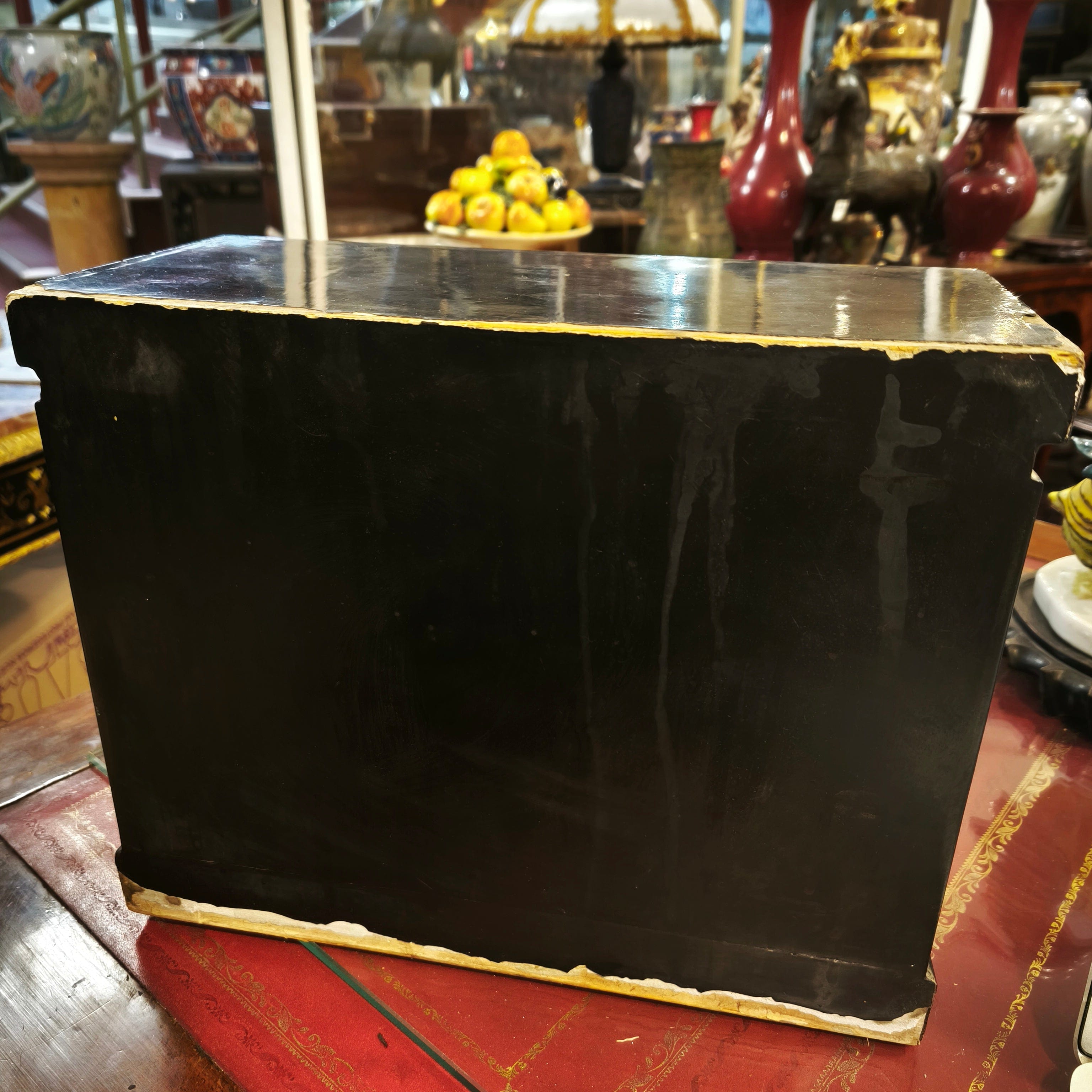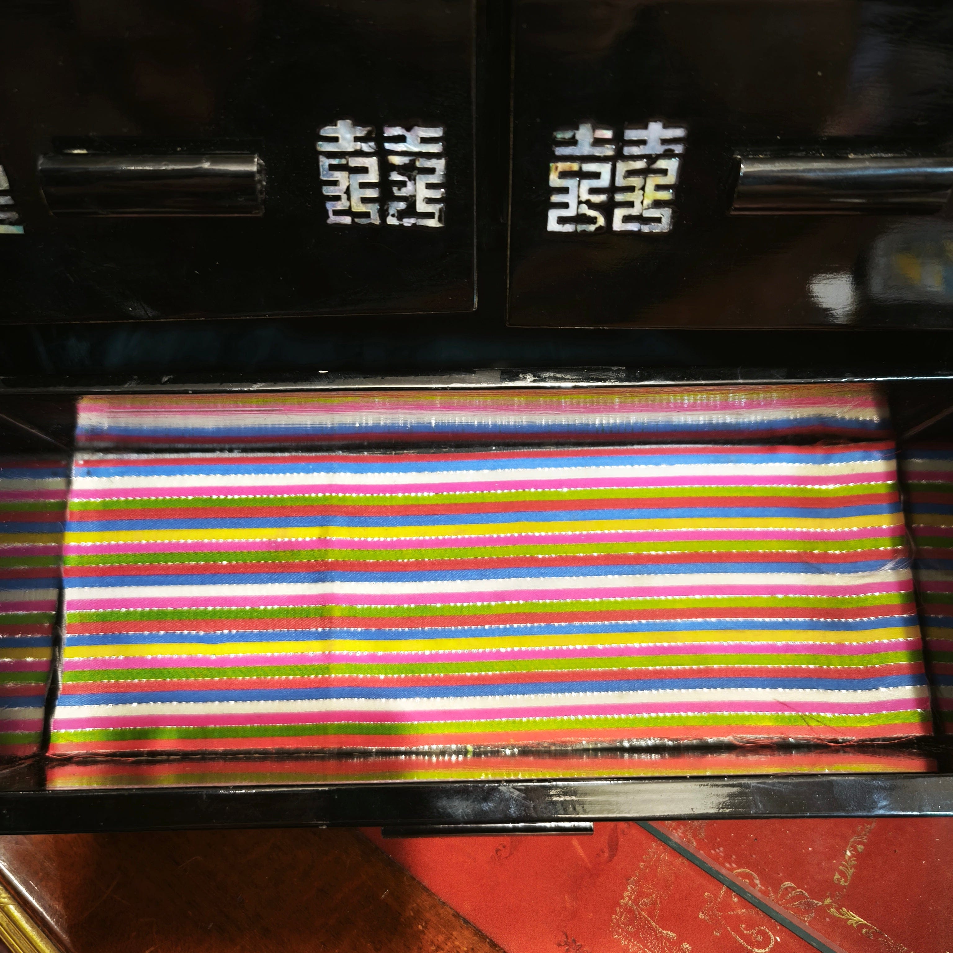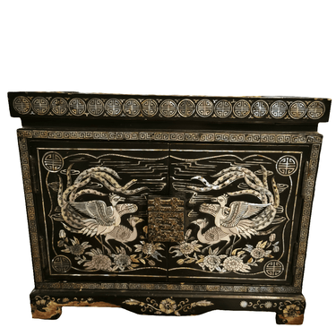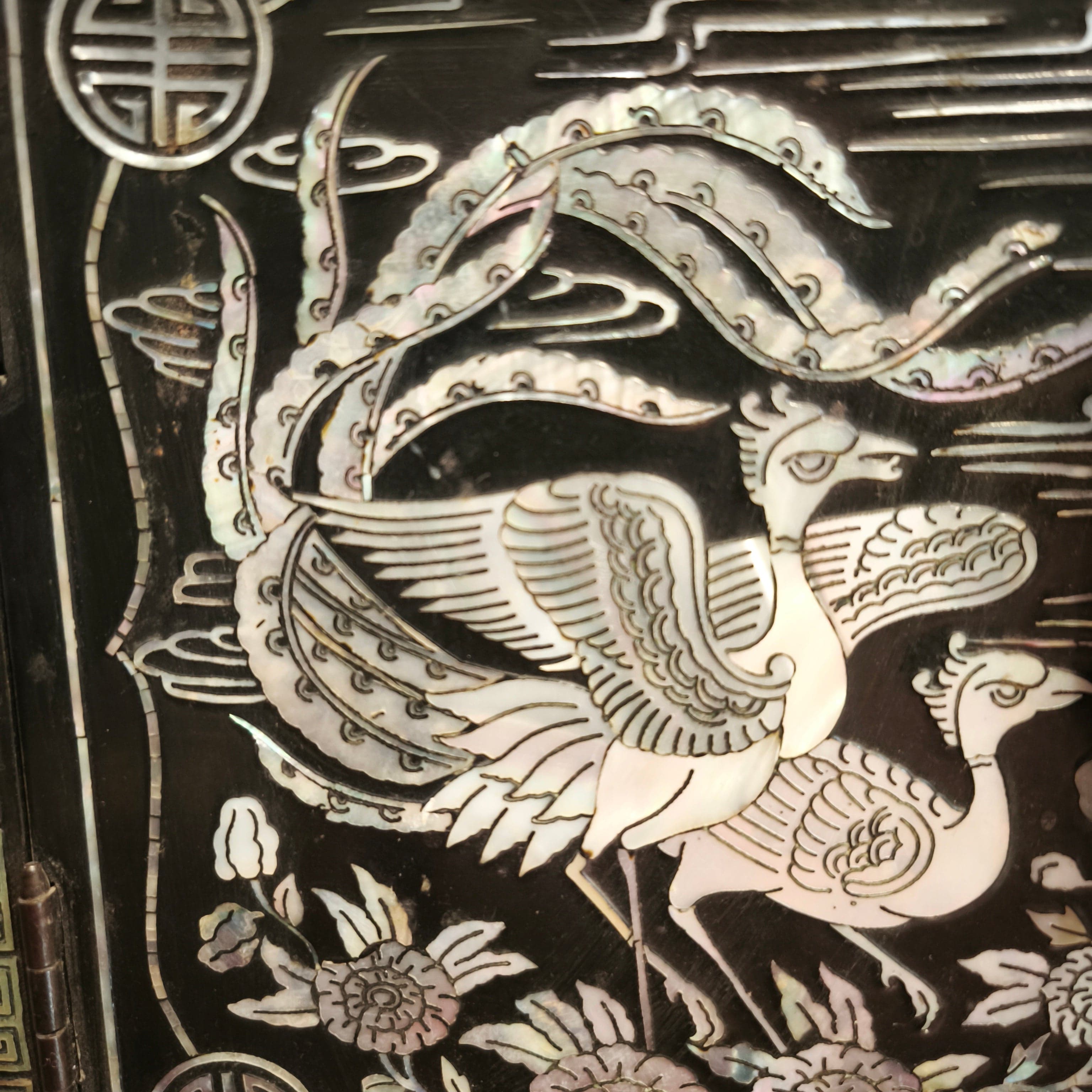 Bellísimo mueblecito joyero chino con terminación lacada e increíbles diseños realizados con incrustaciones de nácar, representando motivos florales, geométricos y a cuatro pavos reales como figuras centrales. El mueble tiene dos puertas exteriores que cubren los tres cajones de almacenaje, dos pequeños en la parte superior, y uno inferior de mayor tamaño. Los cajones también tienen terminaciones en nacar y un interior forrado en un patron a rayas de colores. Se trata de una pieza antigua que posiblemente servía para guardar pinceles o joyas.