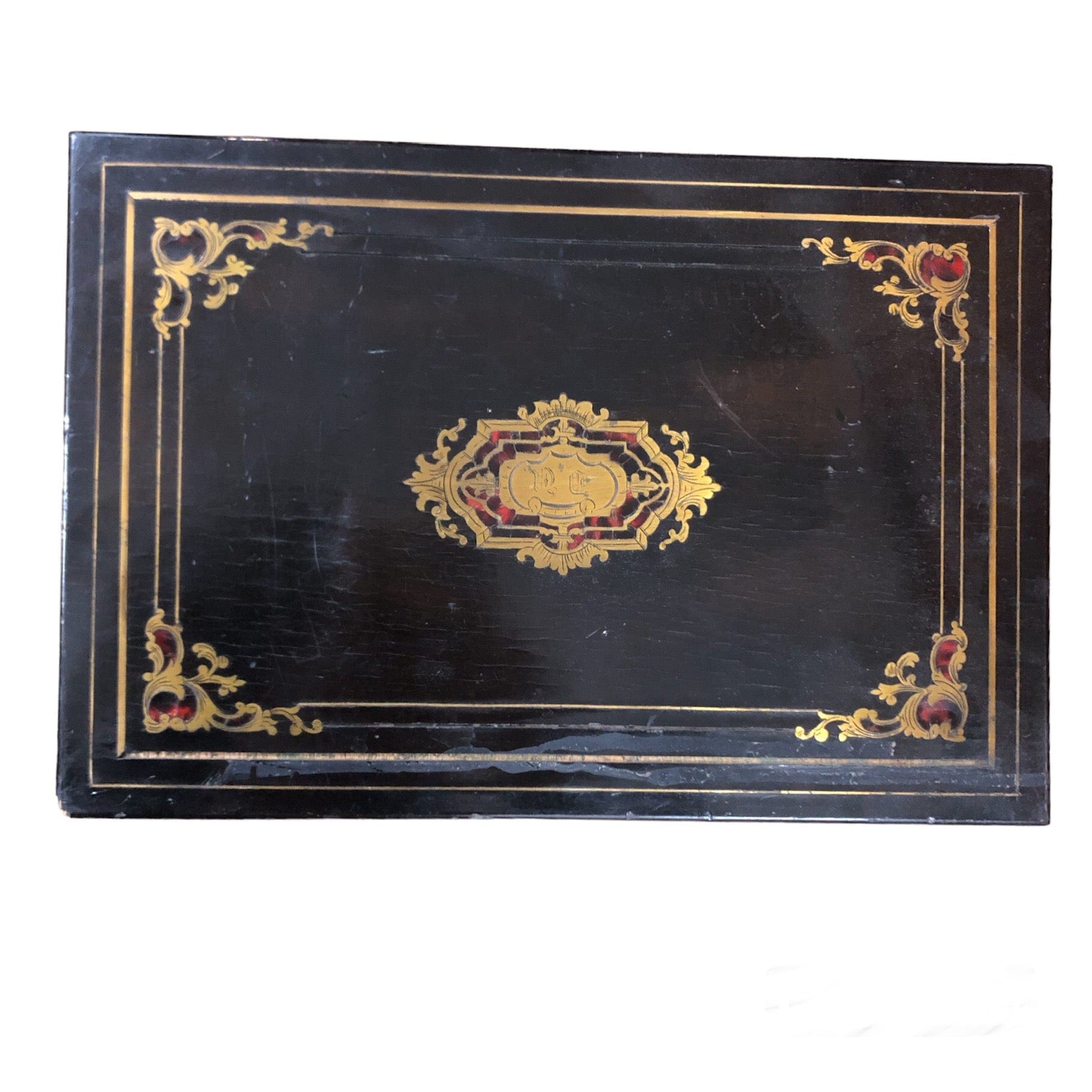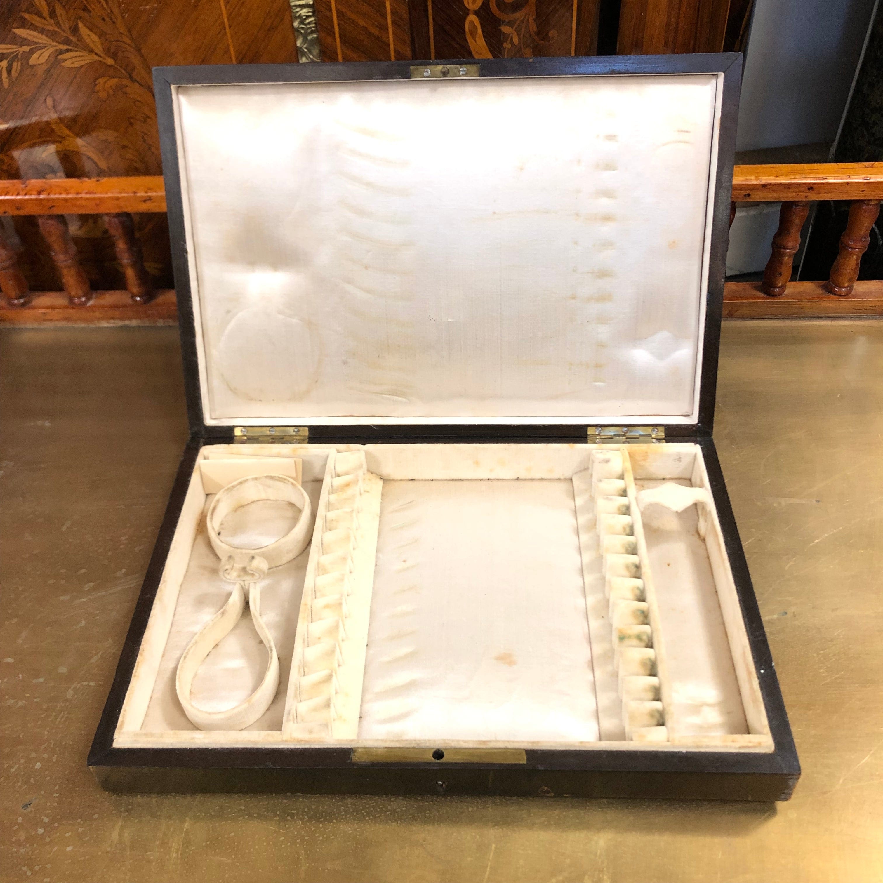 Bella caja de madera negra, con detalles de bronce, forrada en raso blanco por dentro.