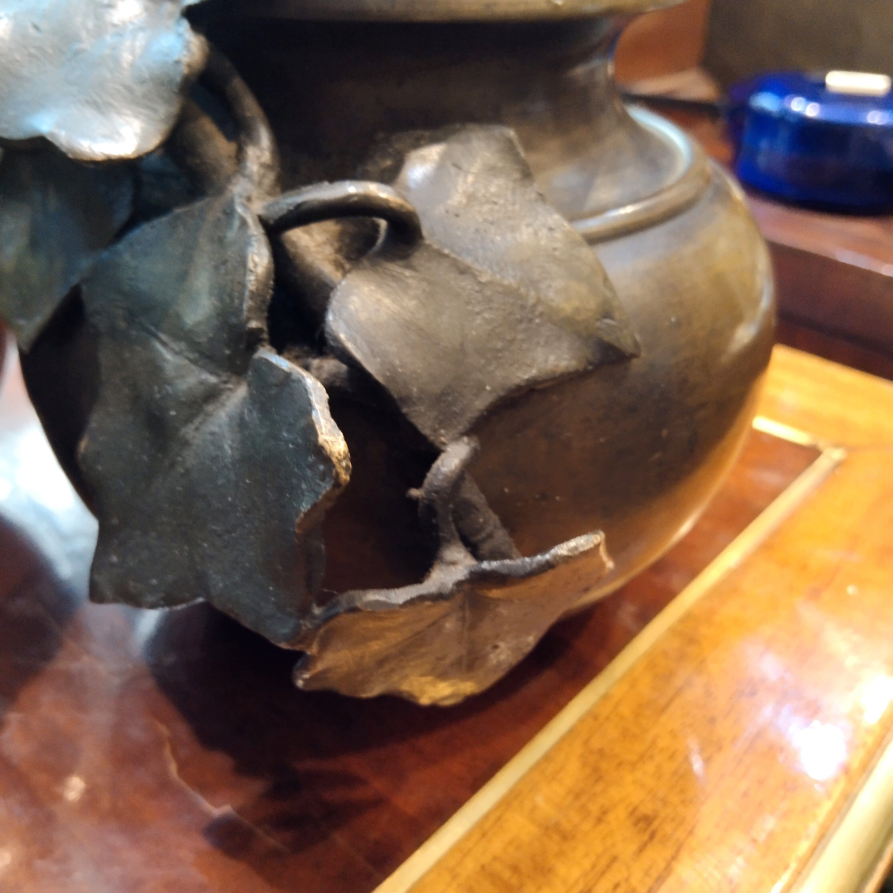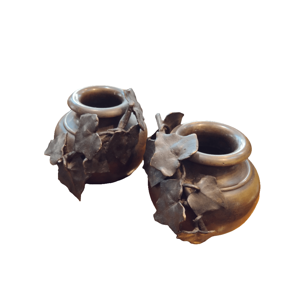 Esculturas en bronce, representando los típicos fondos de greda chilena, con un bello detalle de enredaderas recorriendo su superficie.