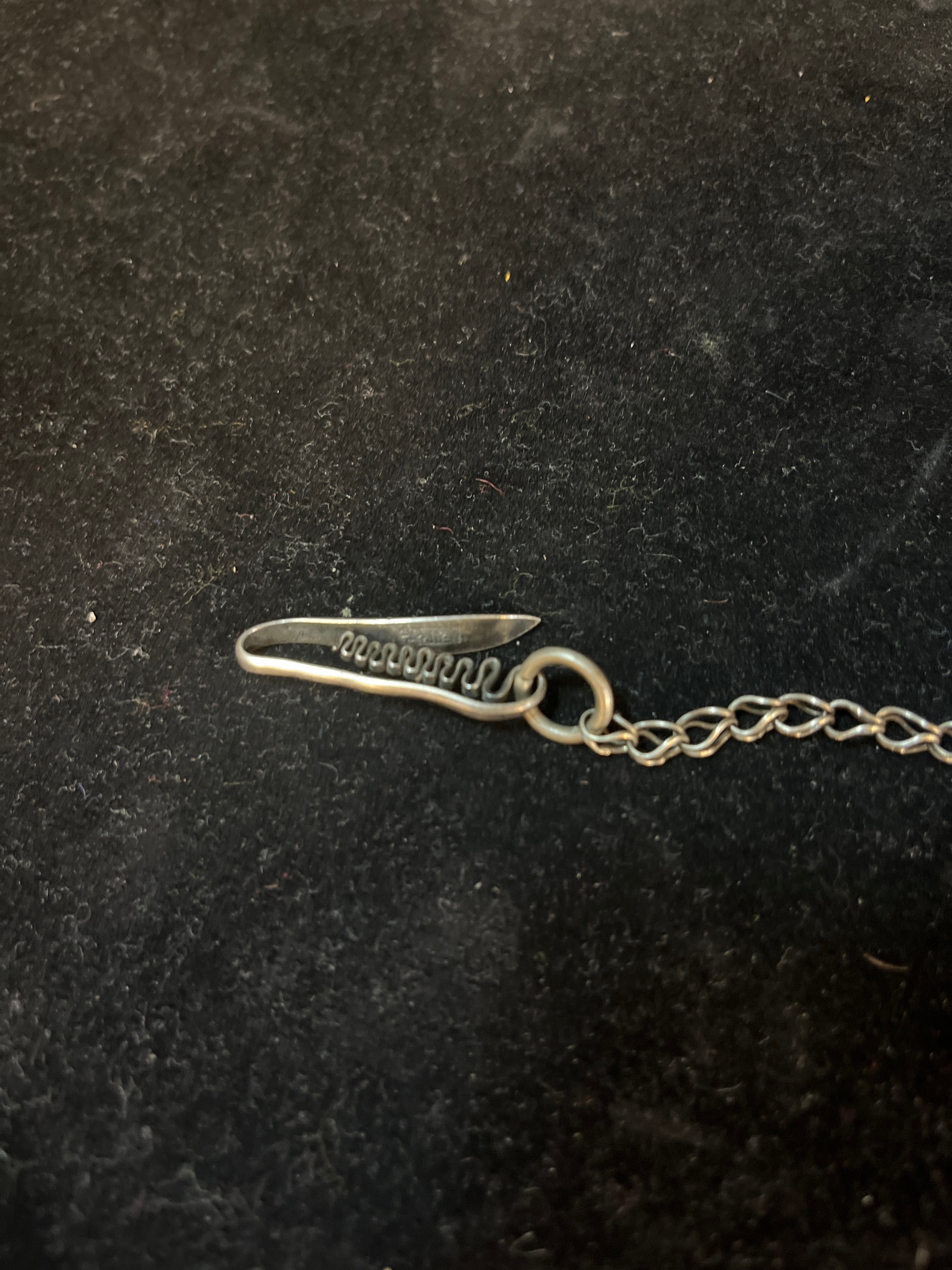 Bello Chatelaine de origen oriental, posiblemente chino, hecho de plata. La pieza, pensada para ser colgada en el cinturón, tiene una pequeña pinza entre sus colgantes y cascabeles, elemento que hace pensar que este Chatelaine era usado como accesorio para preparar opio. Entre su broche y los colgantes, hay una linda figura tallada que representa una mariposa, animal asociado simbólicamente en muchas culturas al opio.